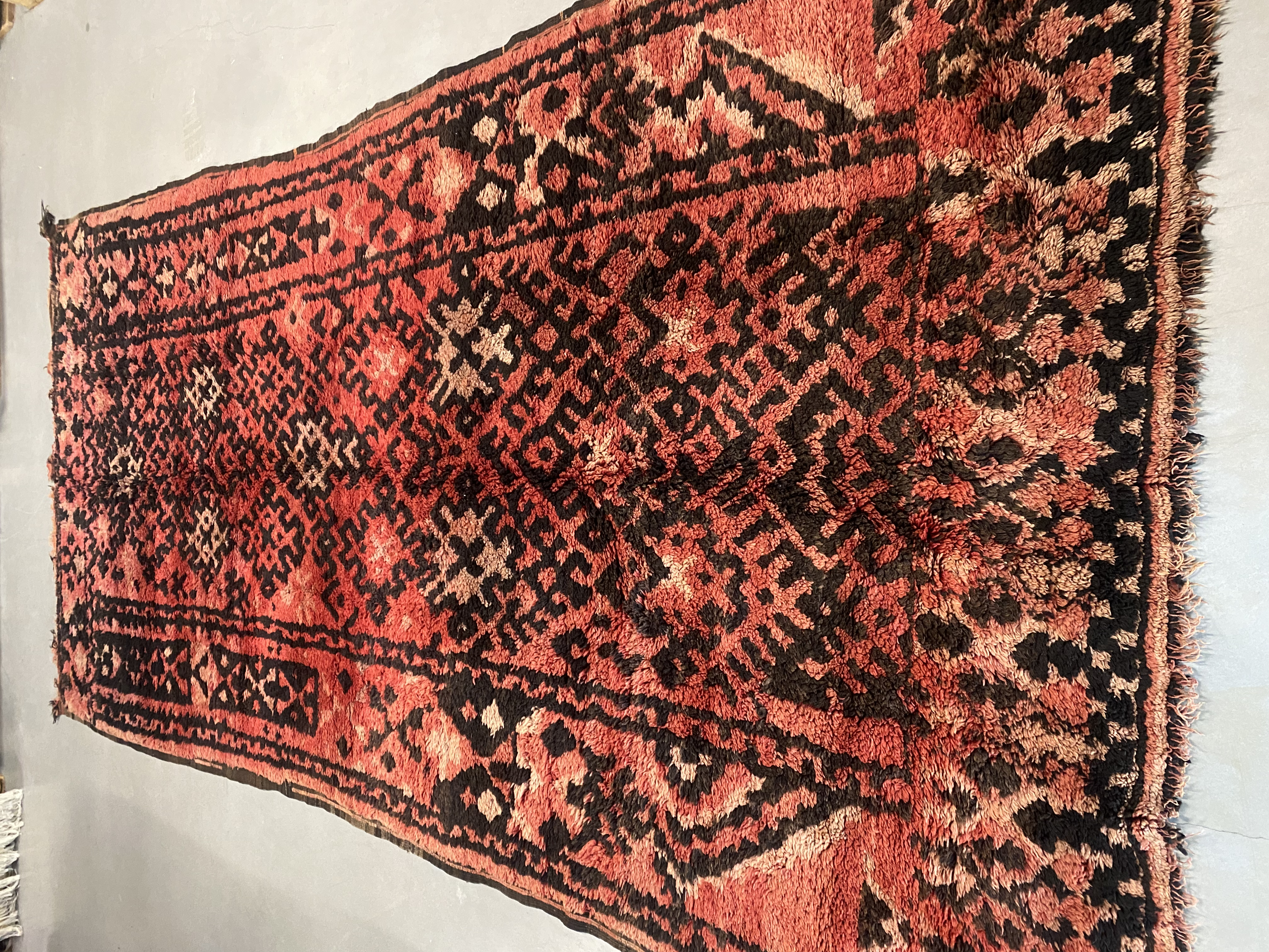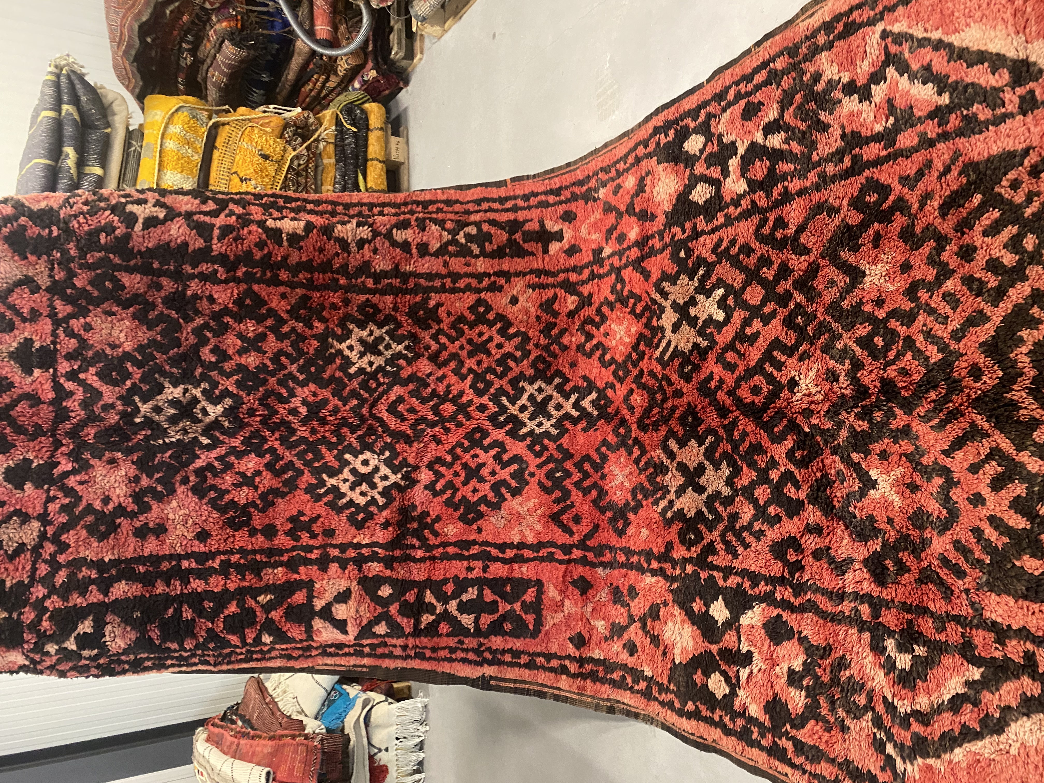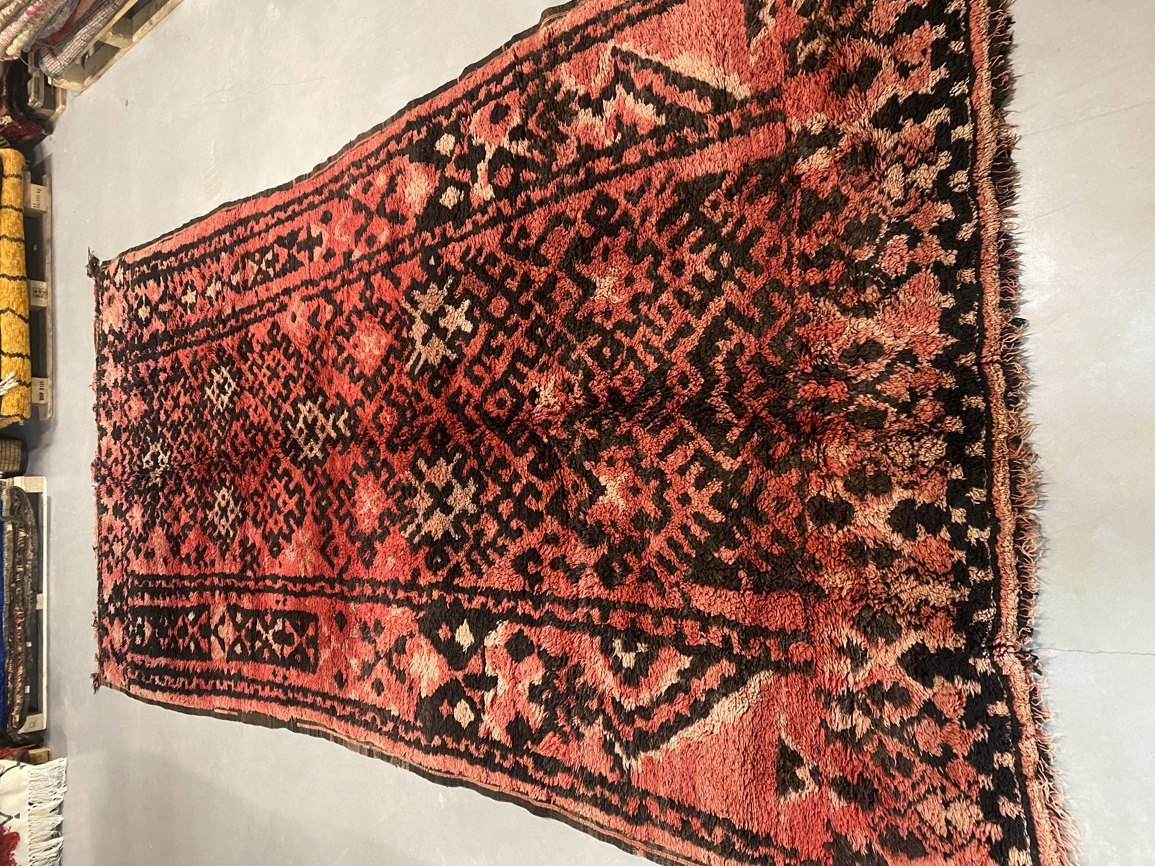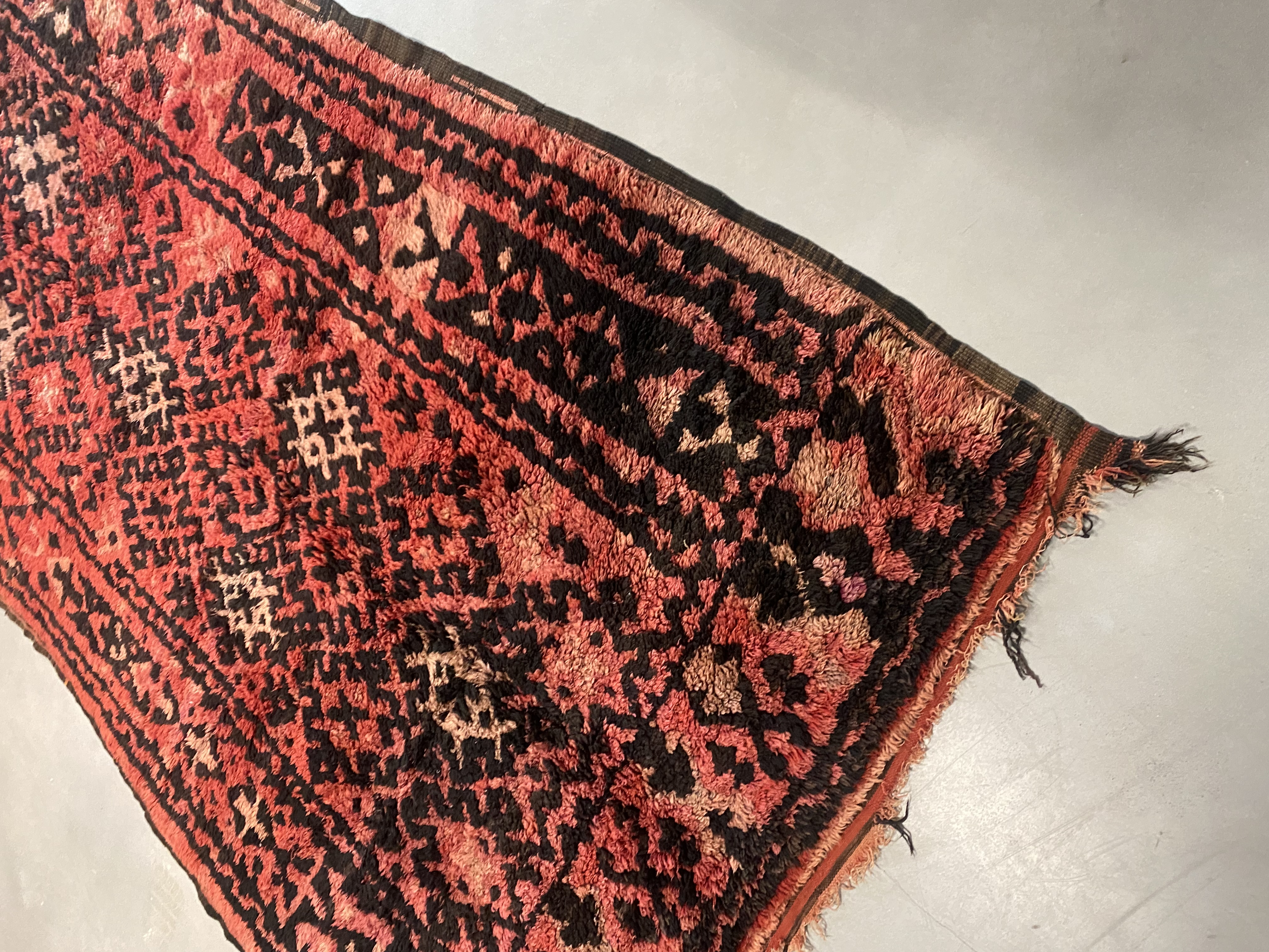 Beni Mguild rugs originate from the western central Middle Atlas region of Morocco, and as with most regions, they have their own style. The weavers in this region like to take the designs commonly found in flat weave rugs, and adapt them to their pile weave, hand knotted creations. This creates bold, flowing imagery that captures the joyous character of the weaver herself.