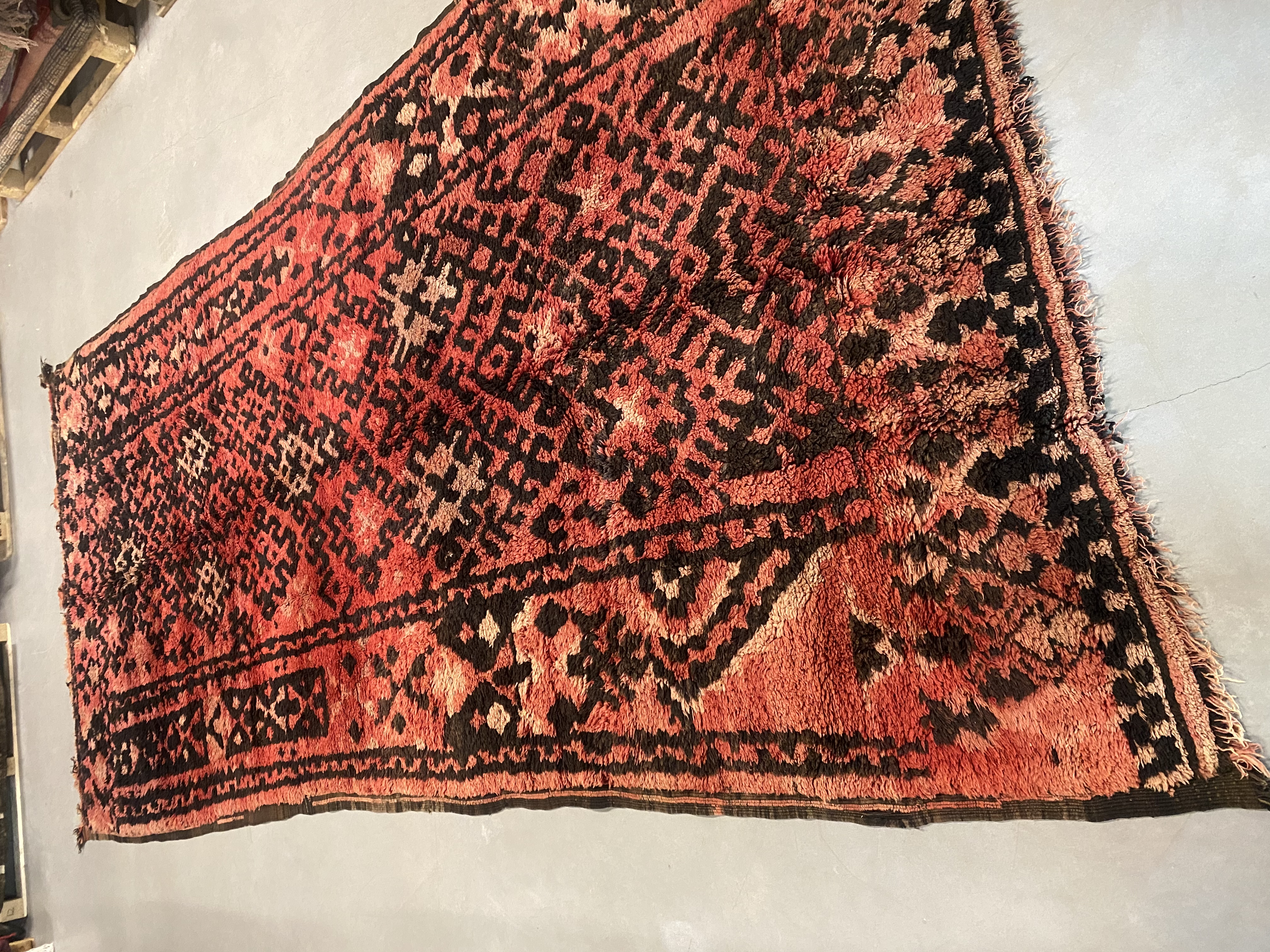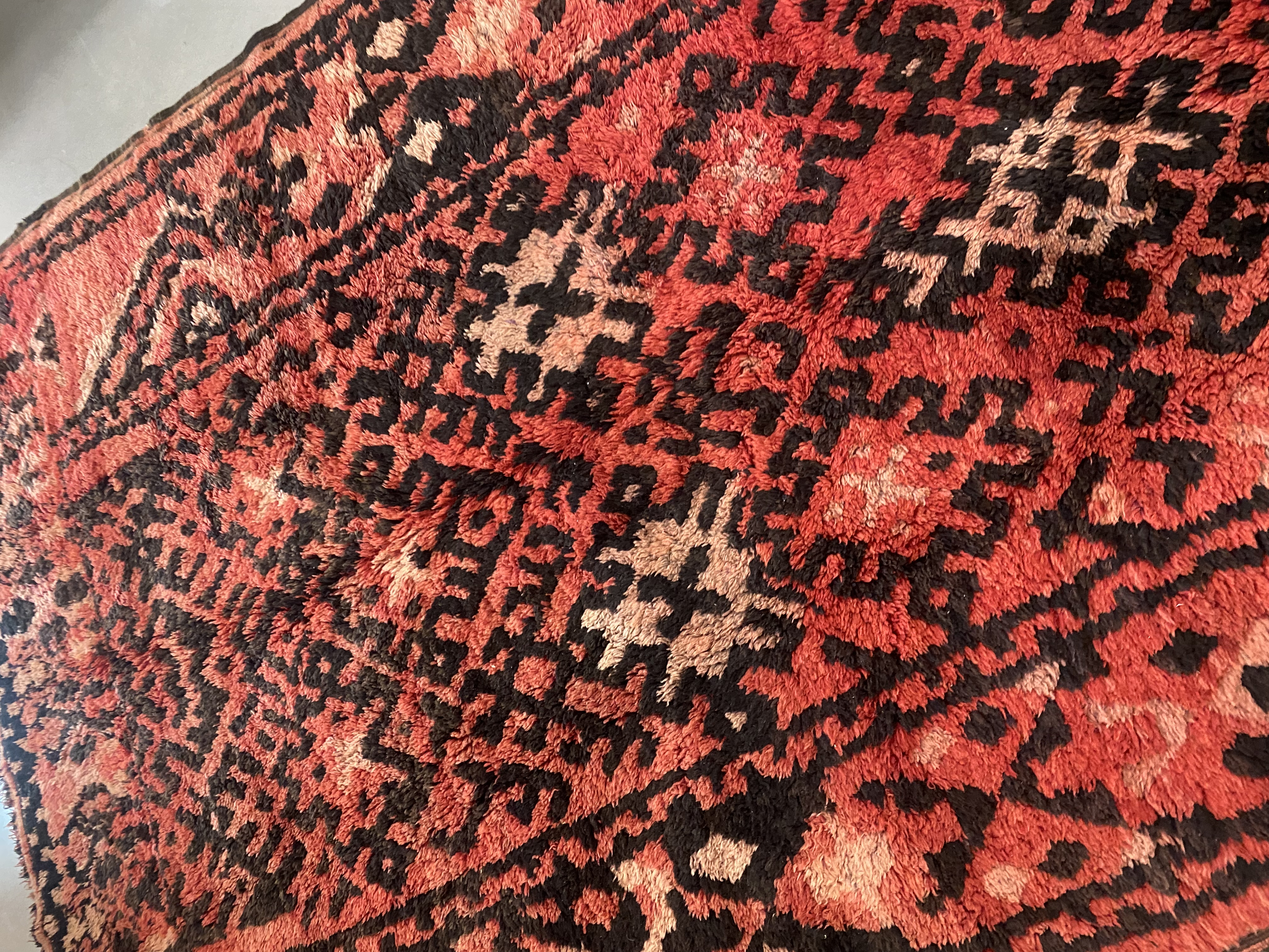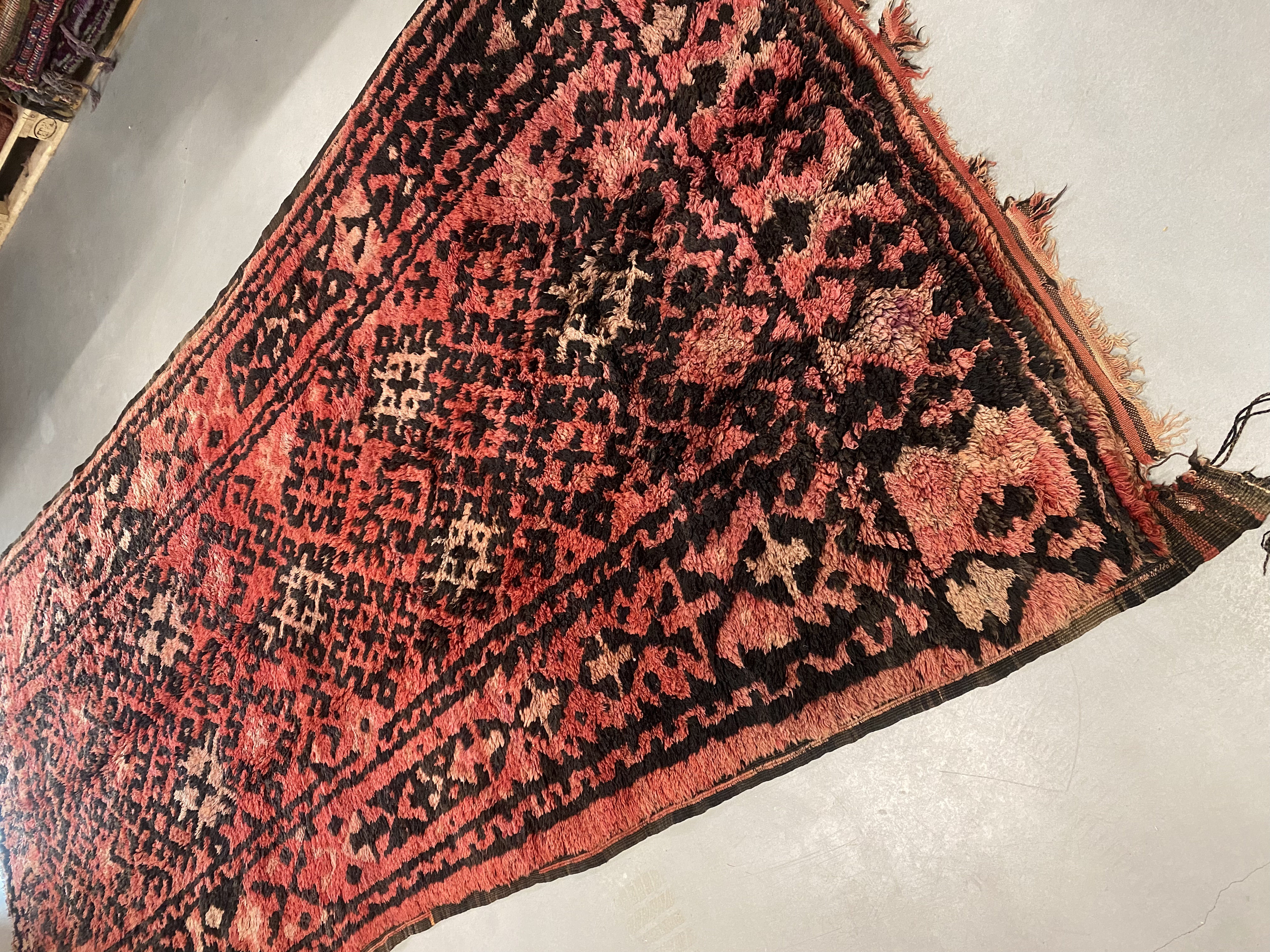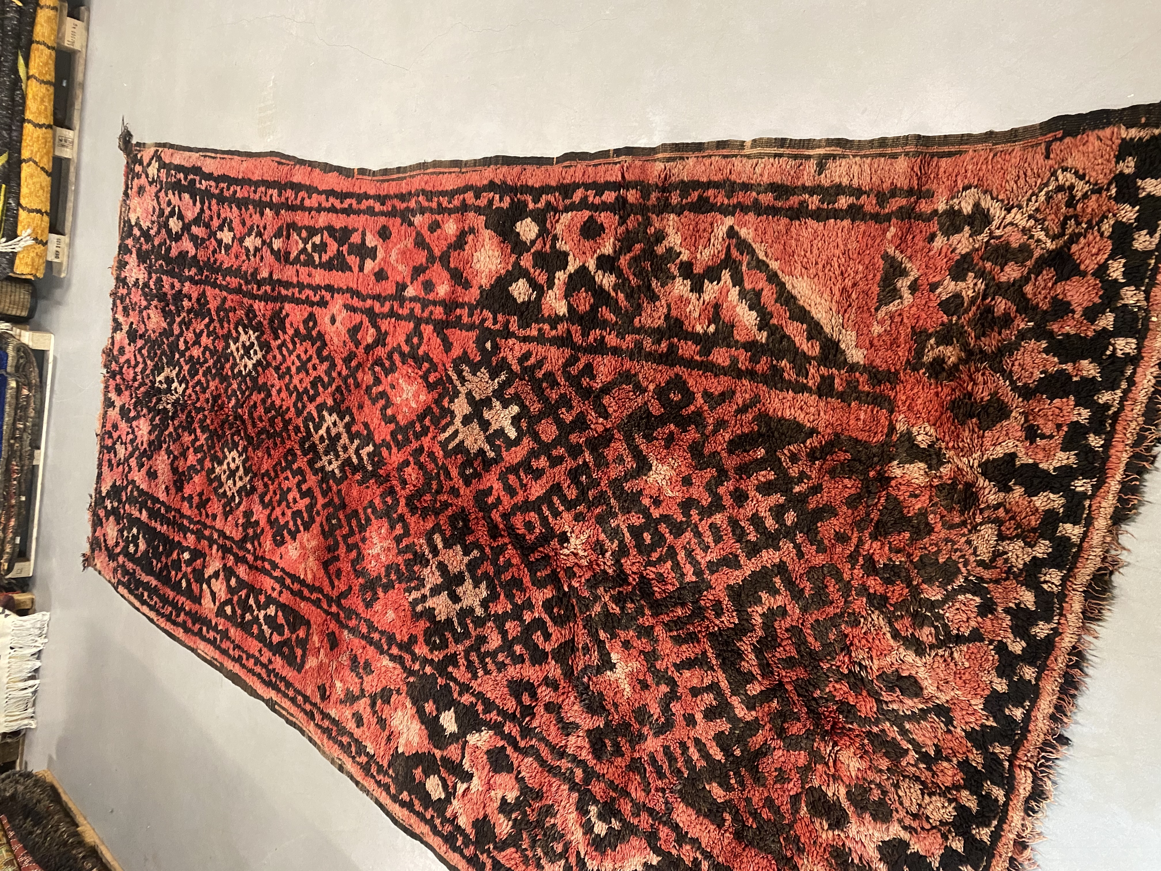 Beni Mguild rugs originate from the western central Middle Atlas region of Morocco, and as with most regions, they have their own style. The weavers in this region like to take the designs commonly found in flat weave rugs, and adapt them to their pile weave, hand knotted creations. This creates bold, flowing imagery that captures the joyous character of the weaver herself.