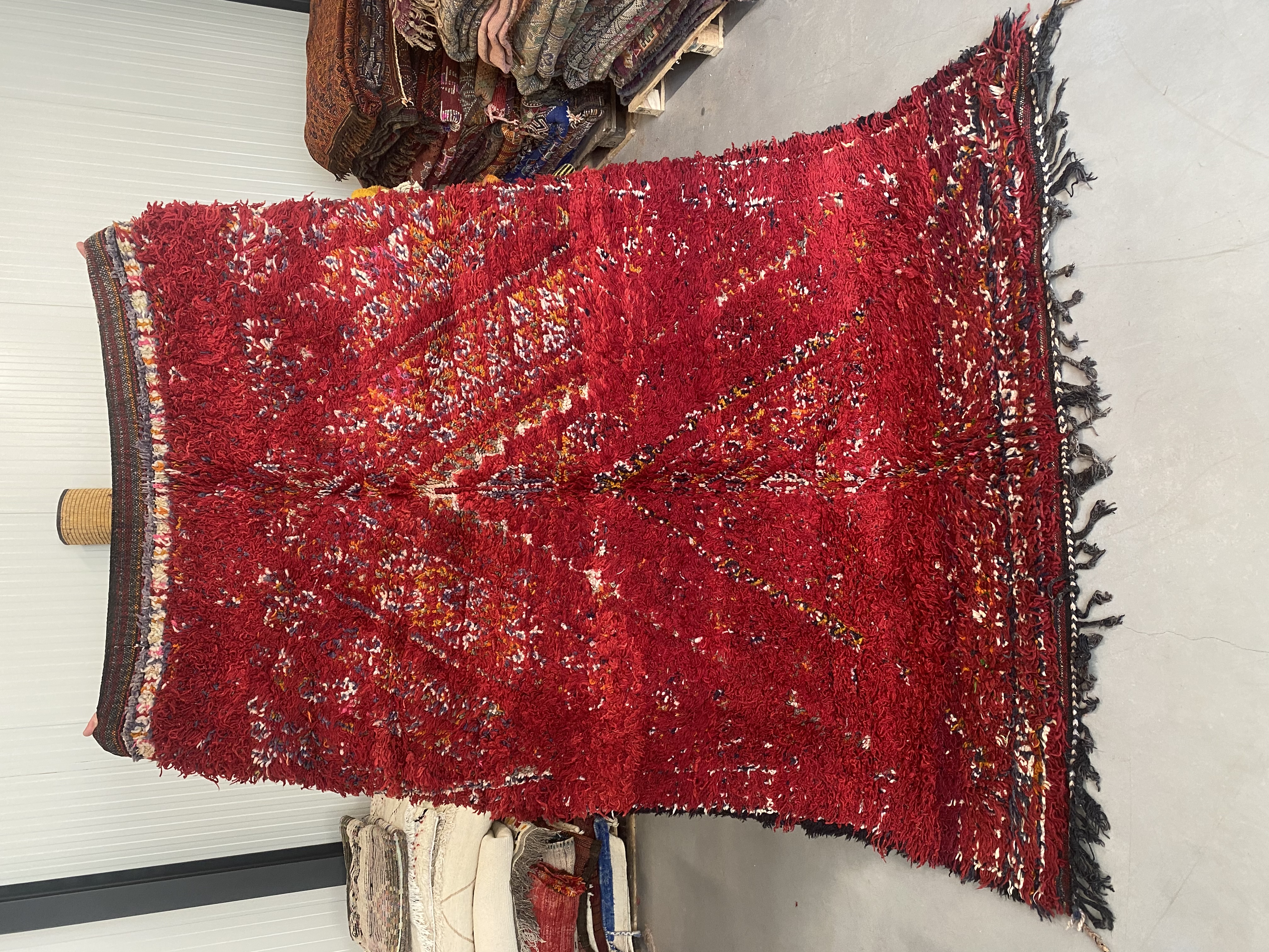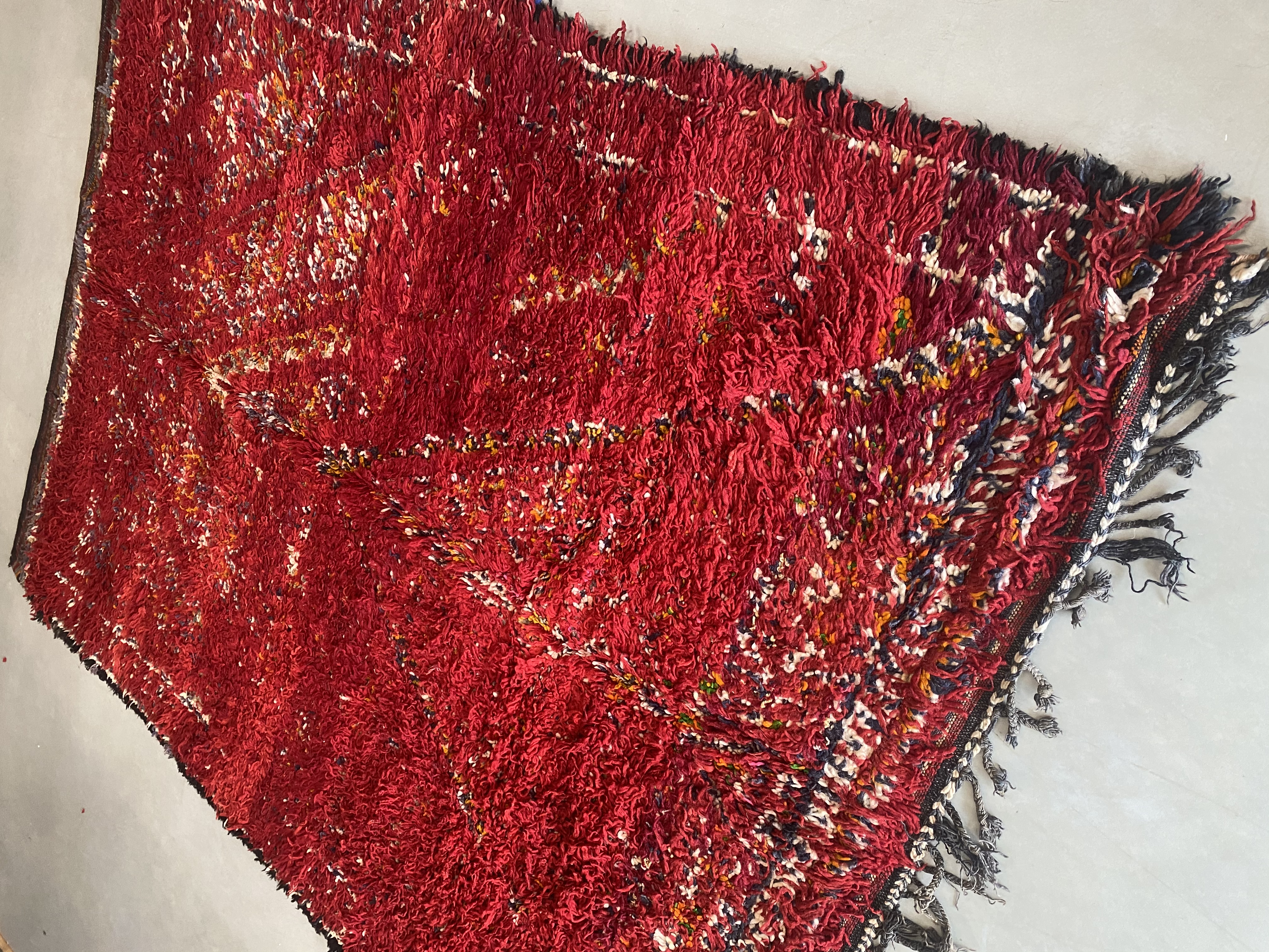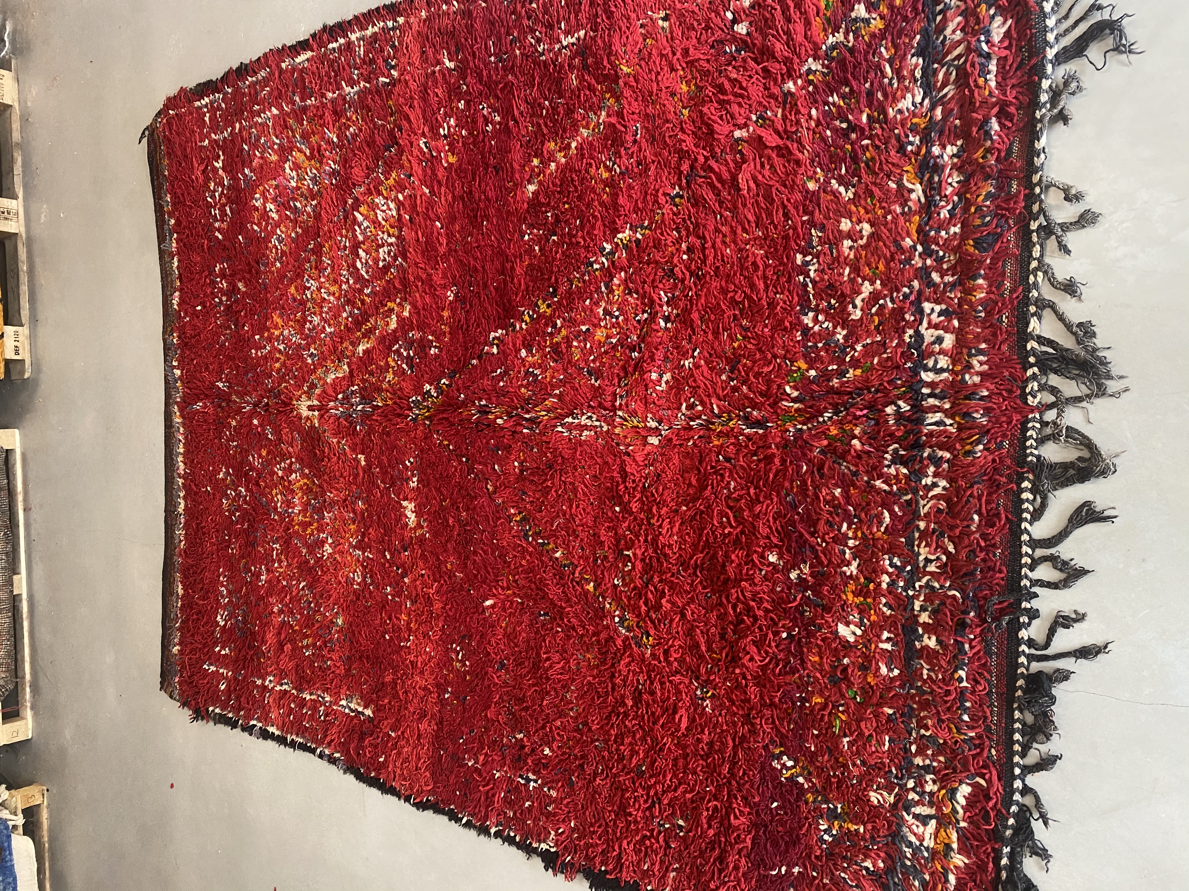 Beni Mguild rugs originate from the western central Middle Atlas region of Morocco, and as with most regions, they have their own style. The weavers in this region like to take the designs commonly found in flat weave rugs, and adapt them to their pile weave, hand knotted creations. This creates bold, flowing imagery that captures the joyous character of the weaver herself.