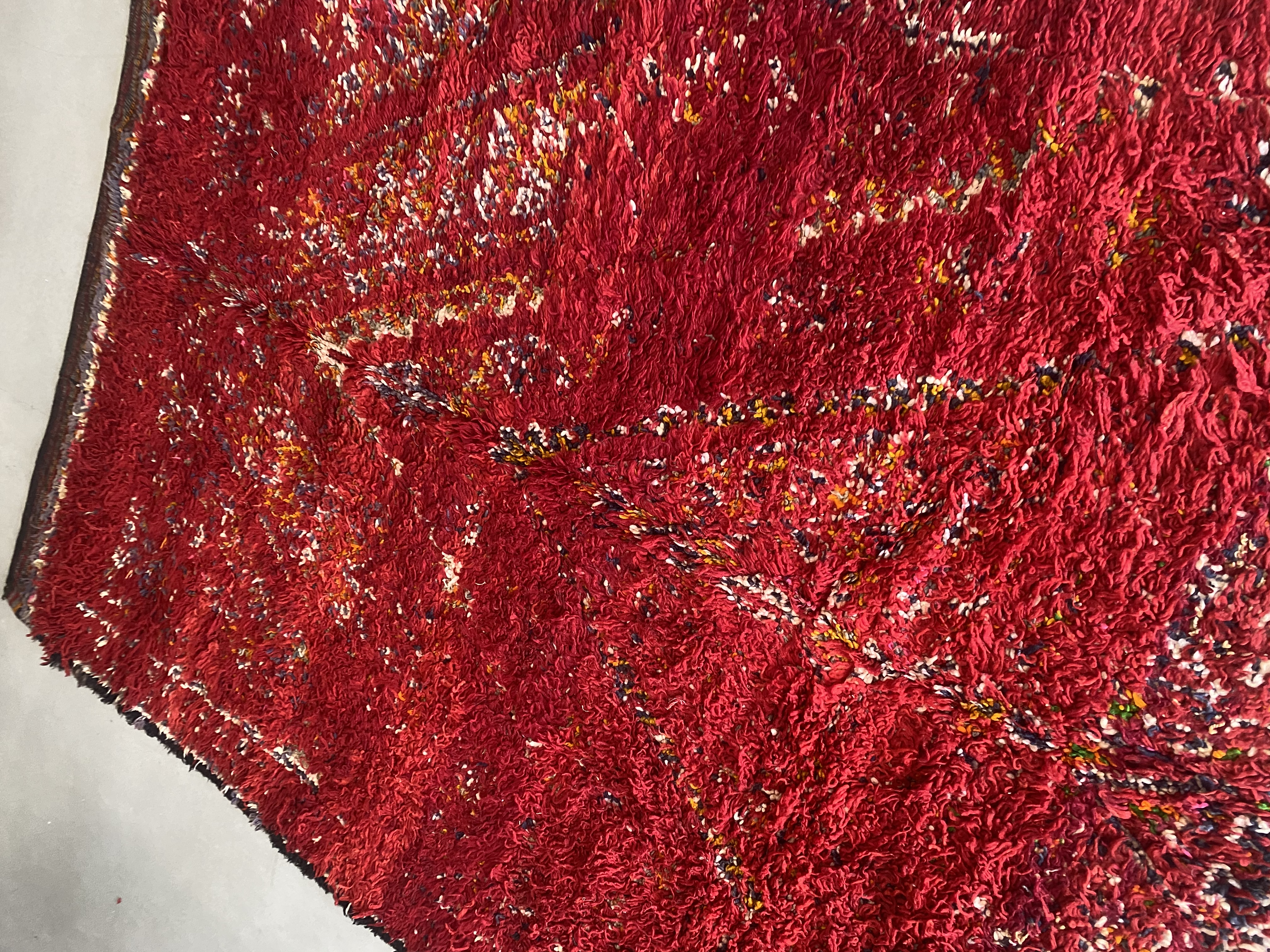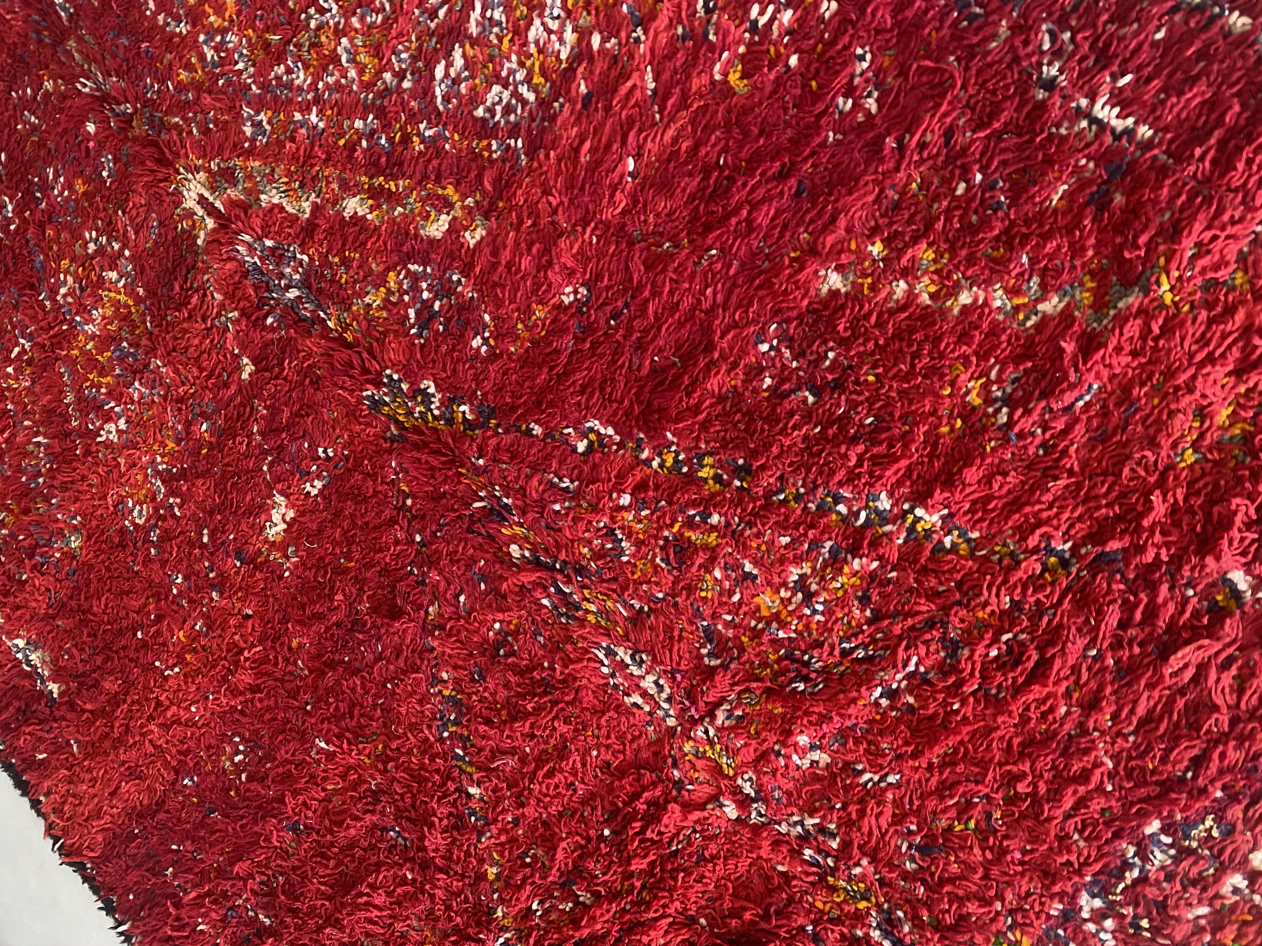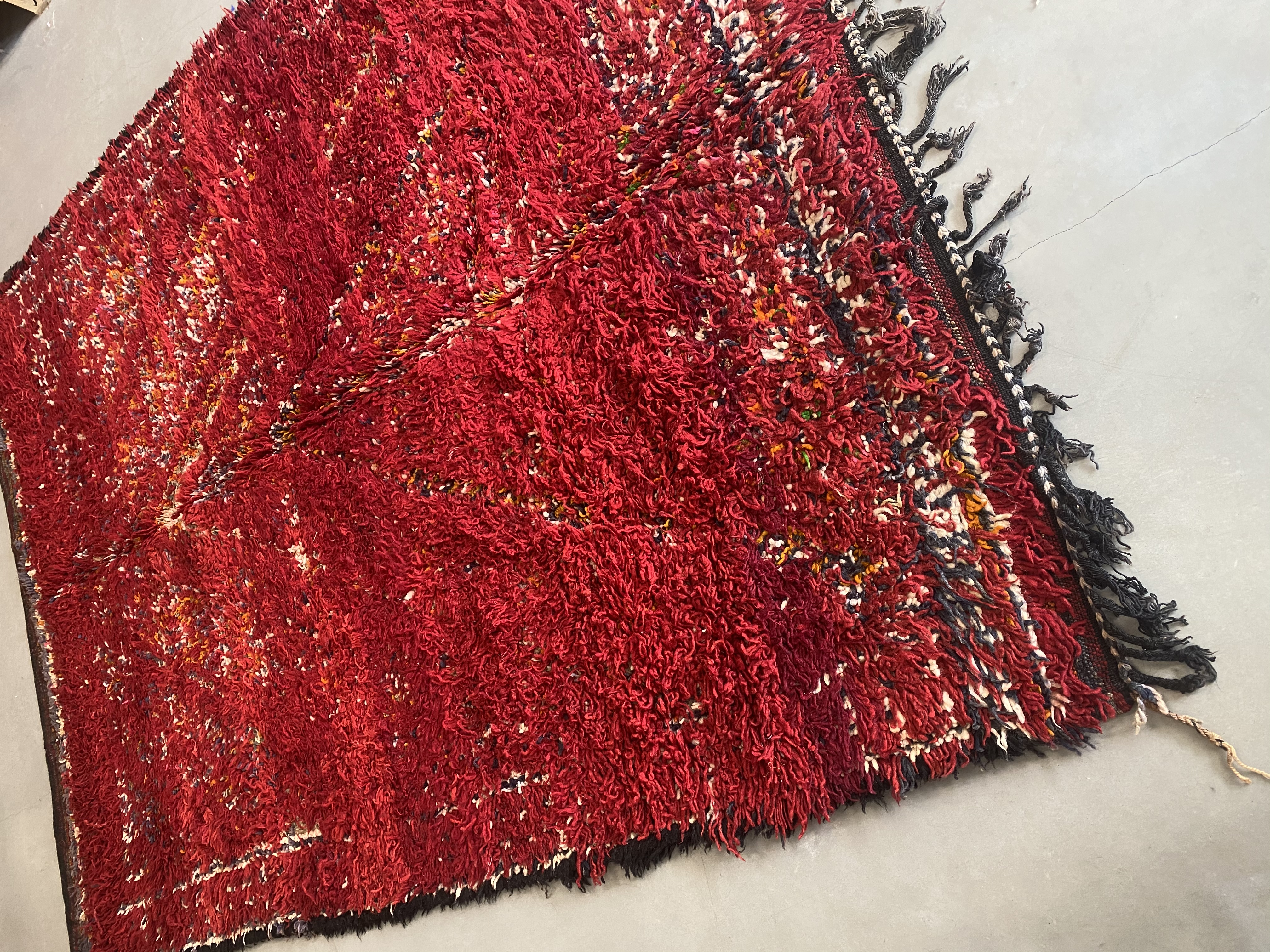 Beni Mguild rugs originate from the western central Middle Atlas region of Morocco, and as with most regions, they have their own style. The weavers in this region like to take the designs commonly found in flat weave rugs, and adapt them to their pile weave, hand knotted creations. This creates bold, flowing imagery that captures the joyous character of the weaver herself.