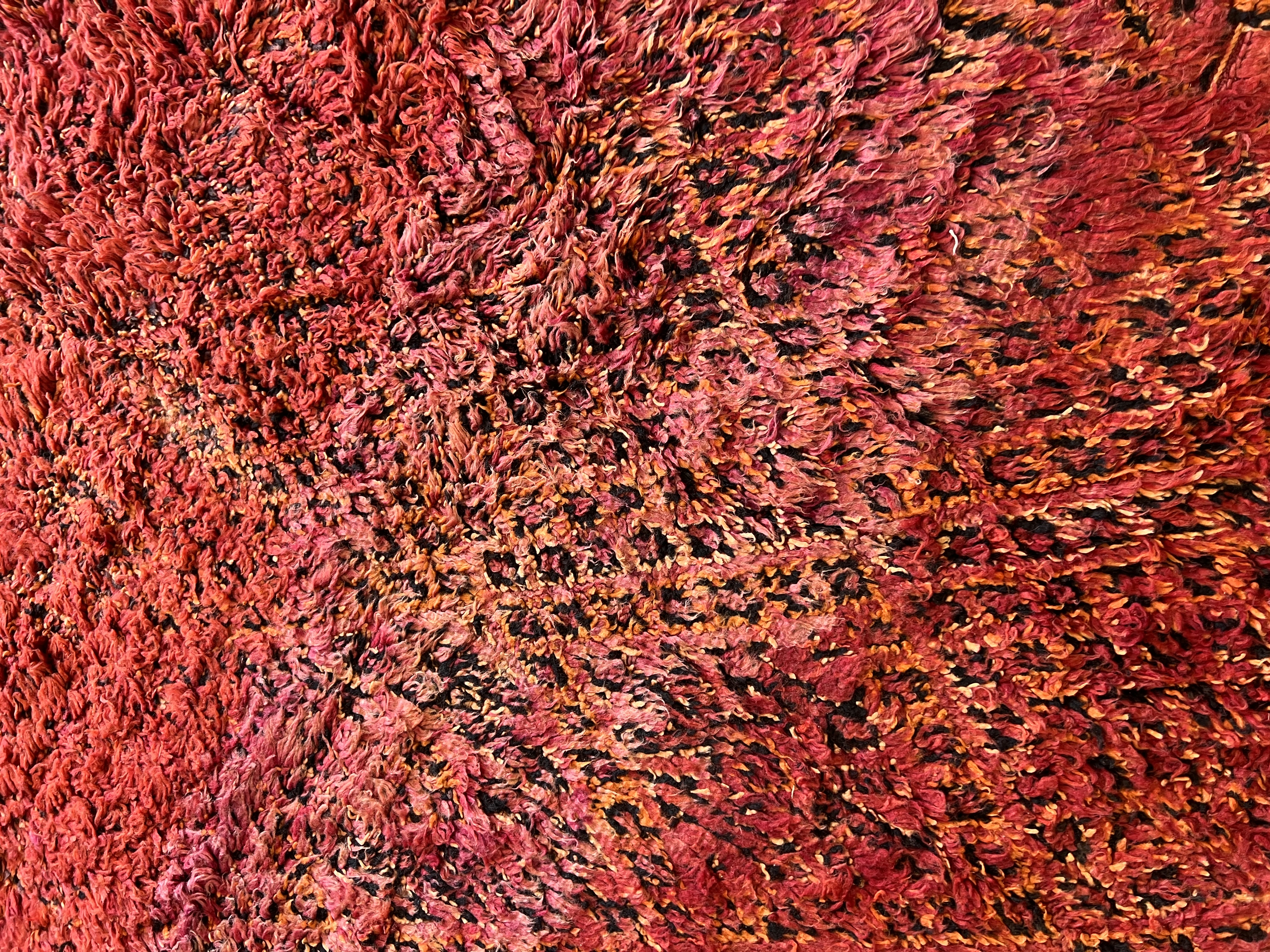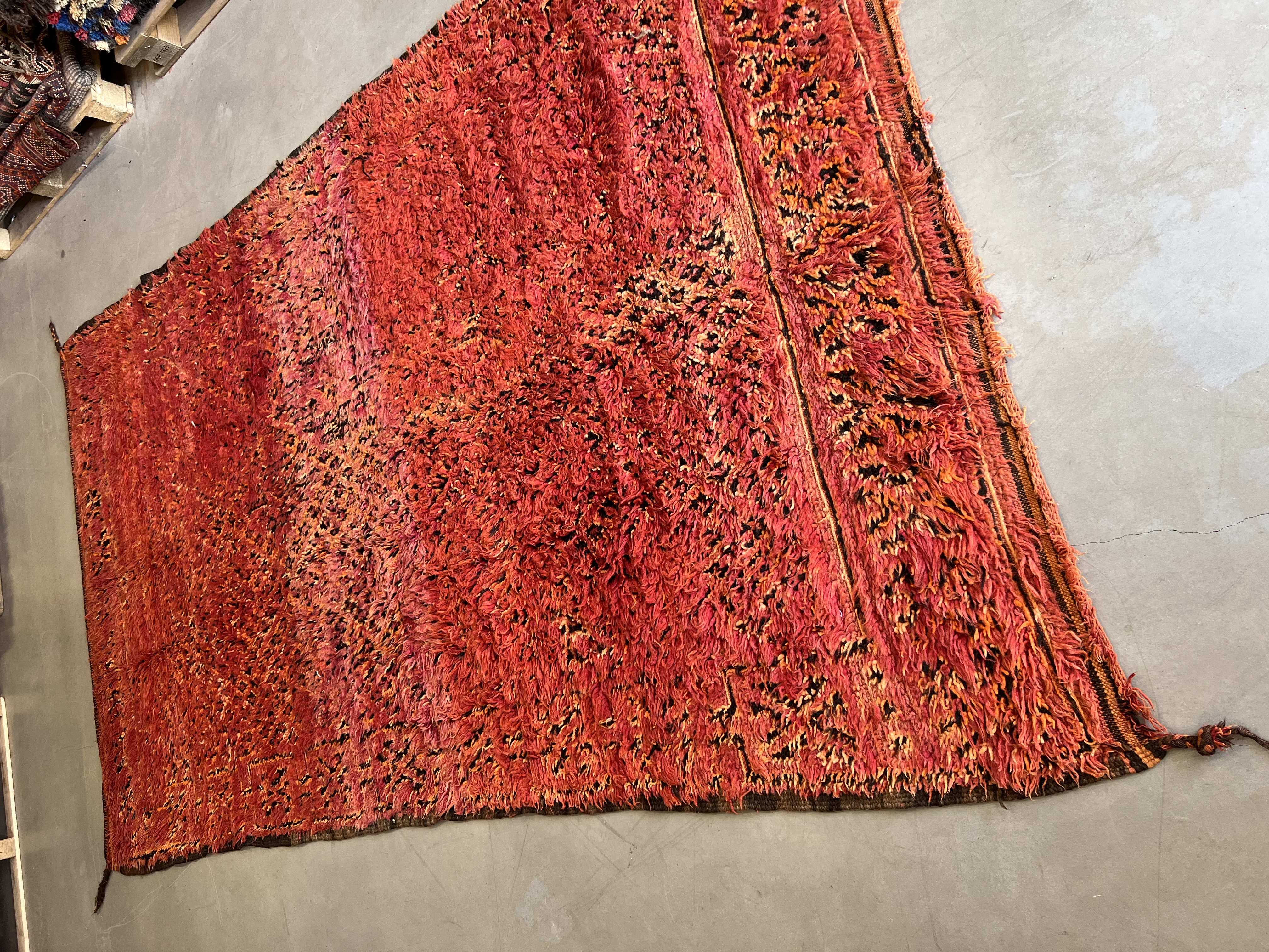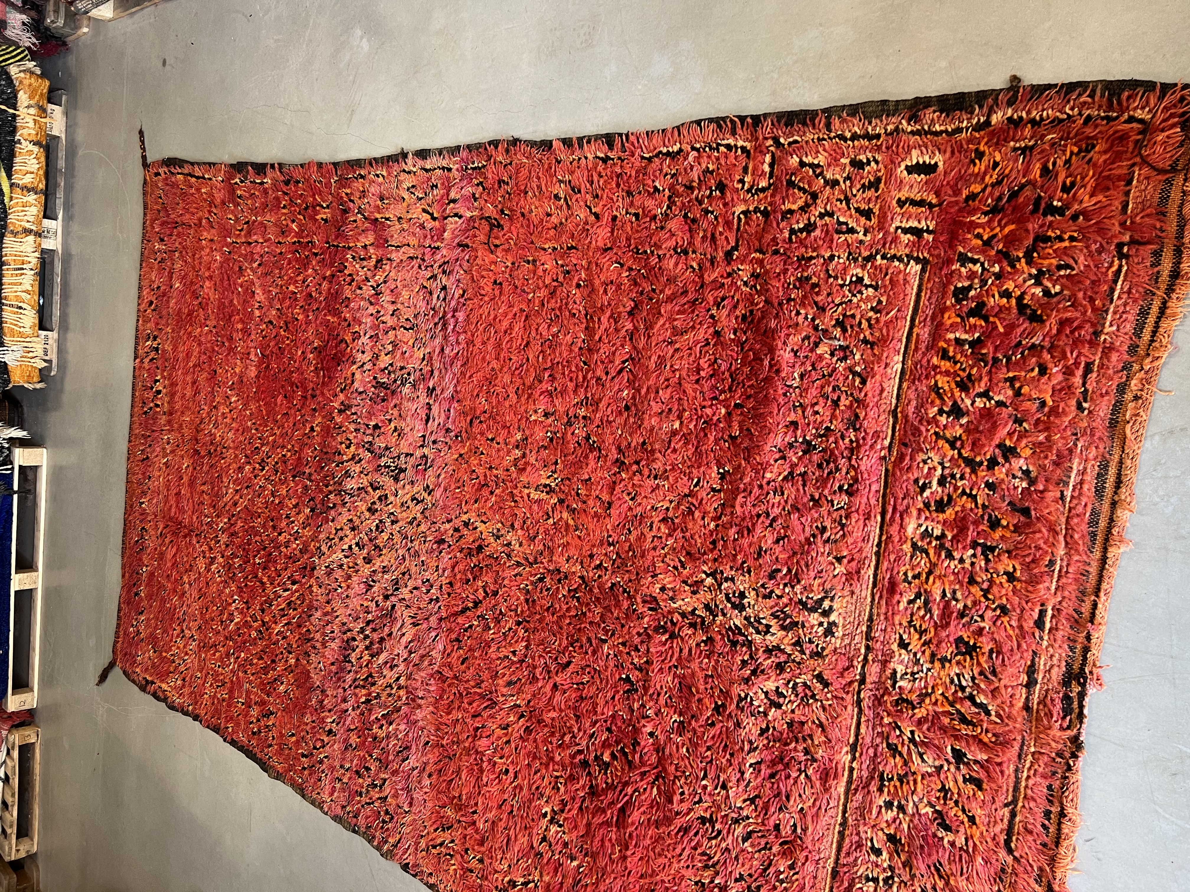 Beni Mguild rugs originate from the western central Middle Atlas region of Morocco, and as with most regions, they have their own style. The weavers in this region like to take the designs commonly found in flat weave rugs, and adapt them to their pile weave, hand knotted creations. This creates bold, flowing imagery that captures the joyous character of the weaver herself.