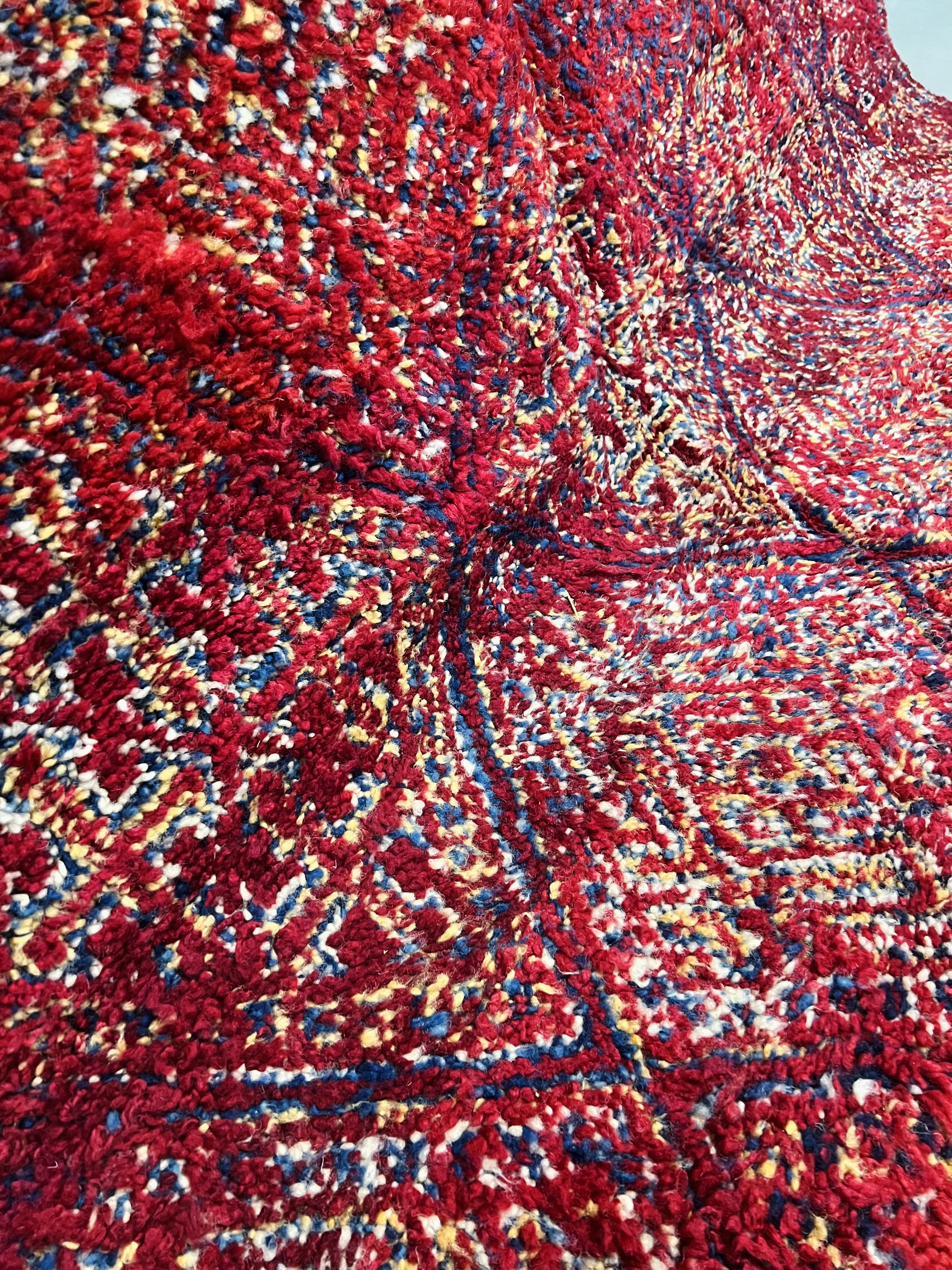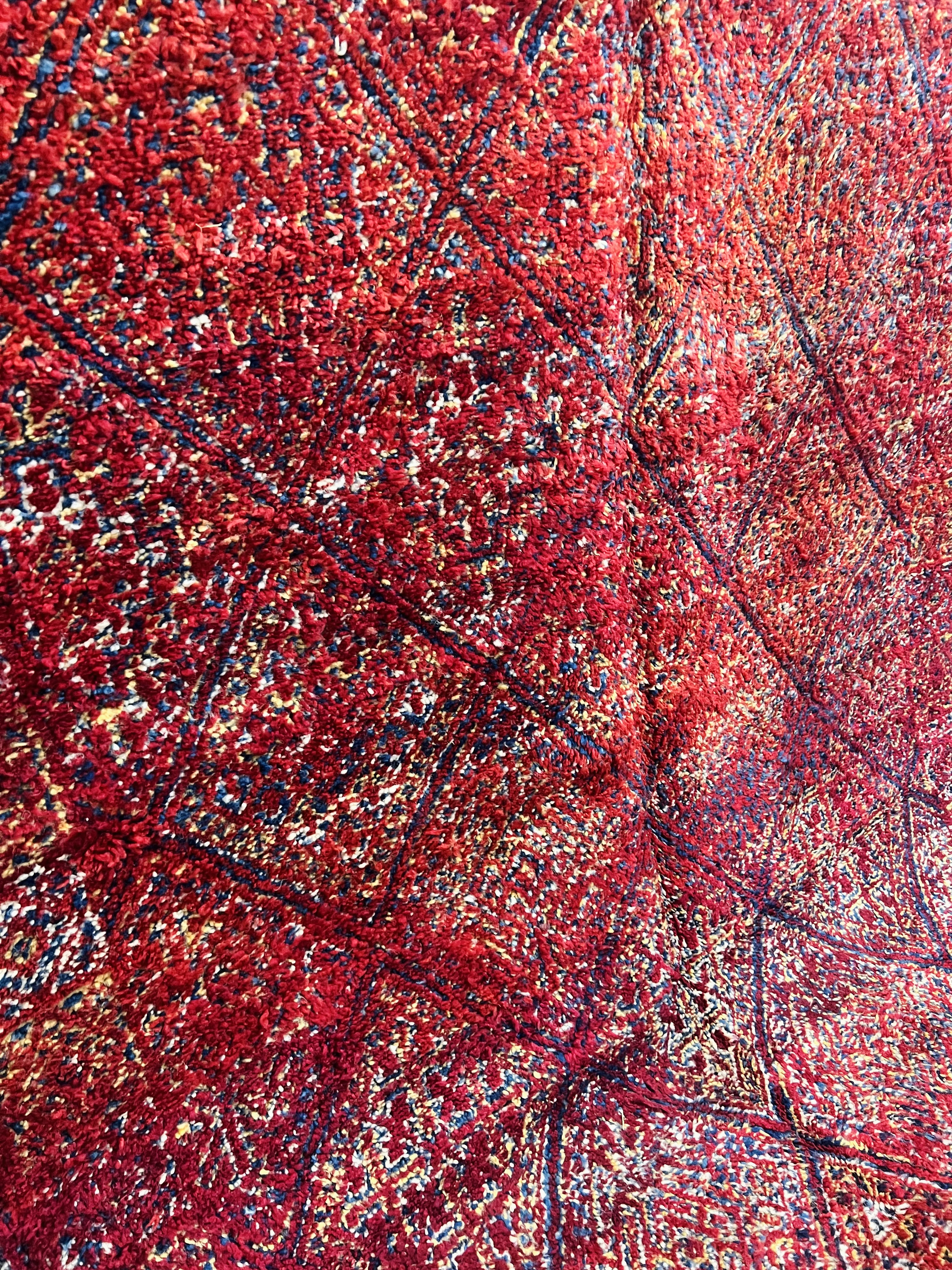 Beni Mguild rug, from western central Middle Atlas in Morocco. A unique variant of a "tree of life" design; quite typically the weavers of this region in the Middle Atlas love to enlarge flatweave motifs and transform them into boldly drawn pile rug designs. Loved for their playful and complex color variation.