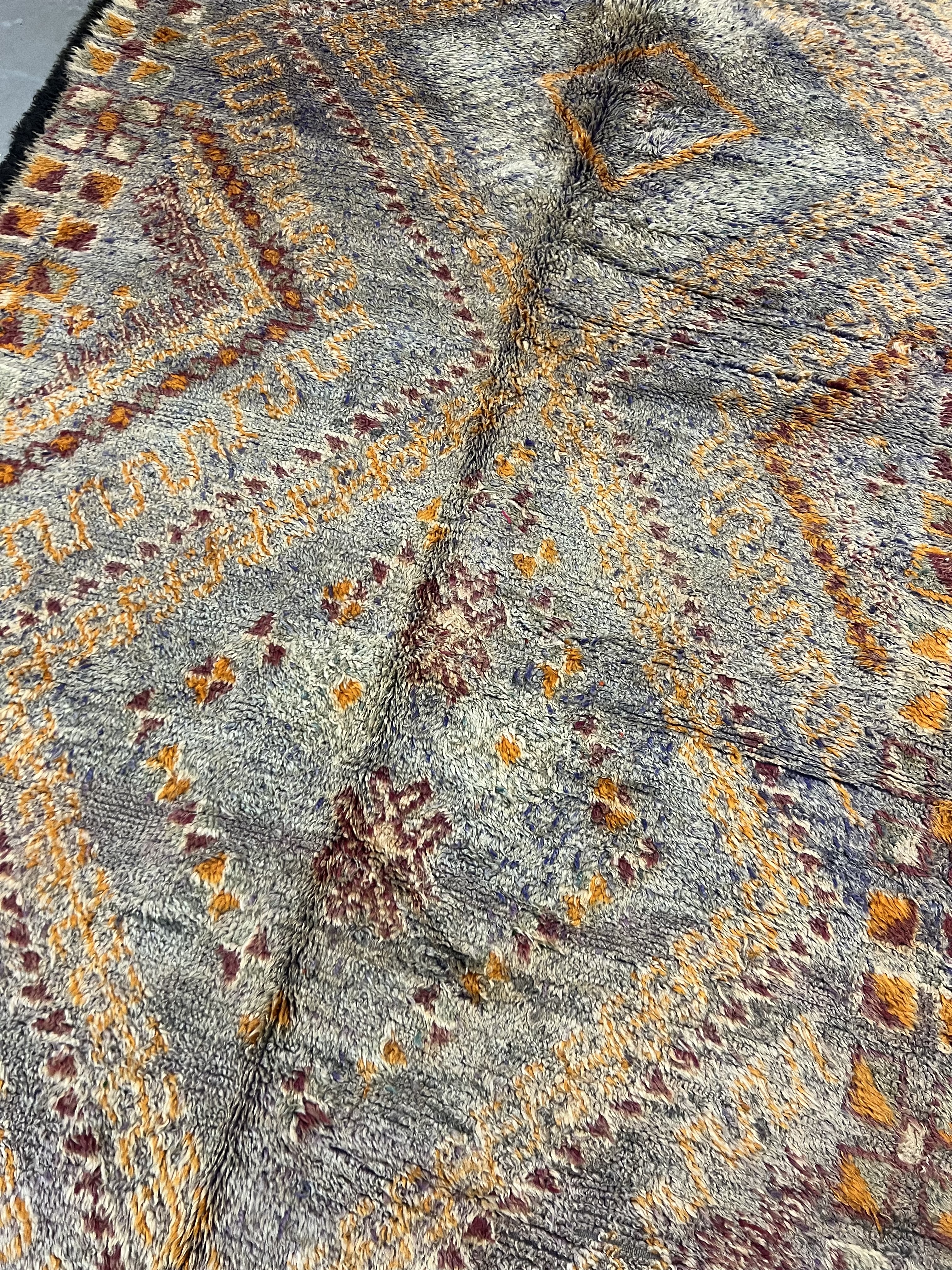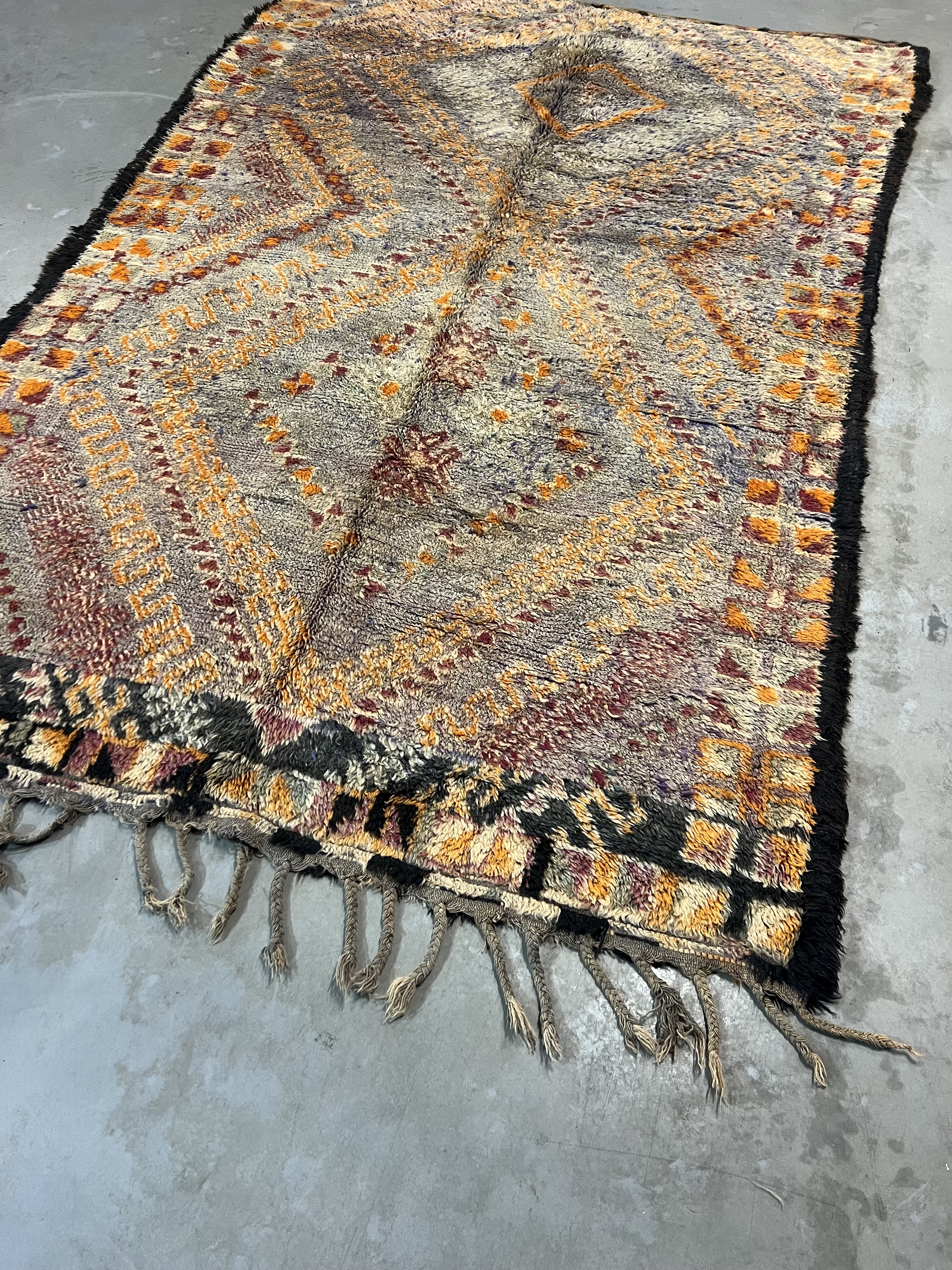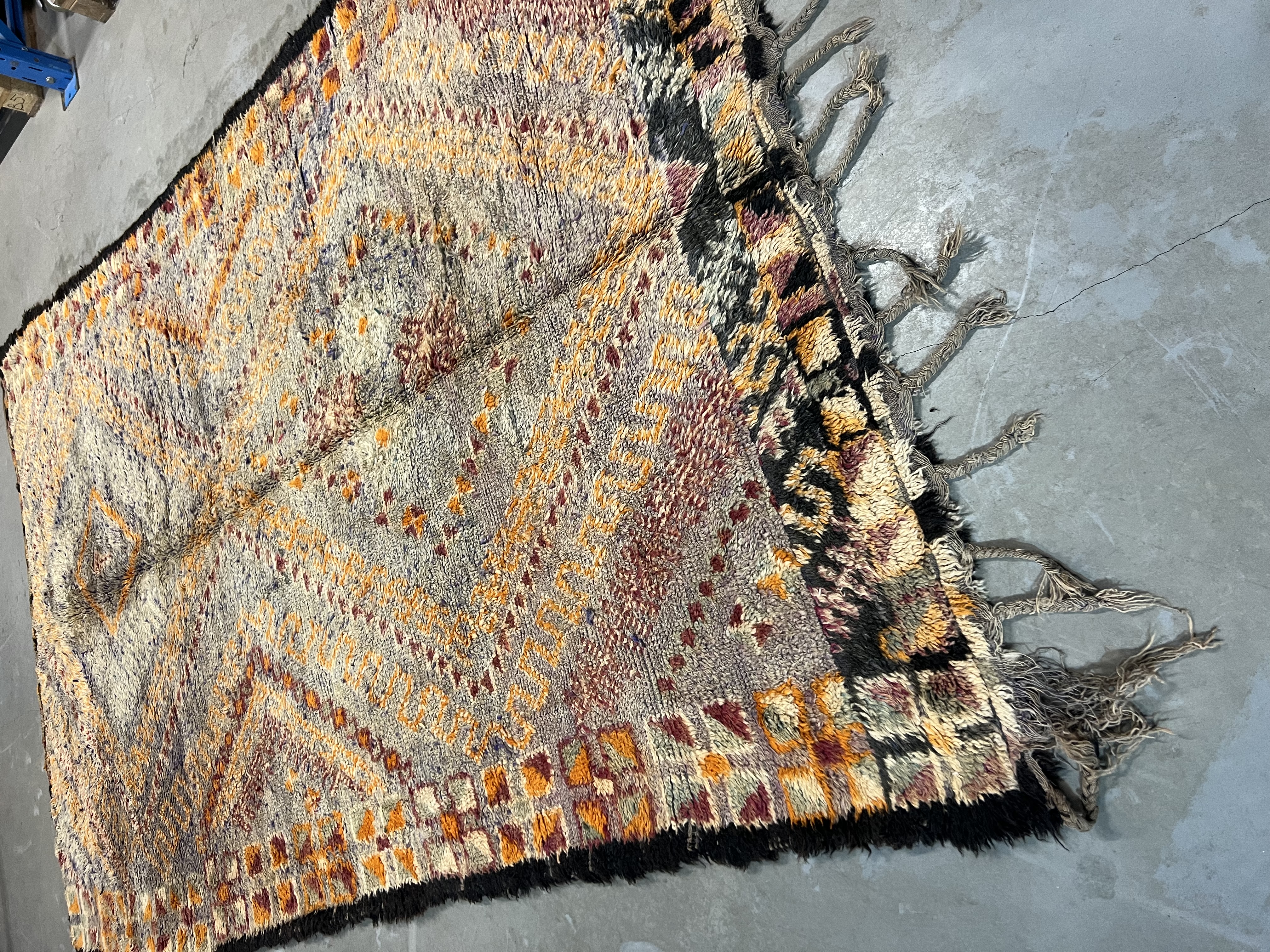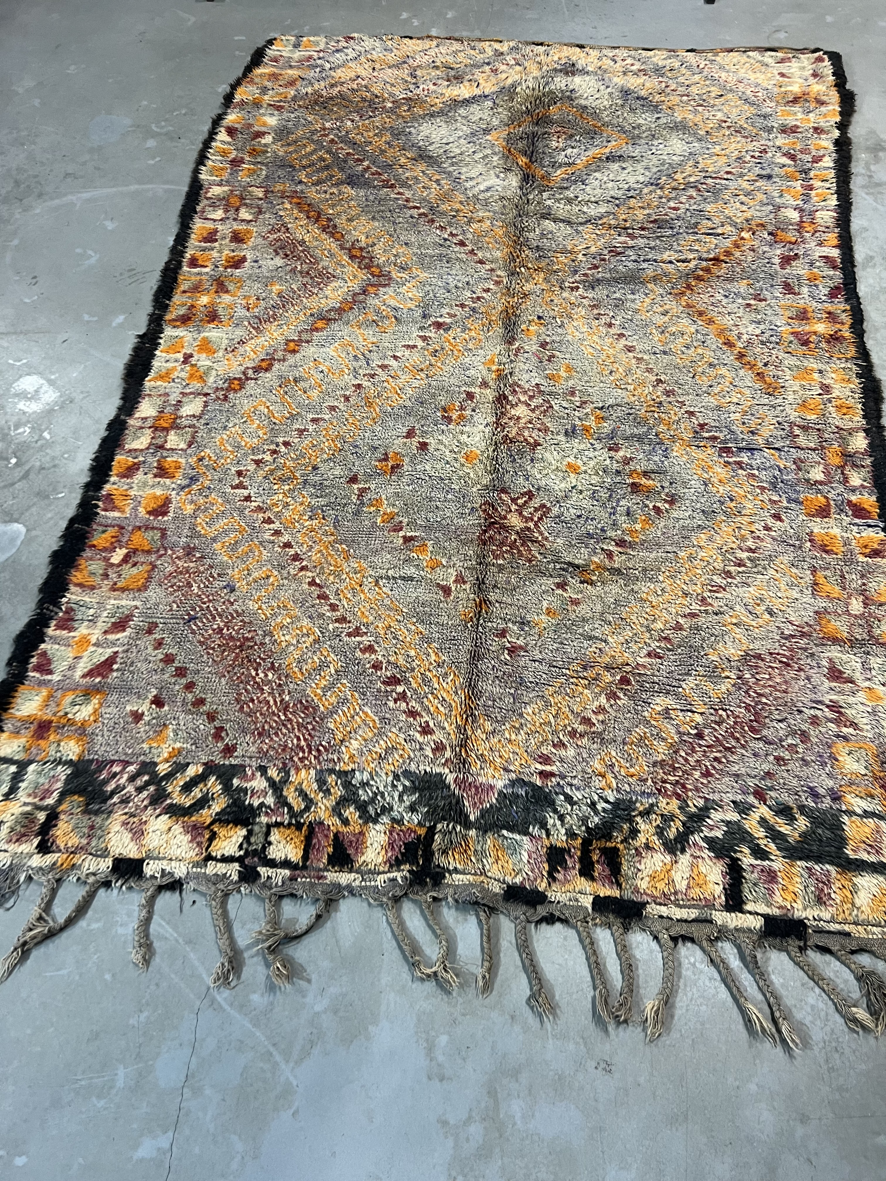 Beni Mguild rugs originate from the western central Middle Atlas region of Morocco, and as with most regions, they have their own style. The weavers in this region like to take the designs commonly found in flat weave rugs, and adapt them to their pile weave, hand knotted creations. This creates bold, flowing imagery that captures the joyous character of the weaver herself.