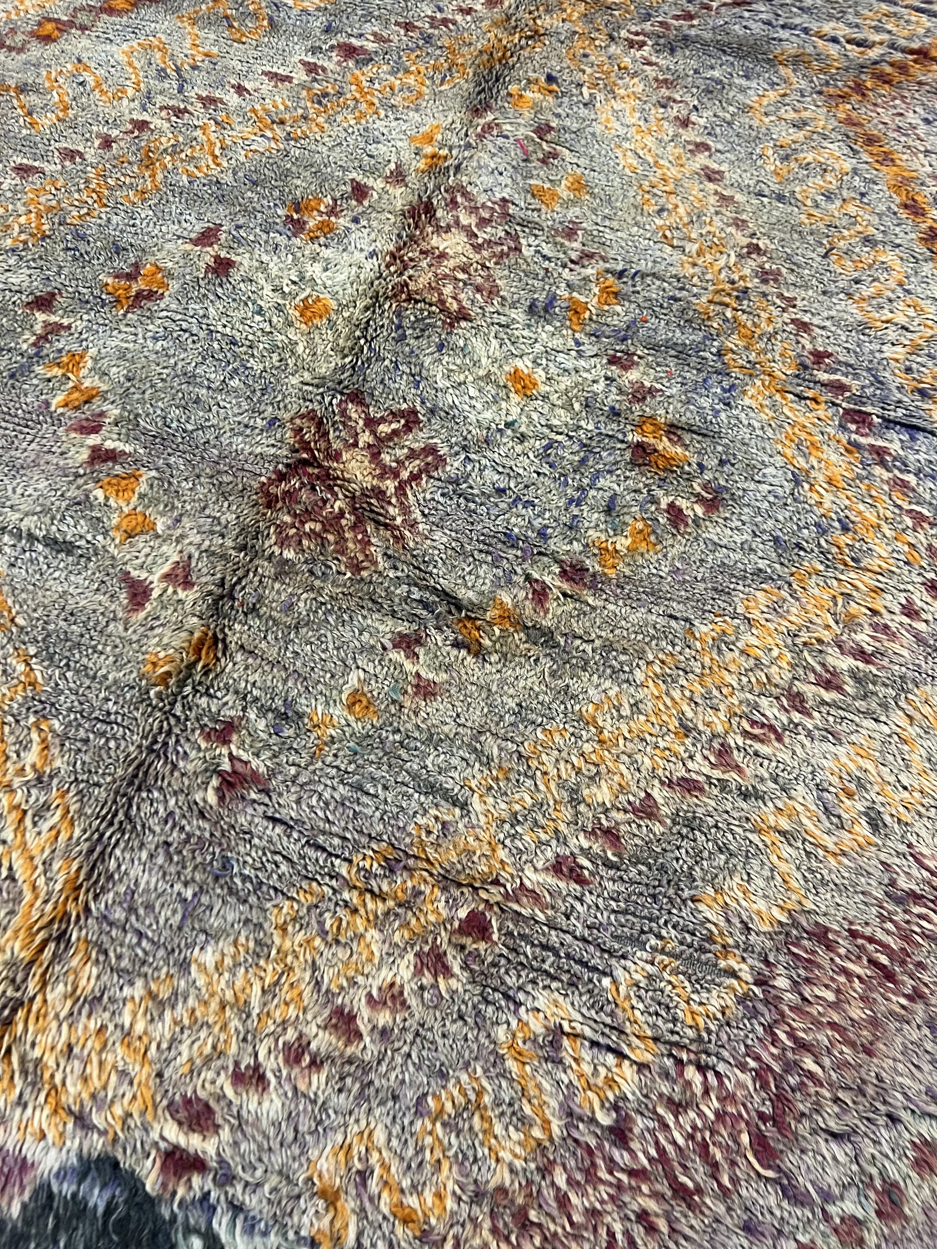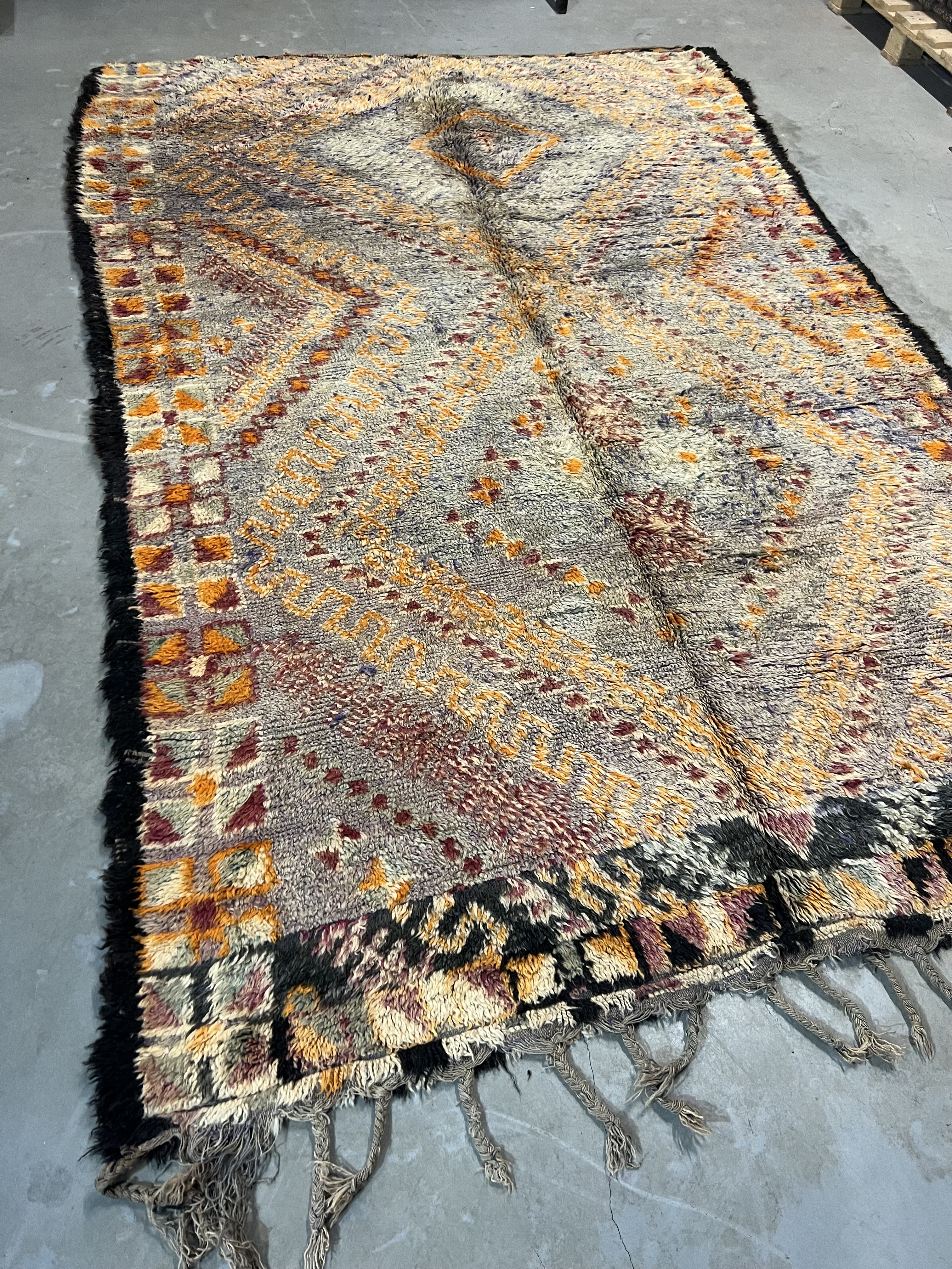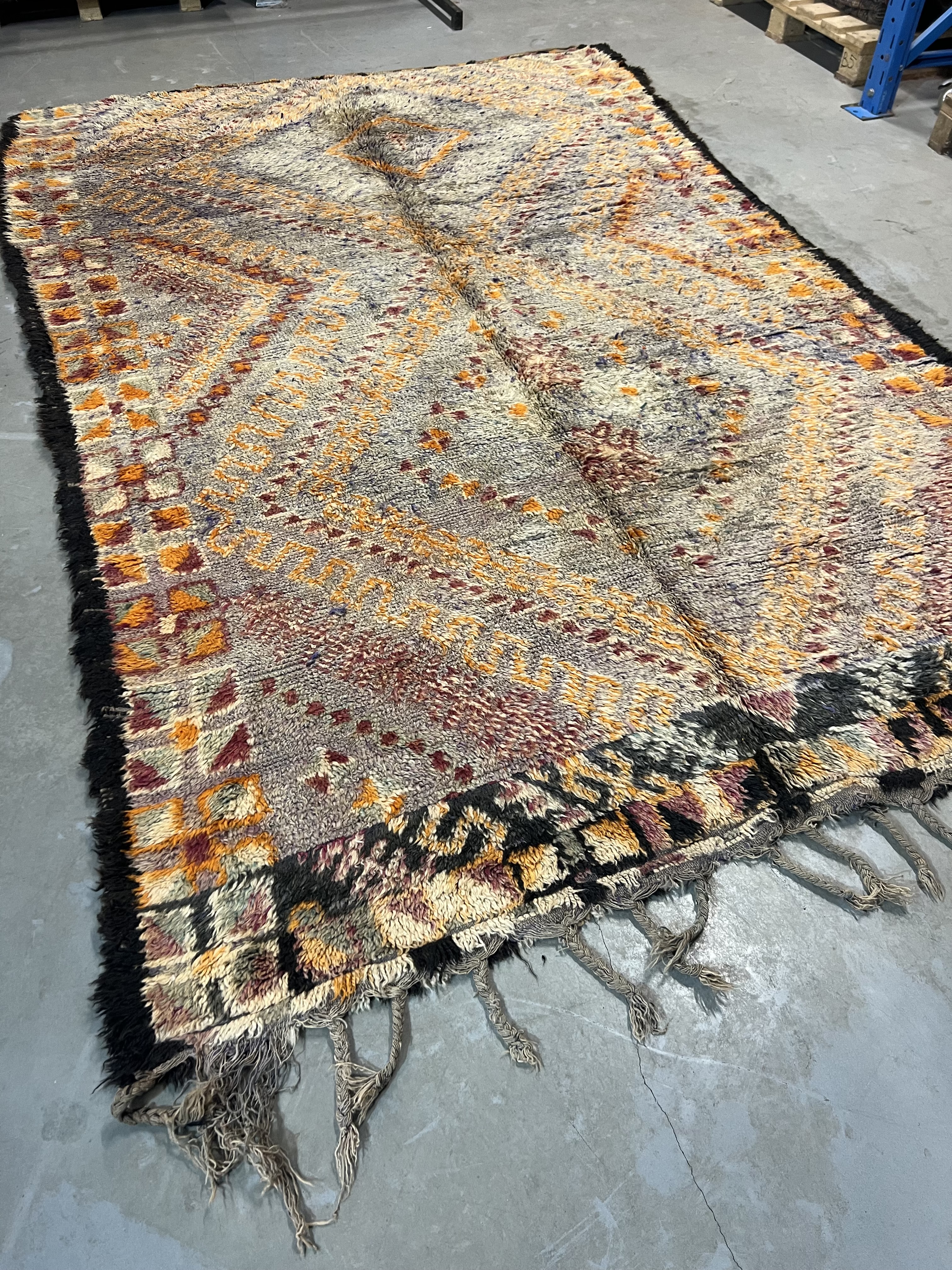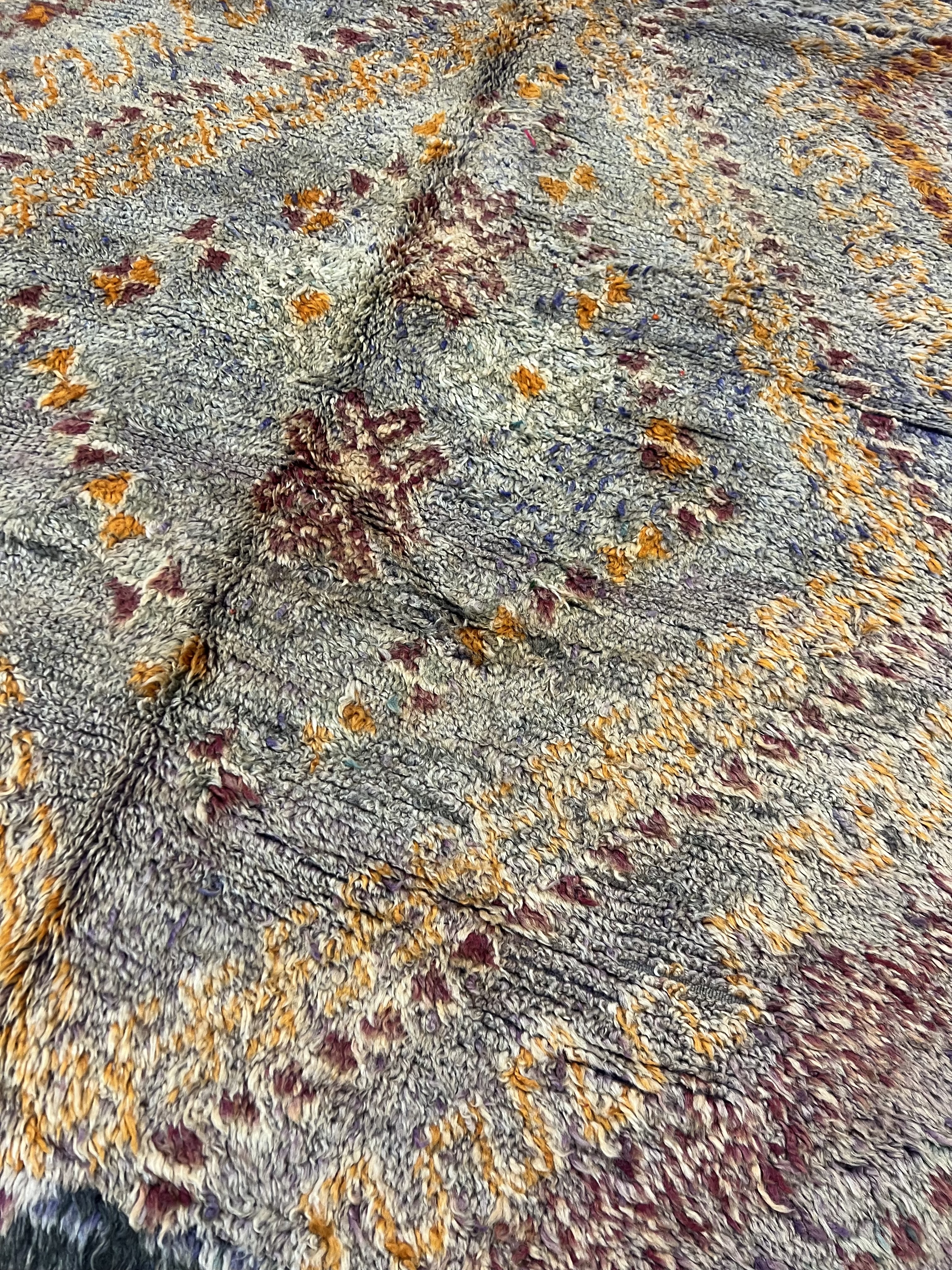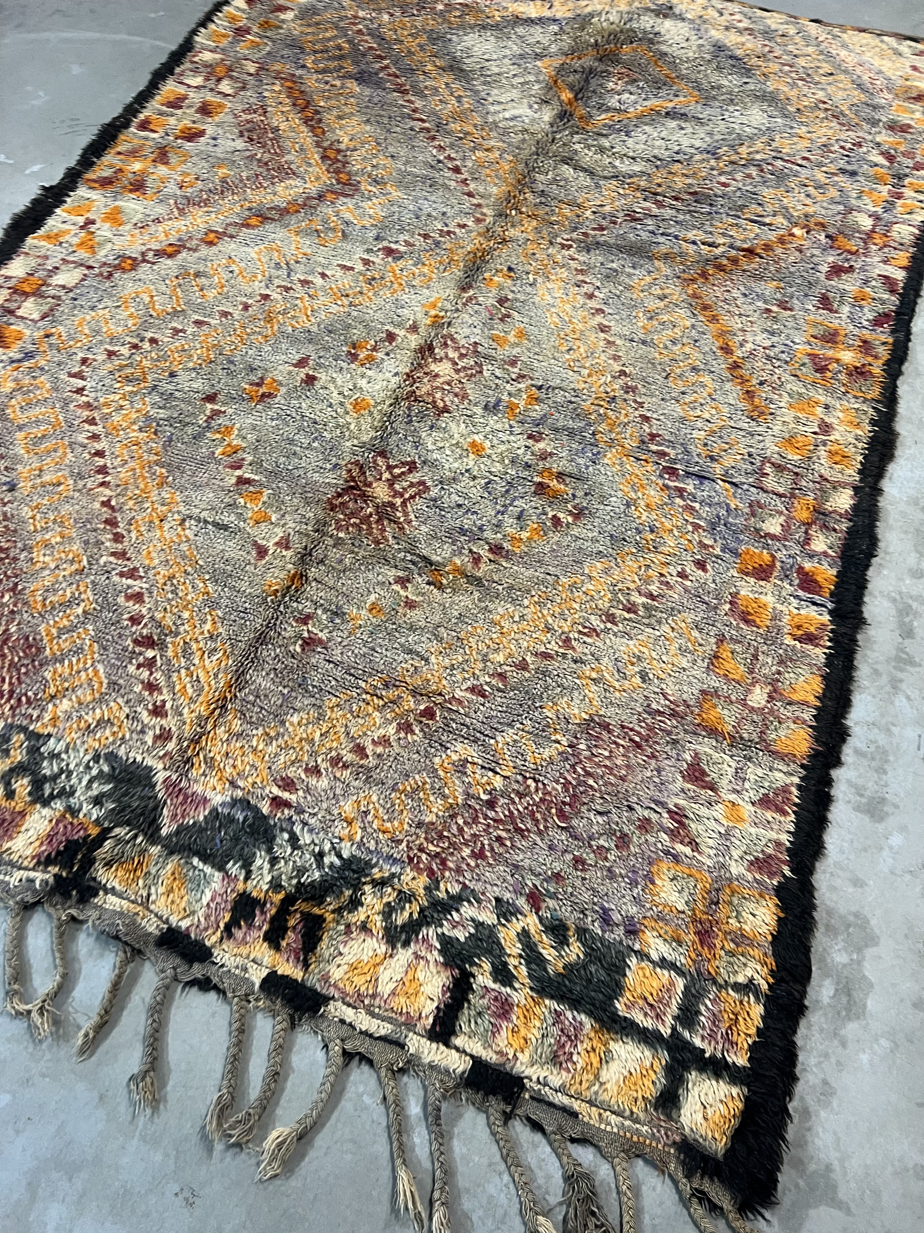 Beni Mguild rugs originate from the western central Middle Atlas region of Morocco, and as with most regions, they have their own style. The weavers in this region like to take the designs commonly found in flat weave rugs, and adapt them to their pile weave, hand knotted creations. This creates bold, flowing imagery that captures the joyous character of the weaver herself.