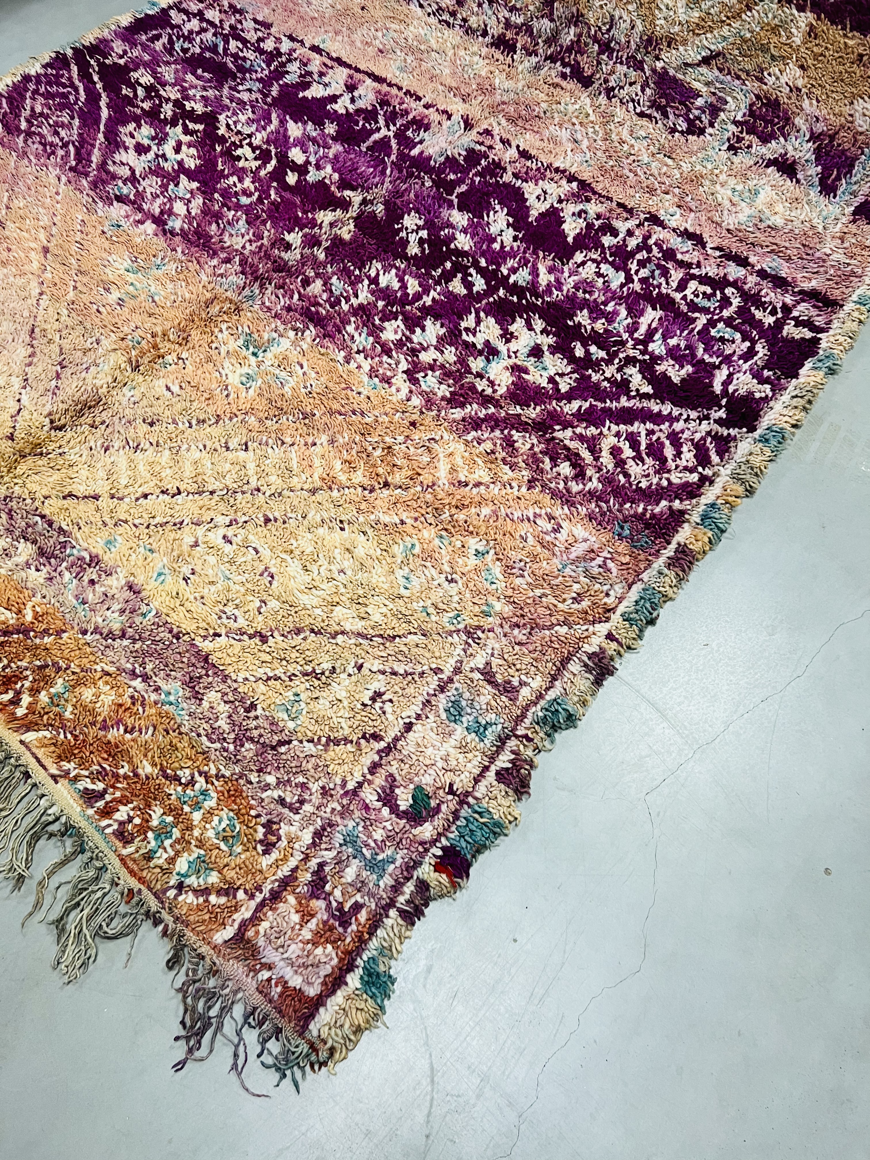 Beni Mguild rugs originate from the western central Middle Atlas region of Morocco, and as with most regions, they have their own style. The weavers in this region like to take the designs commonly found in flat weave rugs, and adapt them to their pile weave, hand knotted creations. This creates bold, flowing imagery that captures the joyous character of the weaver herself.