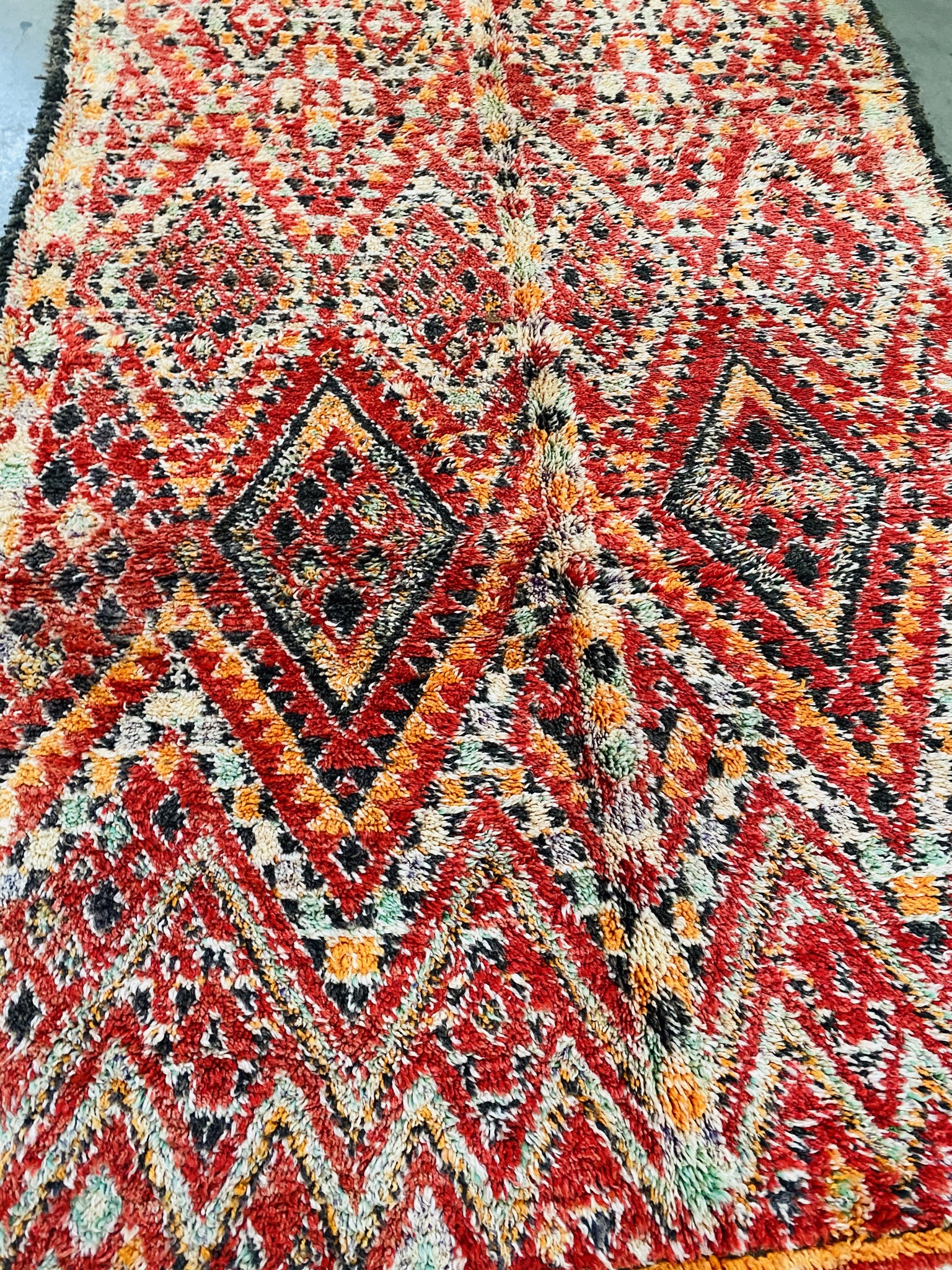 Beni Mguild rugs originate from the western central Middle Atlas region of Morocco, and as with most regions, they have their own style. The weavers in this region like to take the designs commonly found in flat weave rugs, and adapt them to their pile weave, hand knotted creations. This creates bold, flowing imagery that captures the joyous character of the weaver herself.