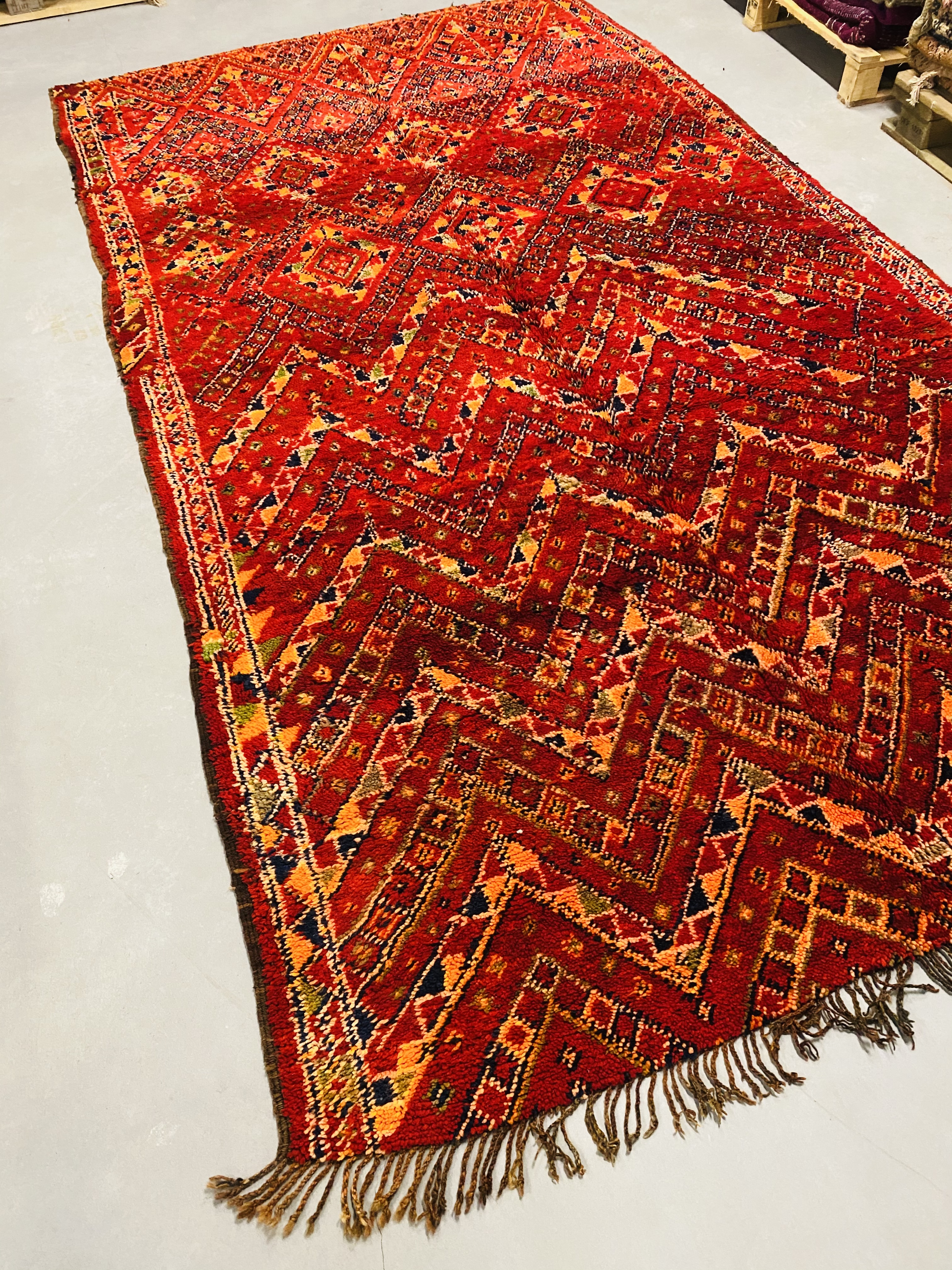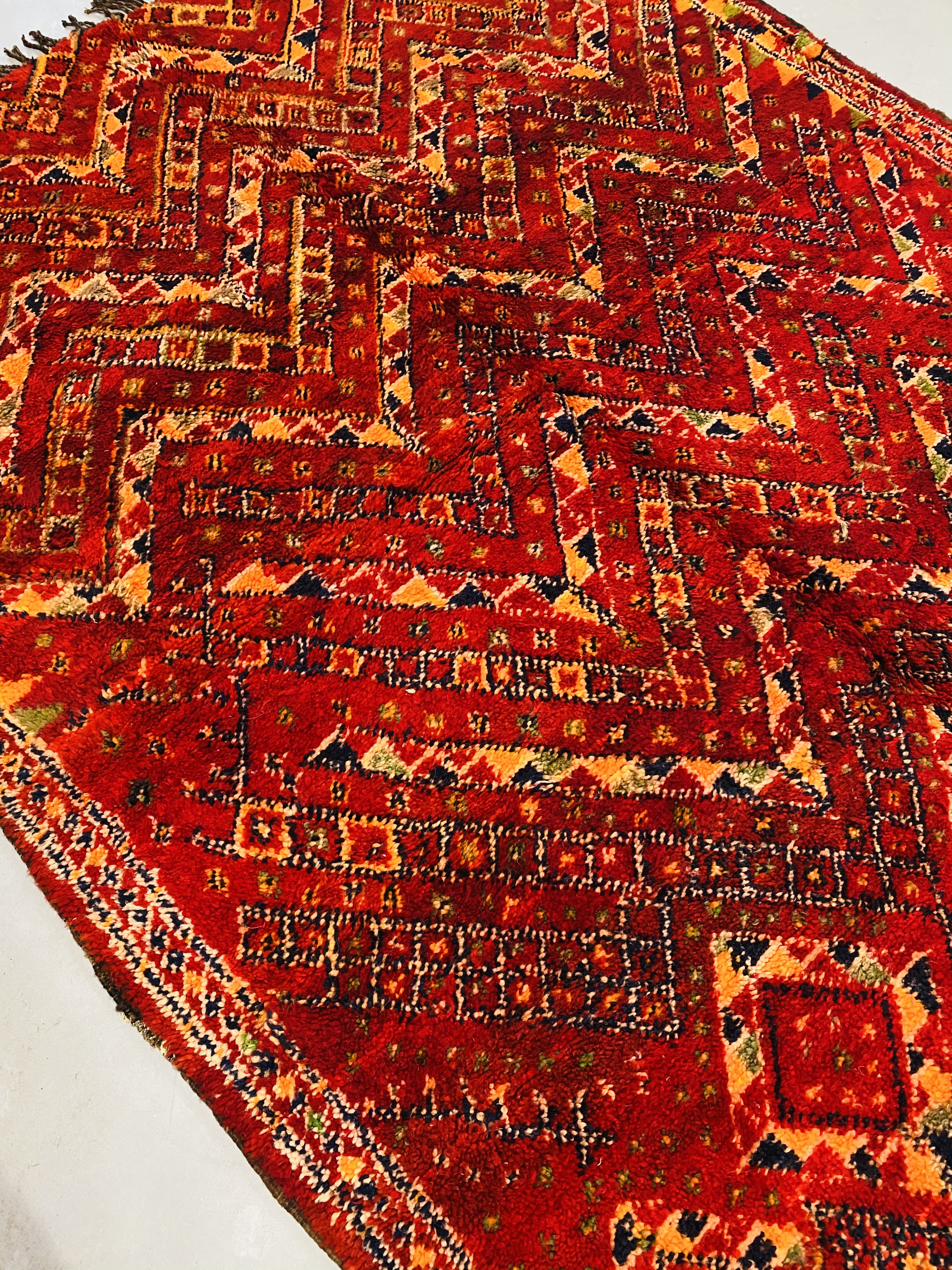 Beni Mguild rugs originate from the western central Middle Atlas region of Morocco, and as with most regions, they have their own style. The weavers in this region like to take the designs commonly found in flat weave rugs, and adapt them to their pile weave, hand knotted creations. This creates bold, flowing imagery that captures the joyous character of the weaver herself.