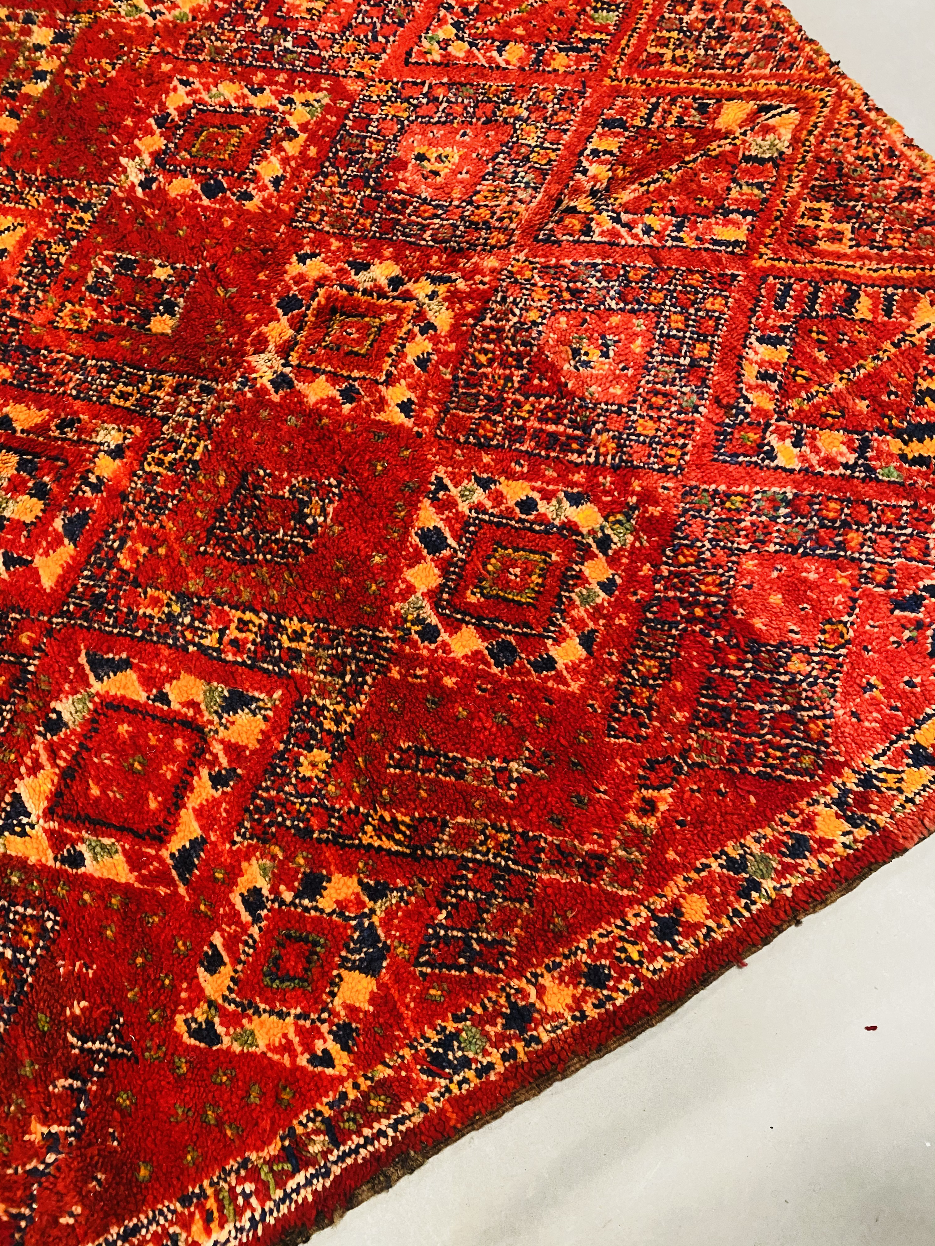 A common theme with Beni Mguild rugs is the darker tones, with earlier rugs dominated by Indigo Blue, but examples also include dark reds and browns as well. Those darker colors provide a stunning backdrop for the design, and they create stunning and interesting effects through the natural ageing process. Our vintage range are carefully sourced to identify genuine, naturally aged rugs that have the character and patina that makes each a unique work of art in its own right. Whatever your interior space, those darker colors and inventive use of shapes along with the beautiful Berber craftsmanship, create a superb piece of art that will be a conversation starter for everyone who sees it. The Beni Mguild rugs bring so much of the weaver’s character and passion for Berber craft with them, giving any interior space a flavor of Morocco and a reminder of the rich history that represents. The colors and design may vary from piece to piece, but the pure wool, hand knotted construction, crafted by weavers using skills passed down to them through the tribe for generations, is always there. Each rug is a celebration of the skills of the women who made them, their creativity shines in the design, and that is the reason these rugs are so sought after. Nothing compares to a truly hand-crafted rug, with our Beni Mguild range offering a broad range of styles, colors and ages to suit every taste and interior space.