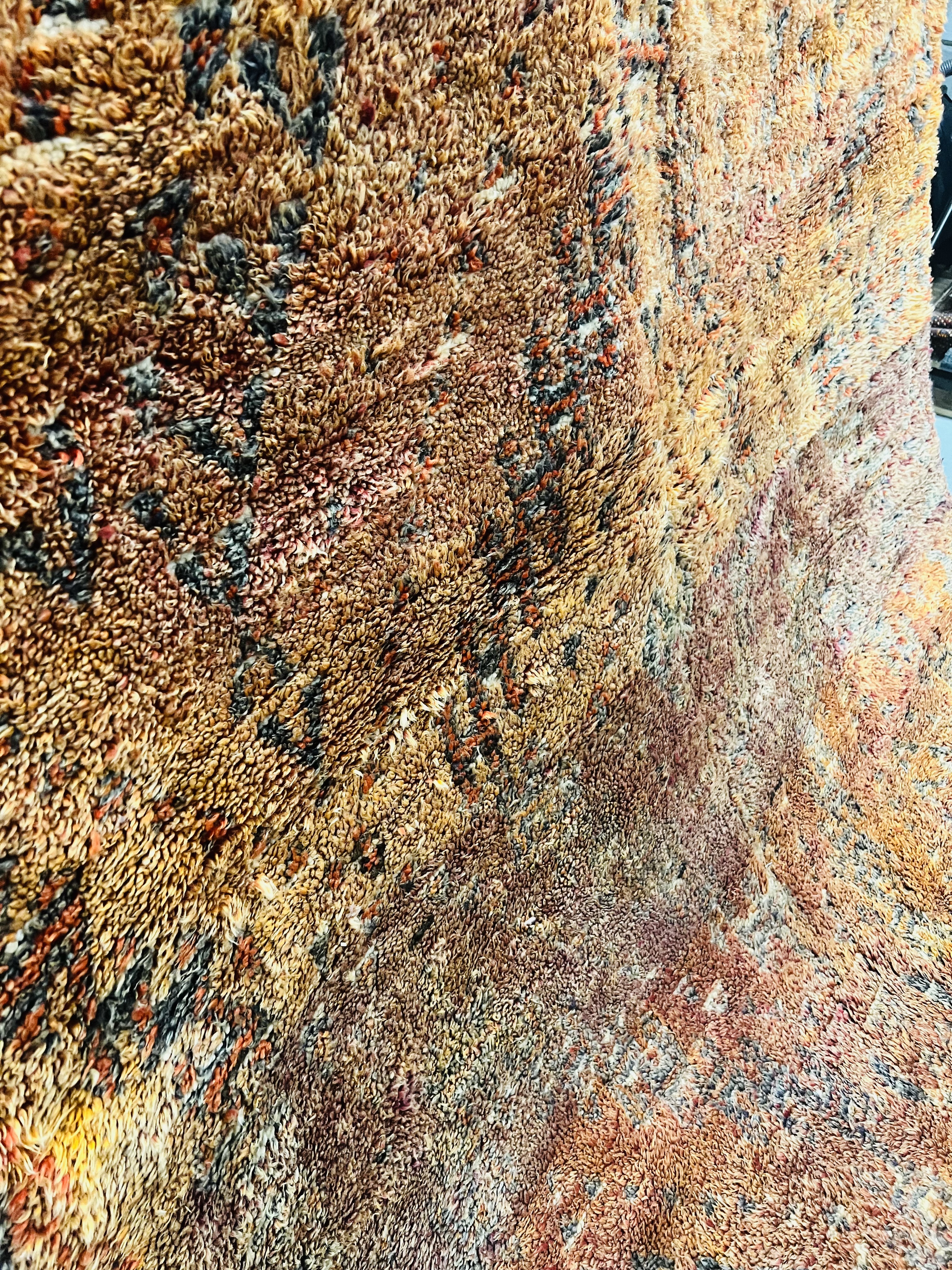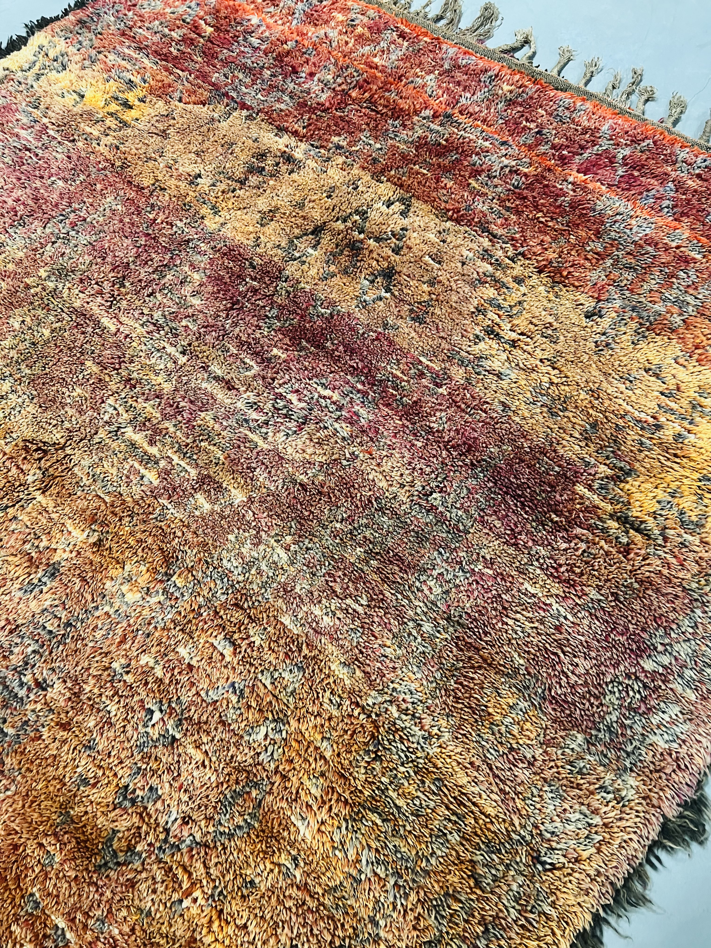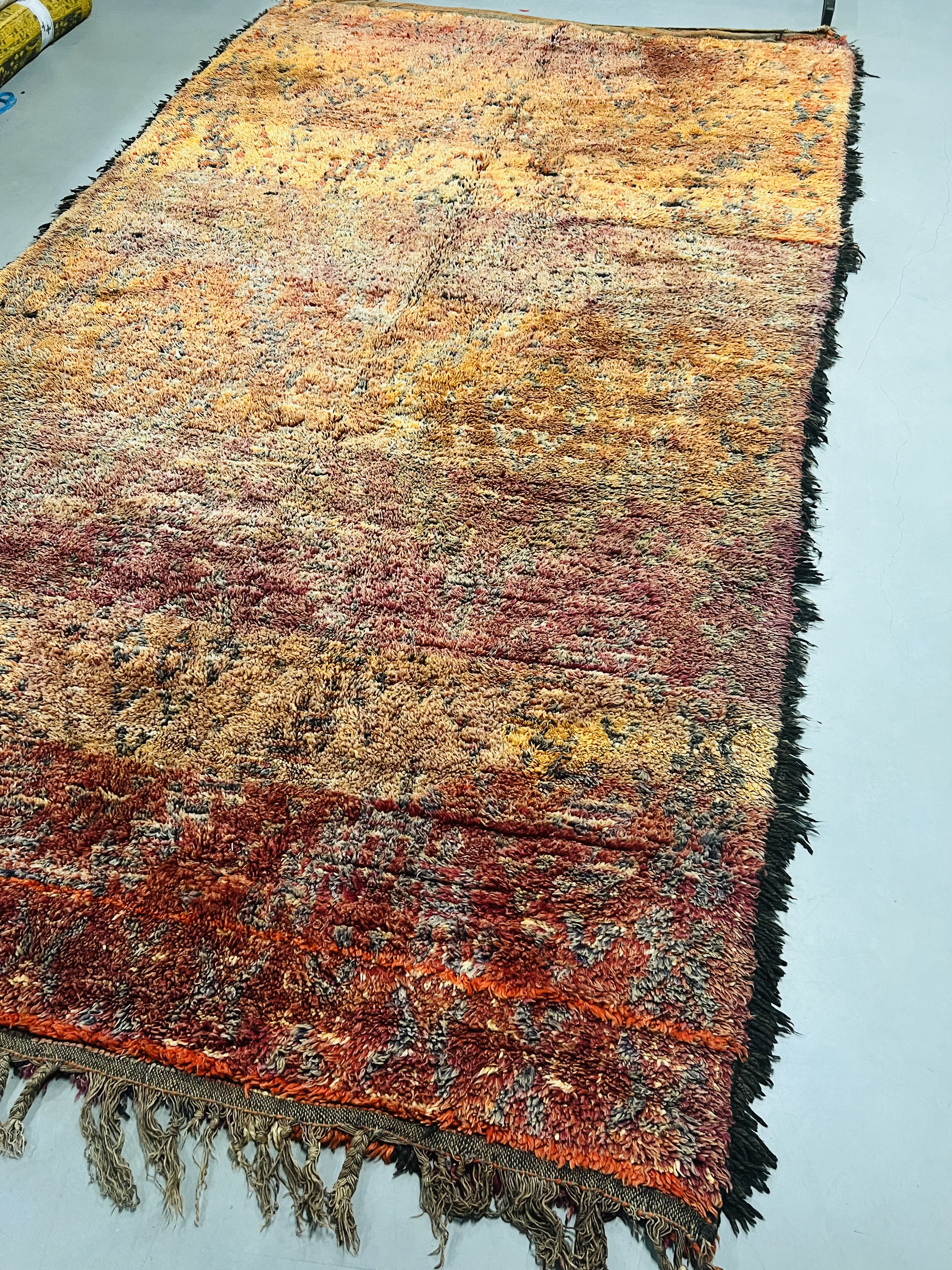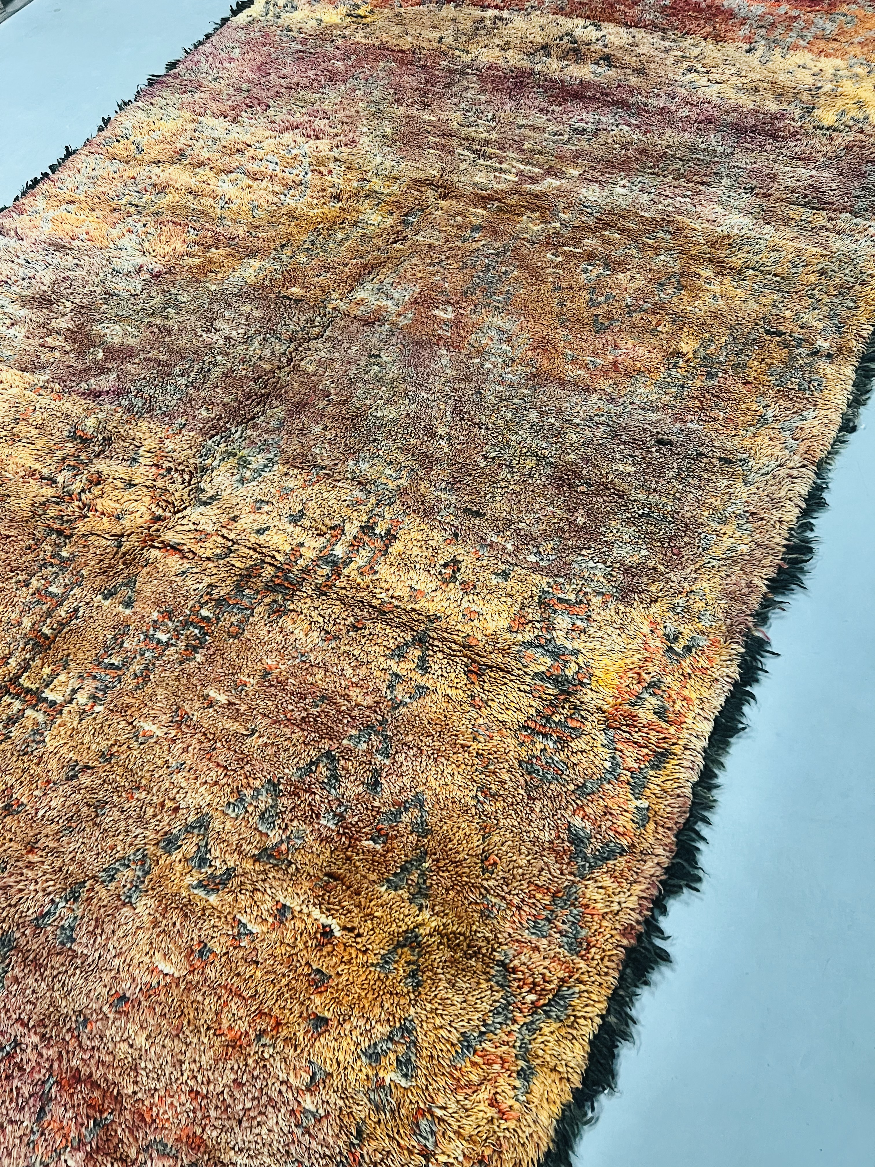 Beni Mguild rugs originate from the western central Middle Atlas region of Morocco, and as with most regions, they have their own style. The weavers in this region like to take the designs commonly found in flat weave rugs, and adapt them to their pile weave, hand knotted creations. This creates bold, flowing imagery that captures the joyous character of the weaver herself.
