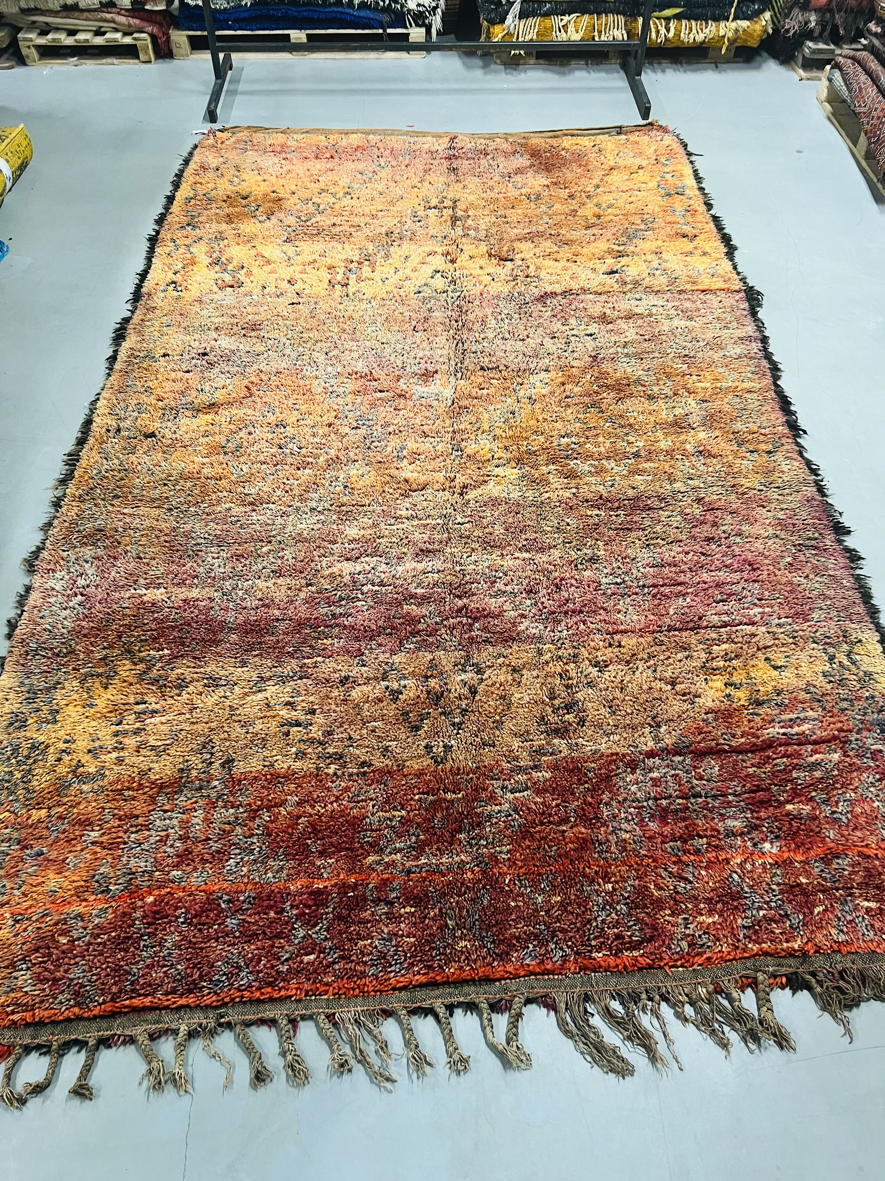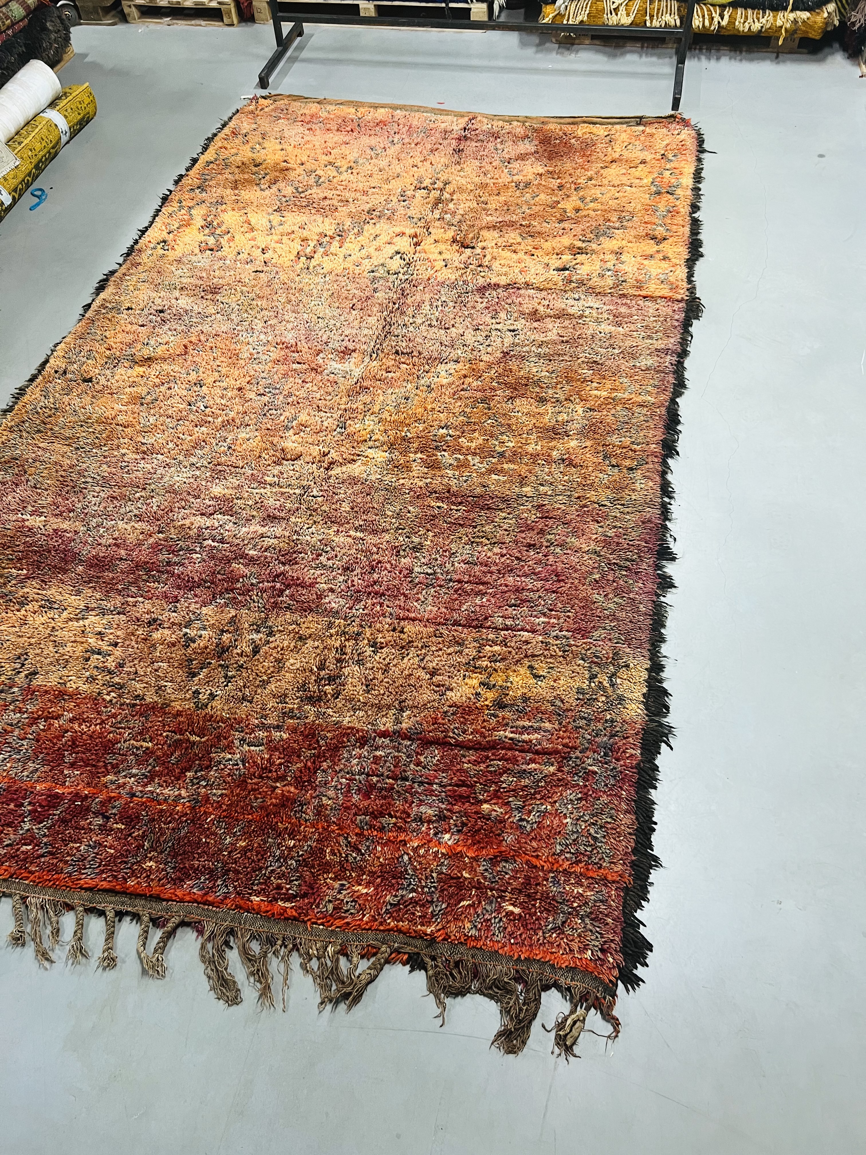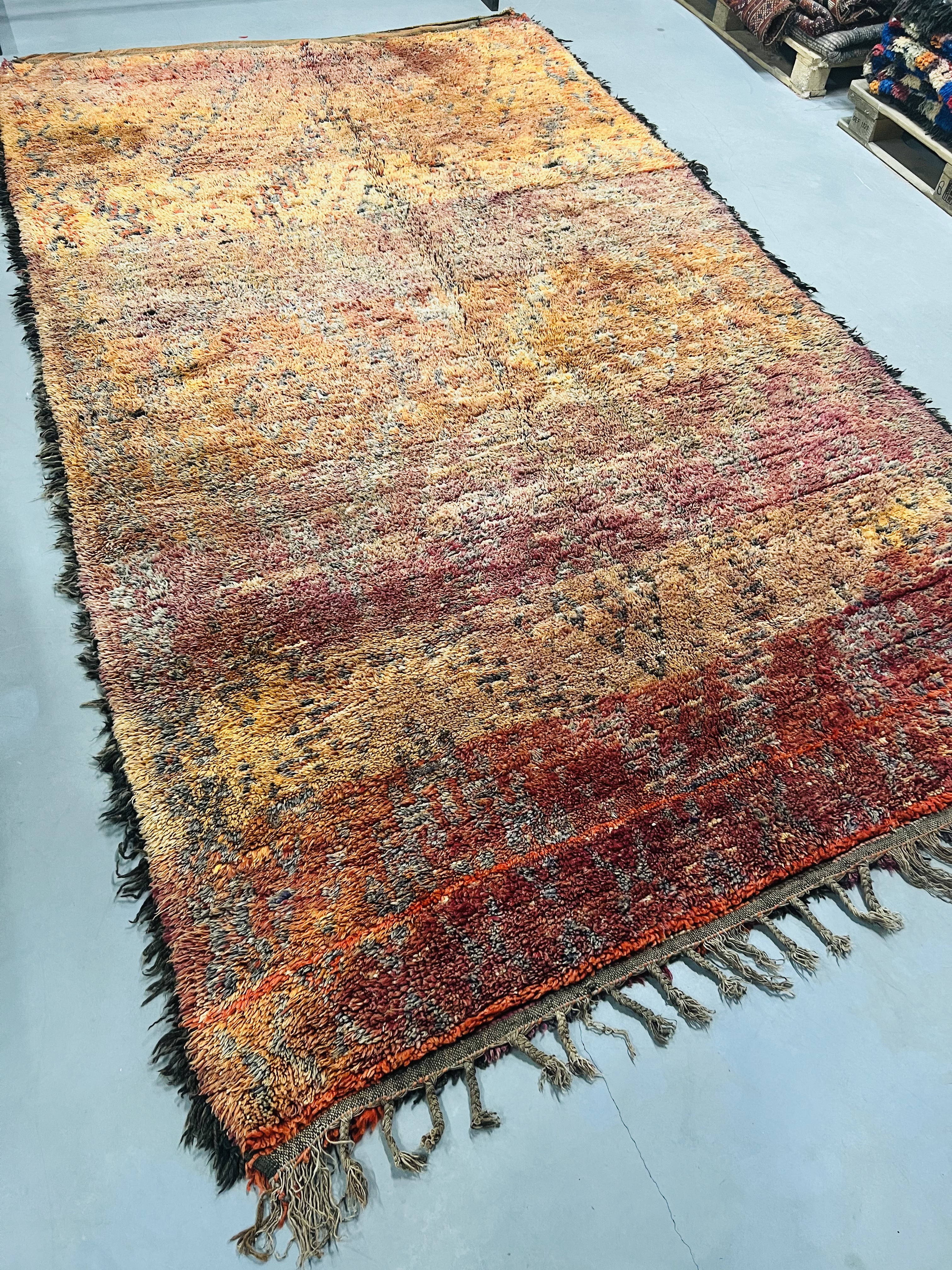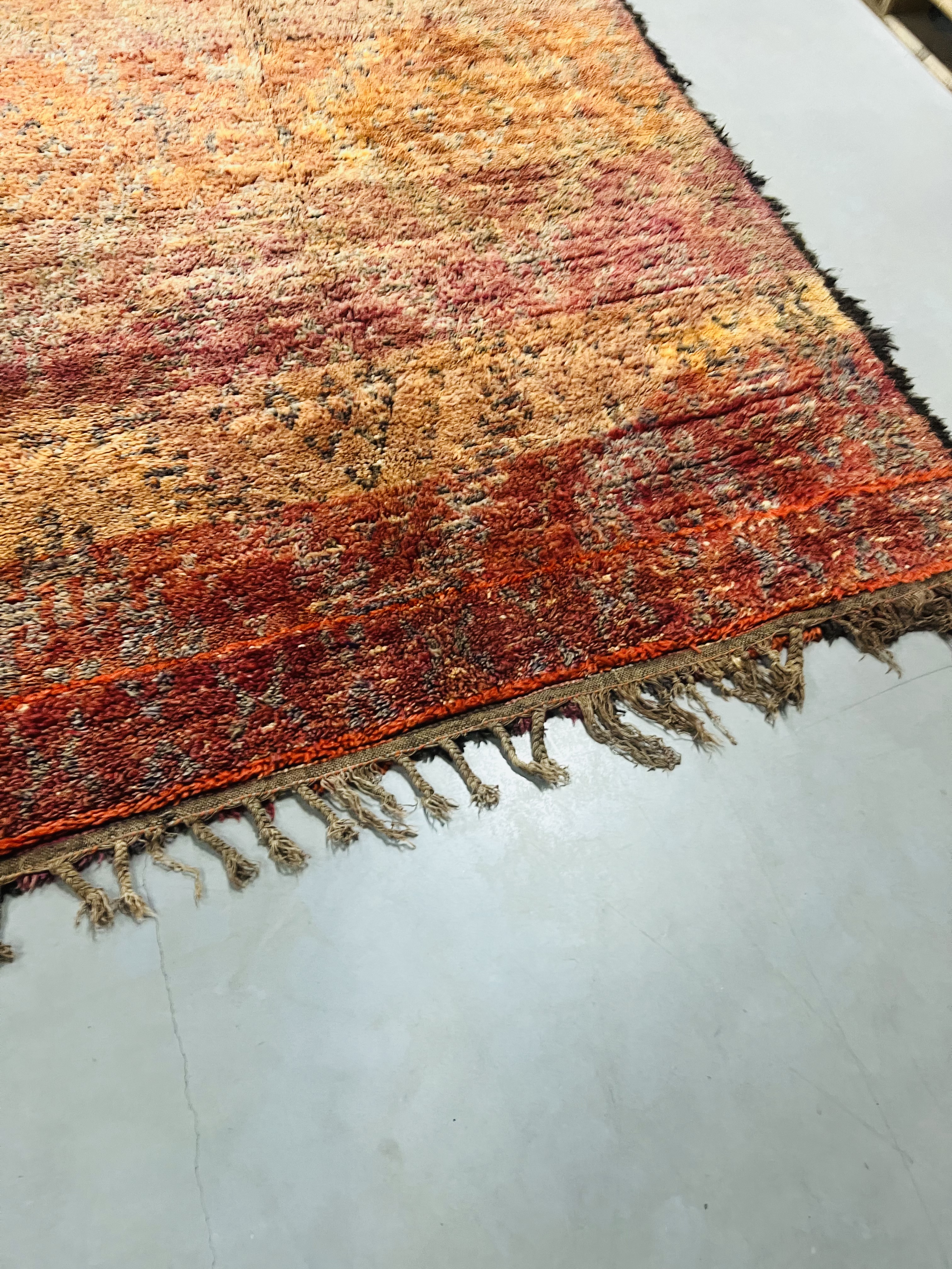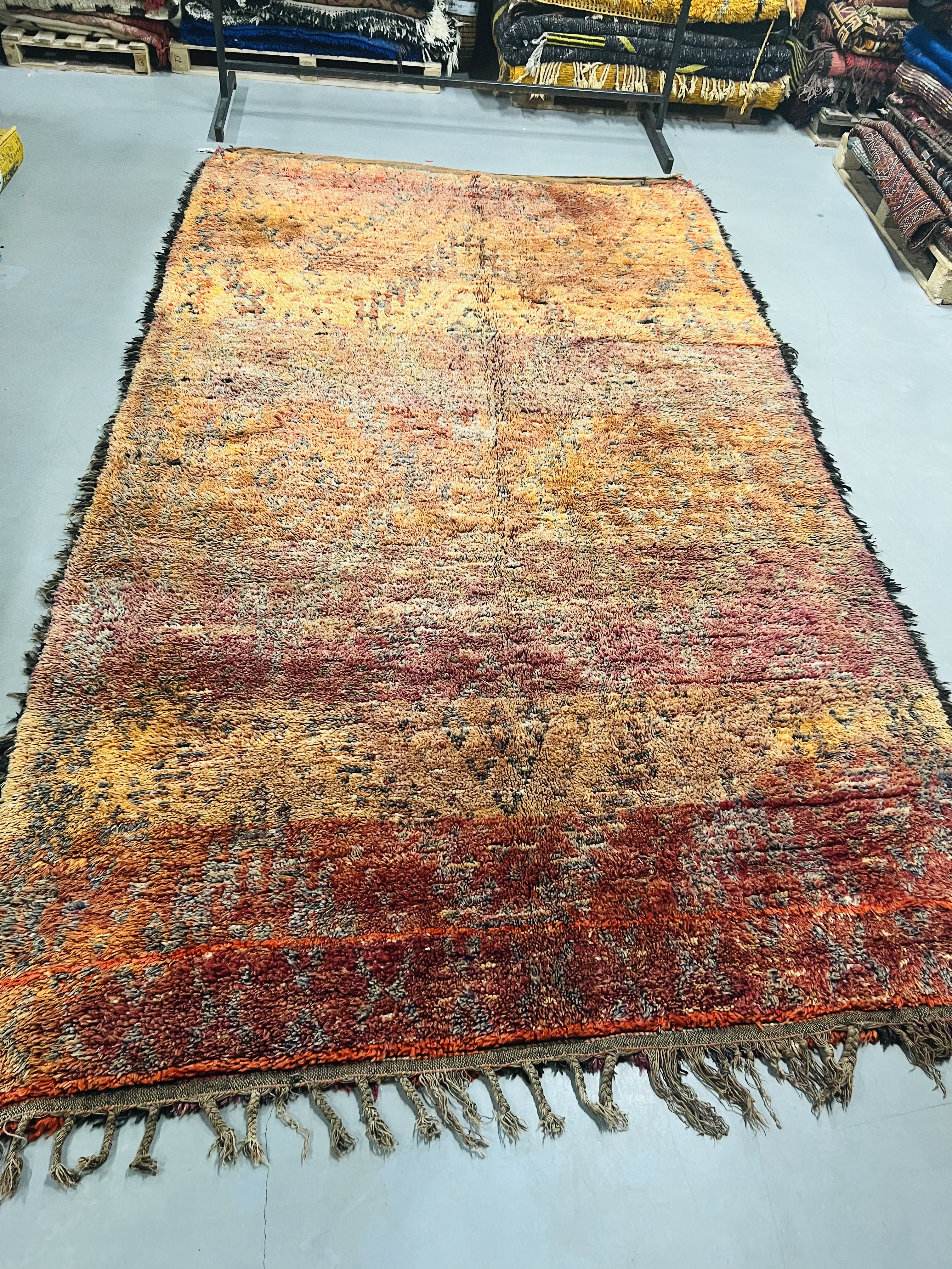 Beni Mguild rugs originate from the western central Middle Atlas region of Morocco, and as with most regions, they have their own style. The weavers in this region like to take the designs commonly found in flat weave rugs, and adapt them to their pile weave, hand knotted creations. This creates bold, flowing imagery that captures the joyous character of the weaver herself.
