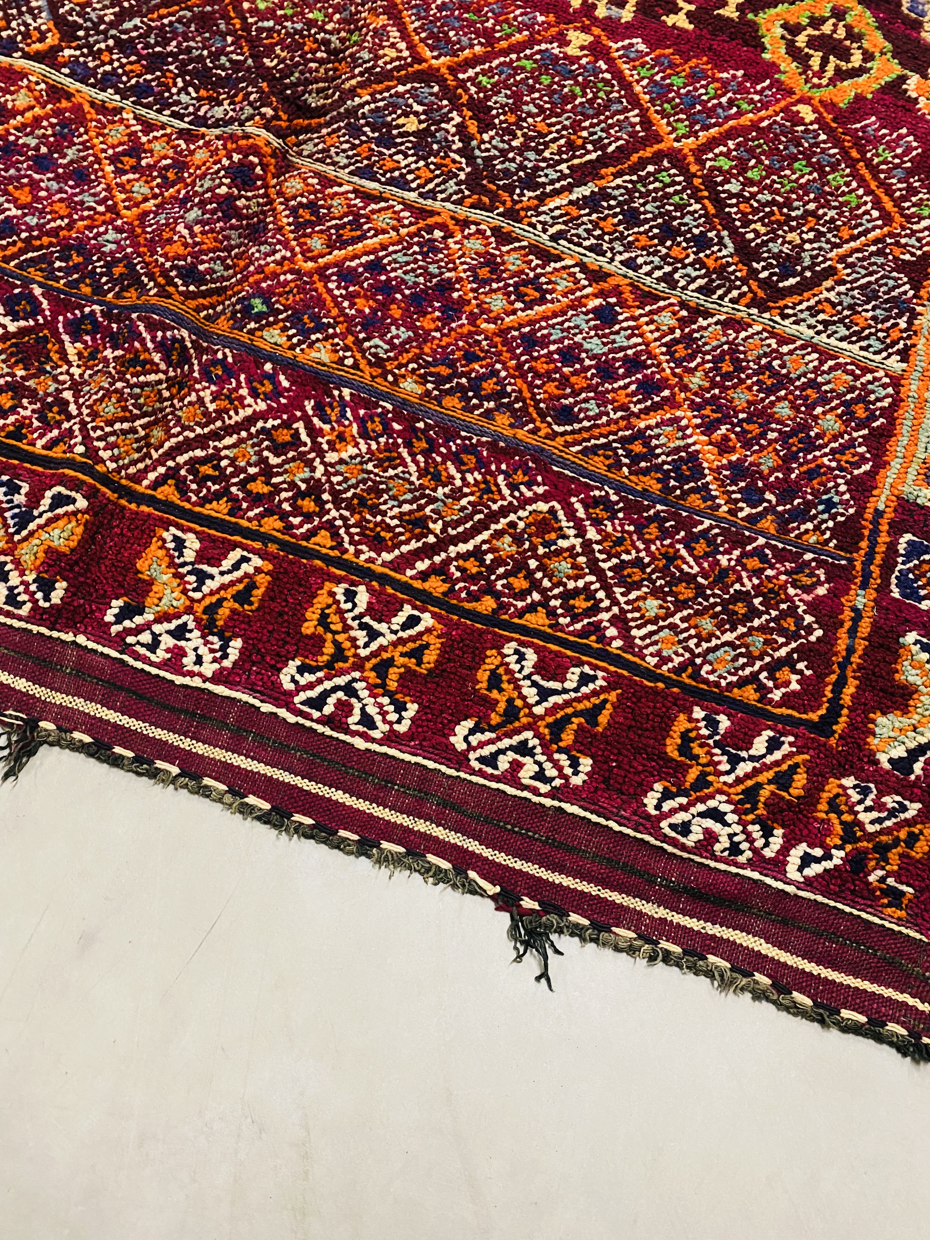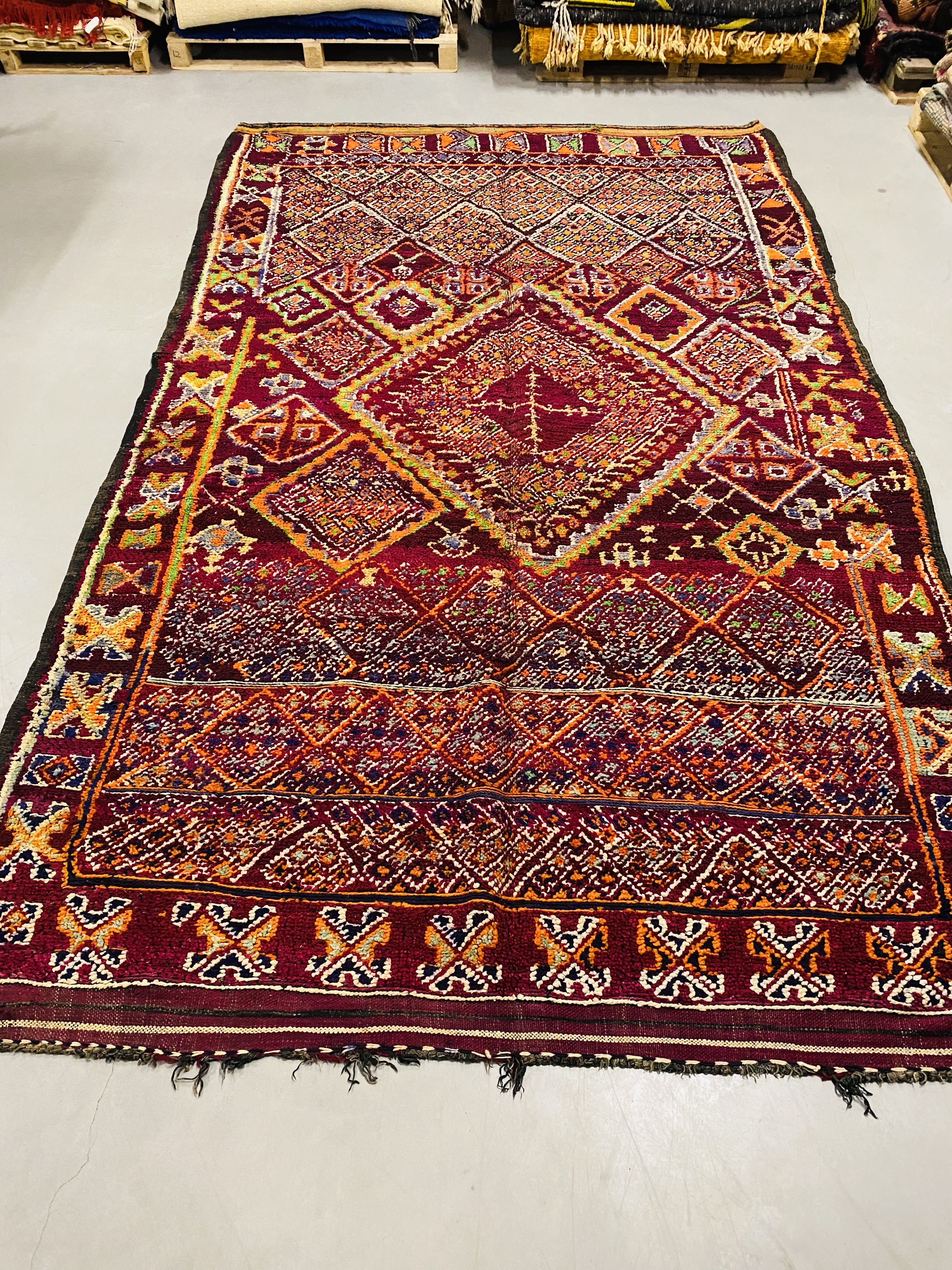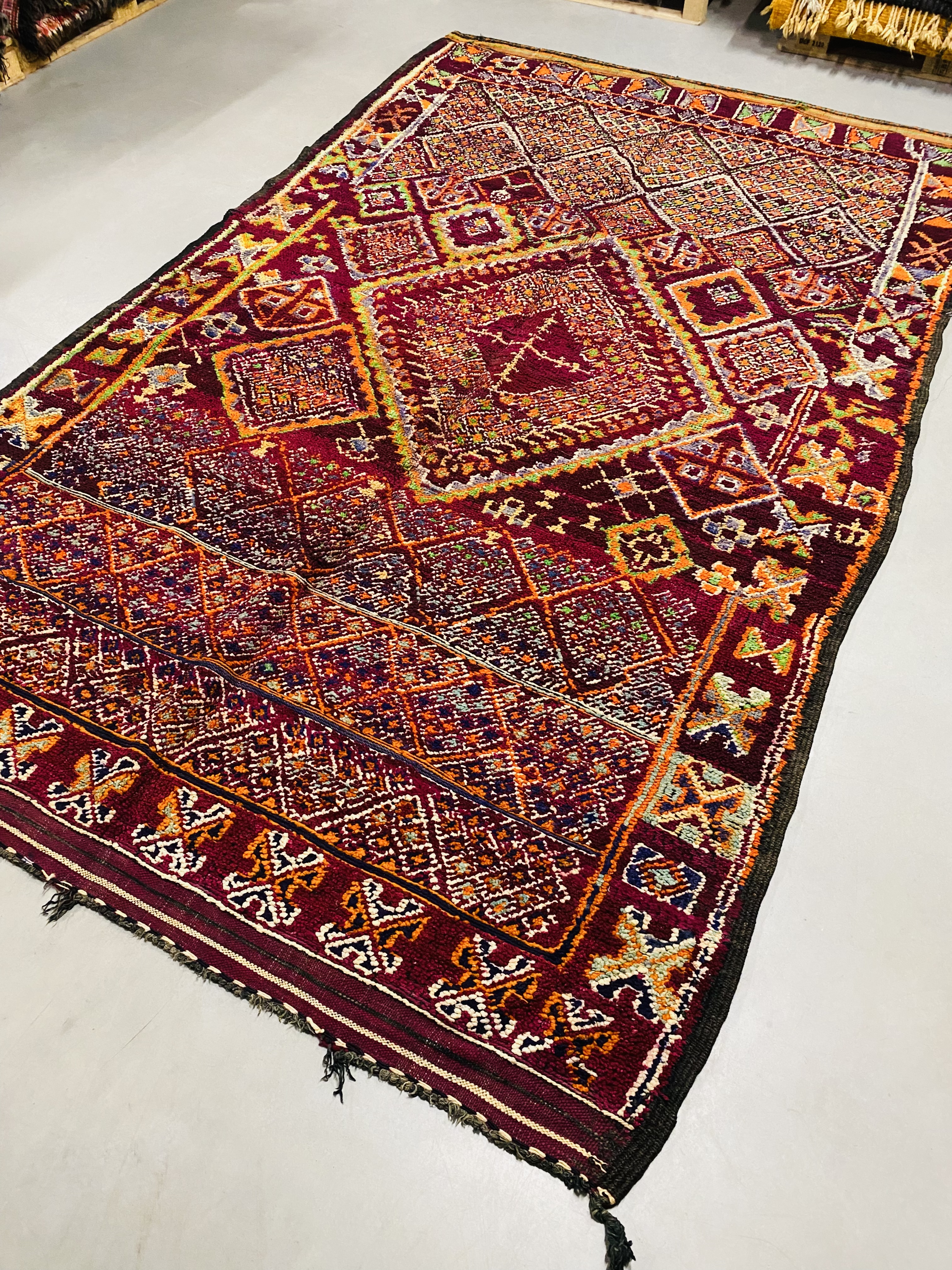 Beni Mguild rugs originate from the western central Middle Atlas region of Morocco, and as with most regions, they have their own style. The weavers in this region like to take the designs commonly found in flat weave rugs, and adapt them to their pile weave, hand knotted creations. This creates bold, flowing imagery that captures the joyous character of the weaver herself.