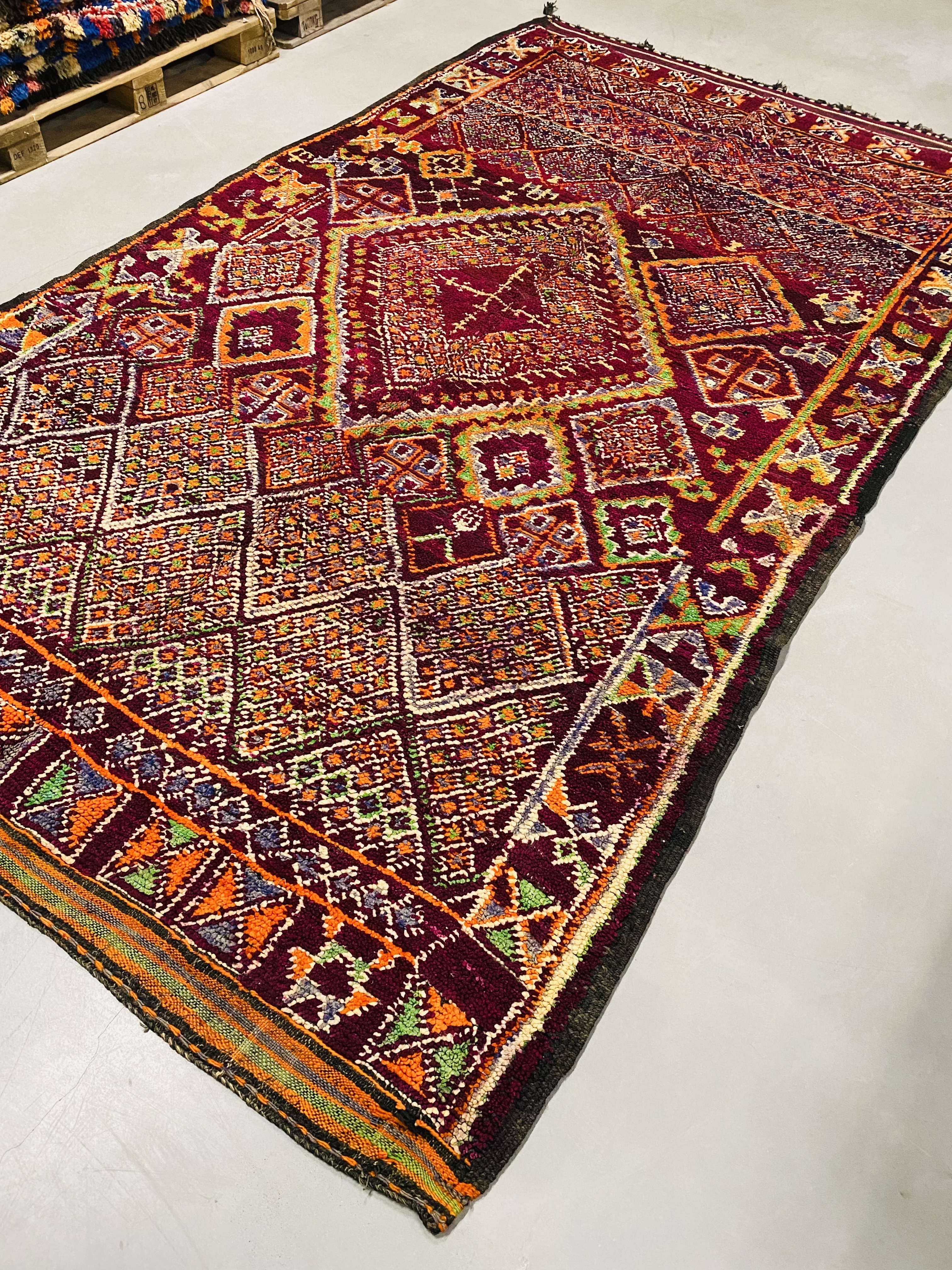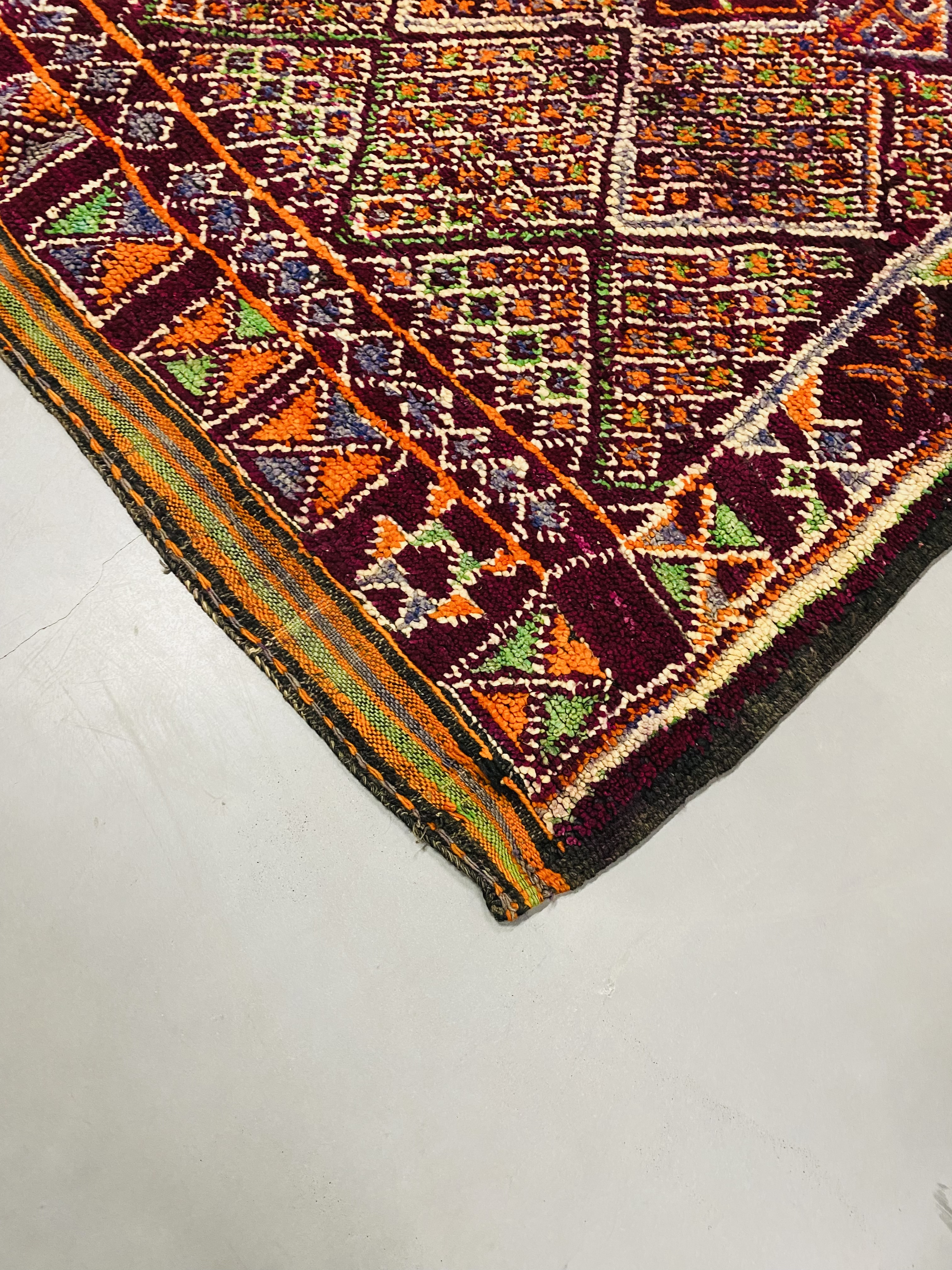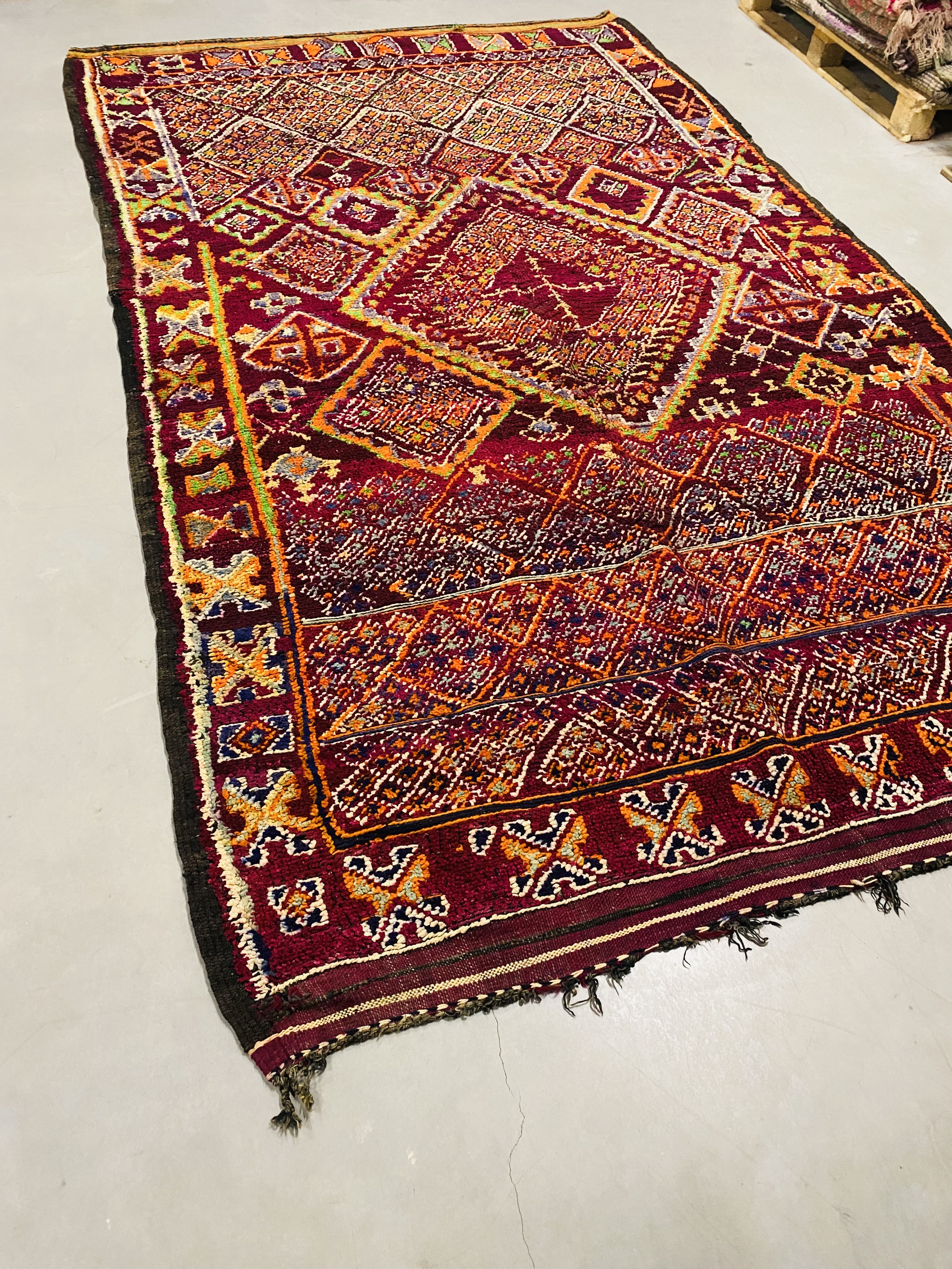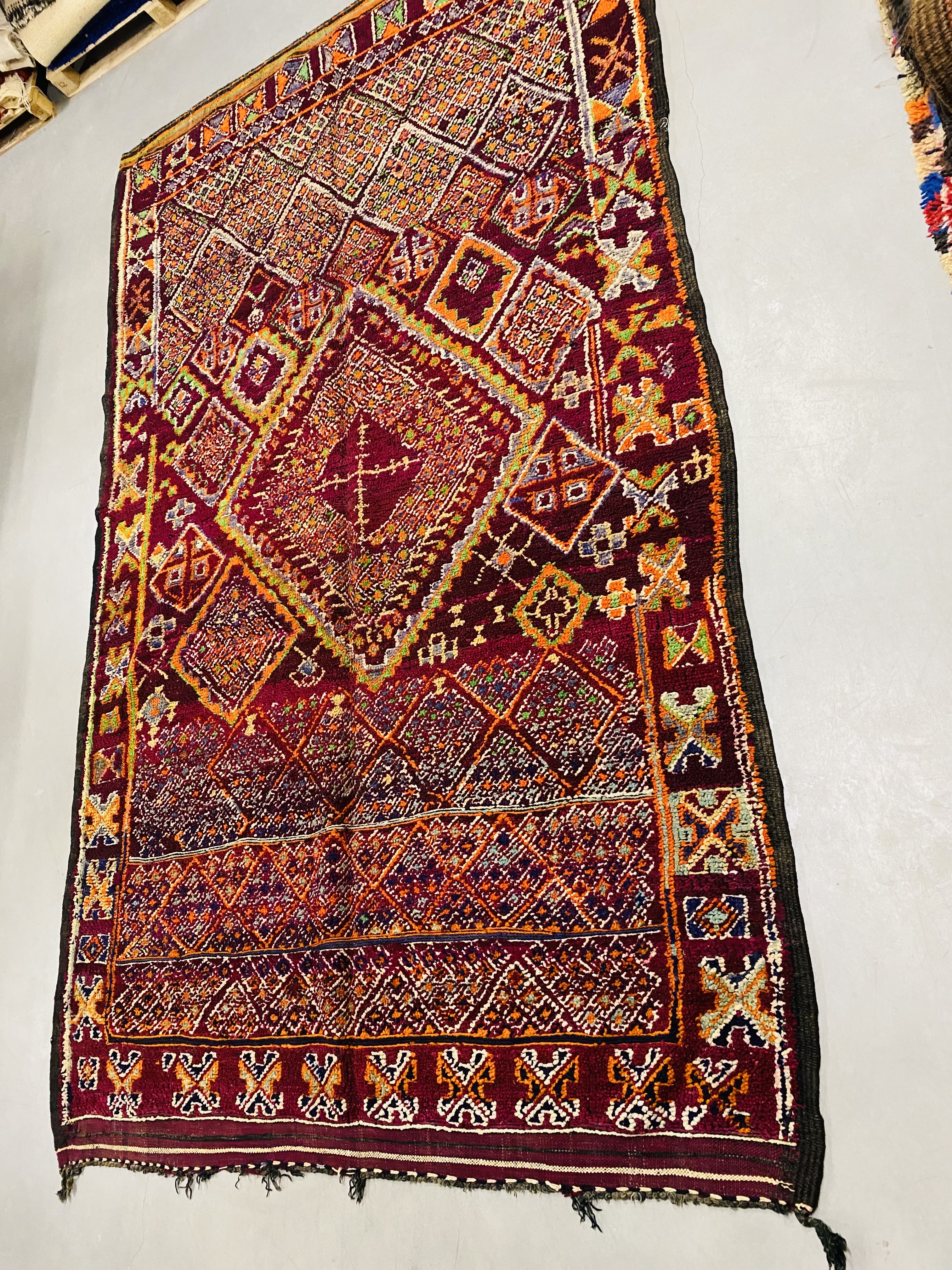 Beni Mguild rugs originate from the western central Middle Atlas region of Morocco, and as with most regions, they have their own style. The weavers in this region like to take the designs commonly found in flat weave rugs, and adapt them to their pile weave, hand knotted creations. This creates bold, flowing imagery that captures the joyous character of the weaver herself.