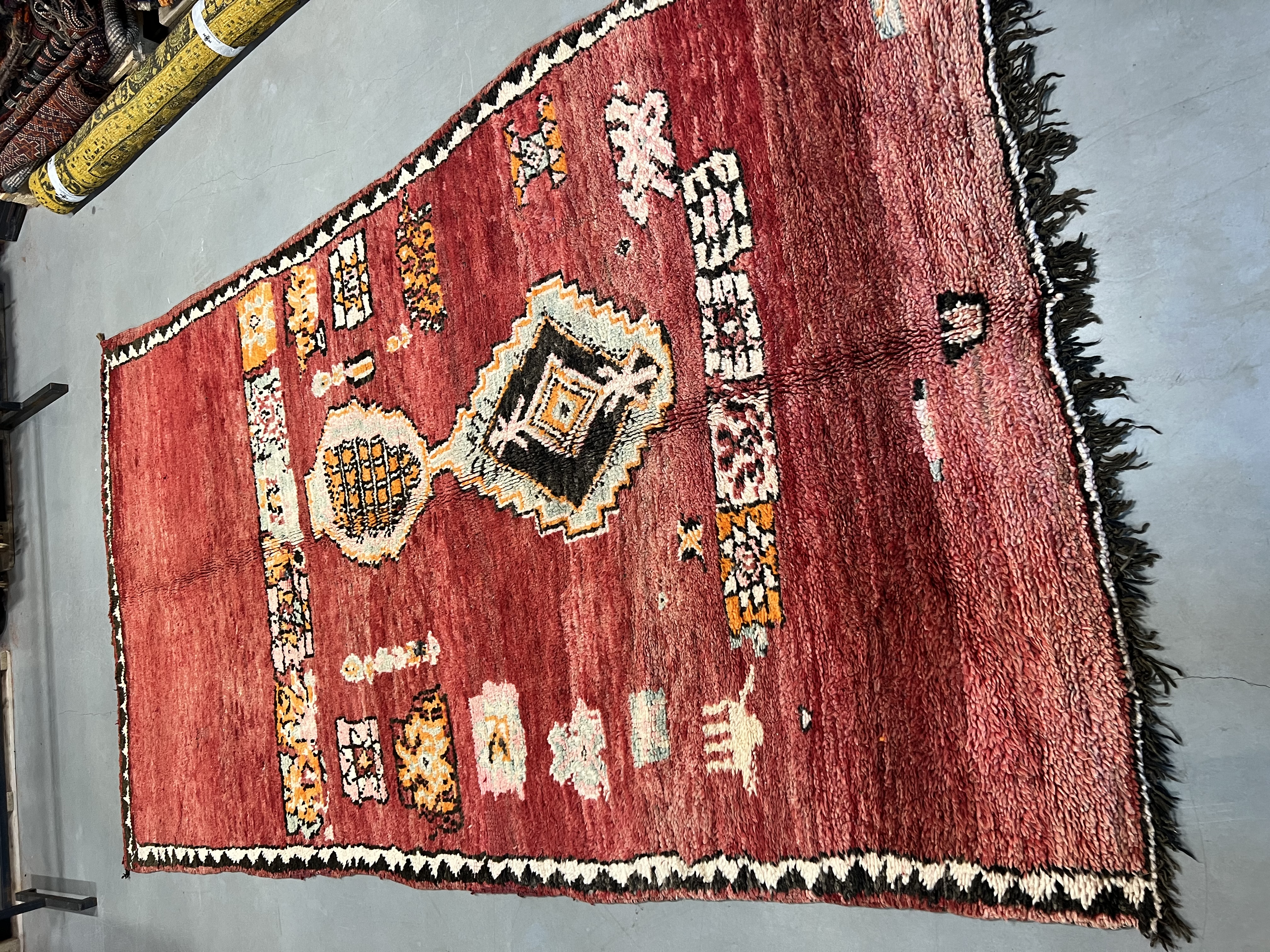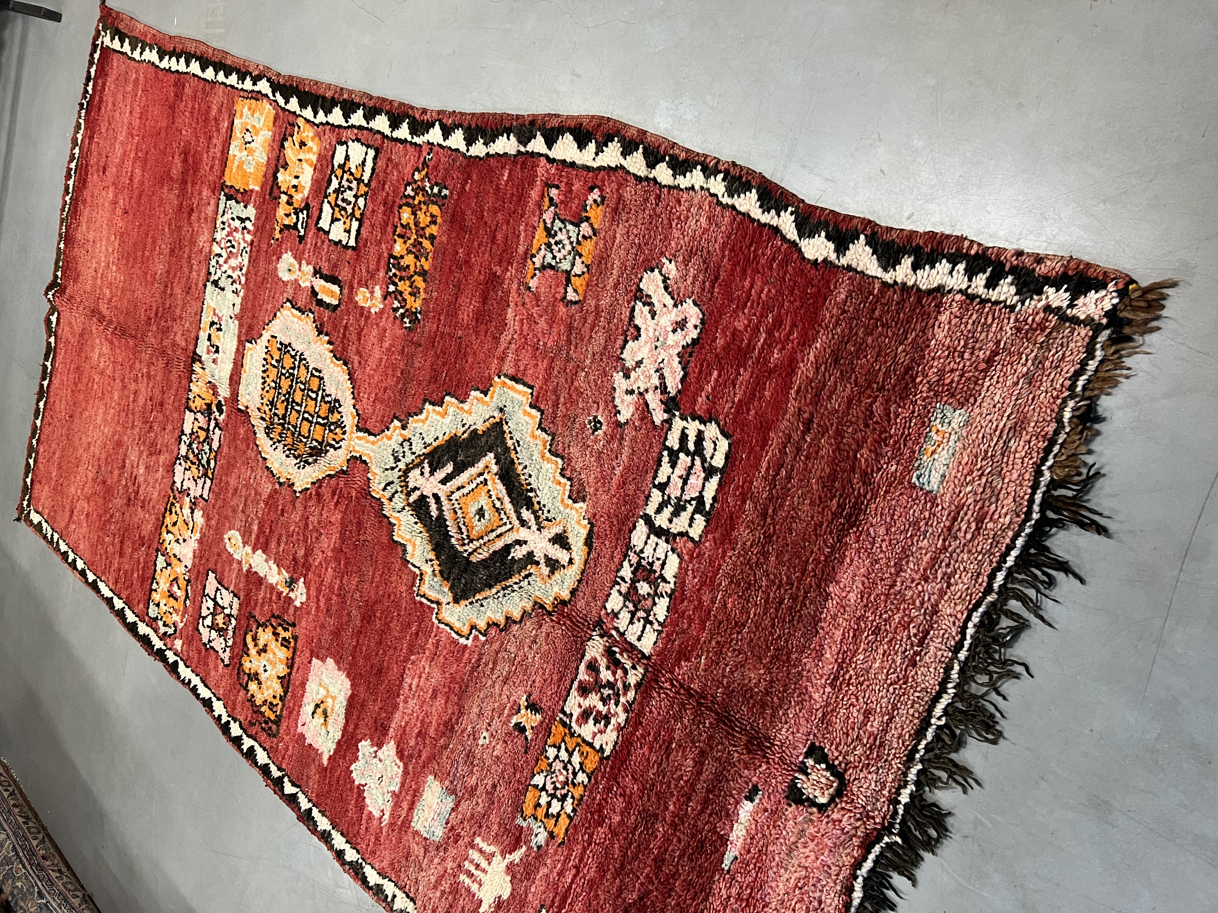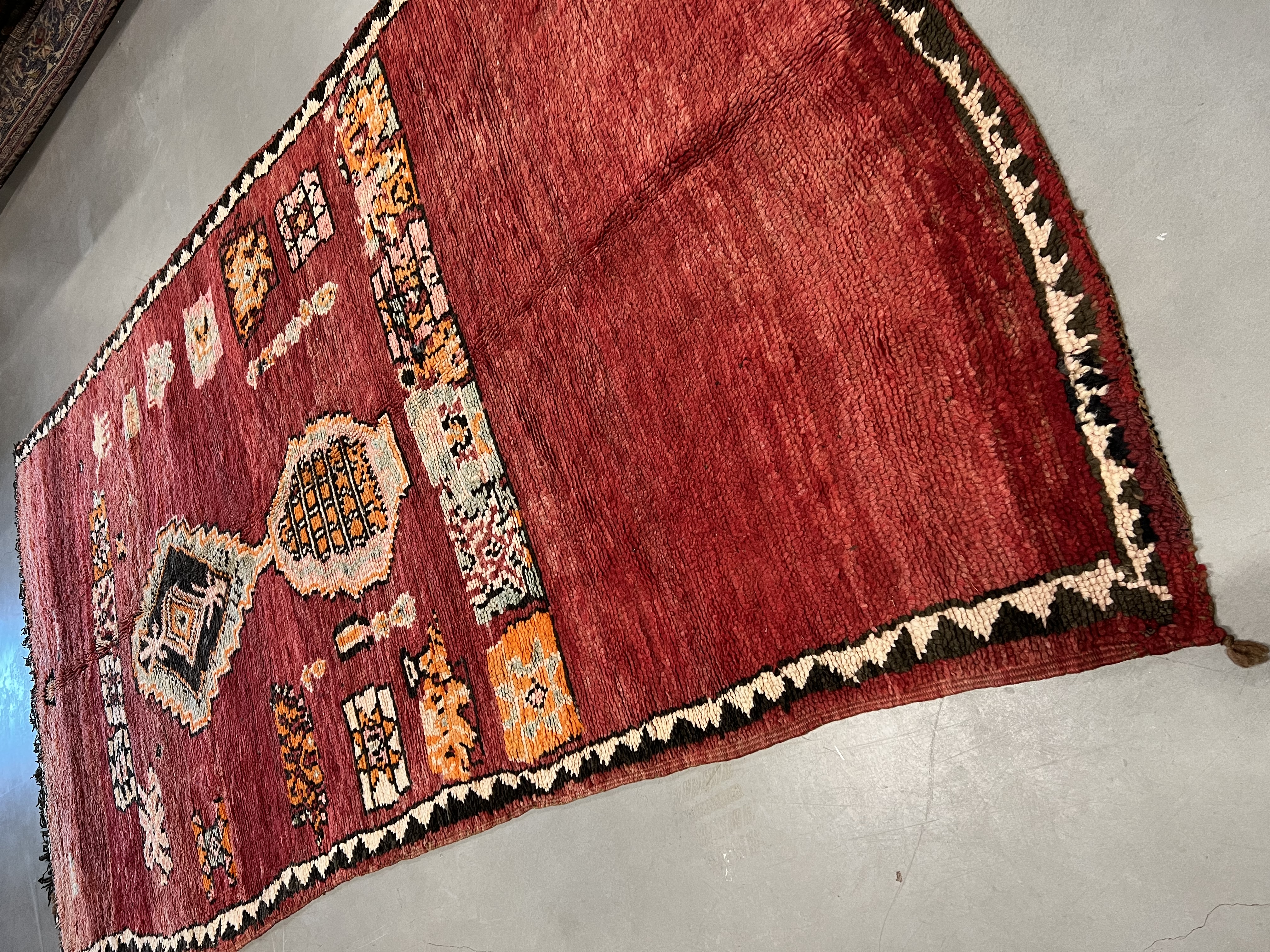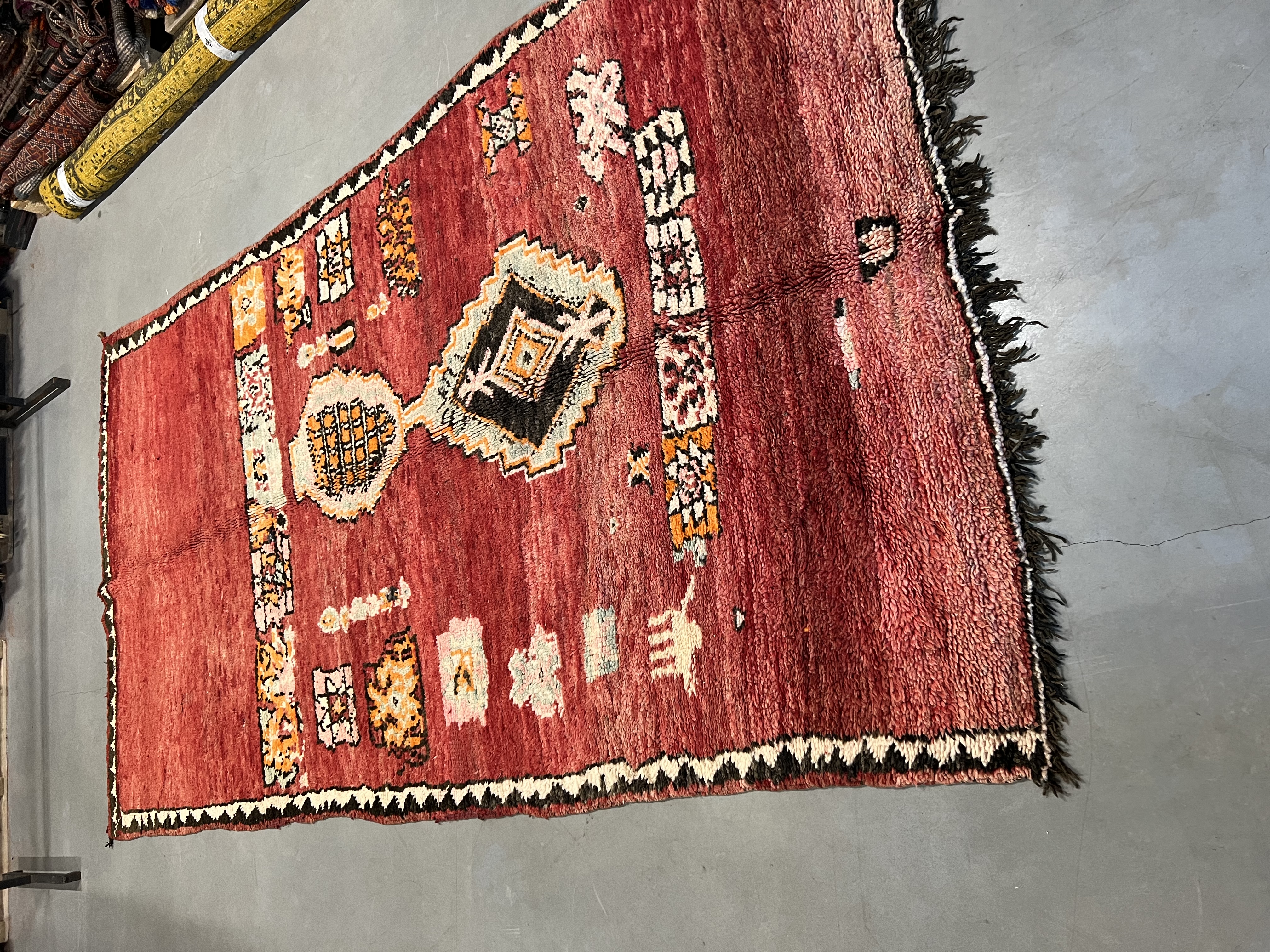 Beni Mguild rugs originate from the western central Middle Atlas region of Morocco, and as with most regions, they have their own style. The weavers in this region like to take the designs commonly found in flat weave rugs, and adapt them to their pile weave, hand knotted creations. This creates bold, flowing imagery that captures the joyous character of the weaver herself.
