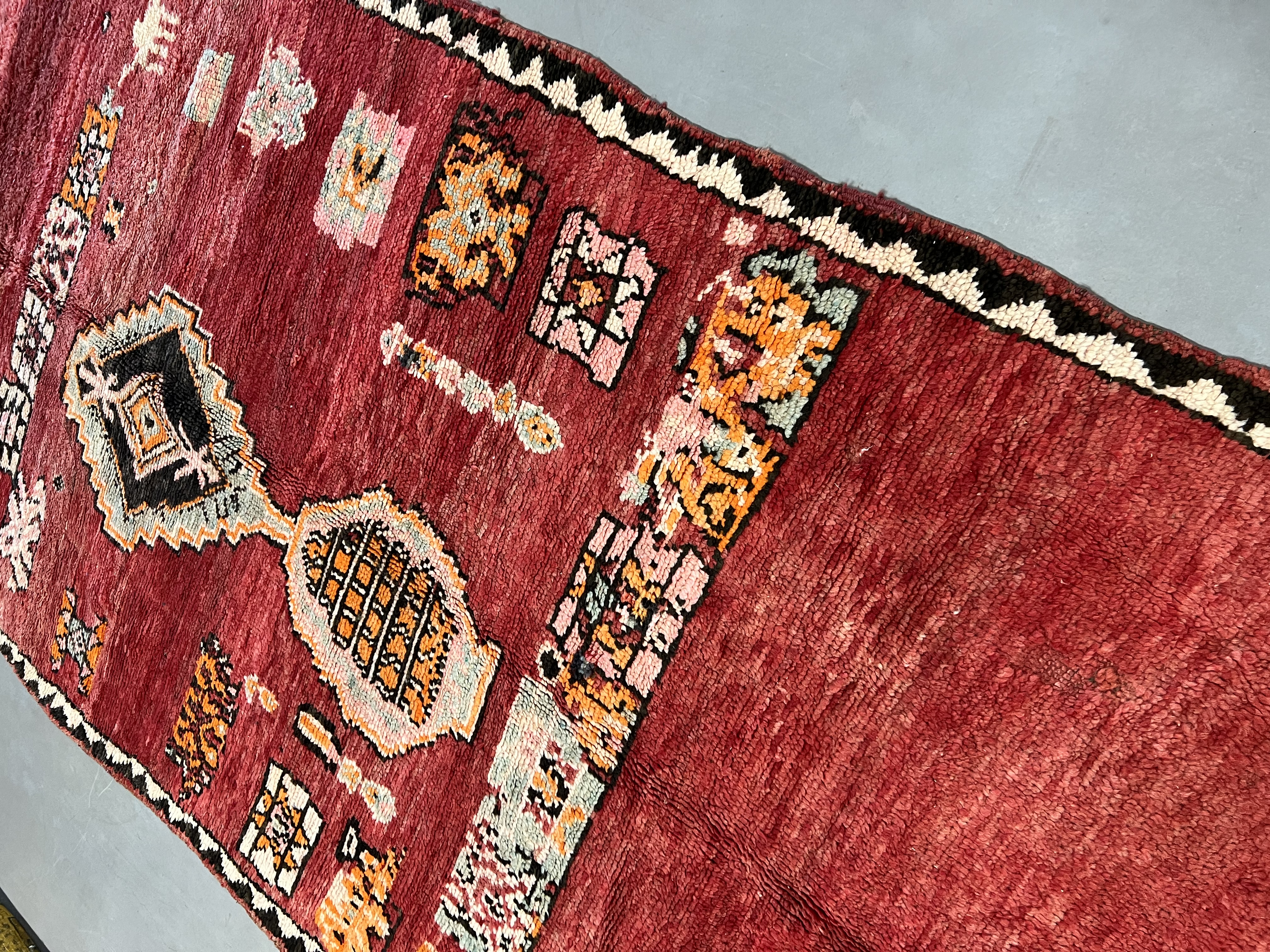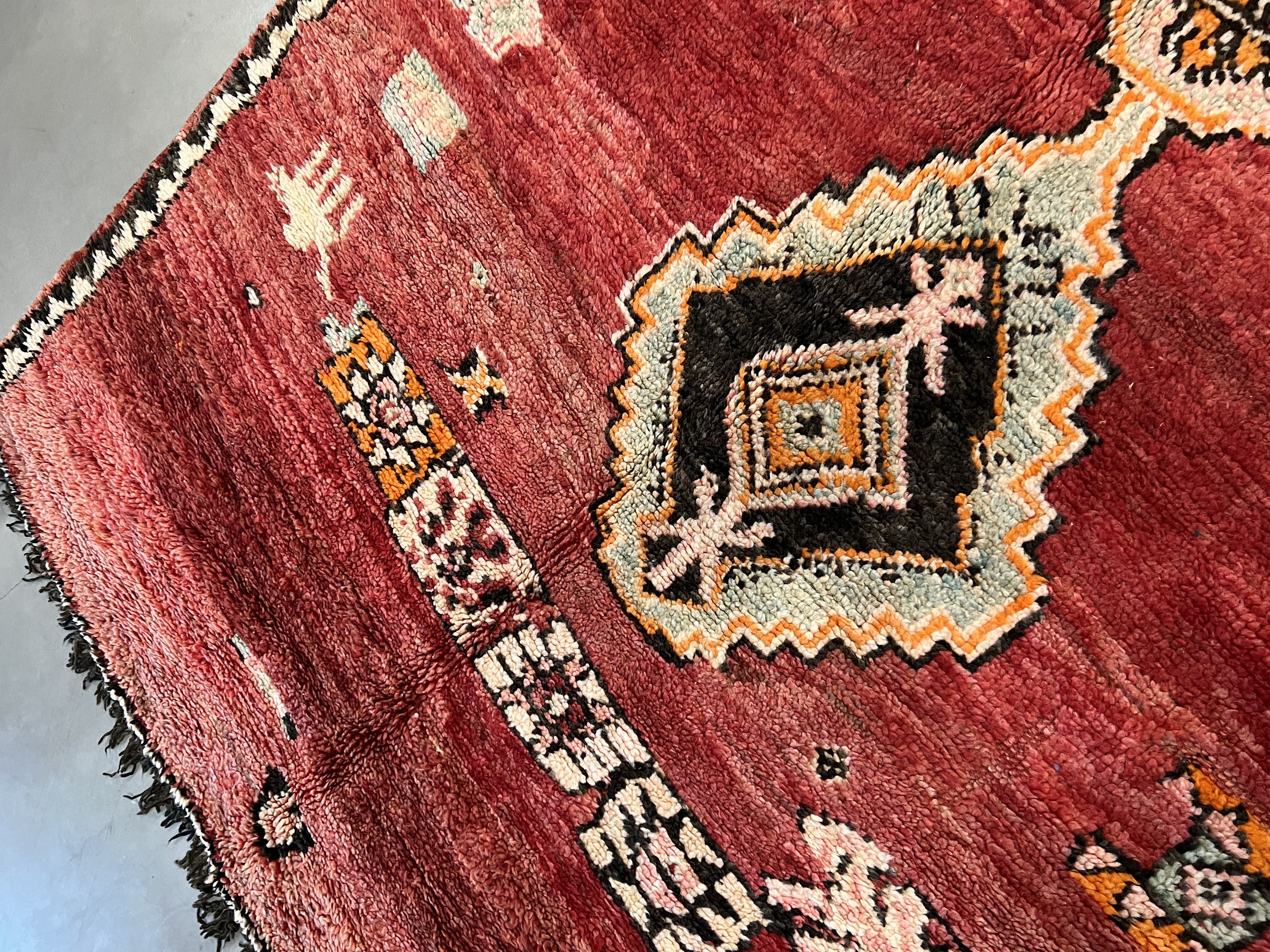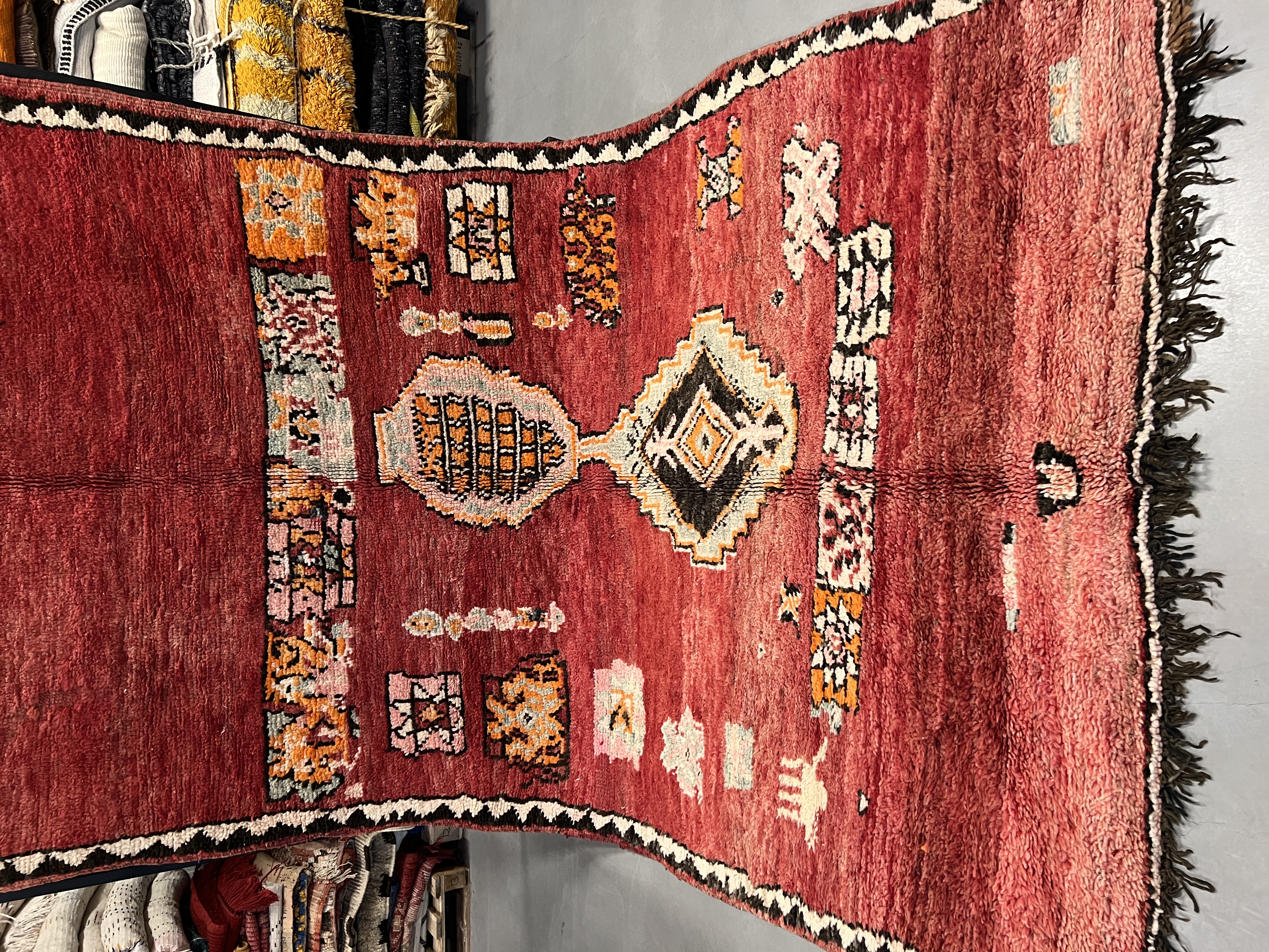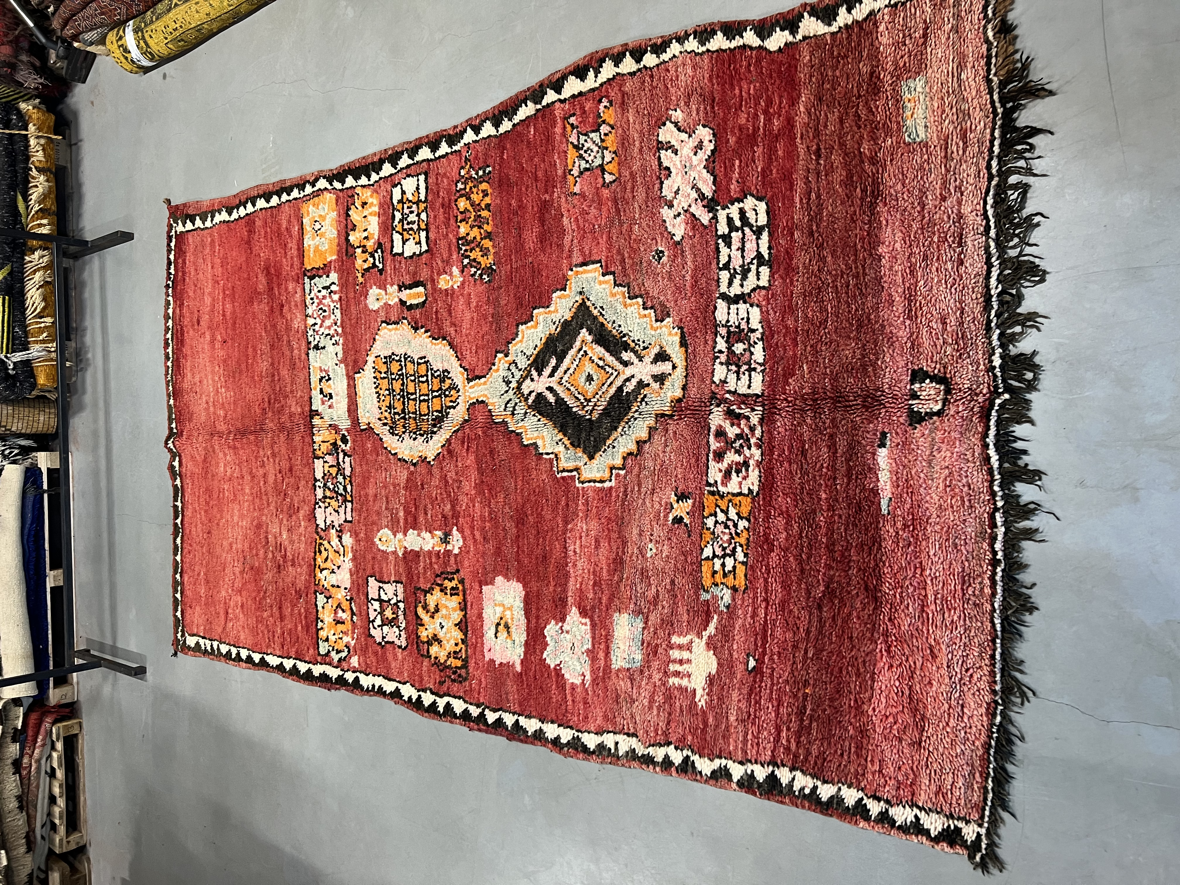 Beni Mguild rugs originate from the western central Middle Atlas region of Morocco, and as with most regions, they have their own style. The weavers in this region like to take the designs commonly found in flat weave rugs, and adapt them to their pile weave, hand knotted creations. This creates bold, flowing imagery that captures the joyous character of the weaver herself.