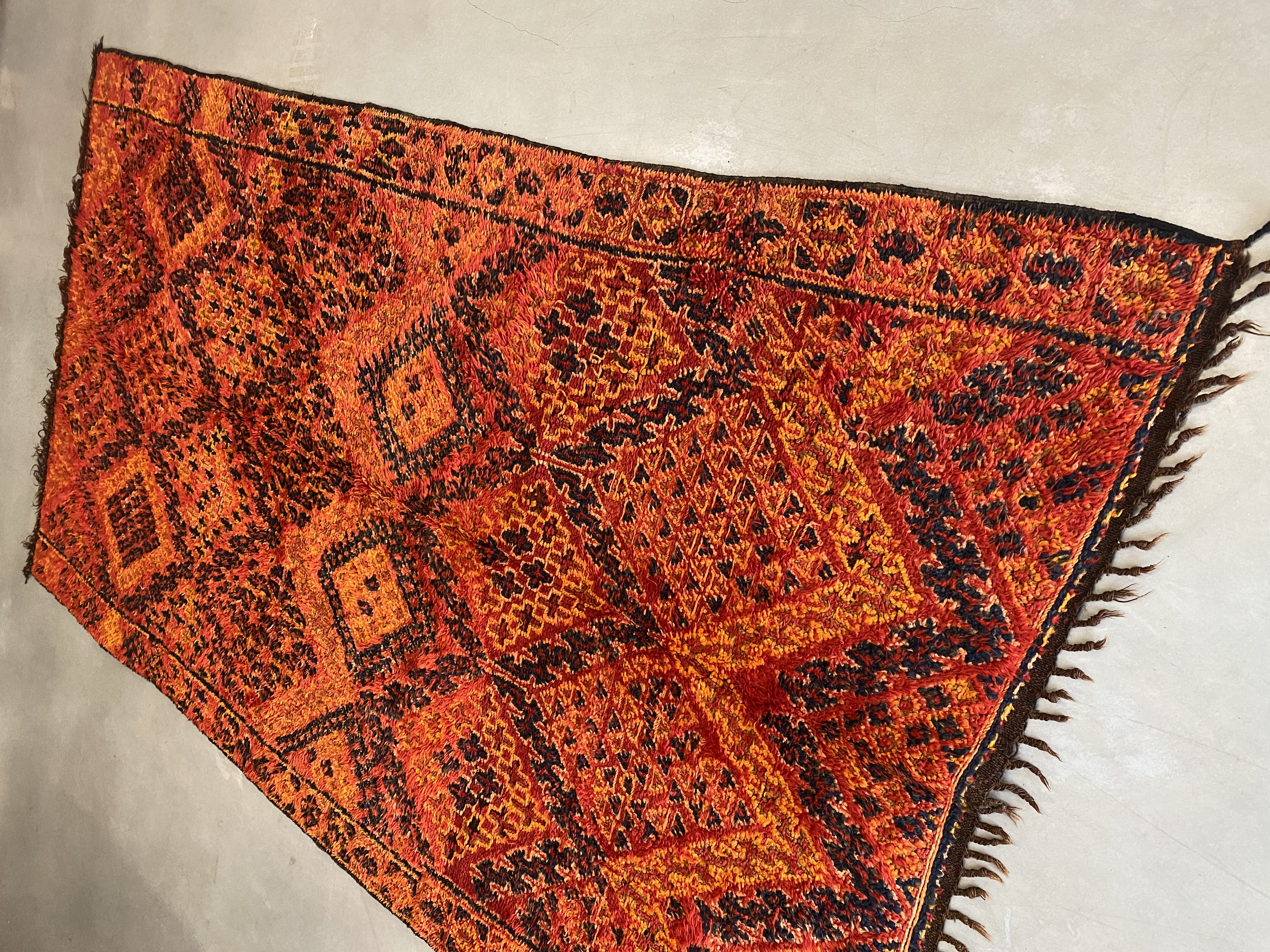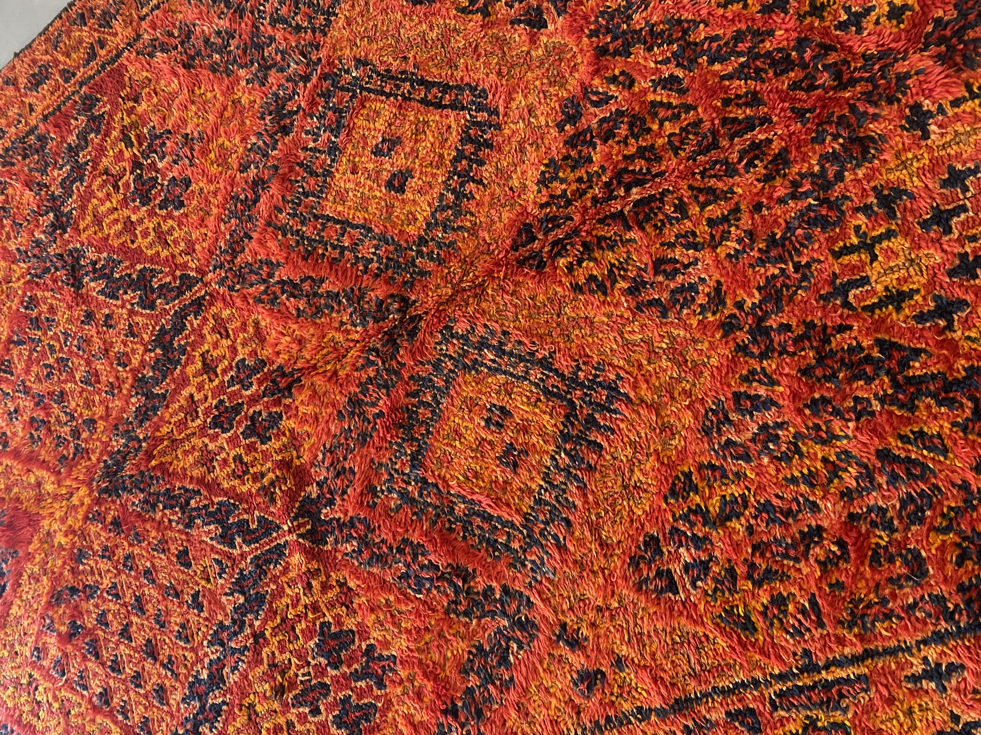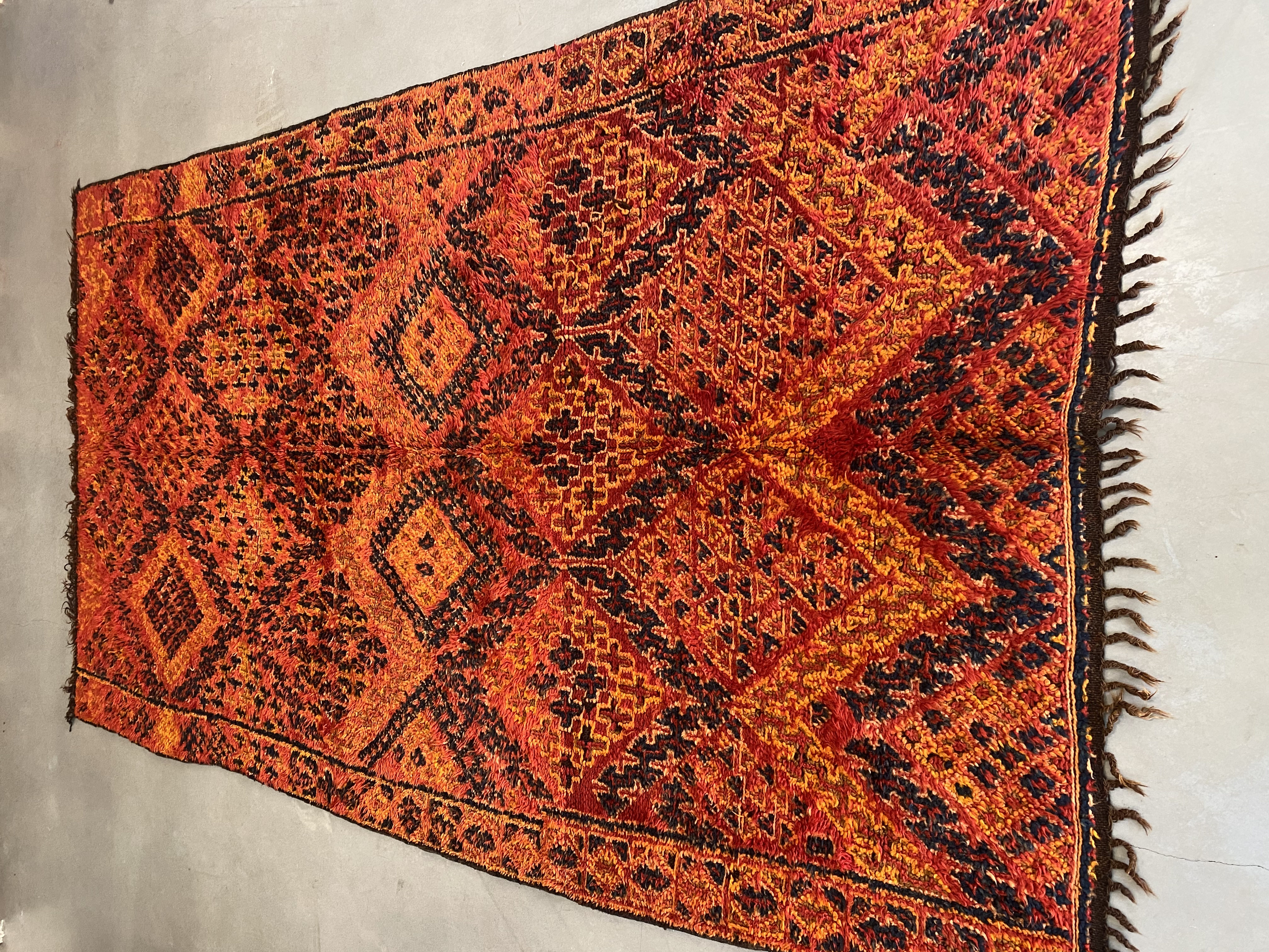 Beni Mguild rugs originate from the western central Middle Atlas region of Morocco, and as with most regions, they have their own style. The weavers in this region like to take the designs commonly found in flat weave rugs, and adapt them to their pile weave, hand knotted creations. This creates bold, flowing imagery that captures the joyous character of the weaver herself.