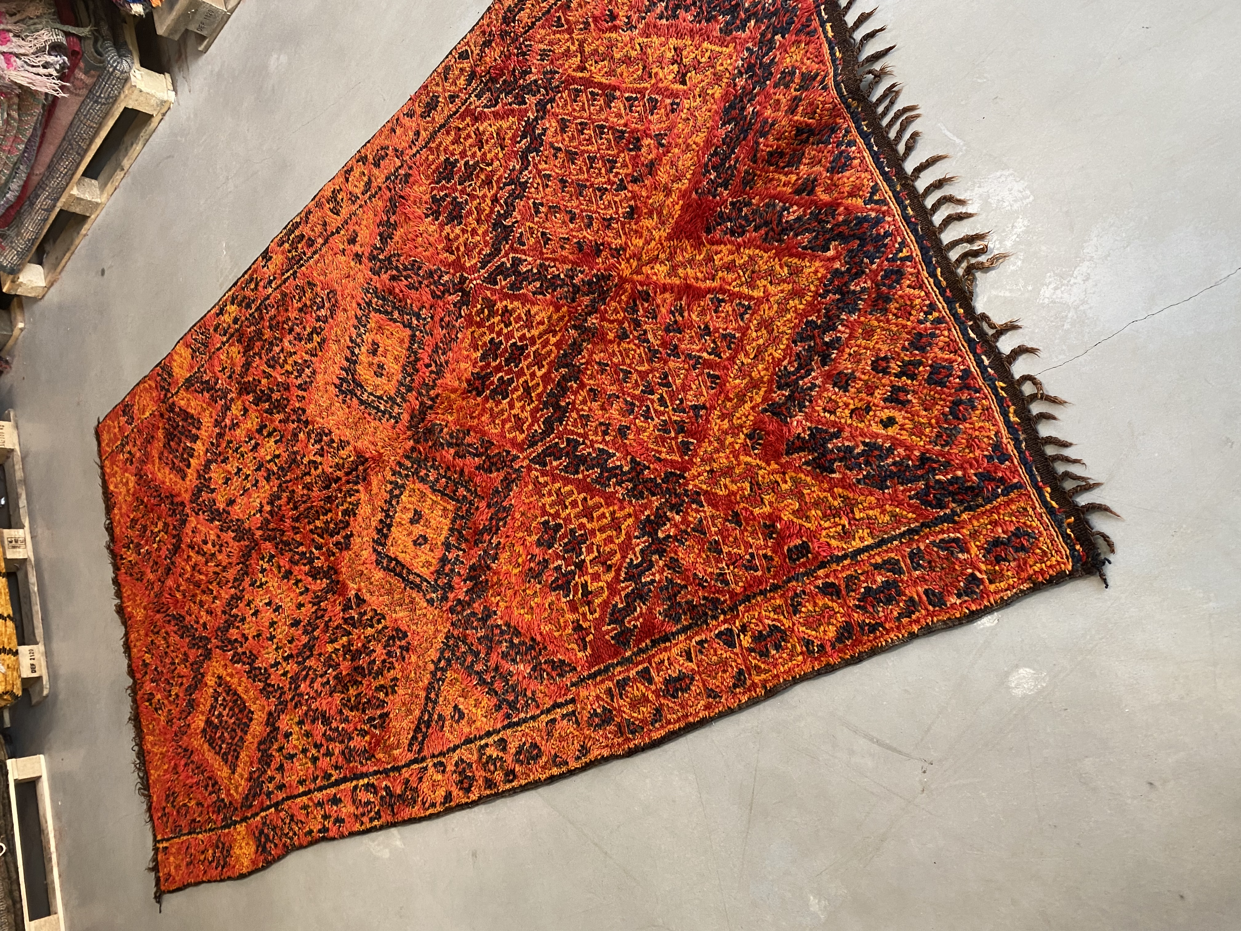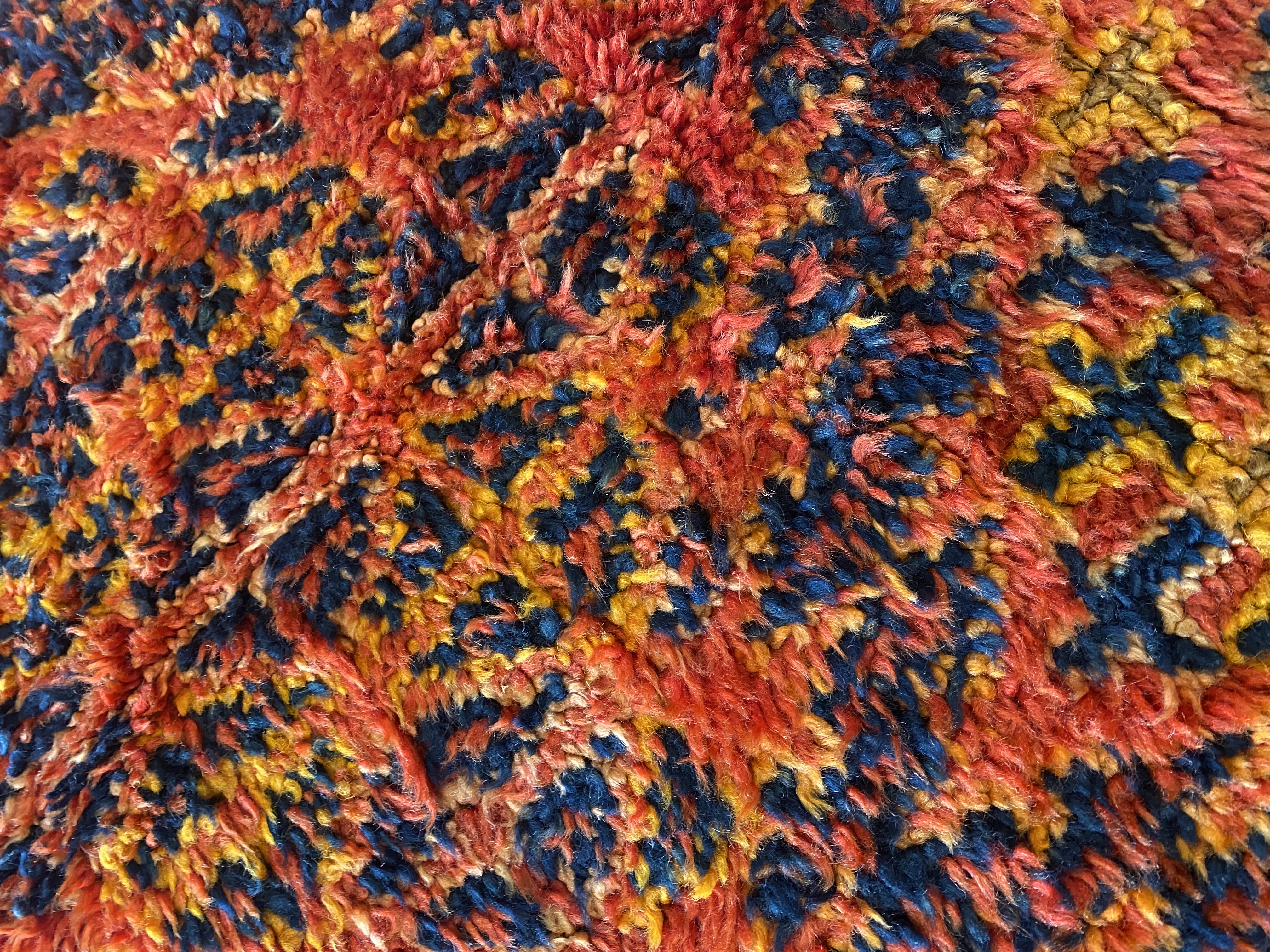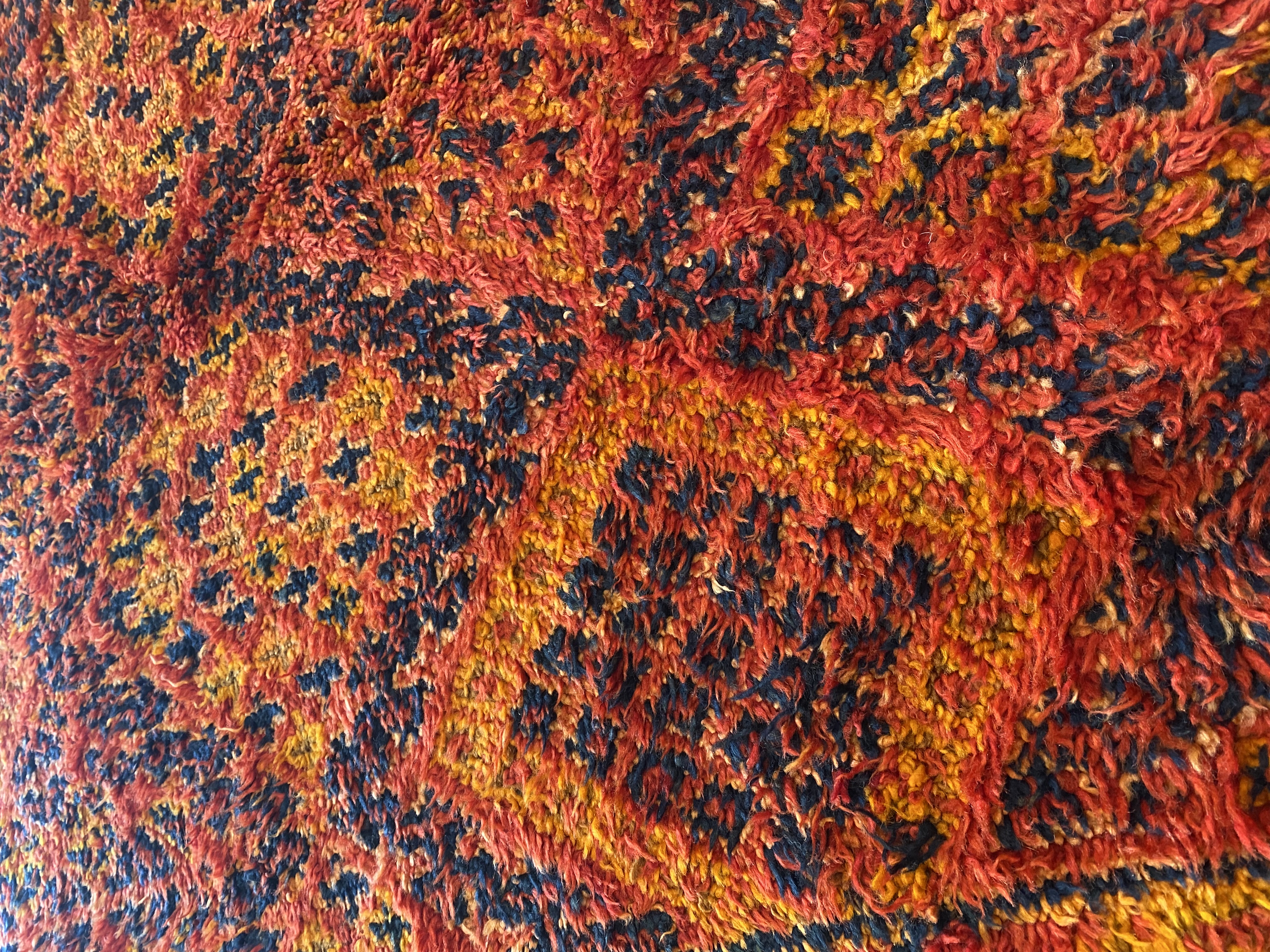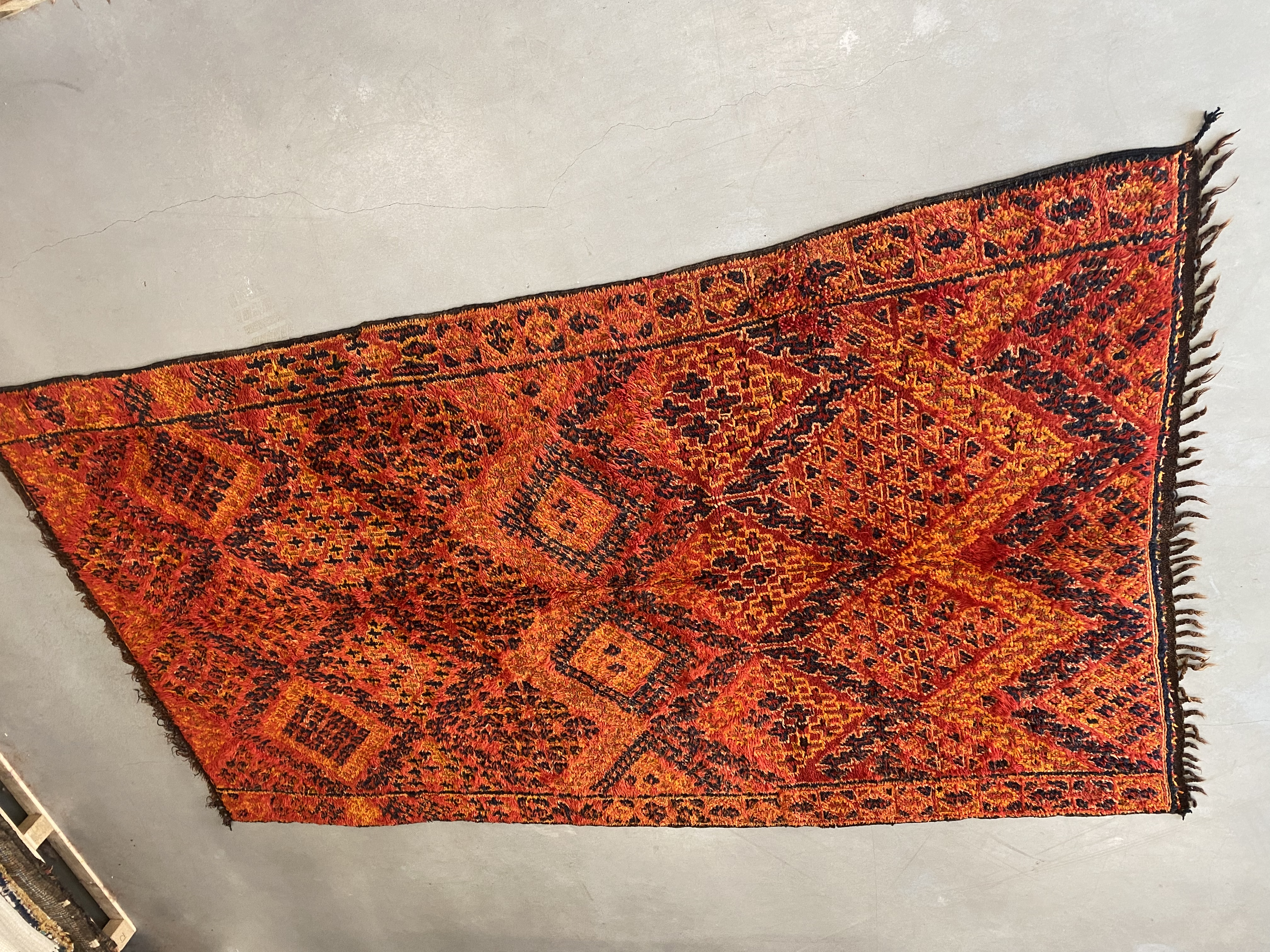 Beni Mguild rugs originate from the western central Middle Atlas region of Morocco, and as with most regions, they have their own style. The weavers in this region like to take the designs commonly found in flat weave rugs, and adapt them to their pile weave, hand knotted creations. This creates bold, flowing imagery that captures the joyous character of the weaver herself.