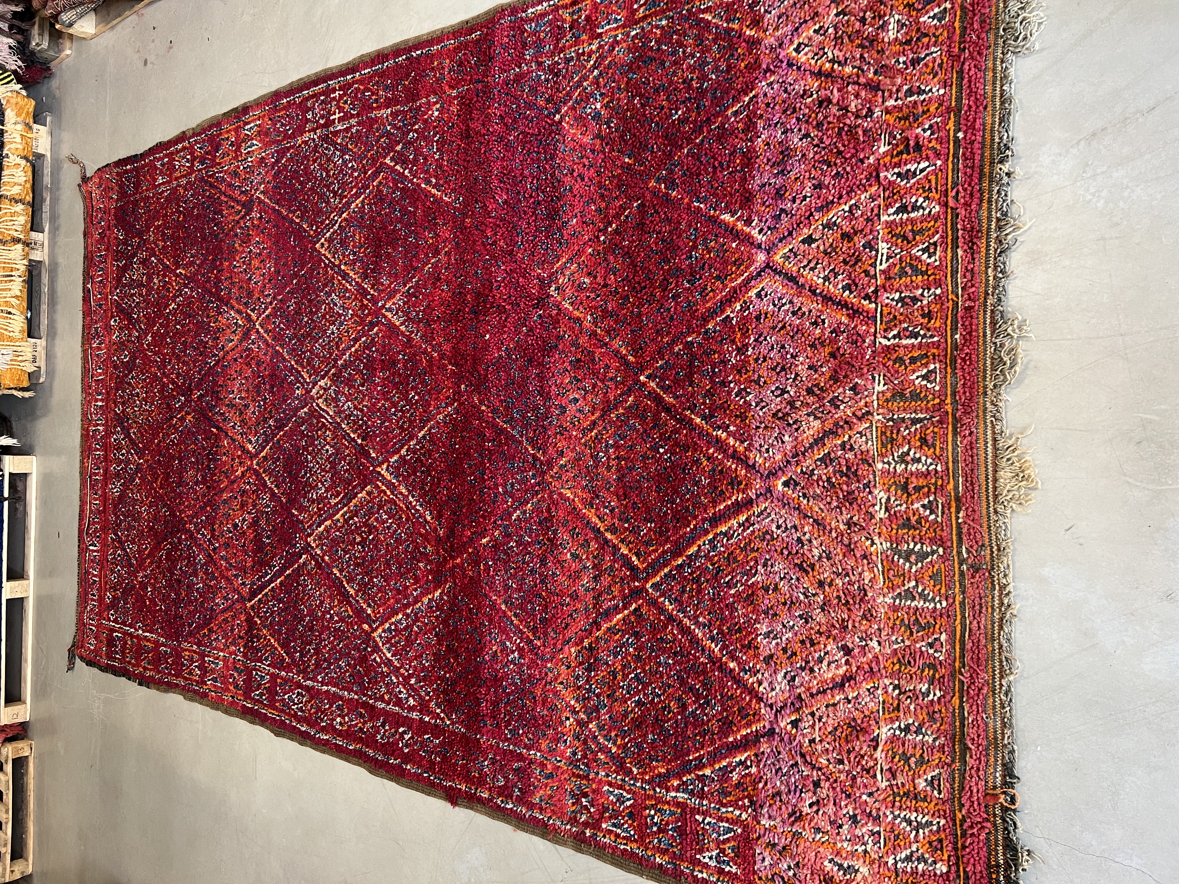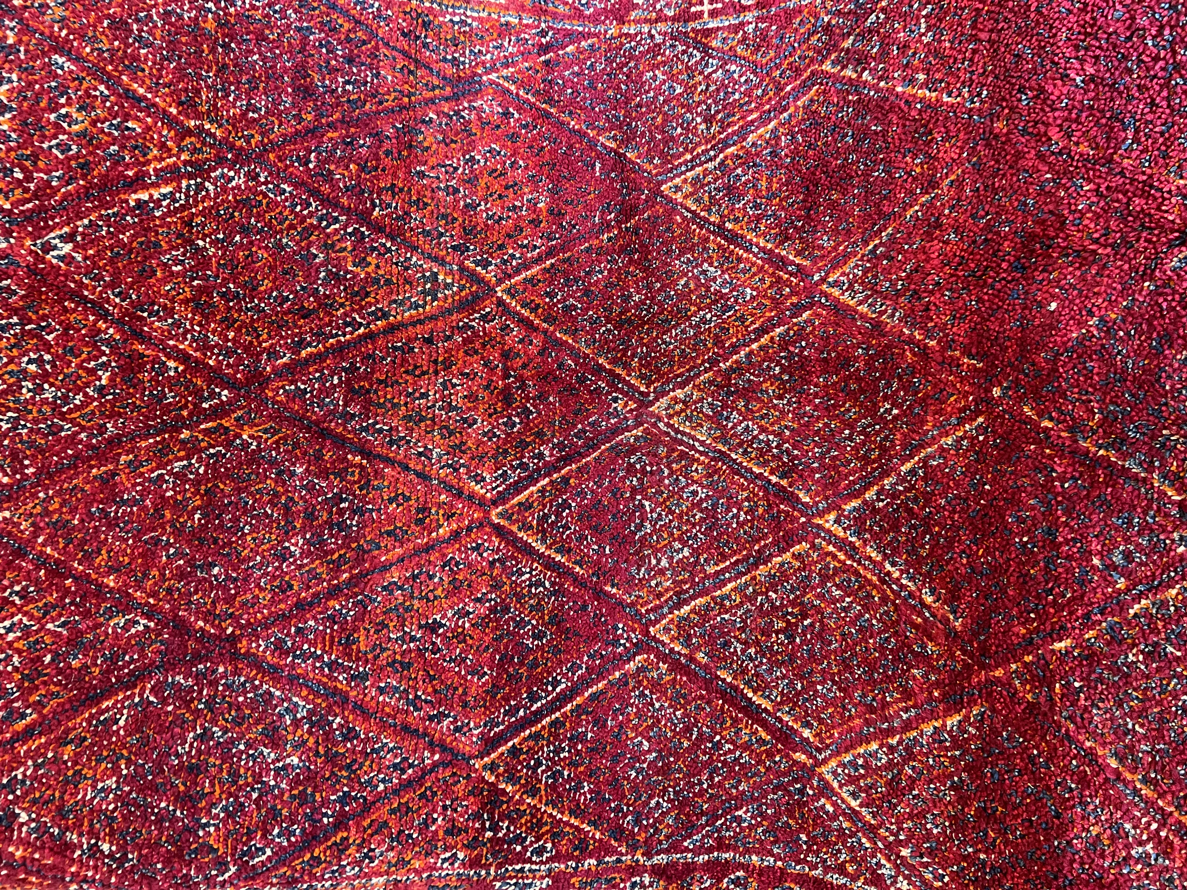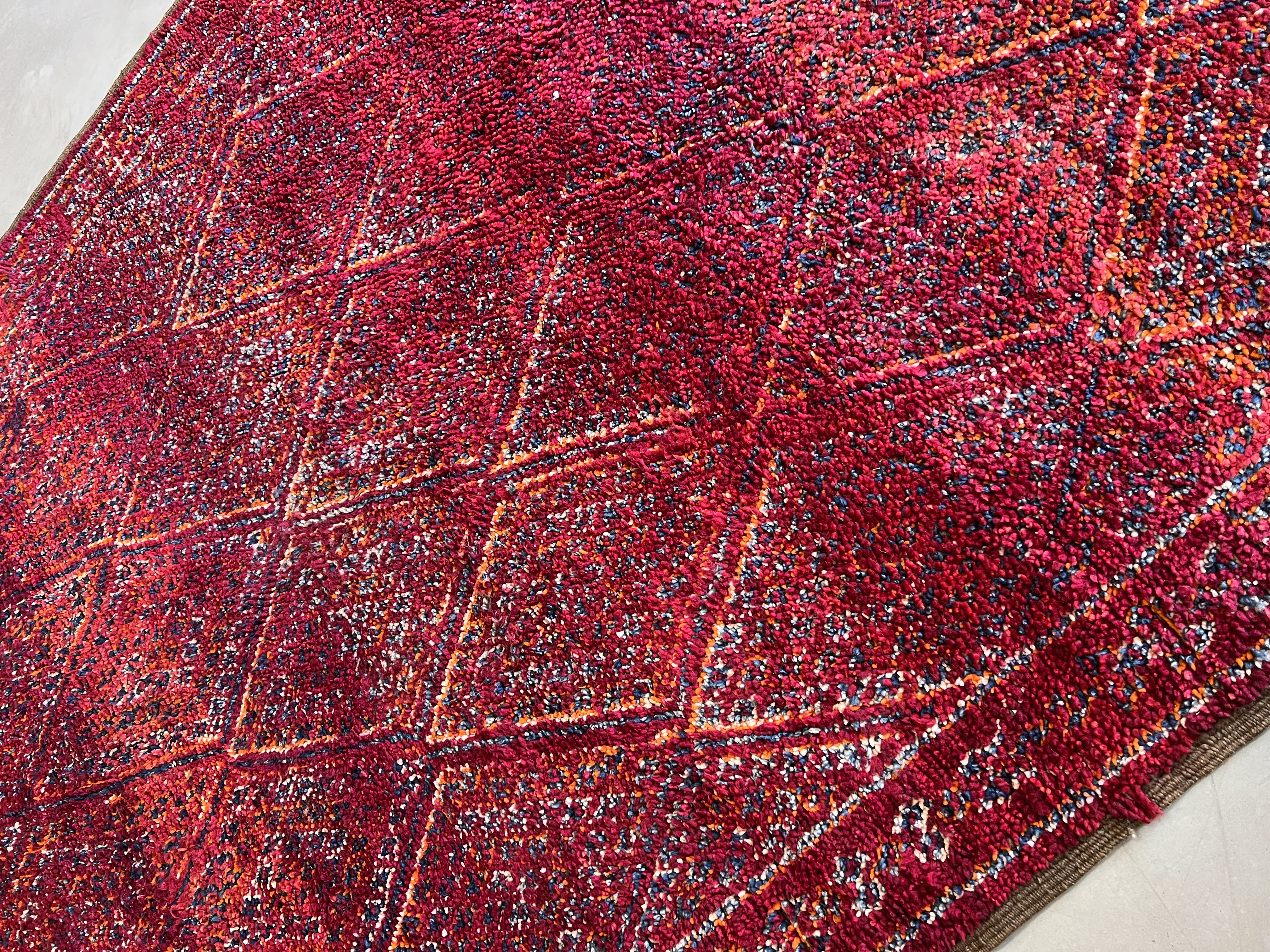 Beni Mguild rugs originate from the western central Middle Atlas region of Morocco, and as with most regions, they have their own style. The weavers in this region like to take the designs commonly found in flat weave rugs, and adapt them to their pile weave, hand knotted creations. This creates bold, flowing imagery that captures the joyous character of the weaver herself.