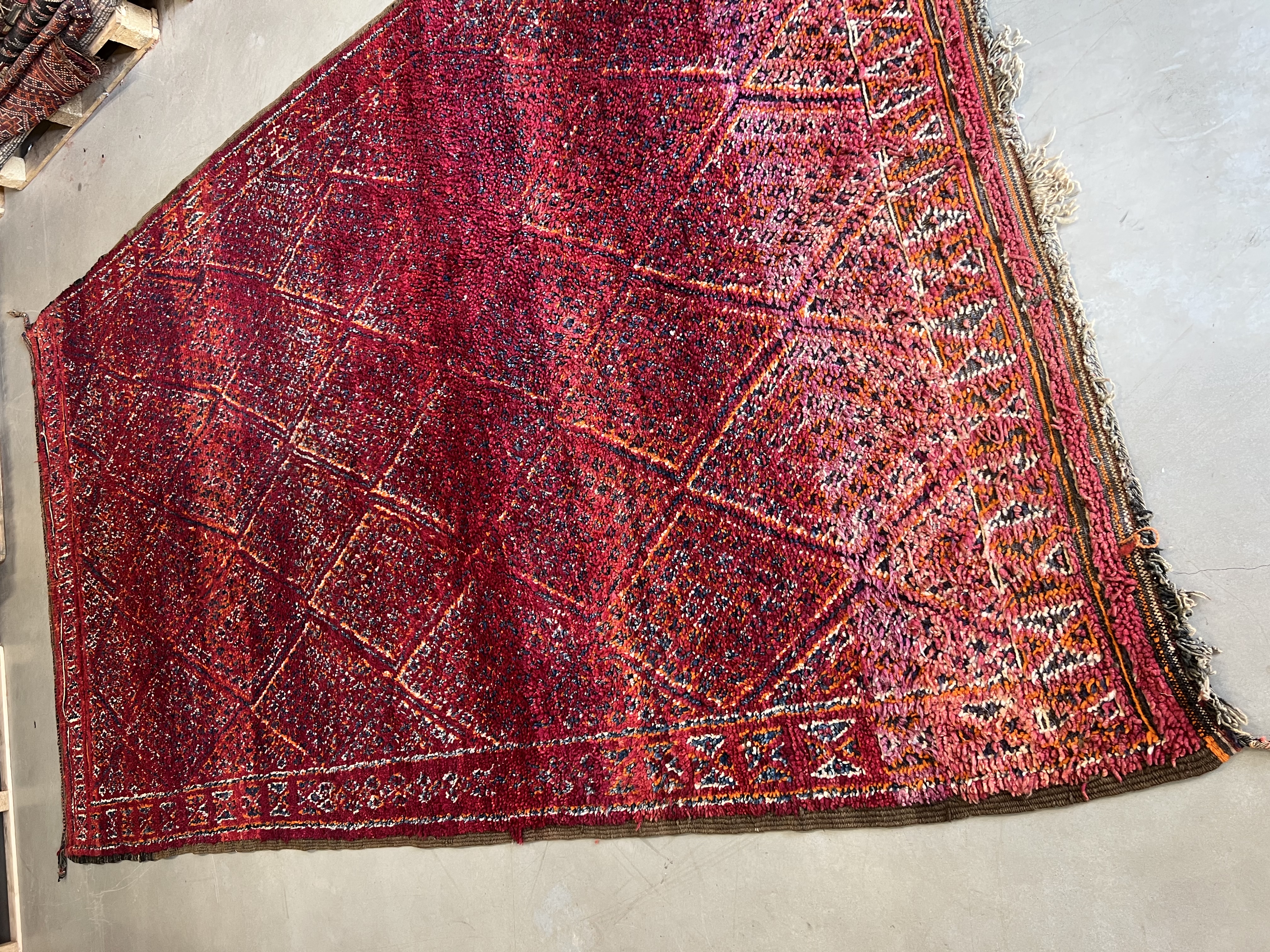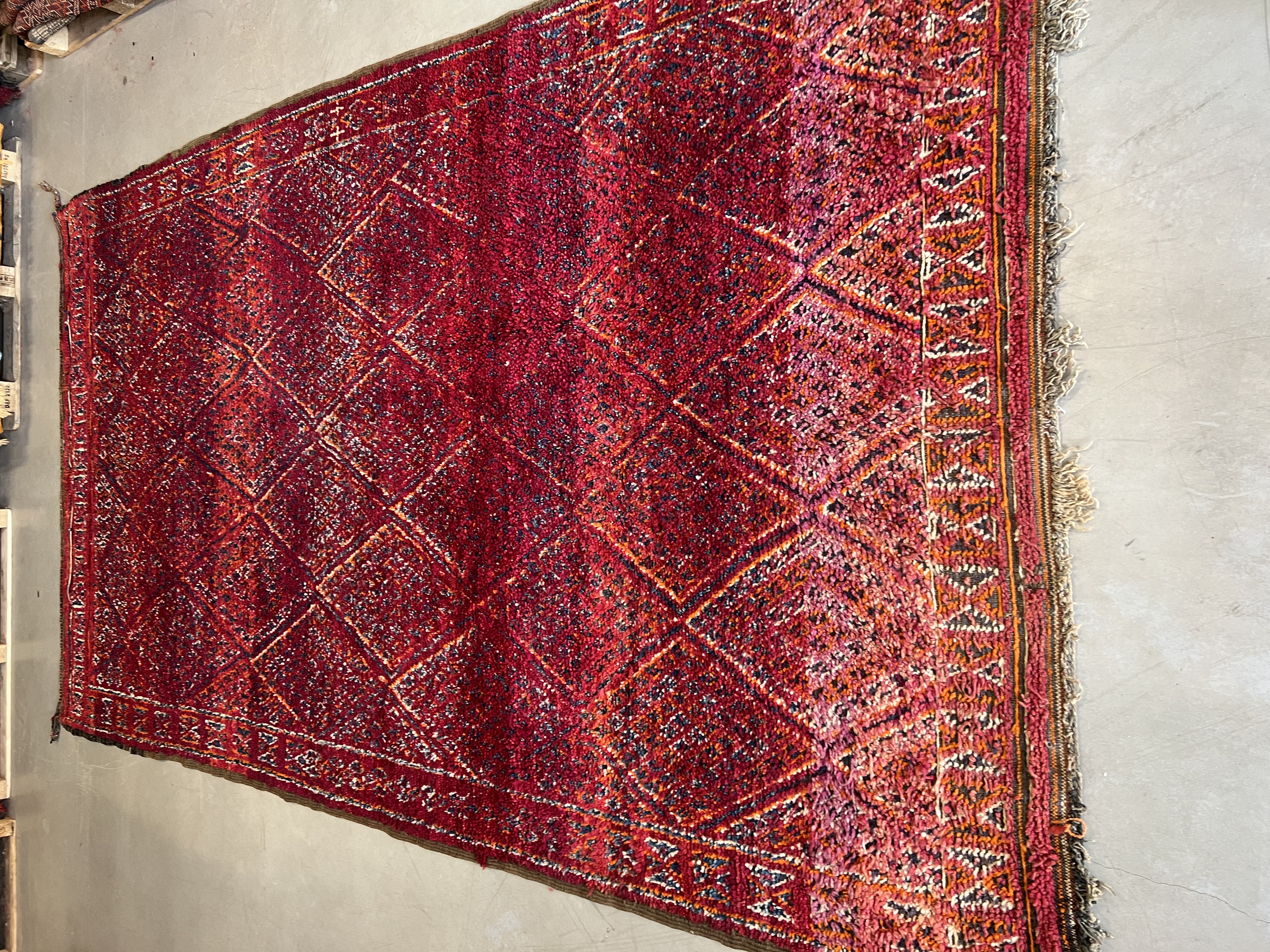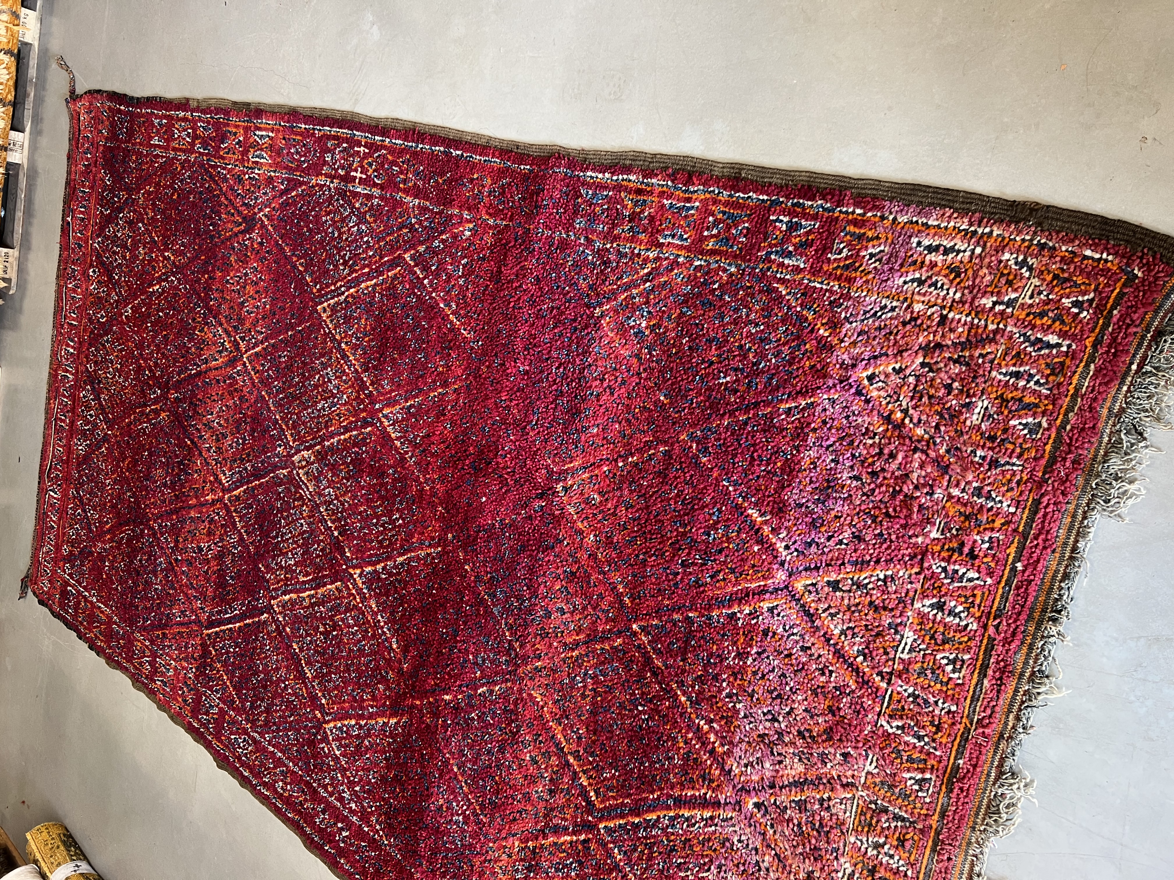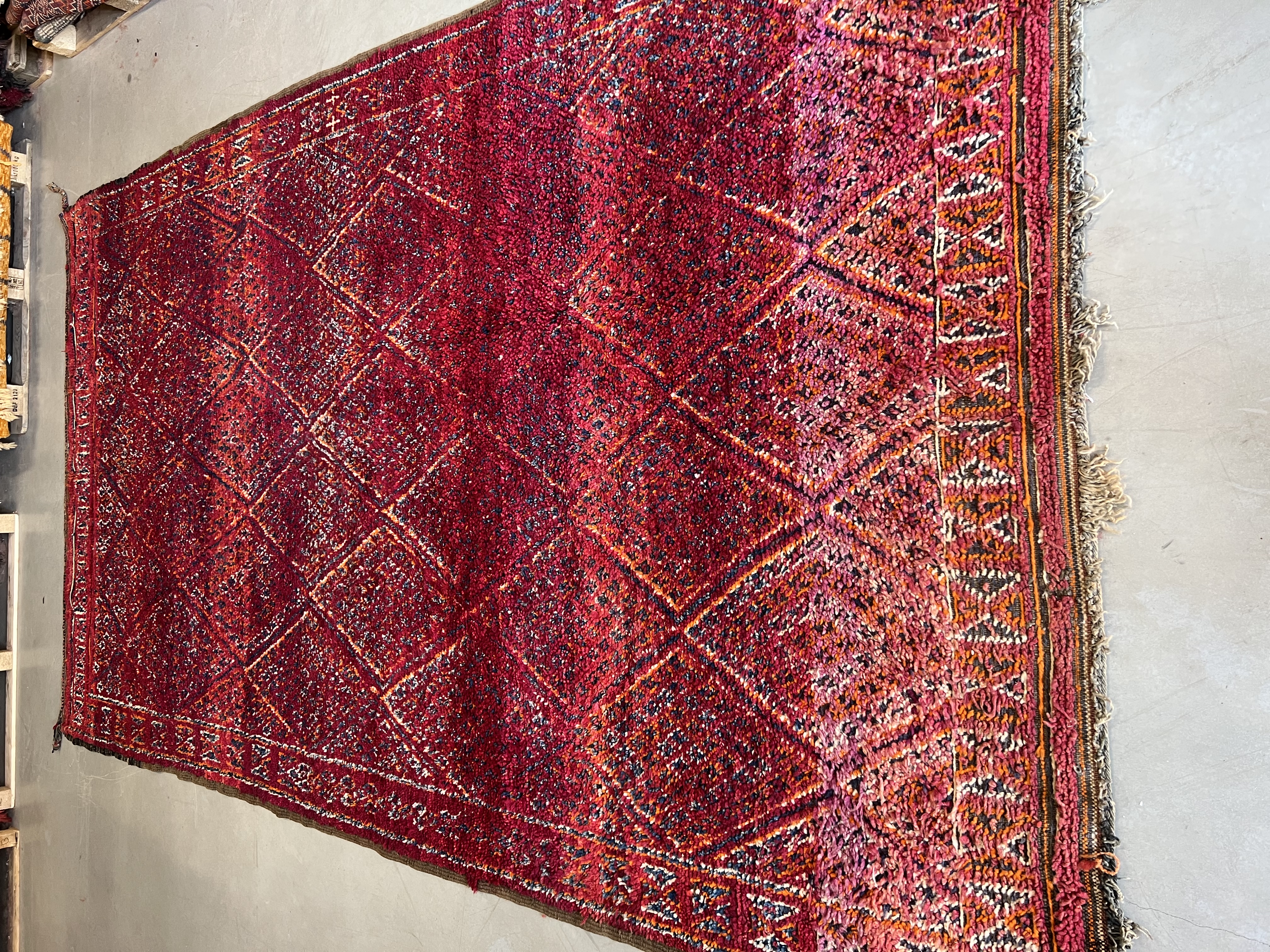 Beni Mguild rugs originate from the western central Middle Atlas region of Morocco, and as with most regions, they have their own style. The weavers in this region like to take the designs commonly found in flat weave rugs, and adapt them to their pile weave, hand knotted creations. This creates bold, flowing imagery that captures the joyous character of the weaver herself.