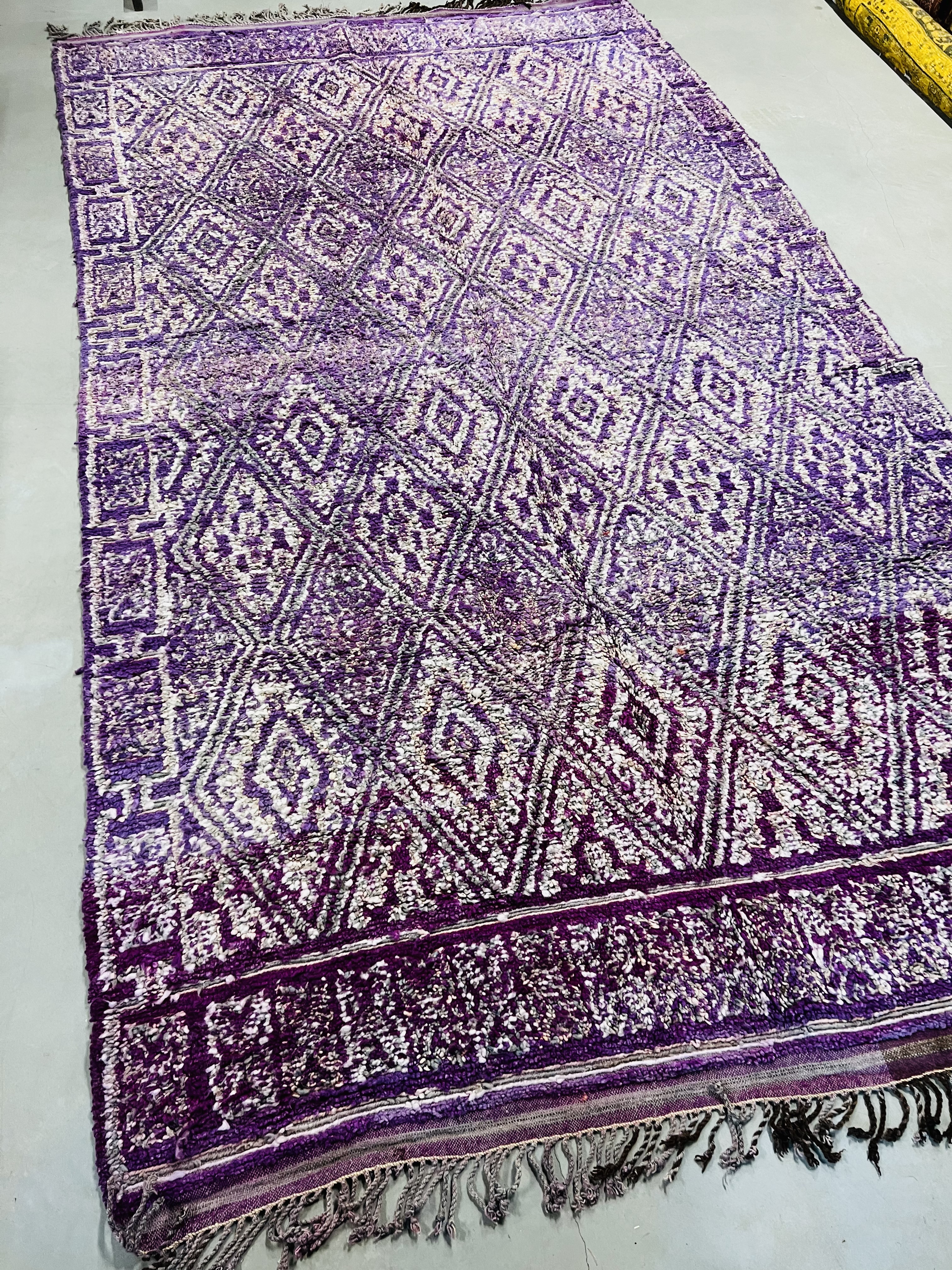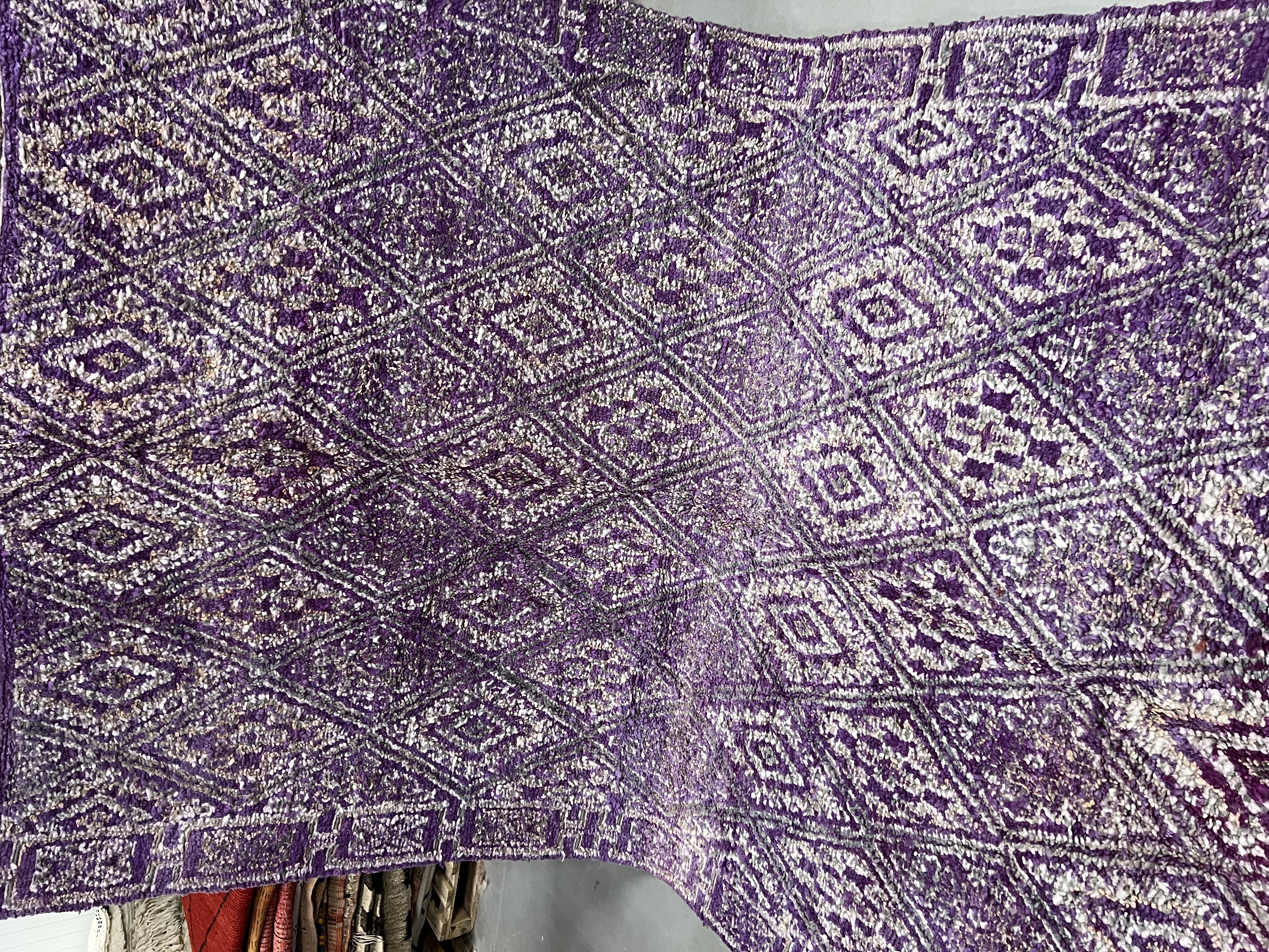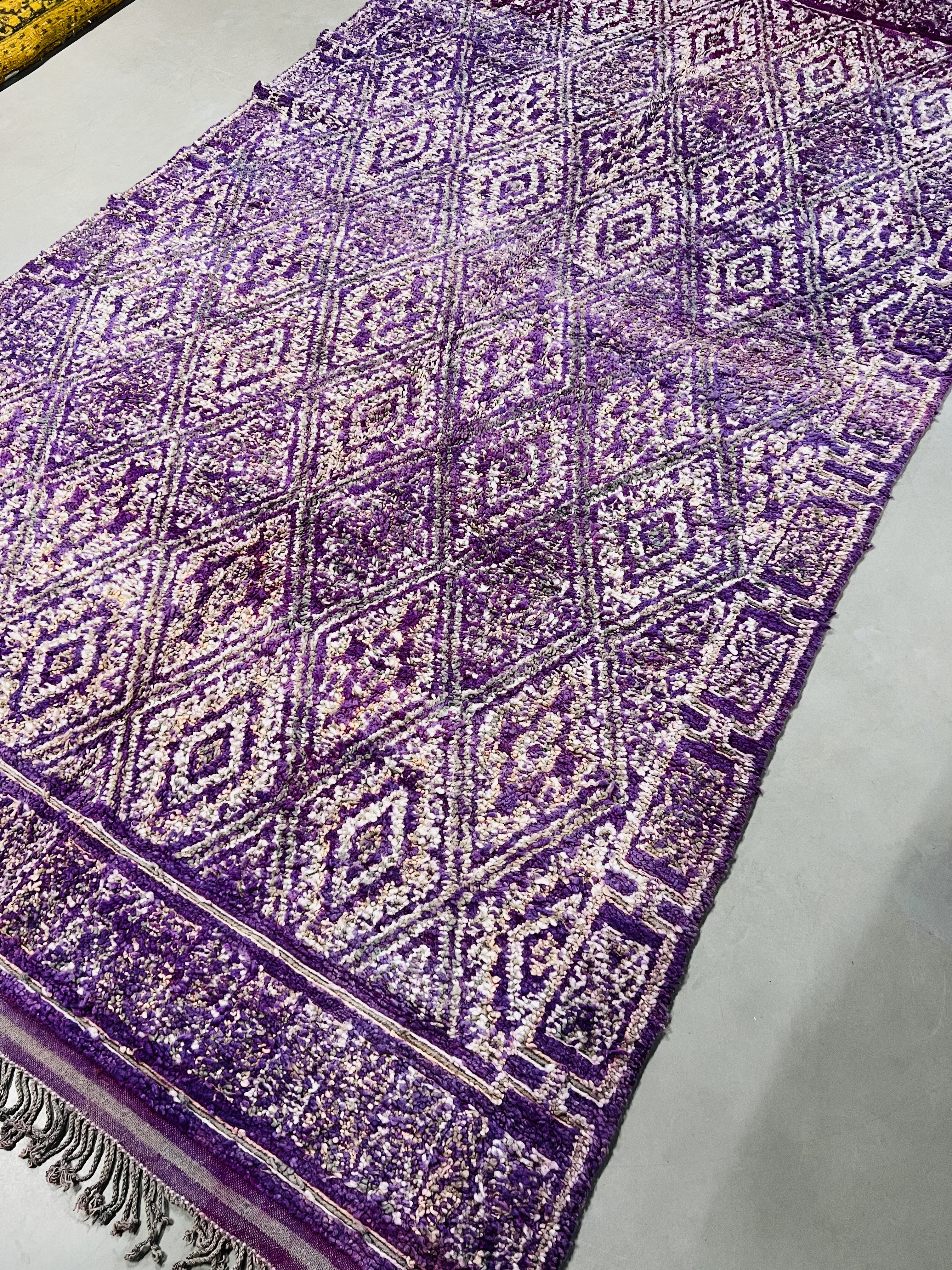 Beni Mguild rugs originate from the western central Middle Atlas region of Morocco, and as with most regions, they have their own style. The weavers in this region like to take the designs commonly found in flat weave rugs, and adapt them to their pile weave, hand knotted creations. This creates bold, flowing imagery that captures the joyous character of the weaver herself.