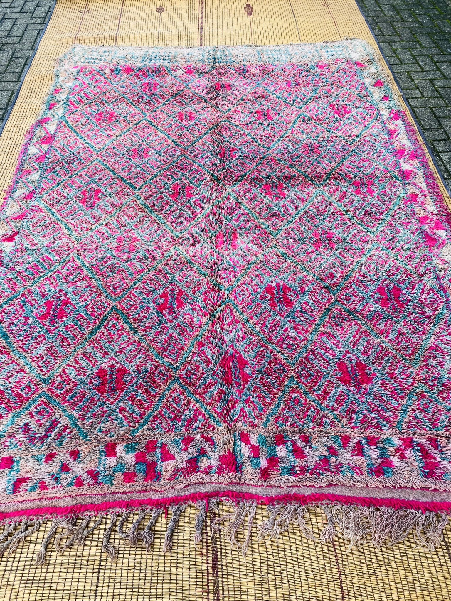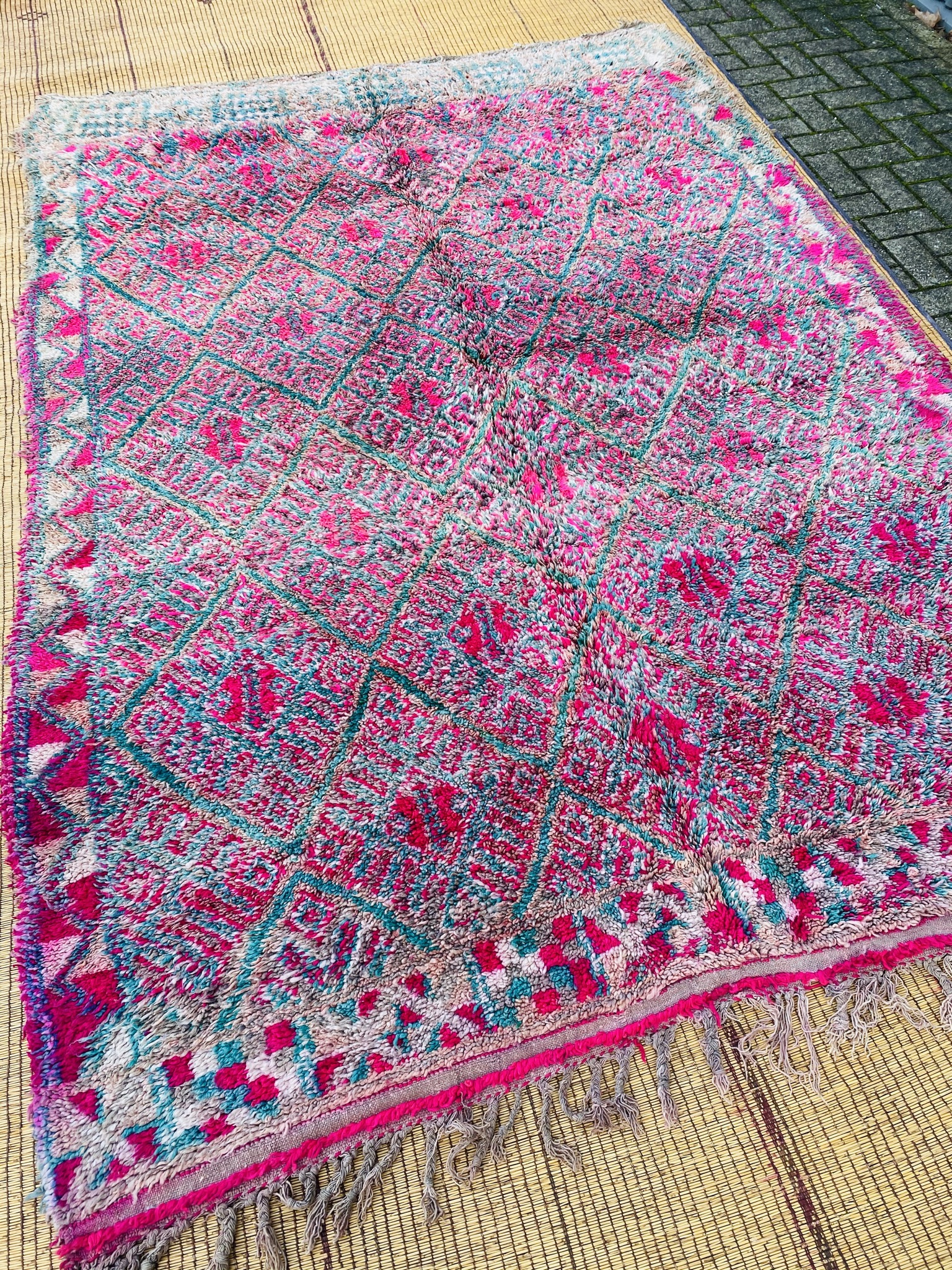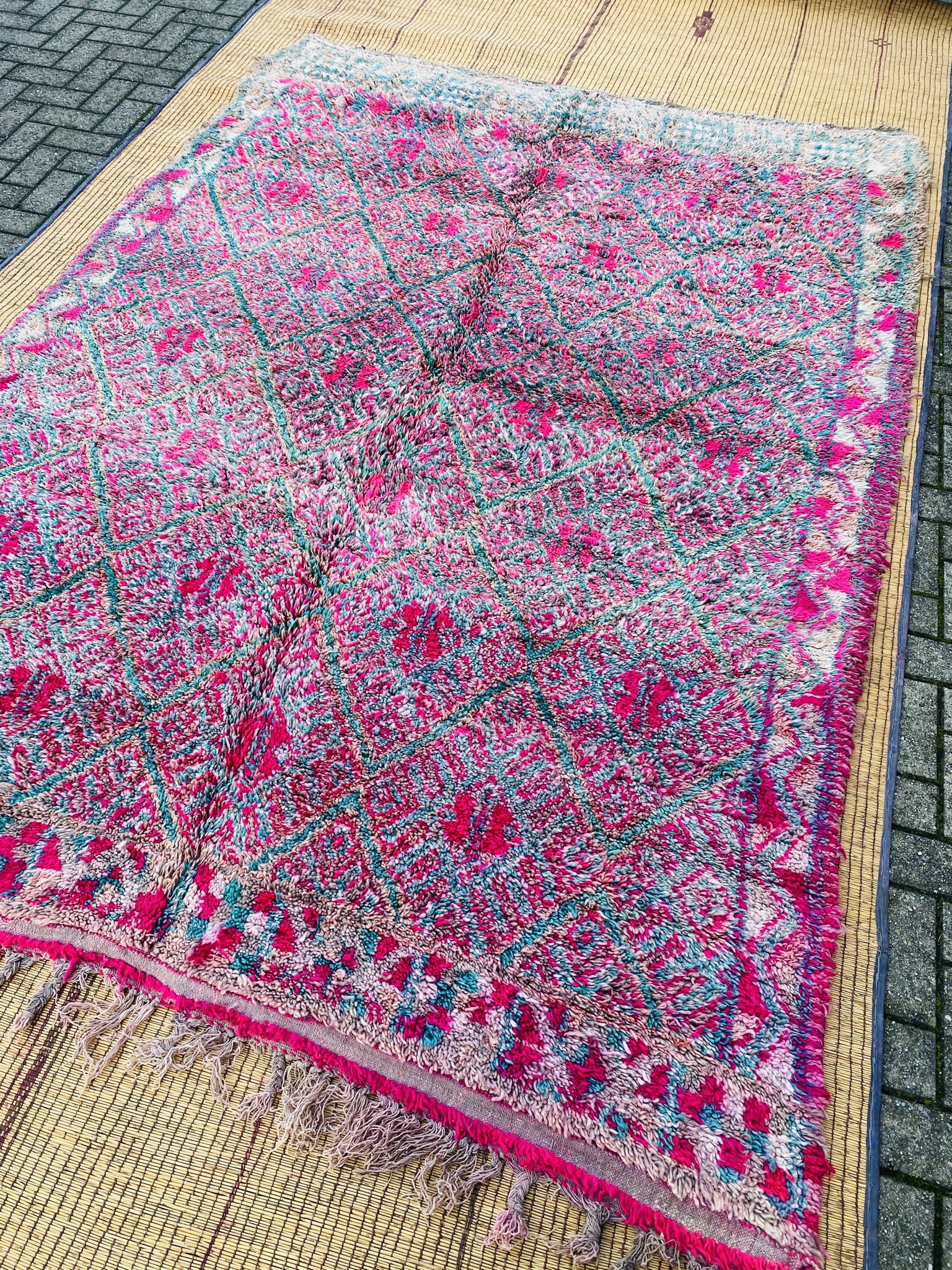 Beni Mguild rugs originate from the western central Middle Atlas region of Morocco, and as with most regions, they have their own style. The weavers in this region like to take the designs commonly found in flat weave rugs, and adapt them to their pile weave, hand knotted creations. This creates bold, flowing imagery that captures the joyous character of the weaver herself.