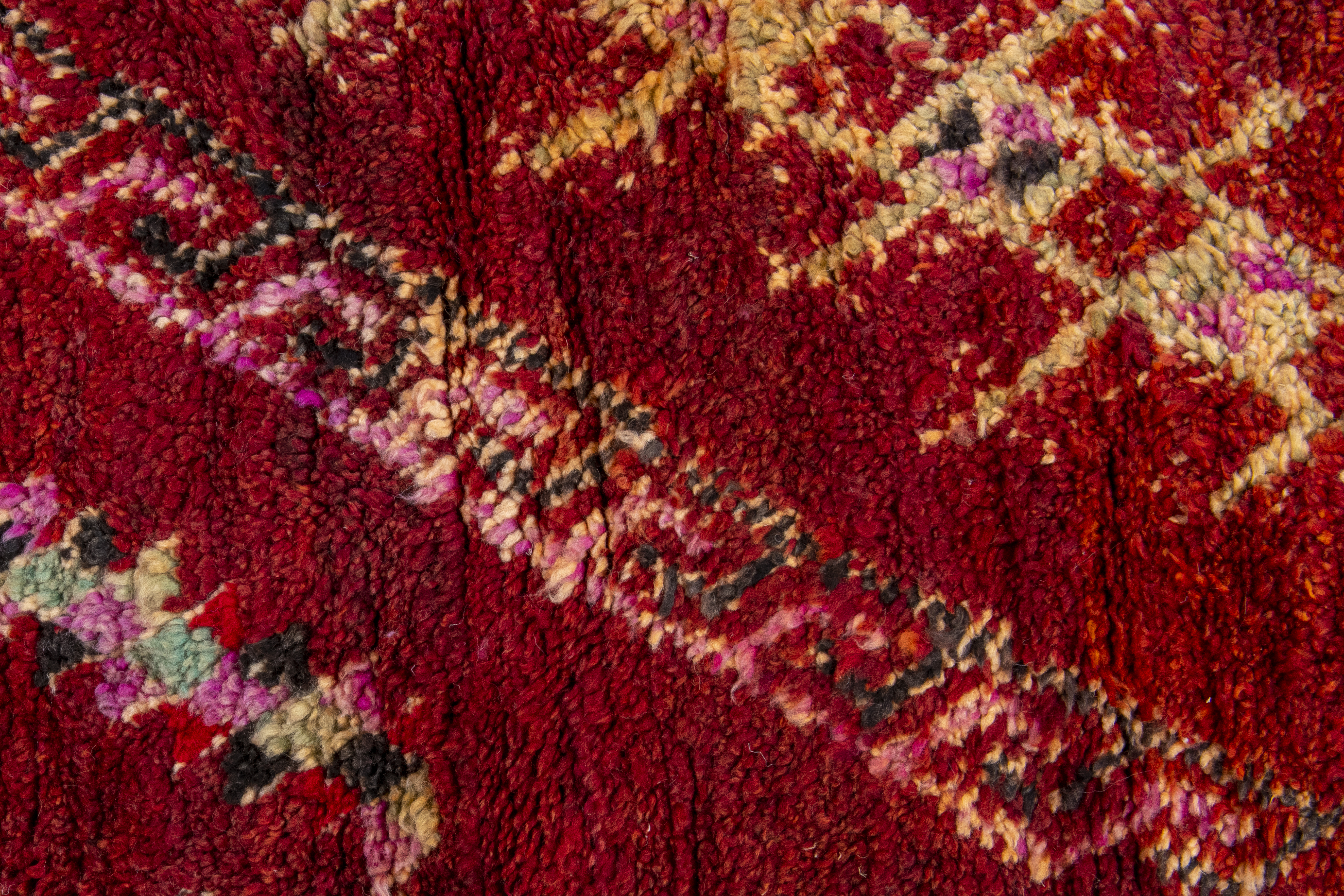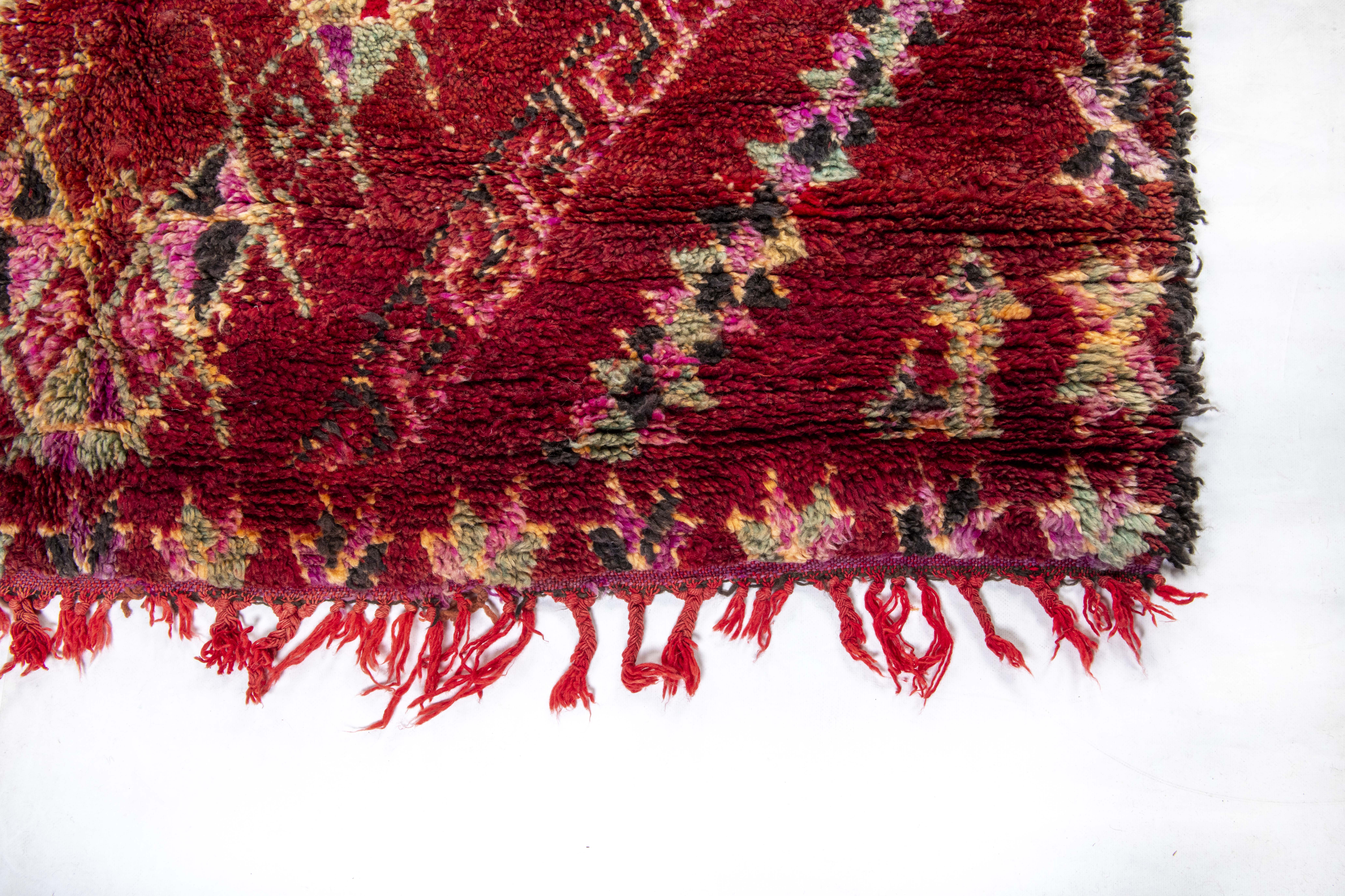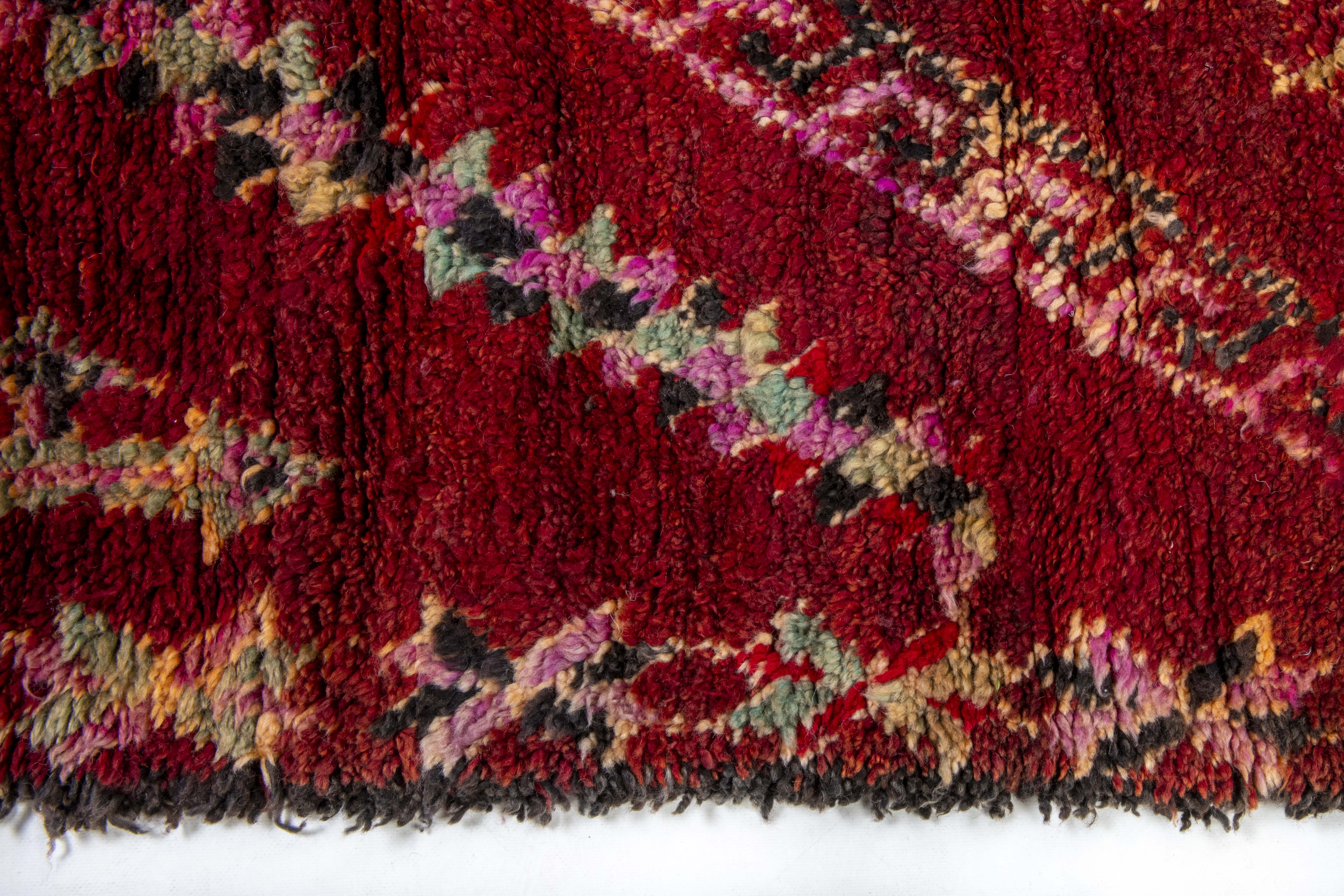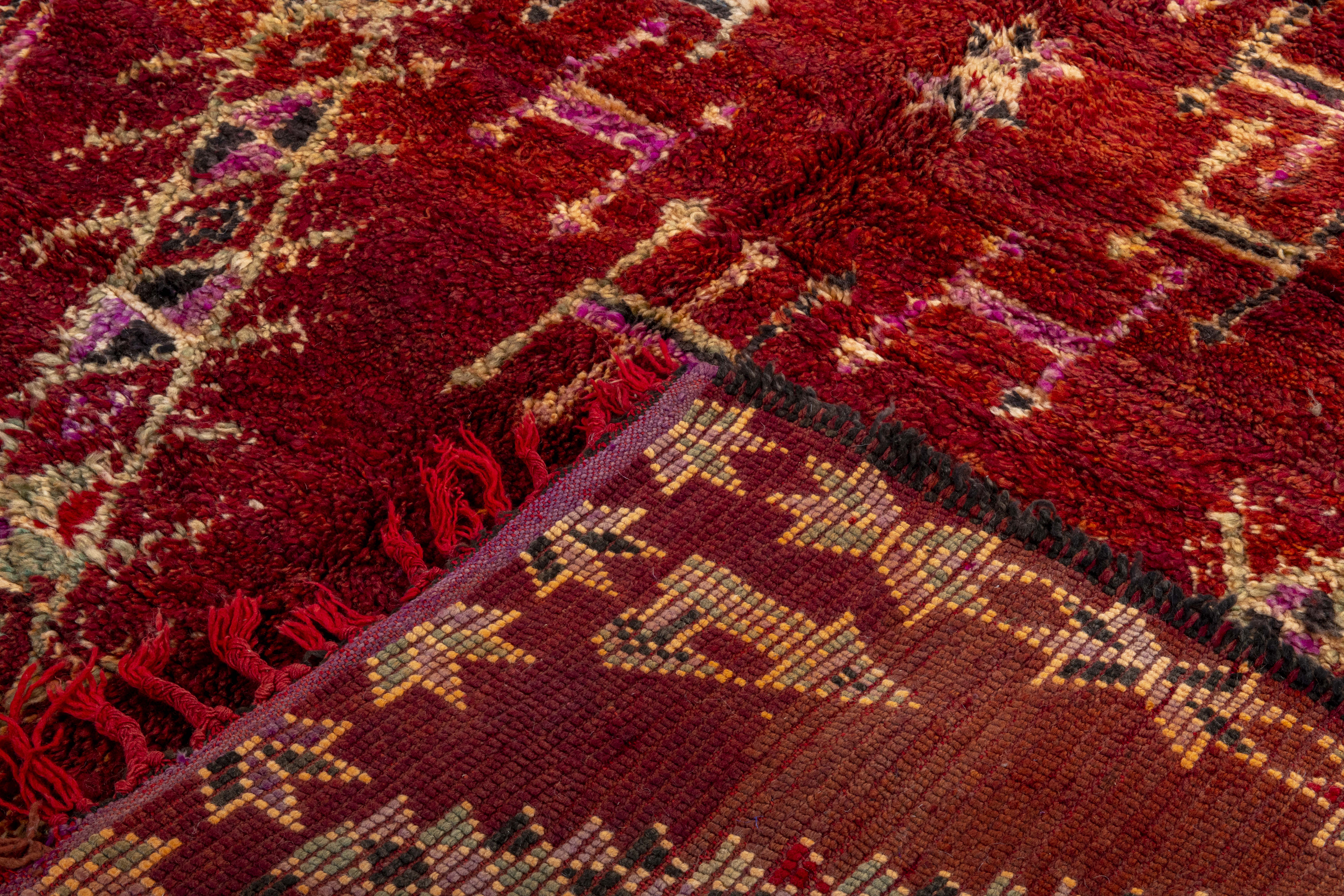 Beni Mguild rugs originate from the western central Middle Atlas region of Morocco, and as with most regions, they have their own style. The weavers in this region like to take the designs commonly found in flat weave rugs, and adapt them to their pile weave, hand knotted creations. This creates bold, flowing imagery that captures the joyous character of the weaver herself.