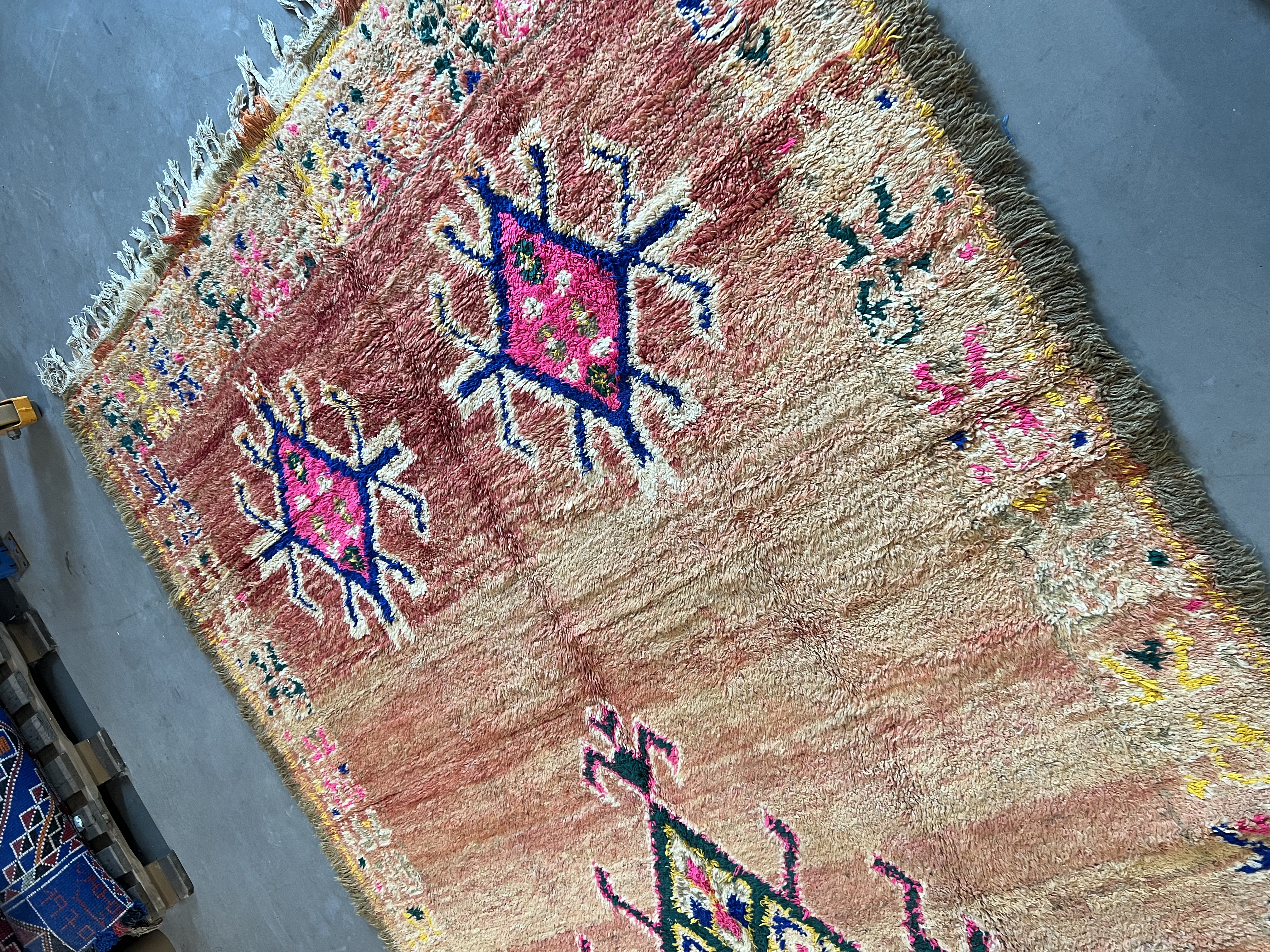 Beni Mguild rugs originate from the western central Middle Atlas region of Morocco, and as with most regions, they have their own style. The weavers in this region like to take the designs commonly found in flat weave rugs, and adapt them to their pile weave, hand knotted creations. This creates bold, flowing imagery that captures the joyous character of the weaver herself.