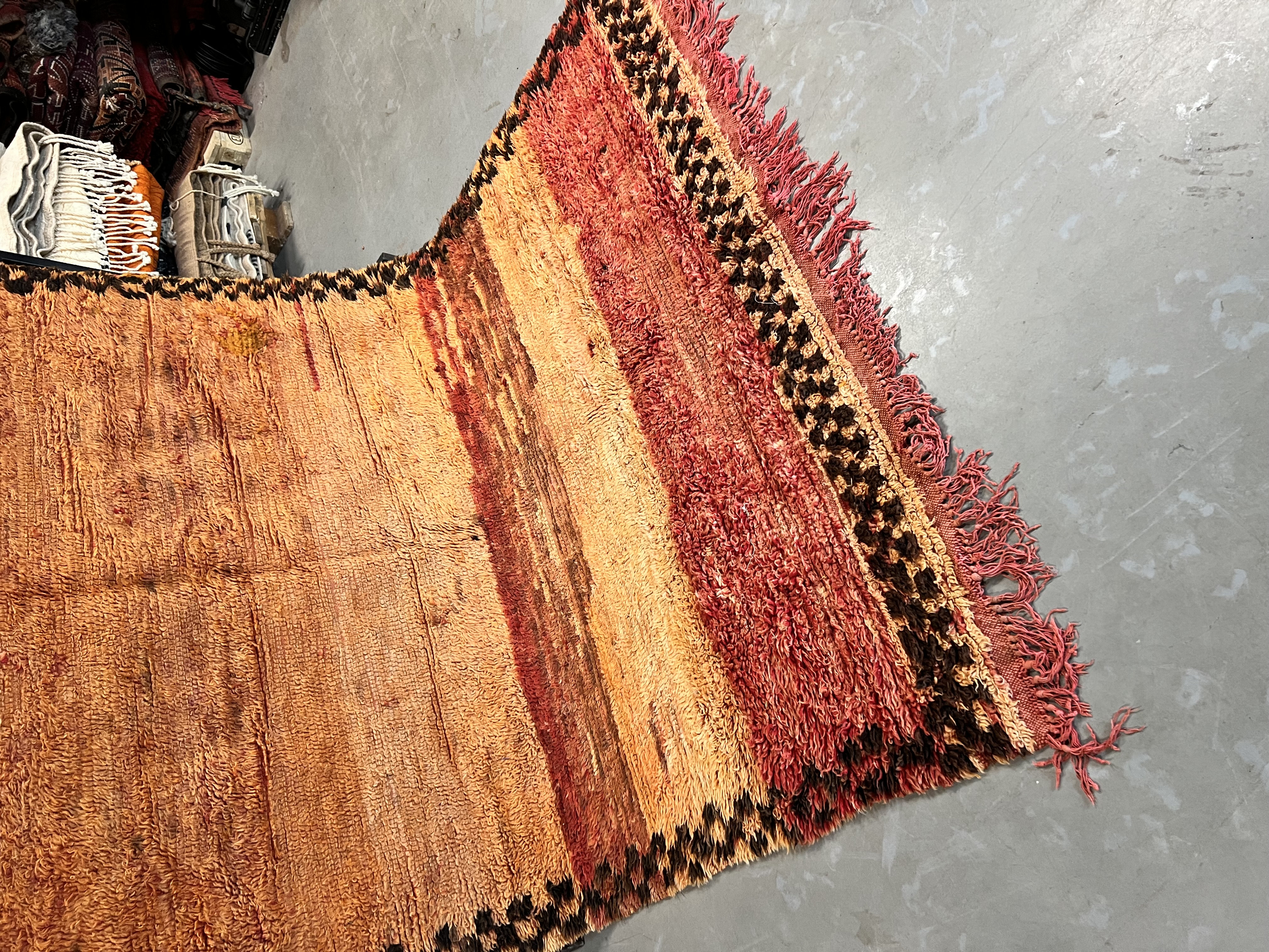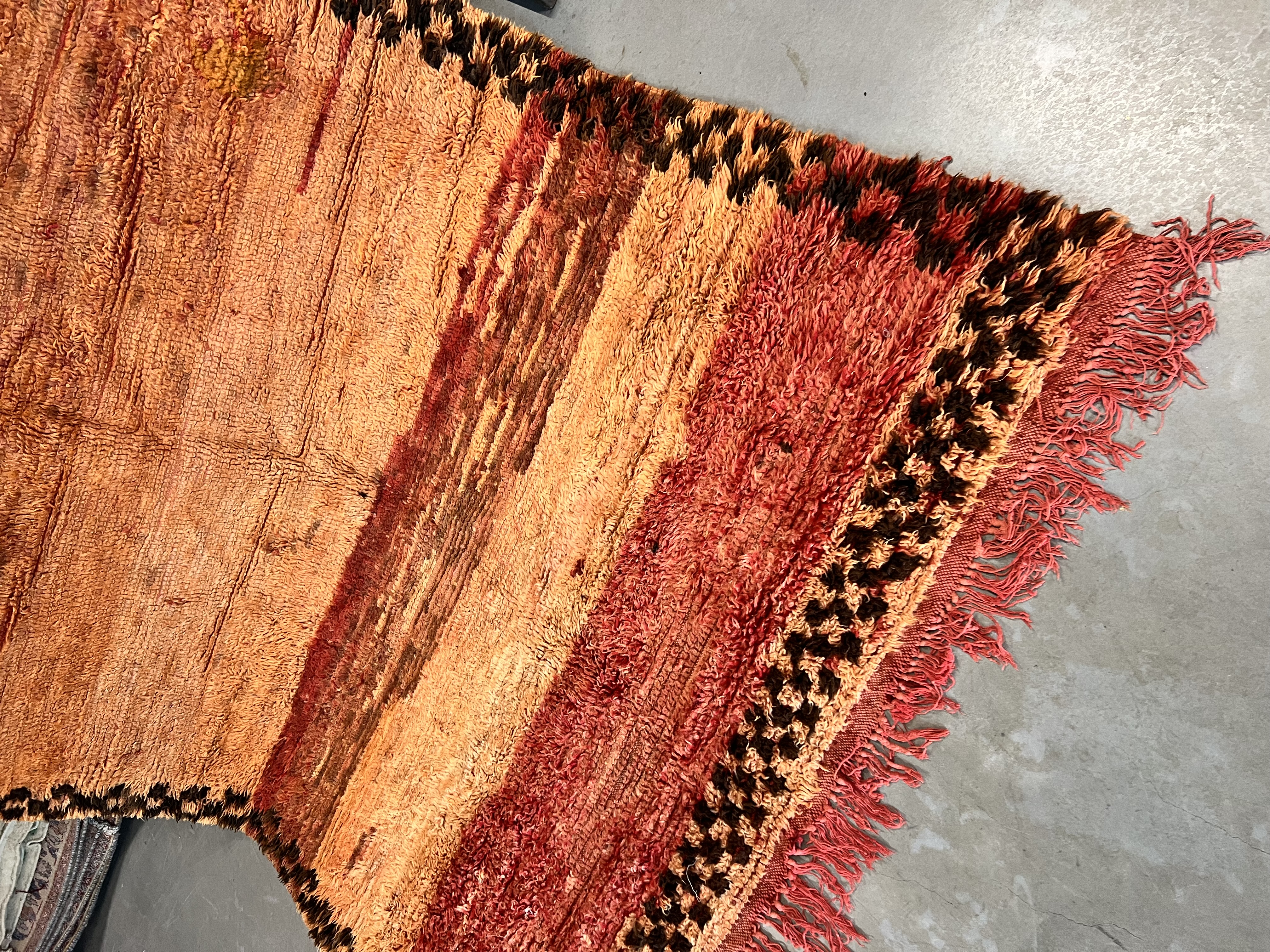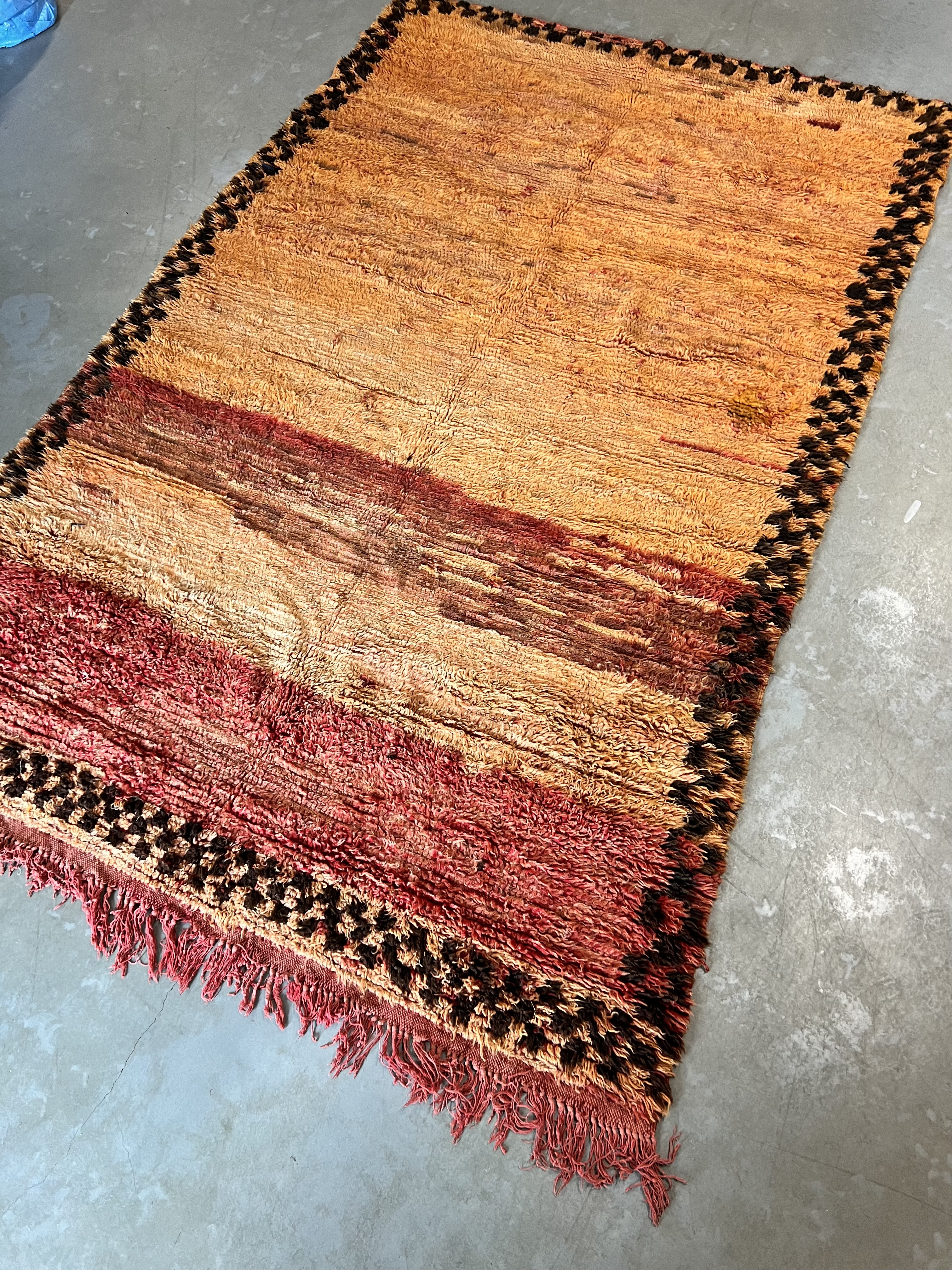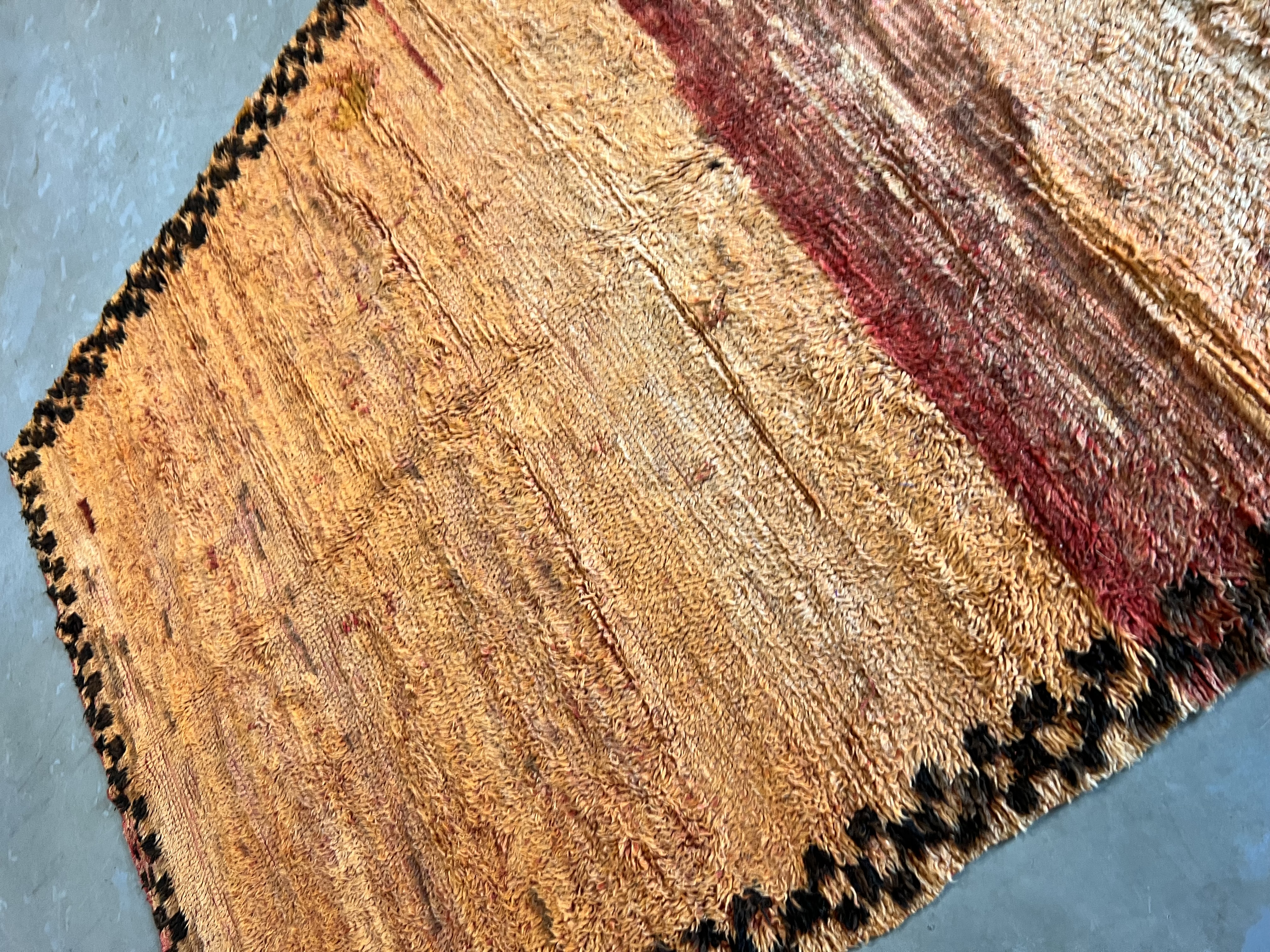 Beni Mguild rugs originate from the western central Middle Atlas region of Morocco, and as with most regions, they have their own style. The weavers in this region like to take the designs commonly found in flat weave rugs, and adapt them to their pile weave, hand knotted creations. This creates bold, flowing imagery that captures the joyous character of the weaver herself.