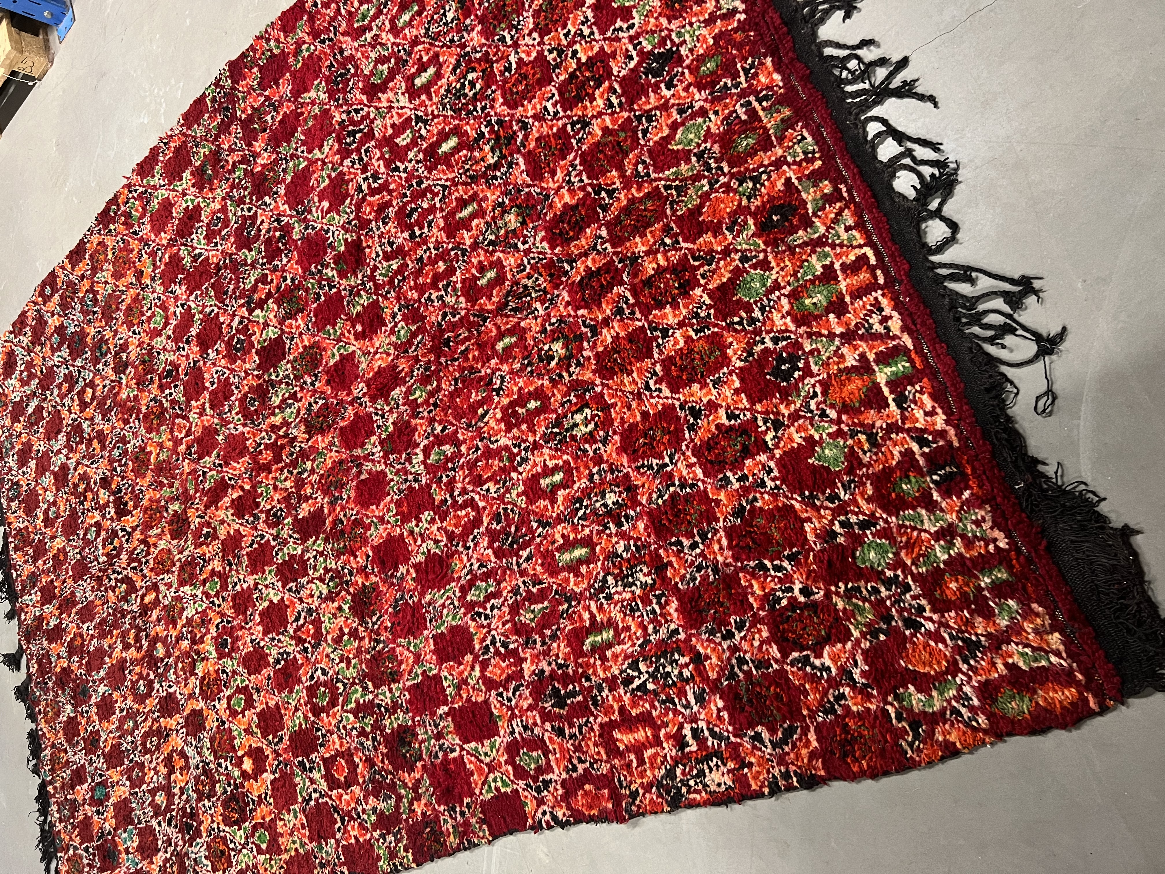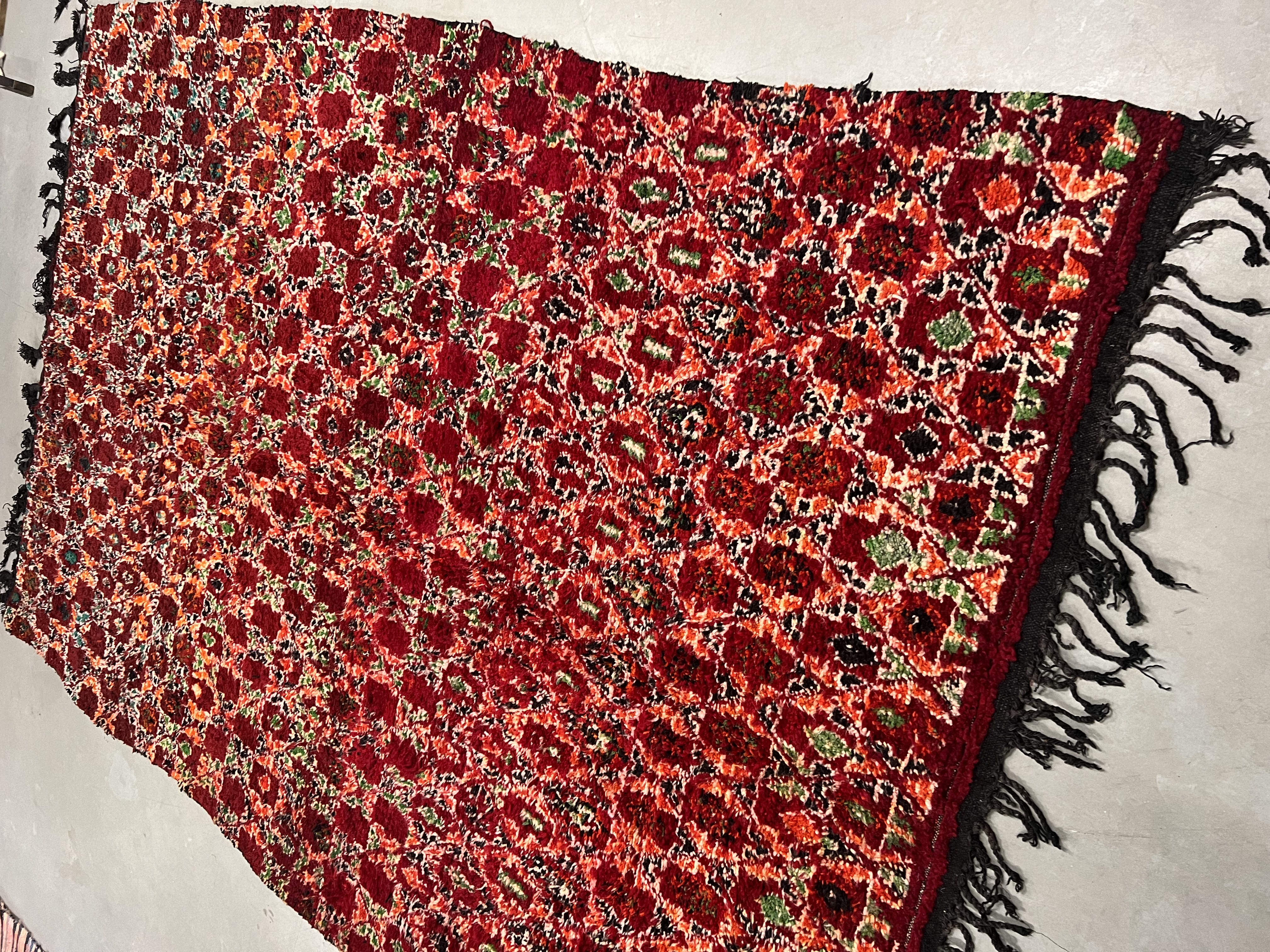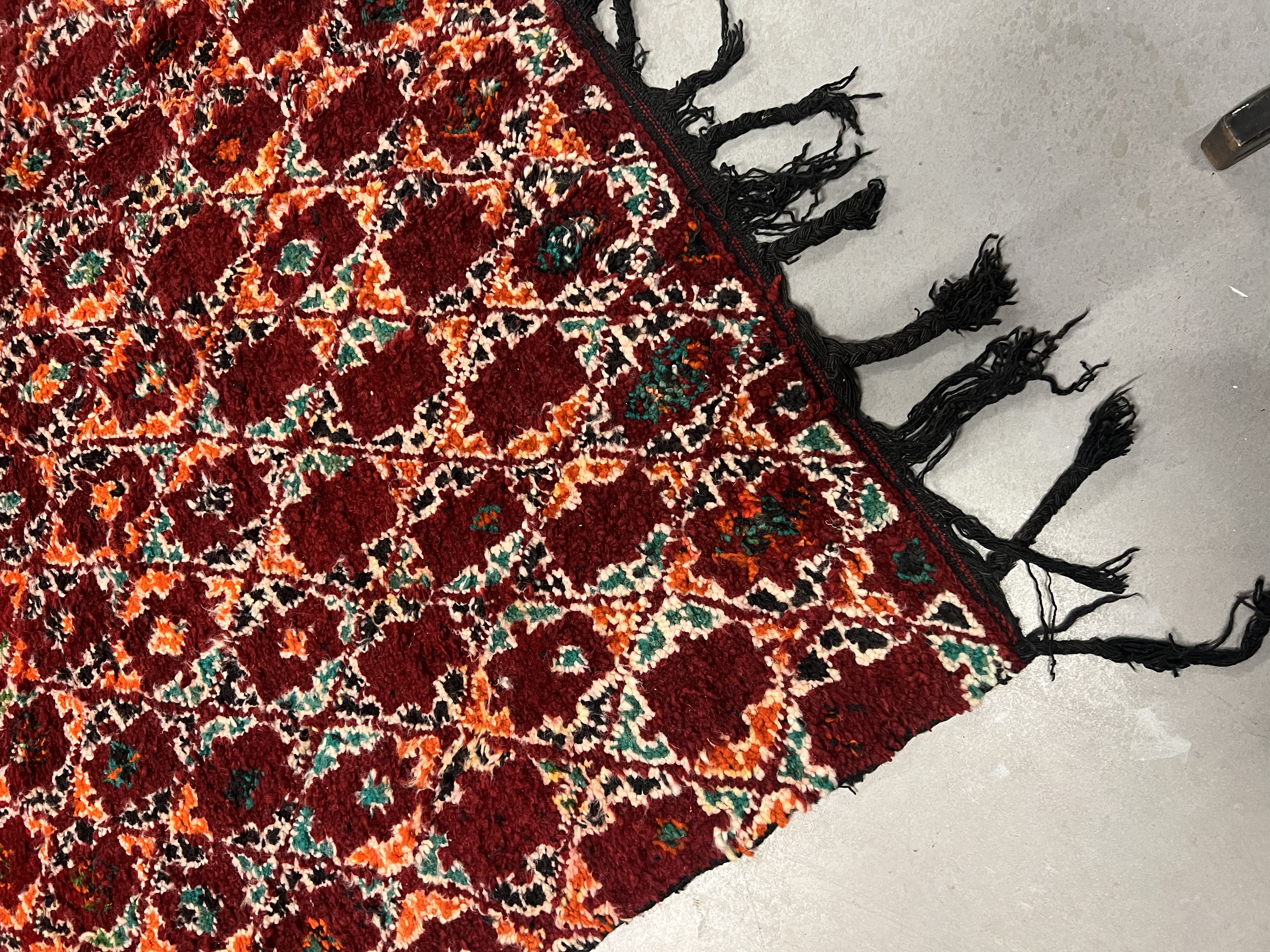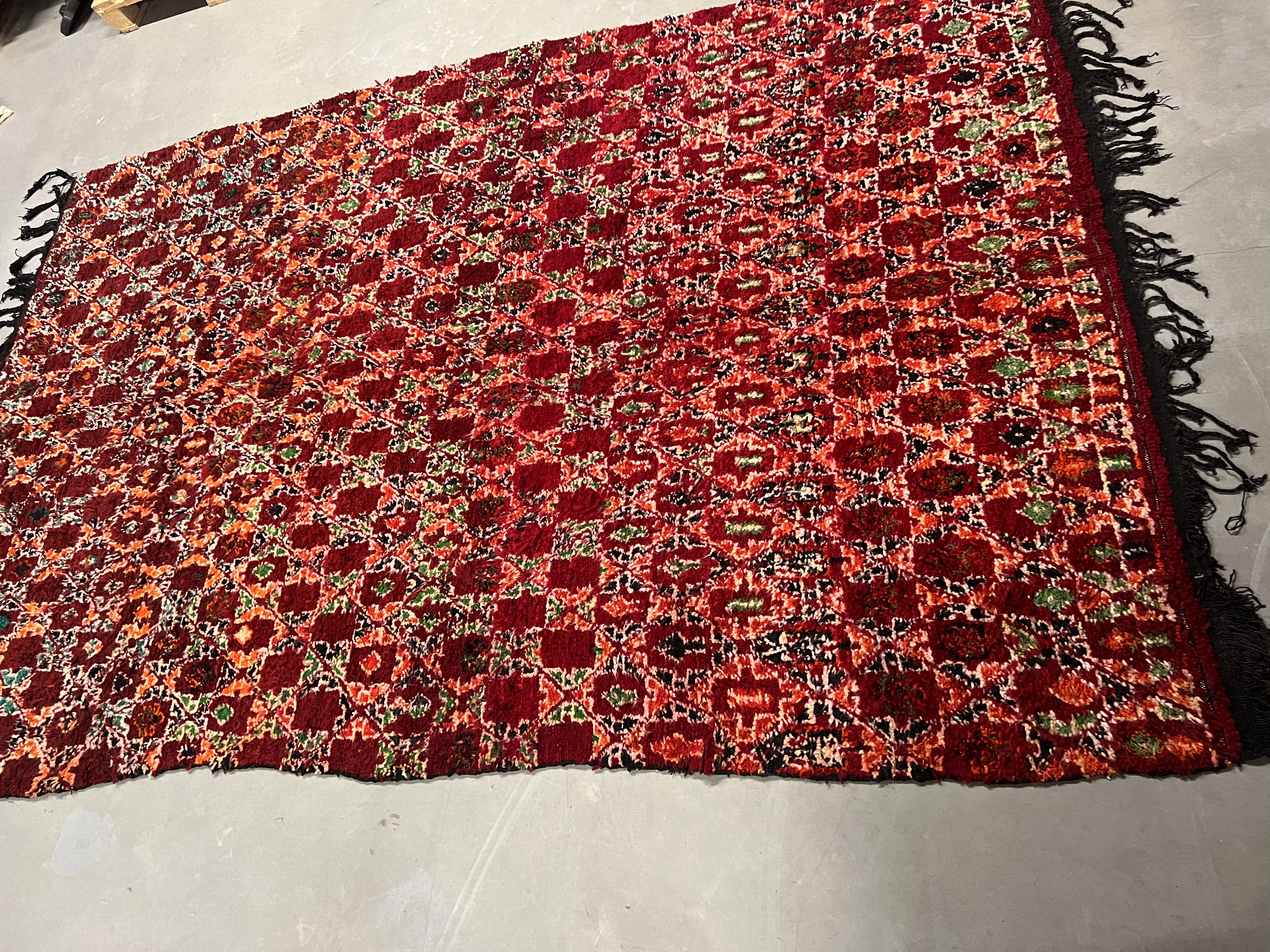 Beni Mguild rugs originate from the western central Middle Atlas region of Morocco, and as with most regions, they have their own style. The weavers in this region like to take the designs commonly found in flat weave rugs, and adapt them to their pile weave, hand knotted creations. This creates bold, flowing imagery that captures the joyous character of the weaver herself.