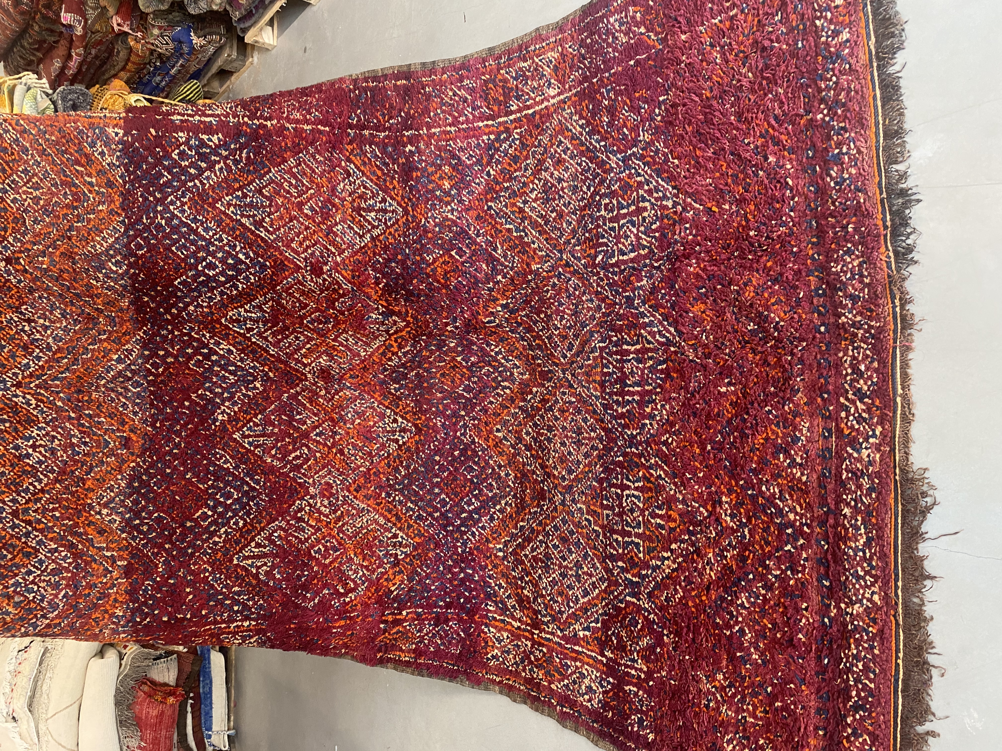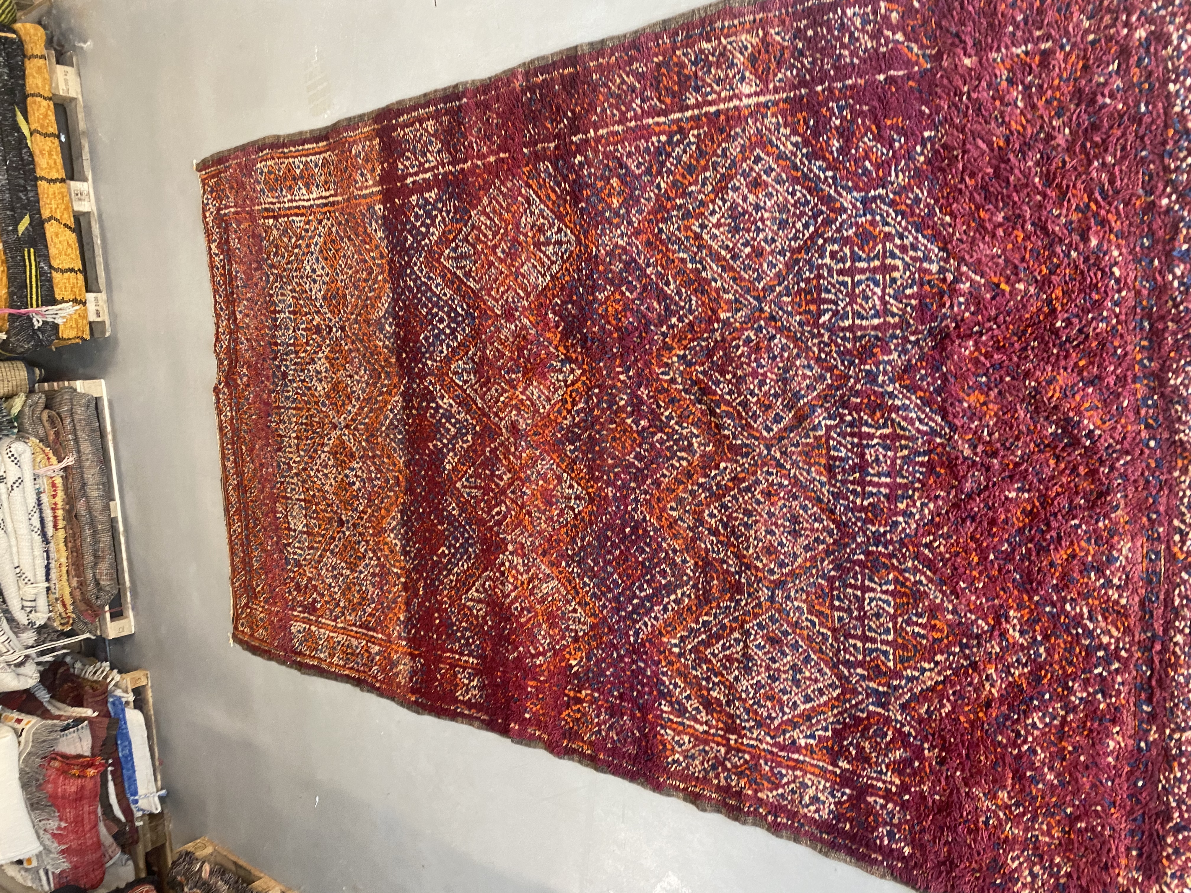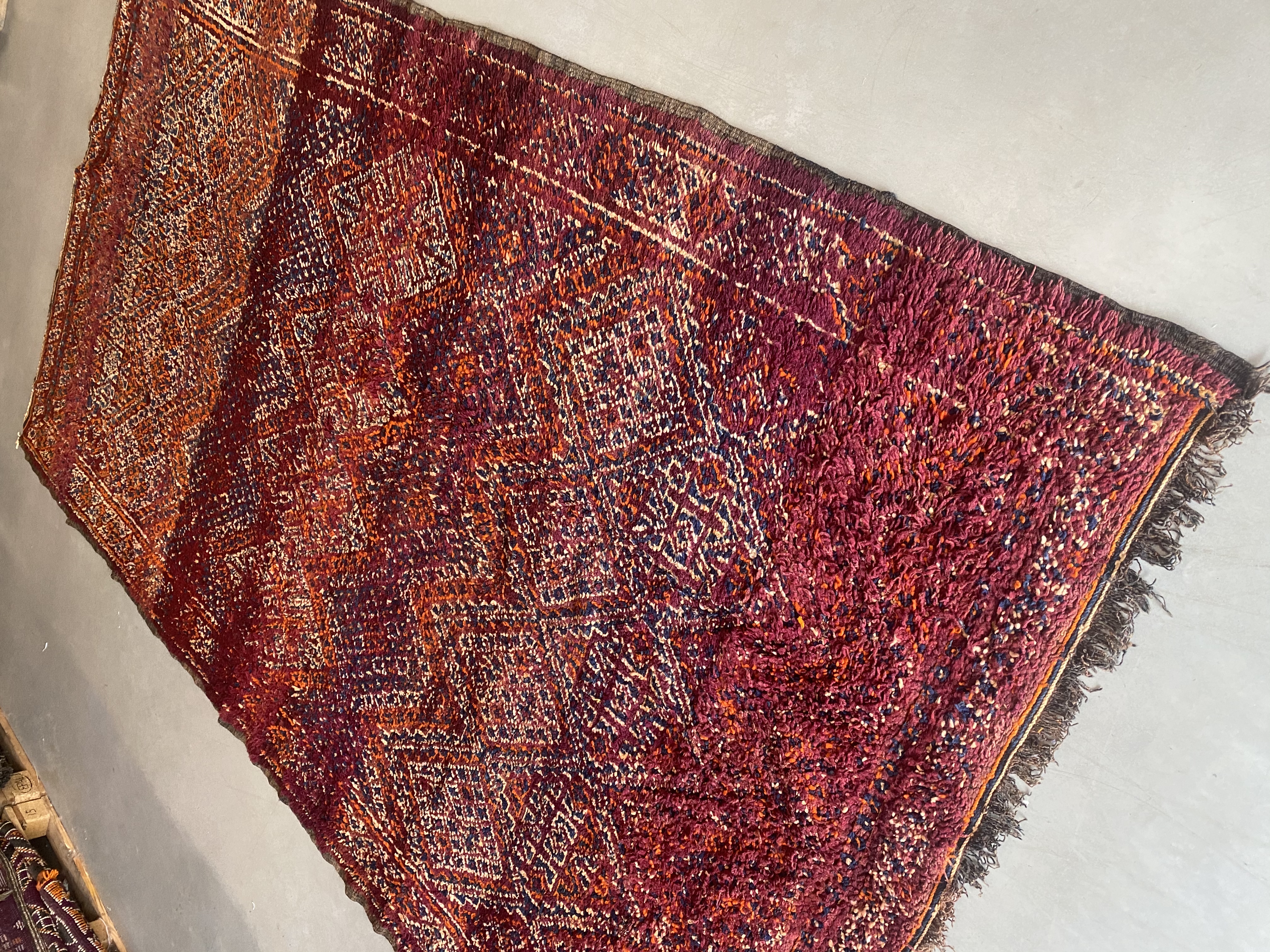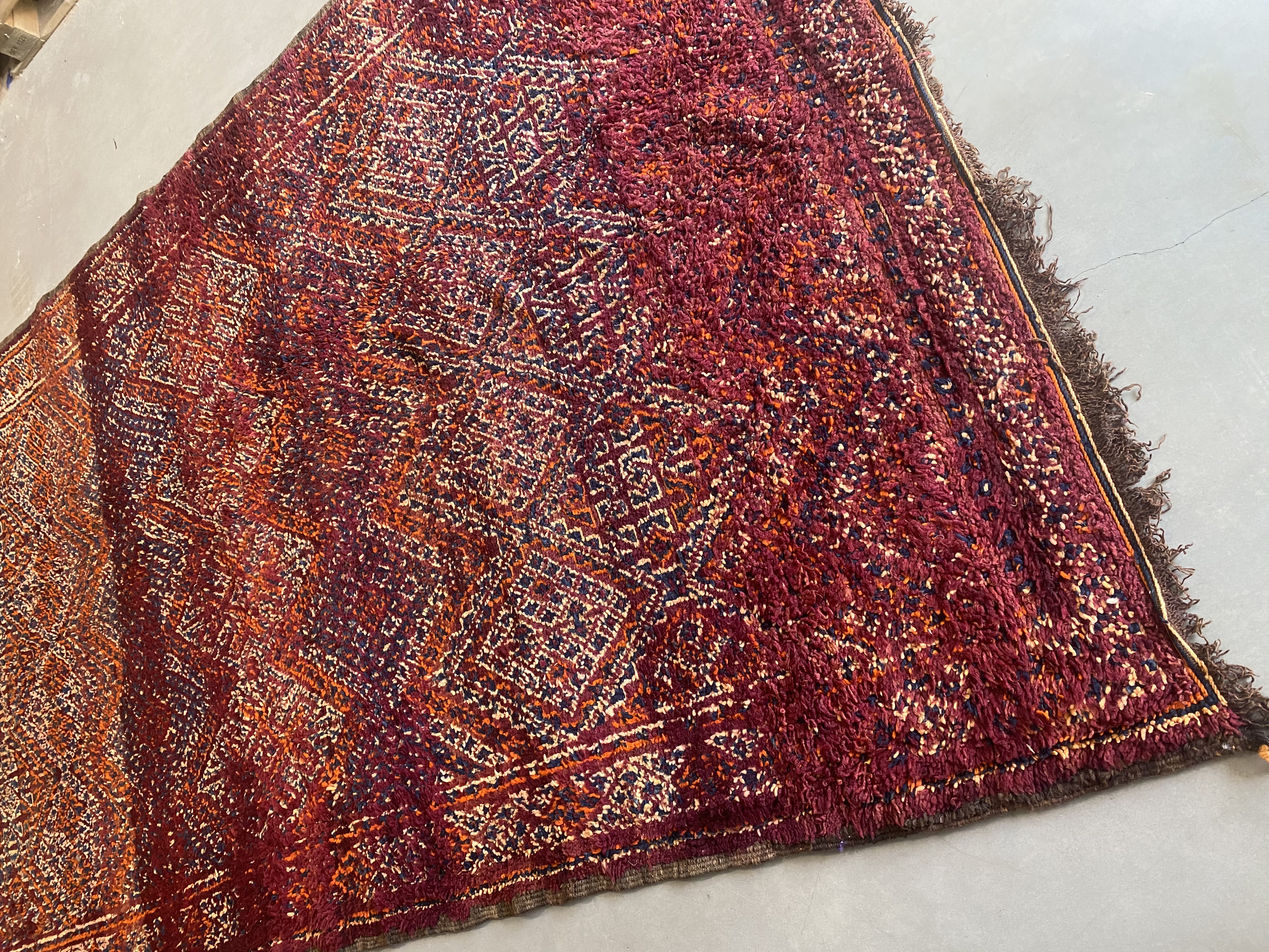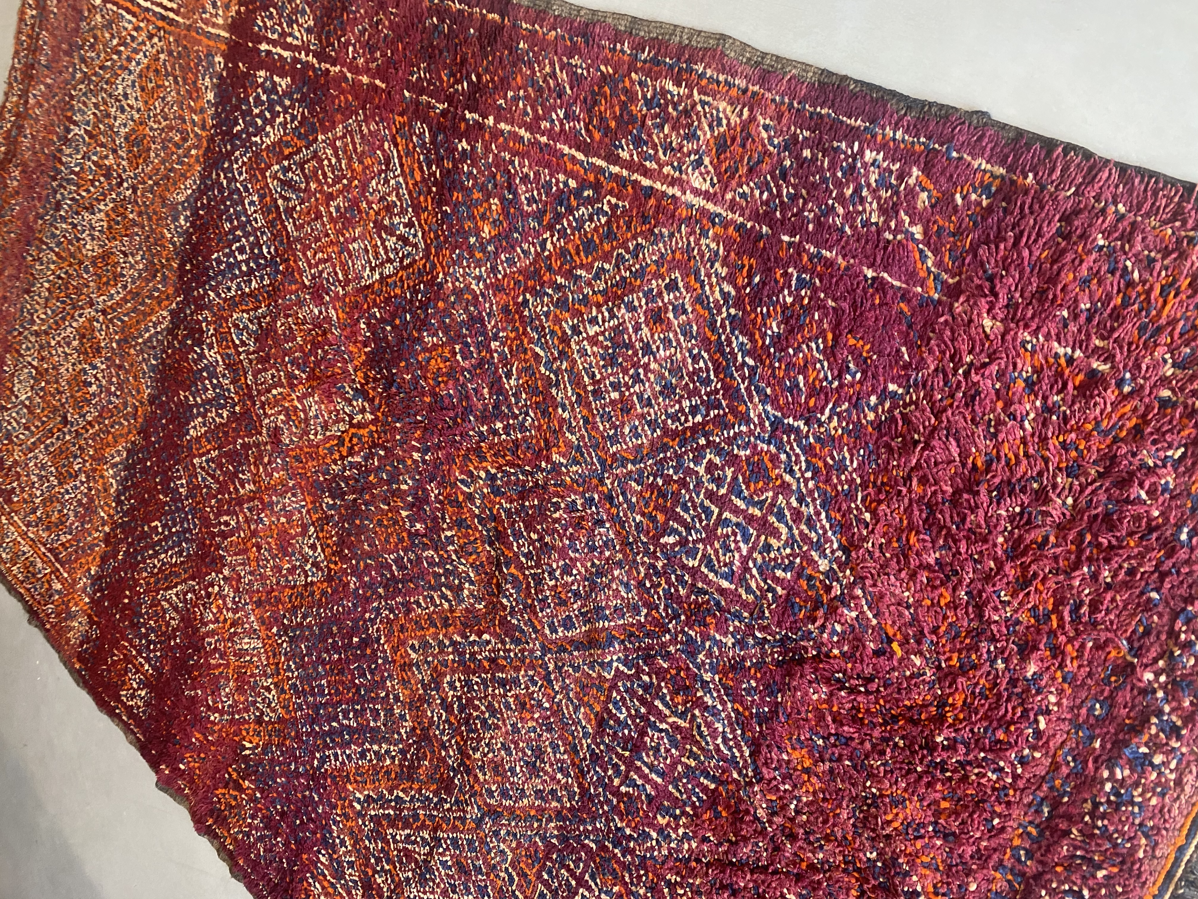 Beni Mguild rugs originate from the western central Middle Atlas region of Morocco, and as with most regions, they have their own style. The weavers in this region like to take the designs commonly found in flat weave rugs, and adapt them to their pile weave, hand knotted creations. This creates bold, flowing imagery that captures the joyous character of the weaver herself.