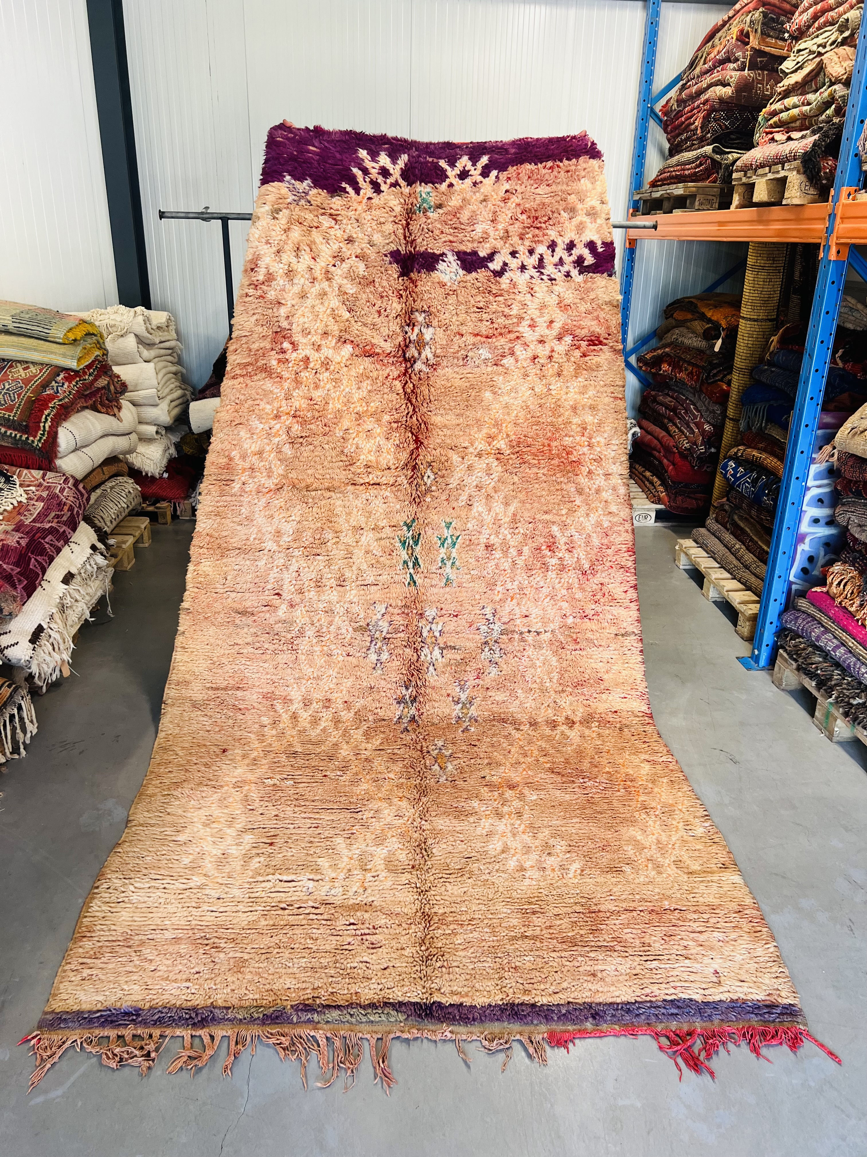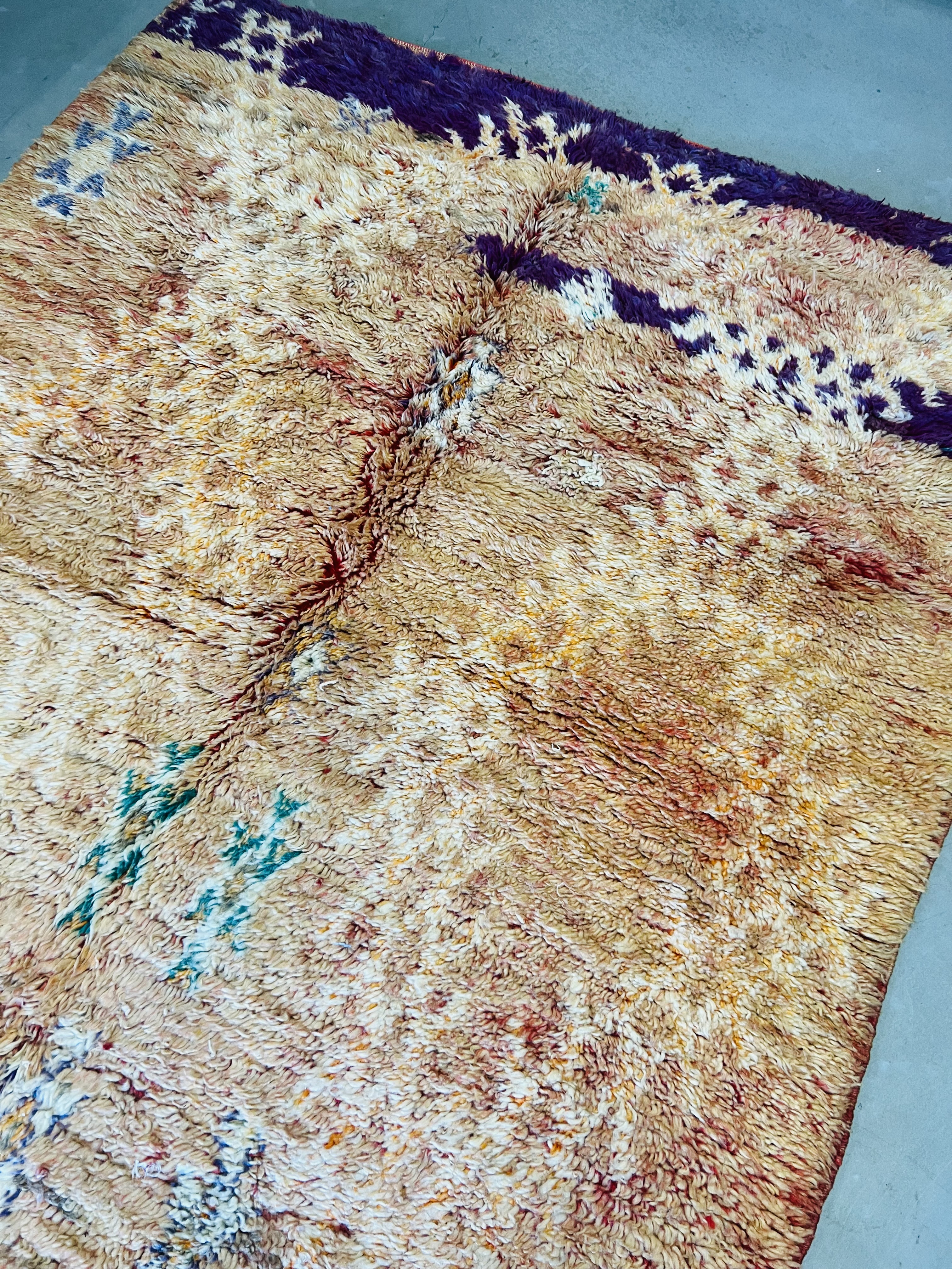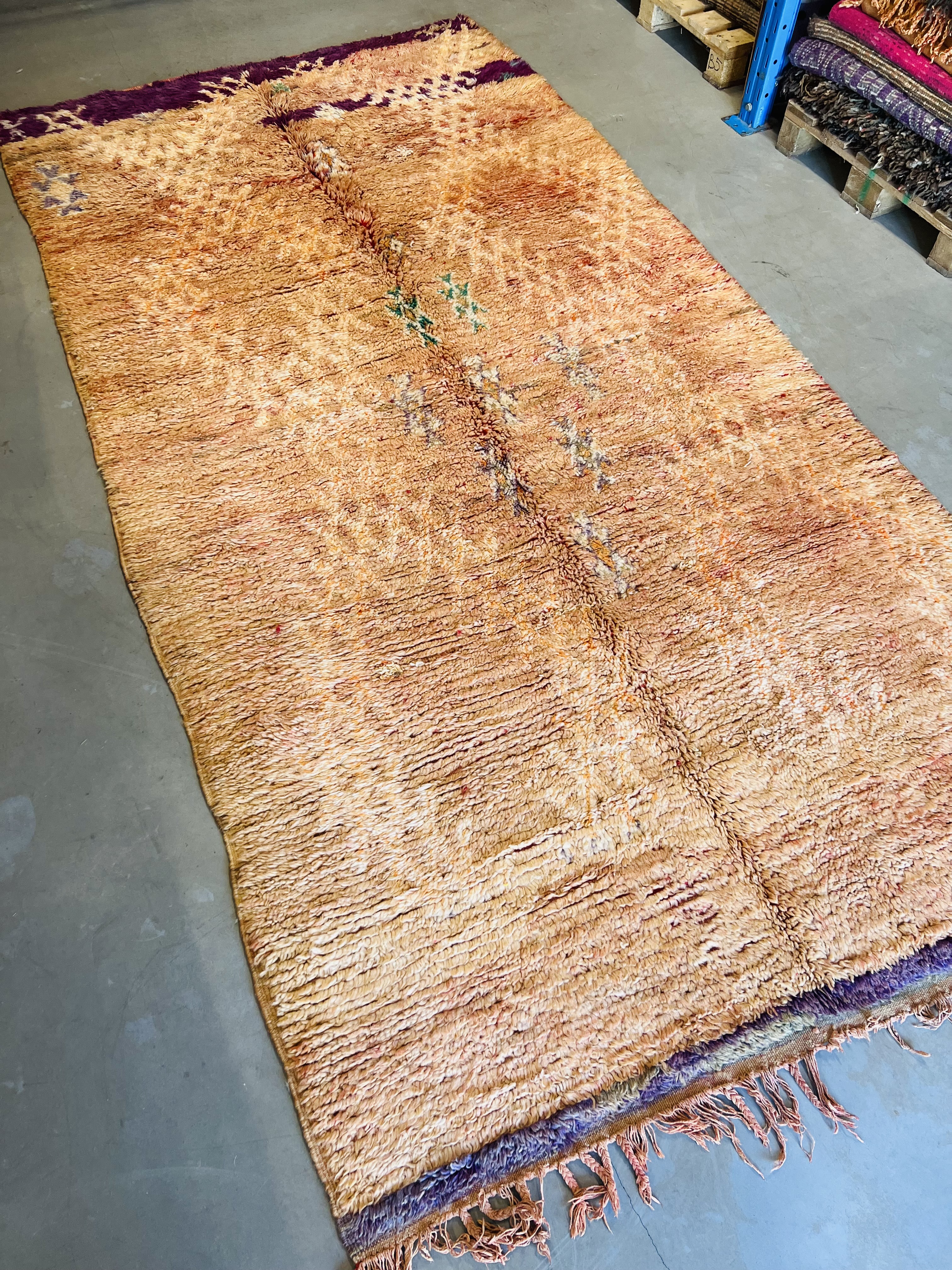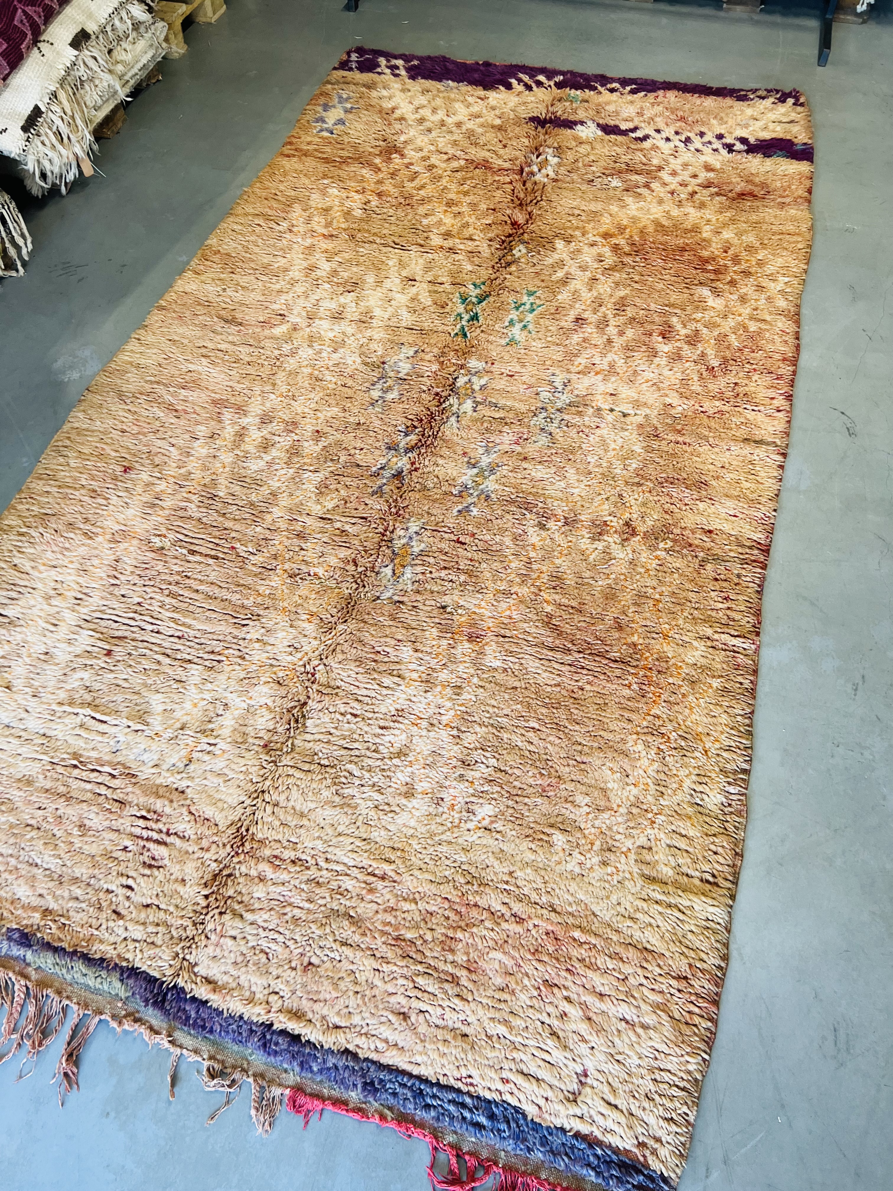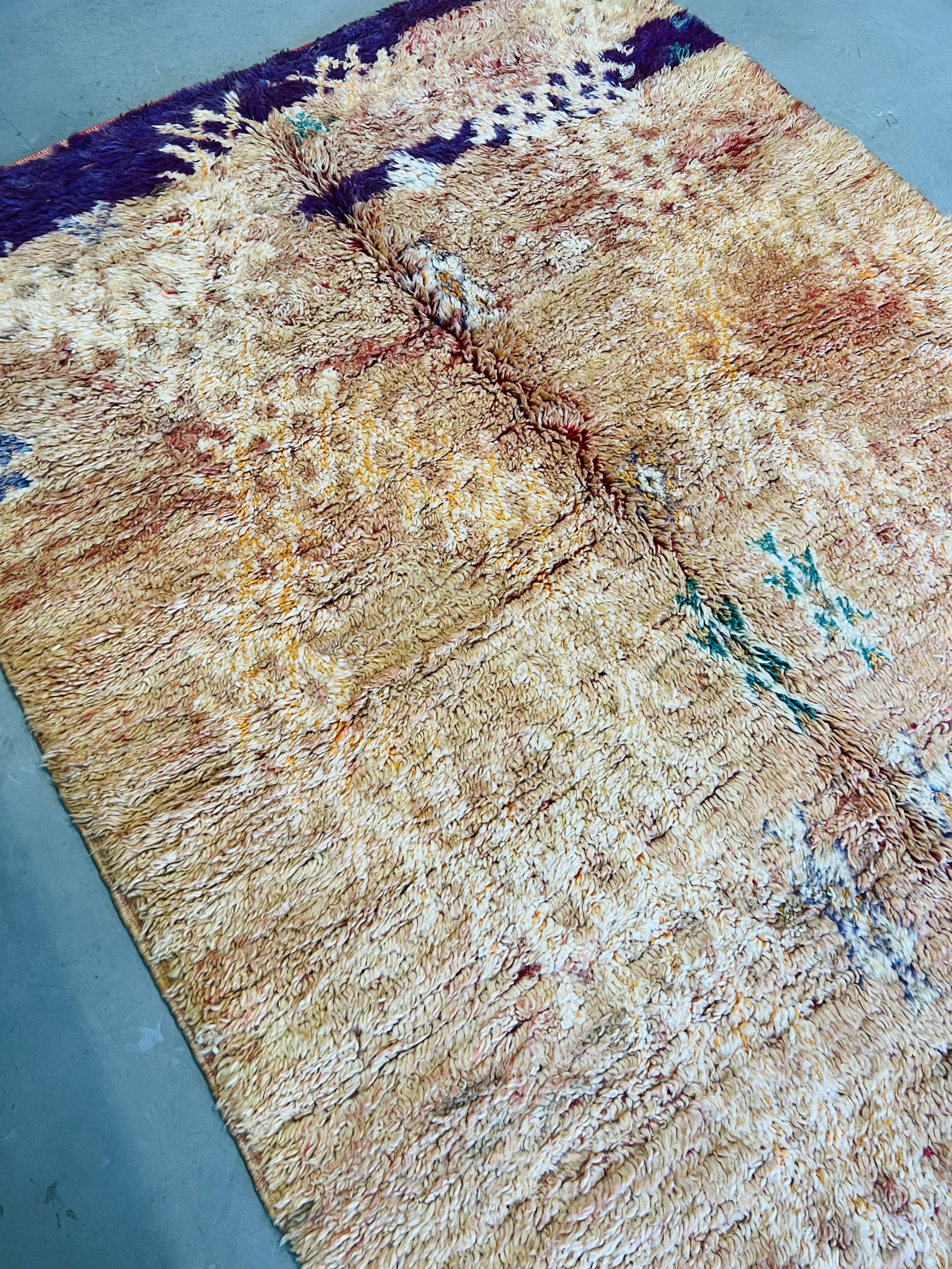 Beni Mguild rugs originate from the western central Middle Atlas region of Morocco, and as with most regions, they have their own style. The weavers in this region like to take the designs commonly found in flat weave rugs, and adapt them to their pile weave, hand knotted creations. This creates bold, flowing imagery that captures the joyous character of the weaver herself.