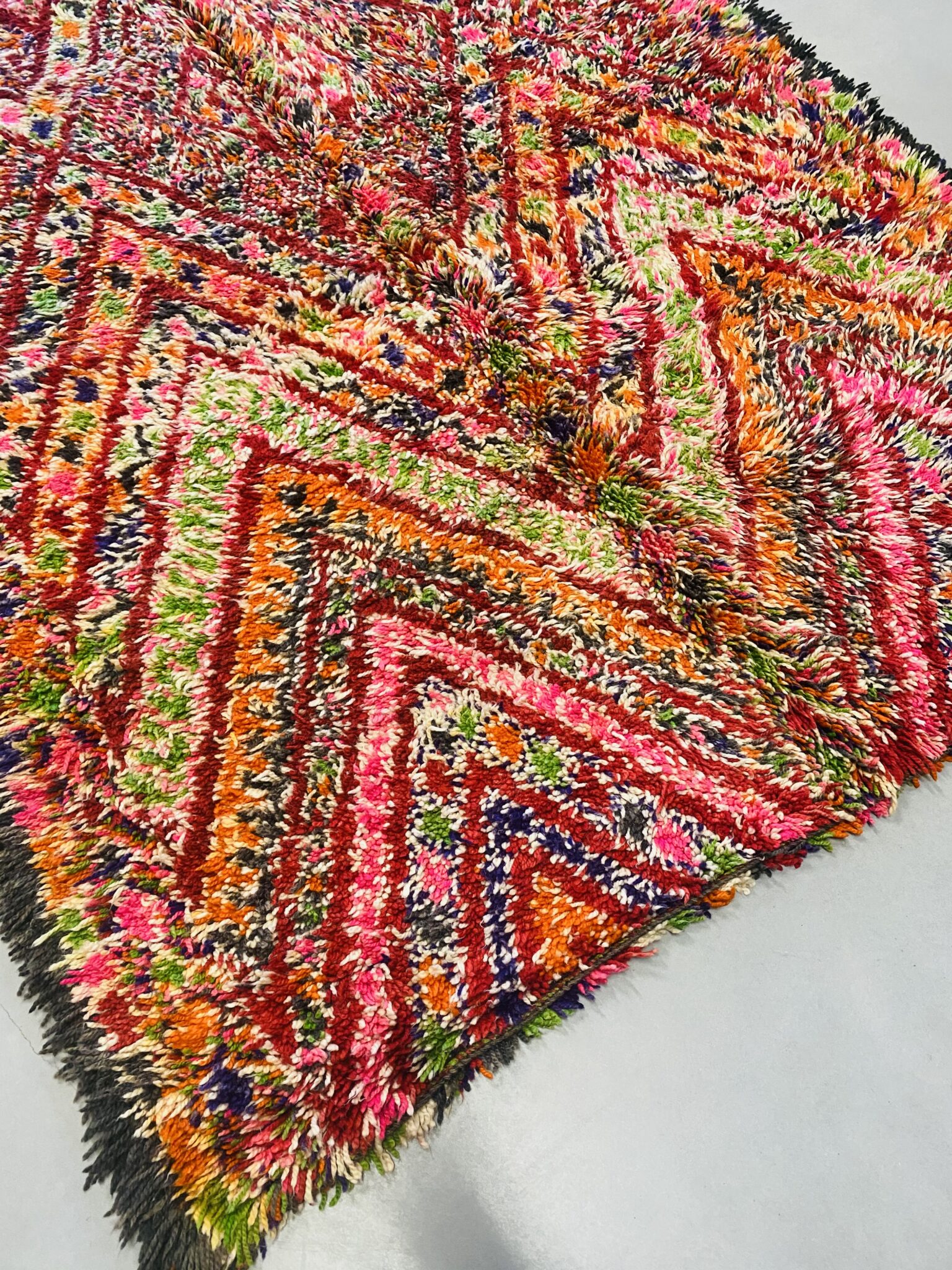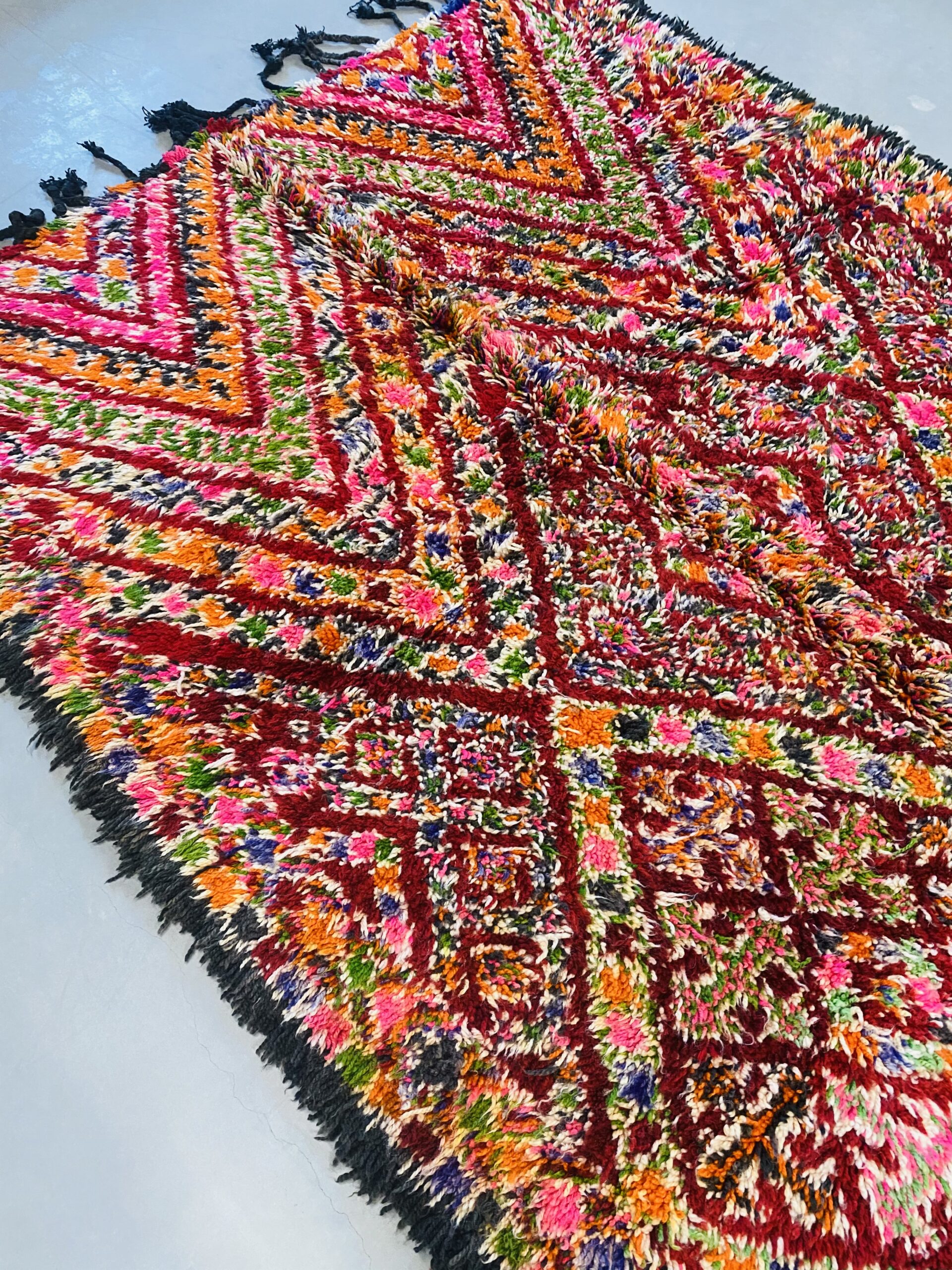 Beni Mguild rugs originate from the western central Middle Atlas region of Morocco, and as with most regions, they have their own style. The weavers in this region like to take the designs commonly found in flat weave rugs, and adapt them to their pile weave, hand knotted creations. This creates bold, flowing imagery that captures the joyous character of the weaver herself.