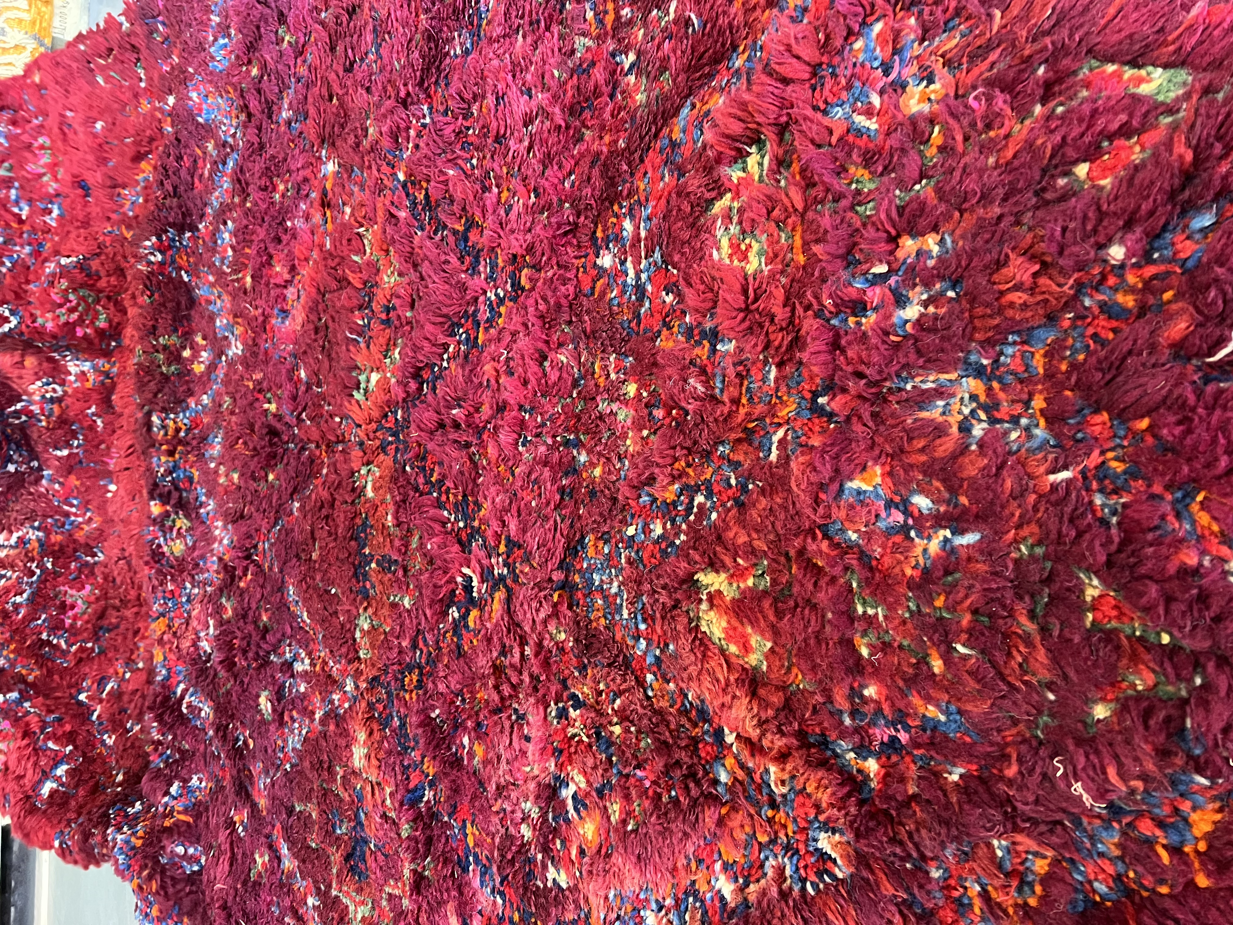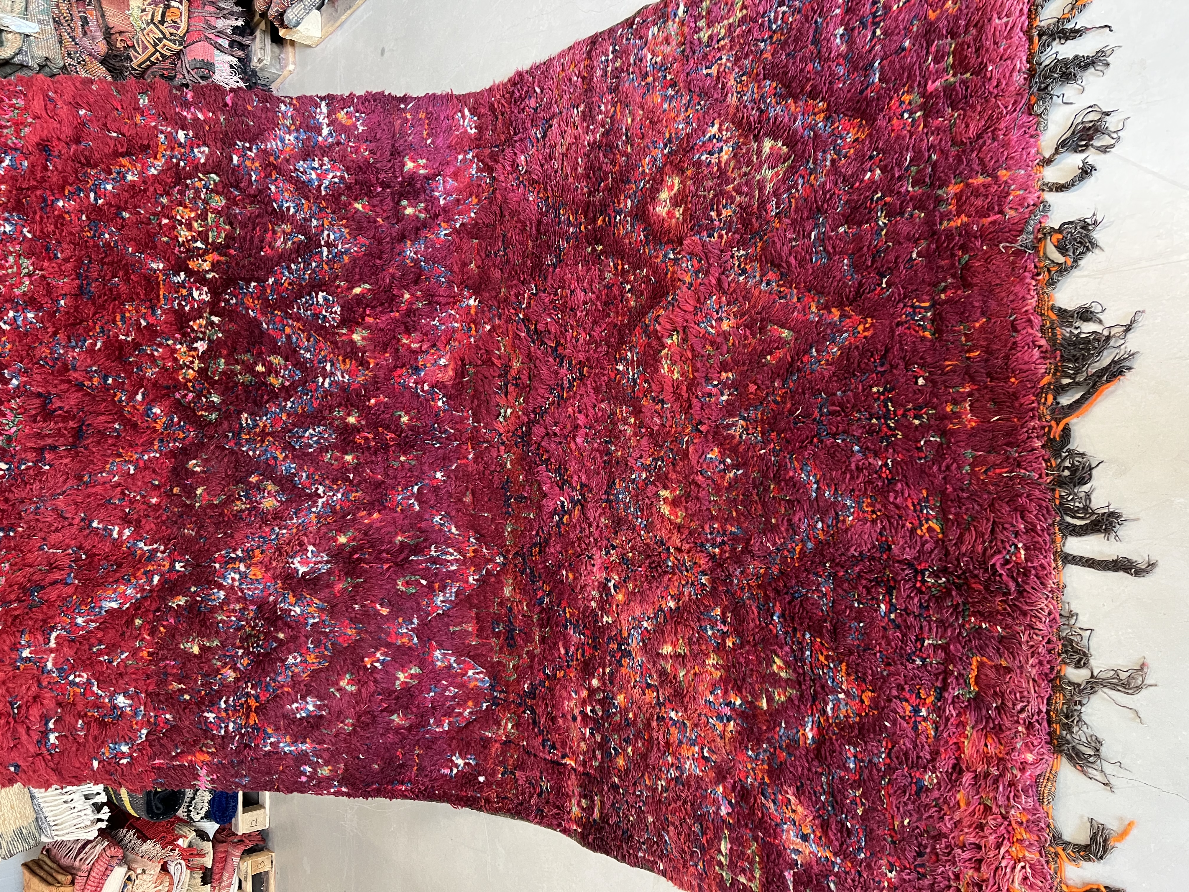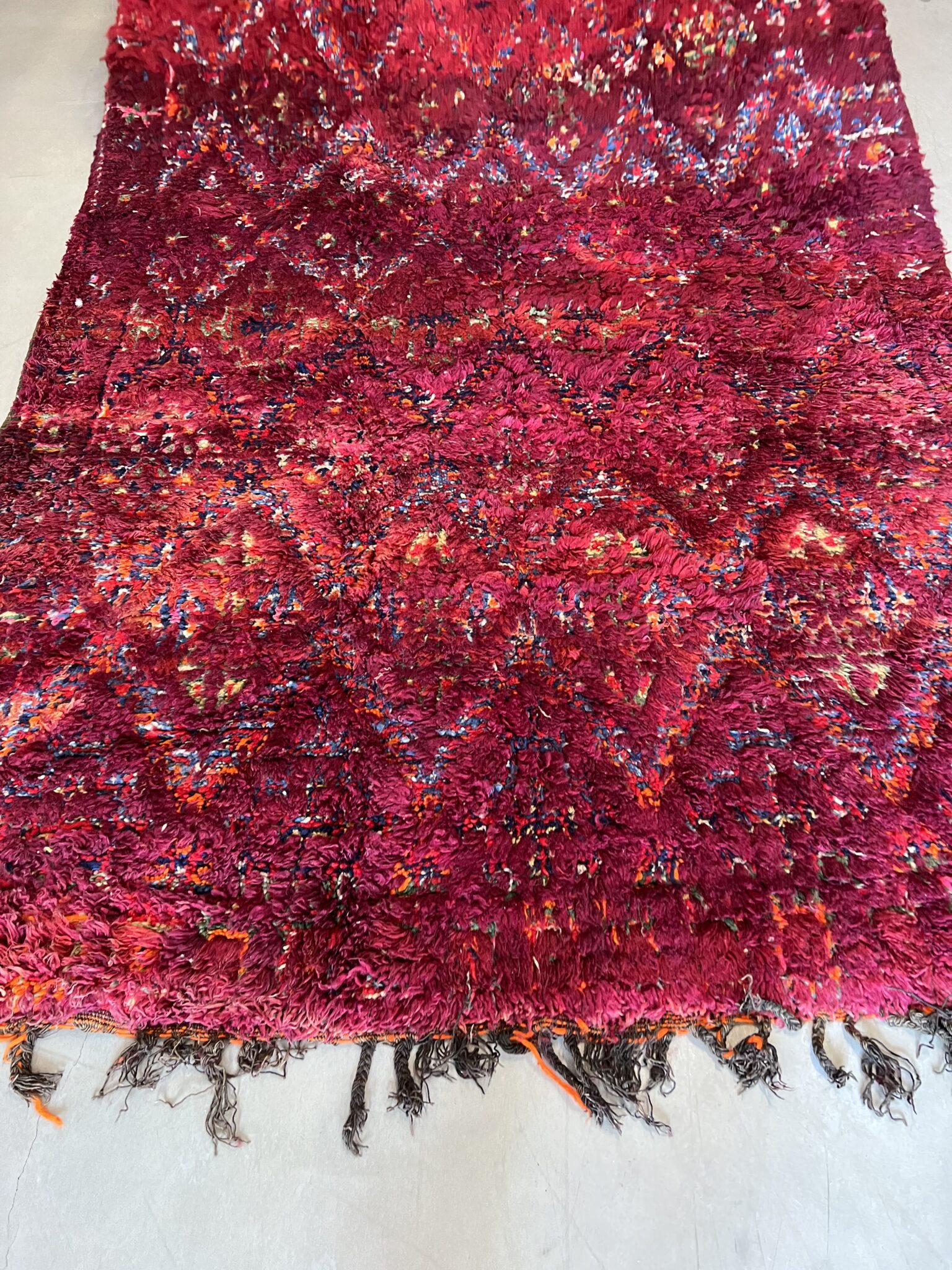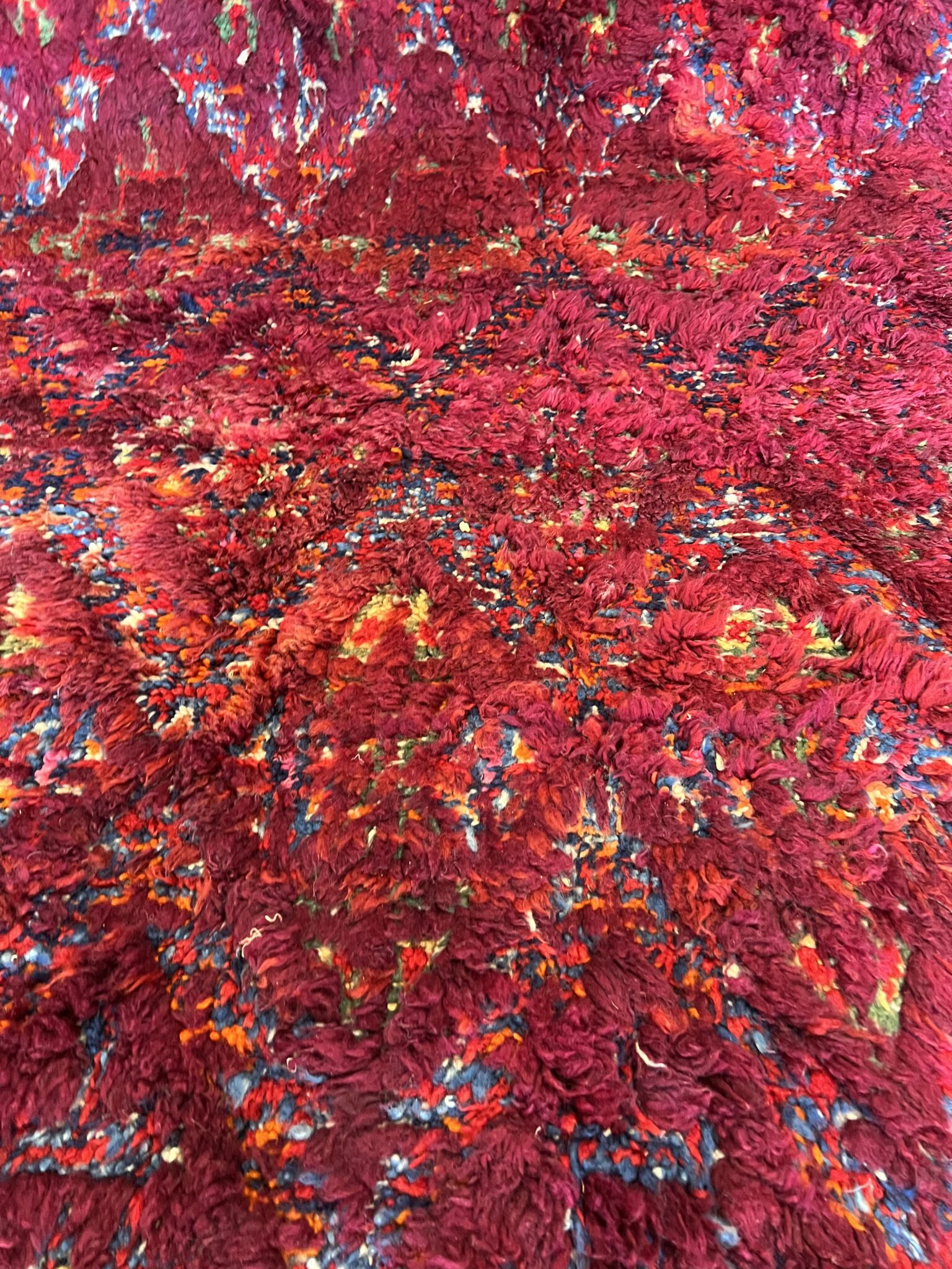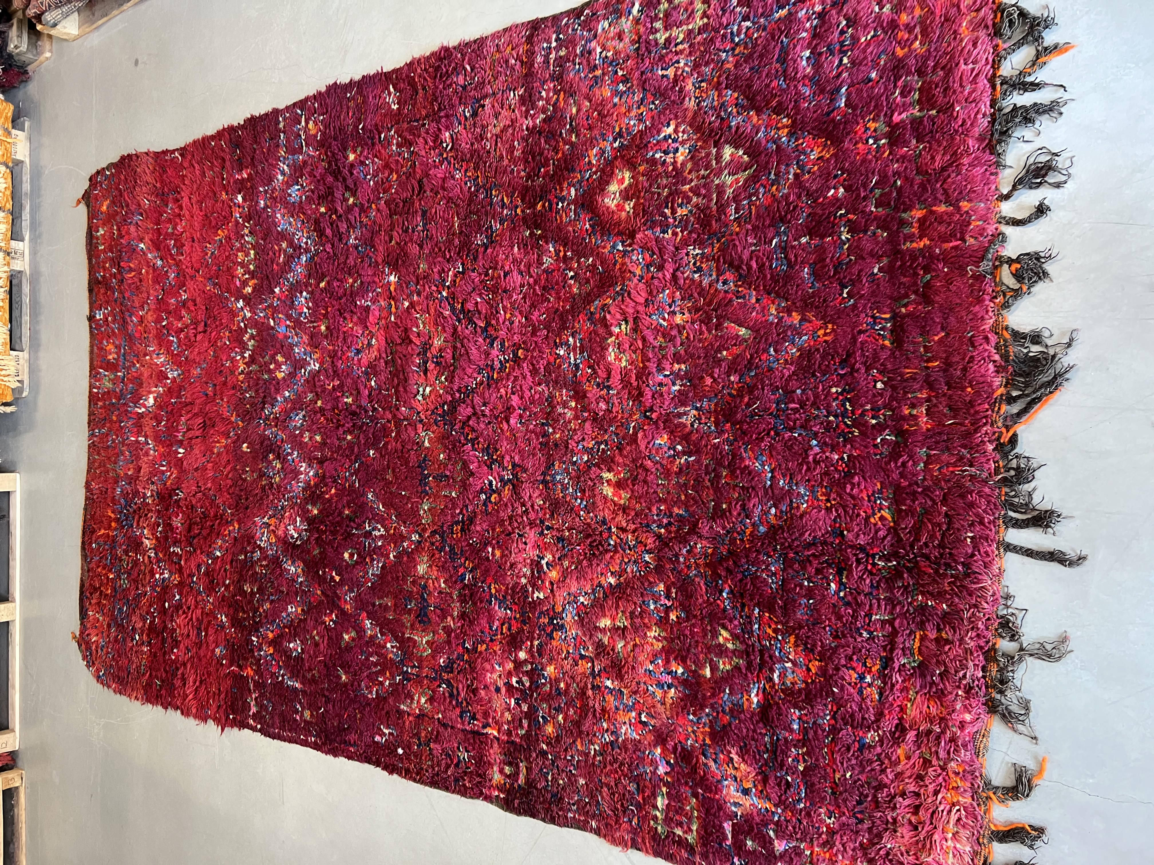 Beni Mguild rugs originate from the western central Middle Atlas region of Morocco, and as with most regions, they have their own style. The weavers in this region like to take the designs commonly found in flat weave rugs, and adapt them to their pile weave, hand knotted creations. This creates bold, flowing imagery that captures the joyous character of the weaver herself.