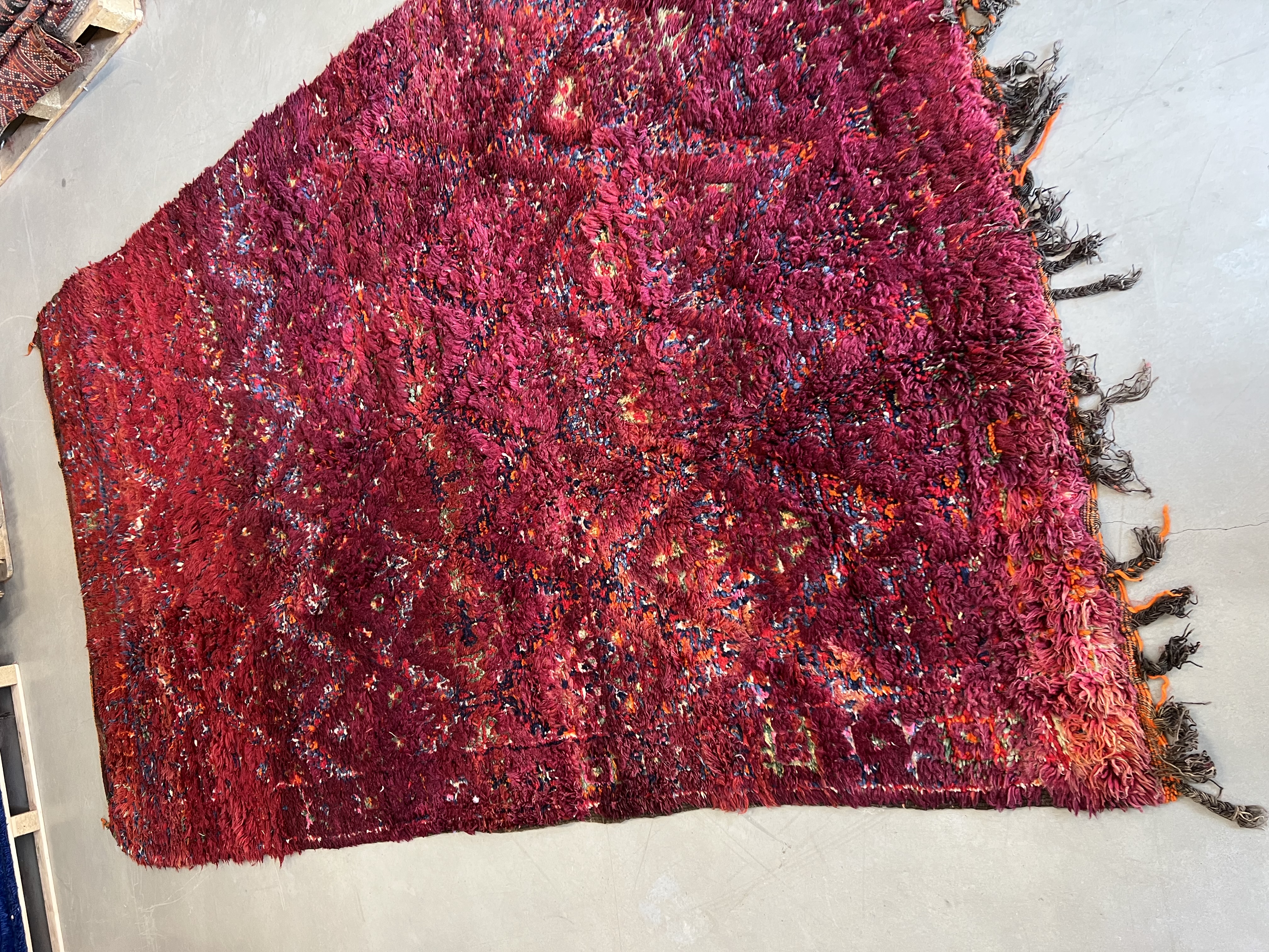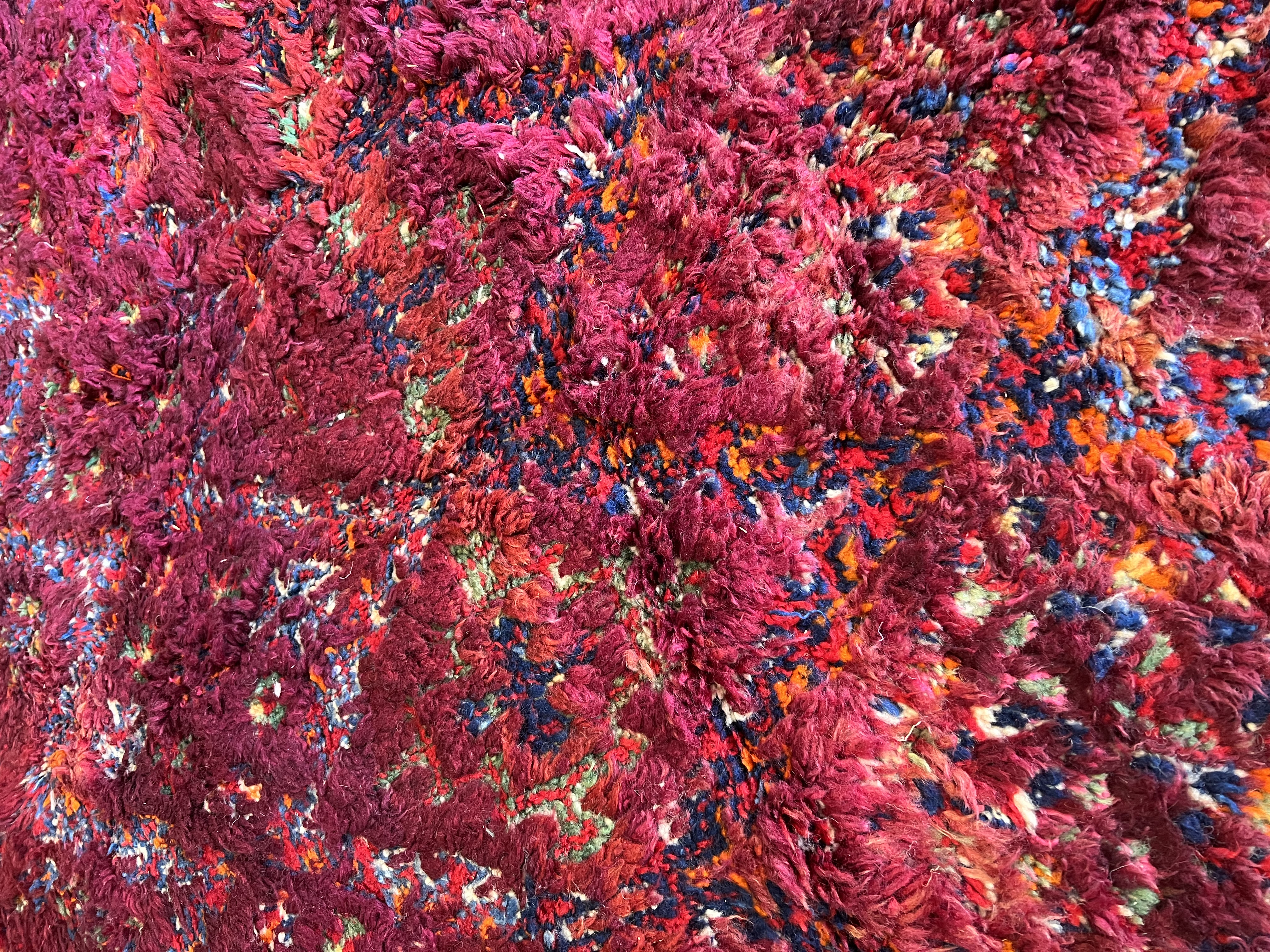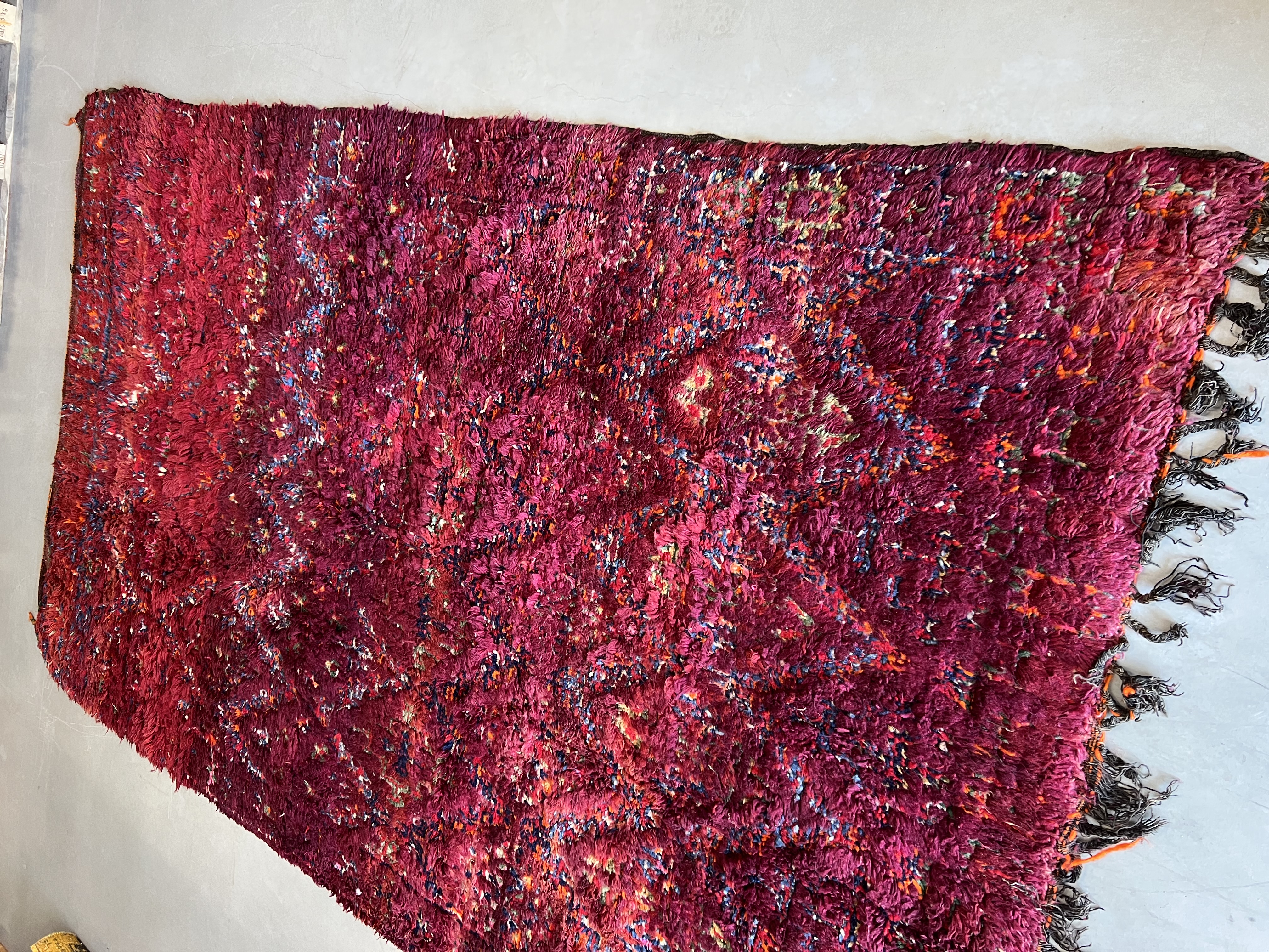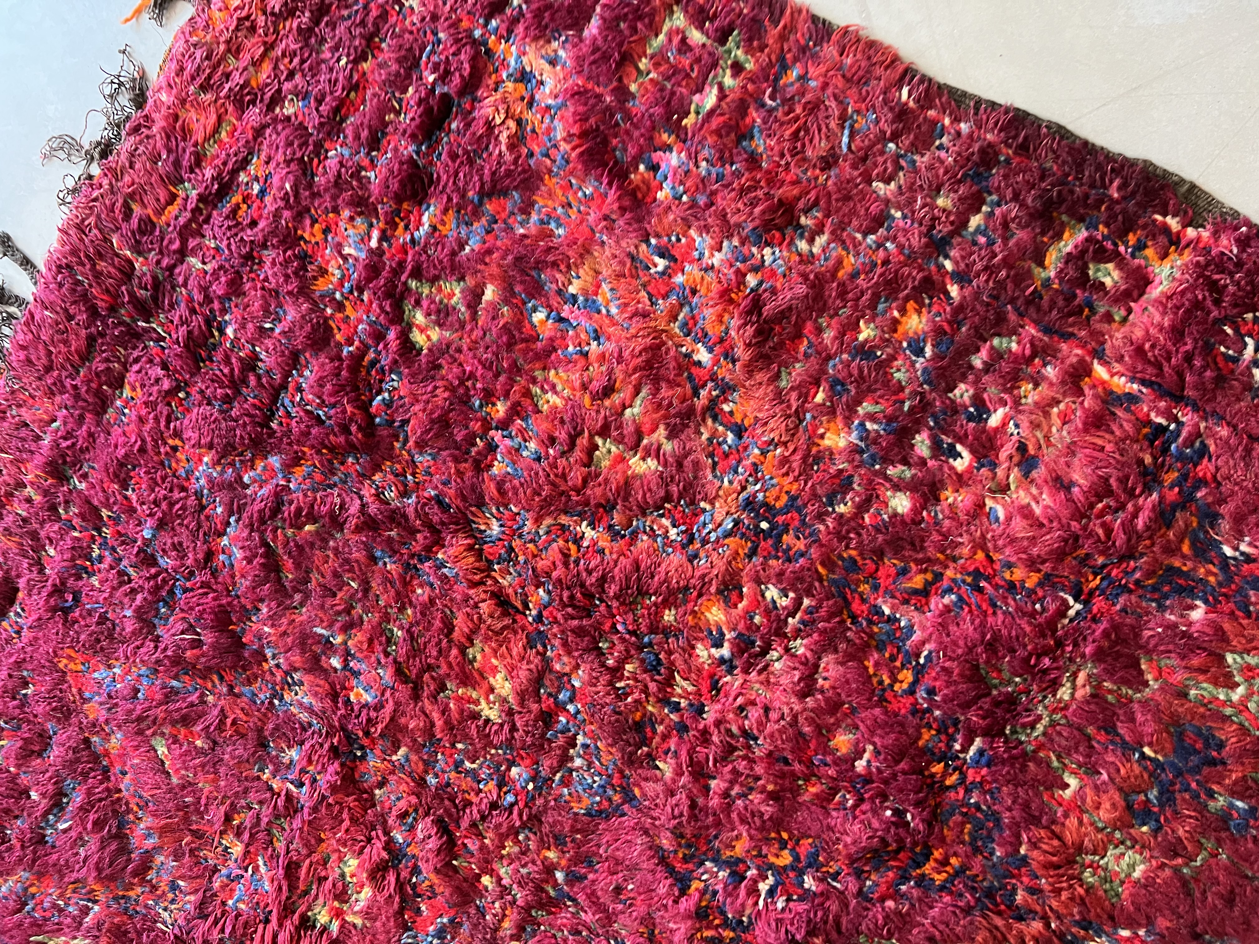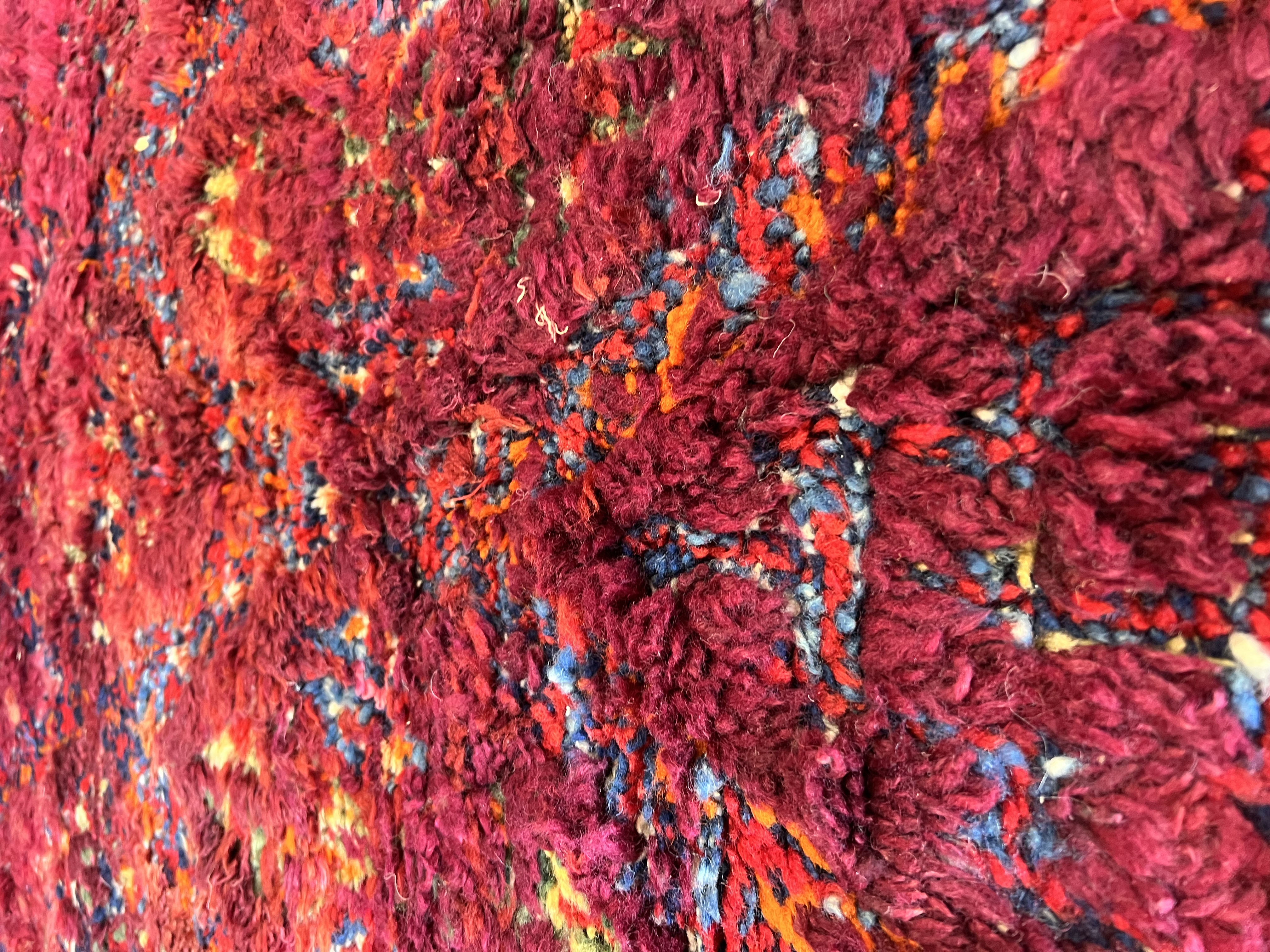 Beni Mguild rugs originate from the western central Middle Atlas region of Morocco, and as with most regions, they have their own style. The weavers in this region like to take the designs commonly found in flat weave rugs, and adapt them to their pile weave, hand knotted creations. This creates bold, flowing imagery that captures the joyous character of the weaver herself.