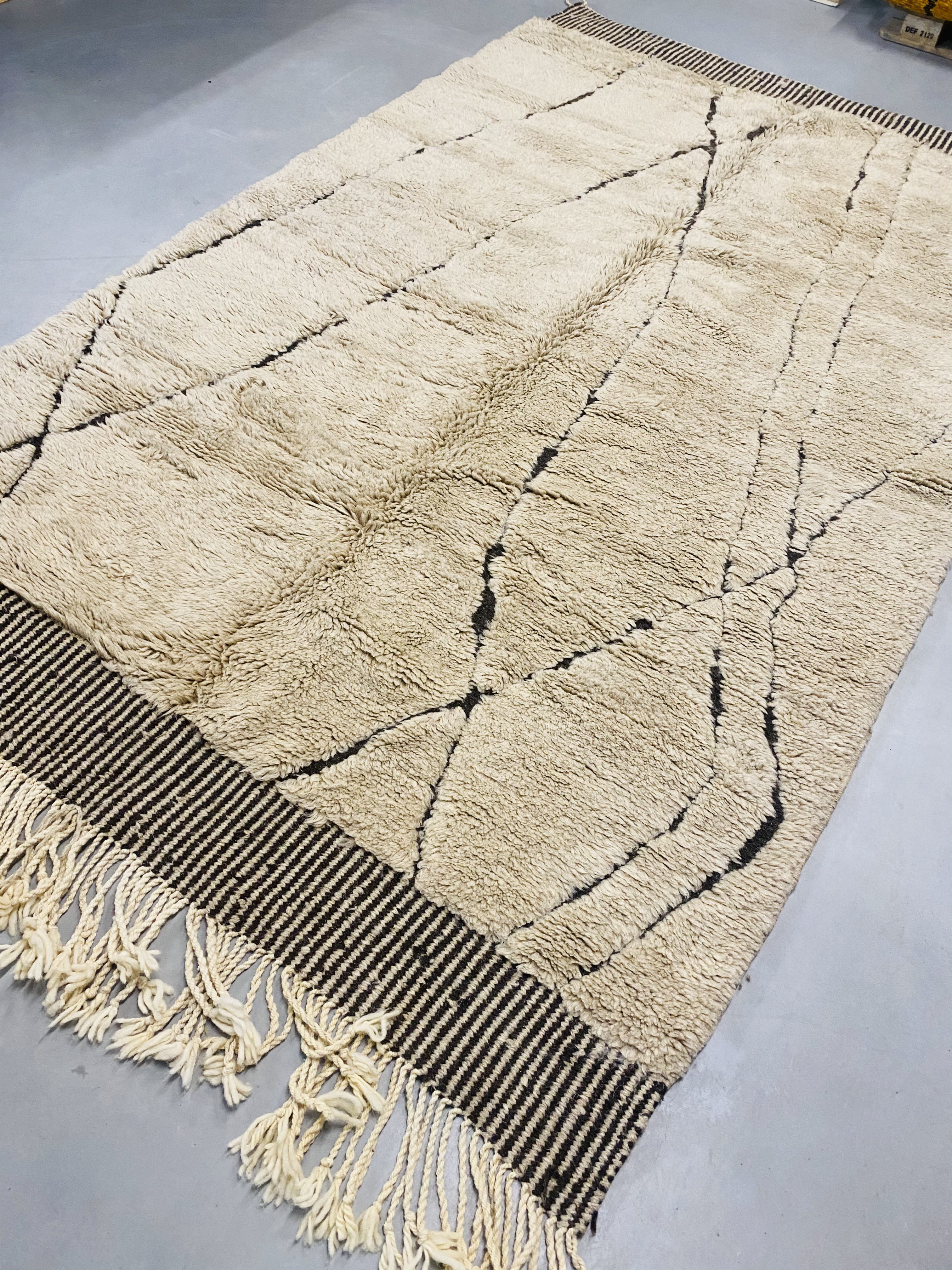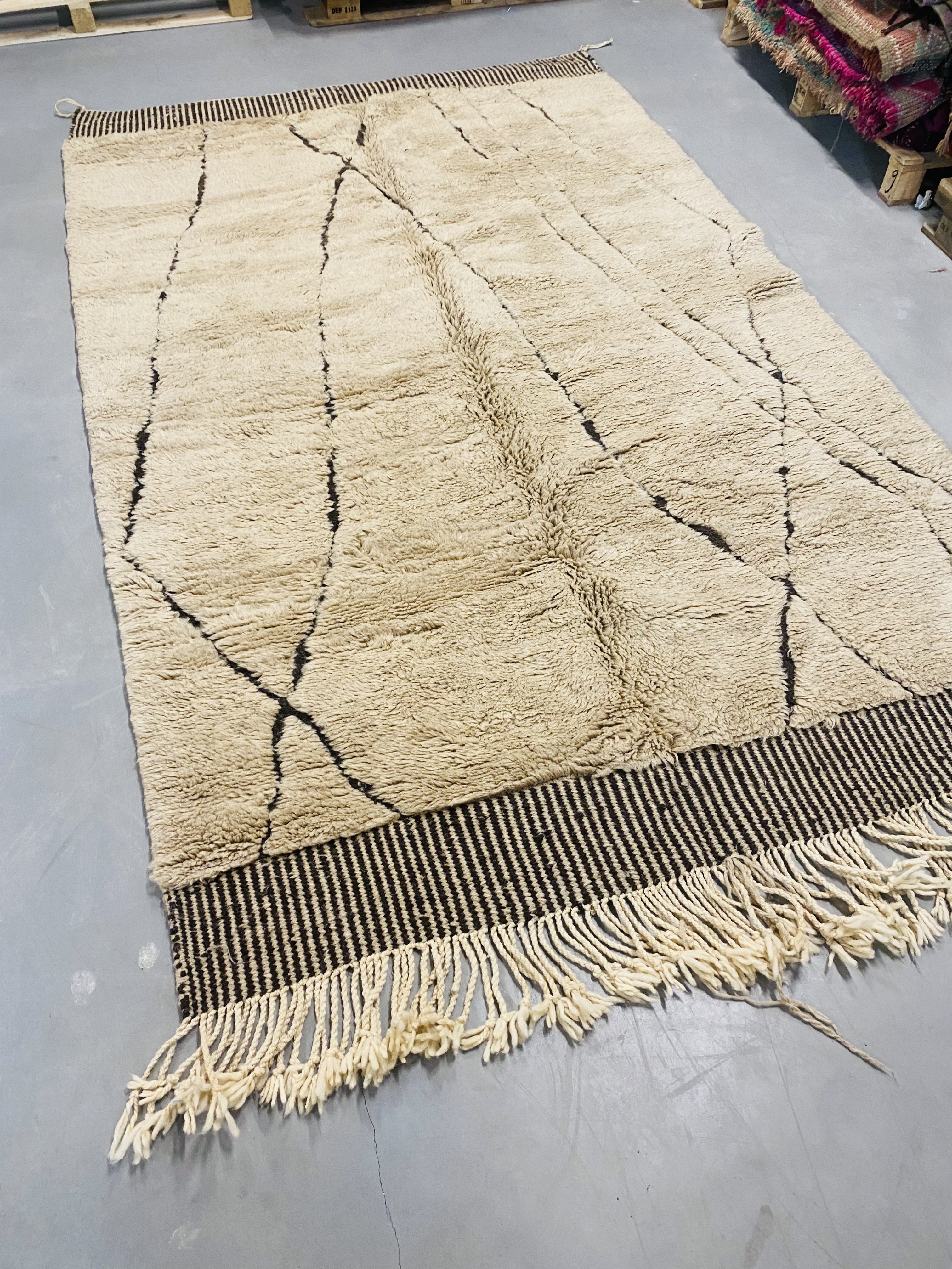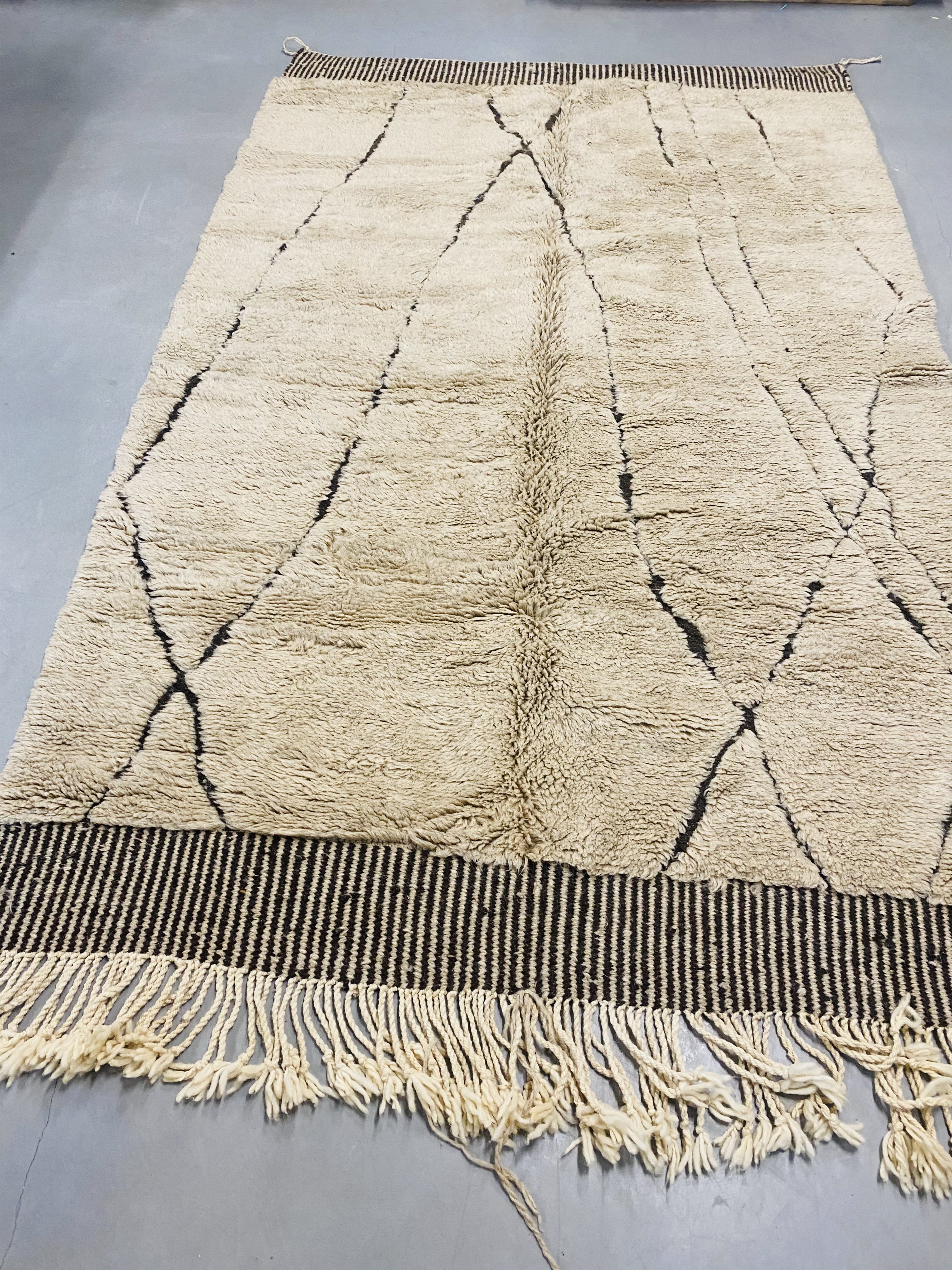 Beni Ourain is a group of 17 Berber tribes that traditionally inhabits the Atlas Mountains of Morocco. Our Beni Ourain rugs possess a spirit and a character, a real berber rug straight from the Atlas. It is a reflection of the daily life of the women that make it. Most of our vintage Beni rugs are cream(ivory) in color, although differences in the tone are found depending on the sheep’s color. They are considered to be the most prestigious rugs in Morocco, made from the very finest wool.