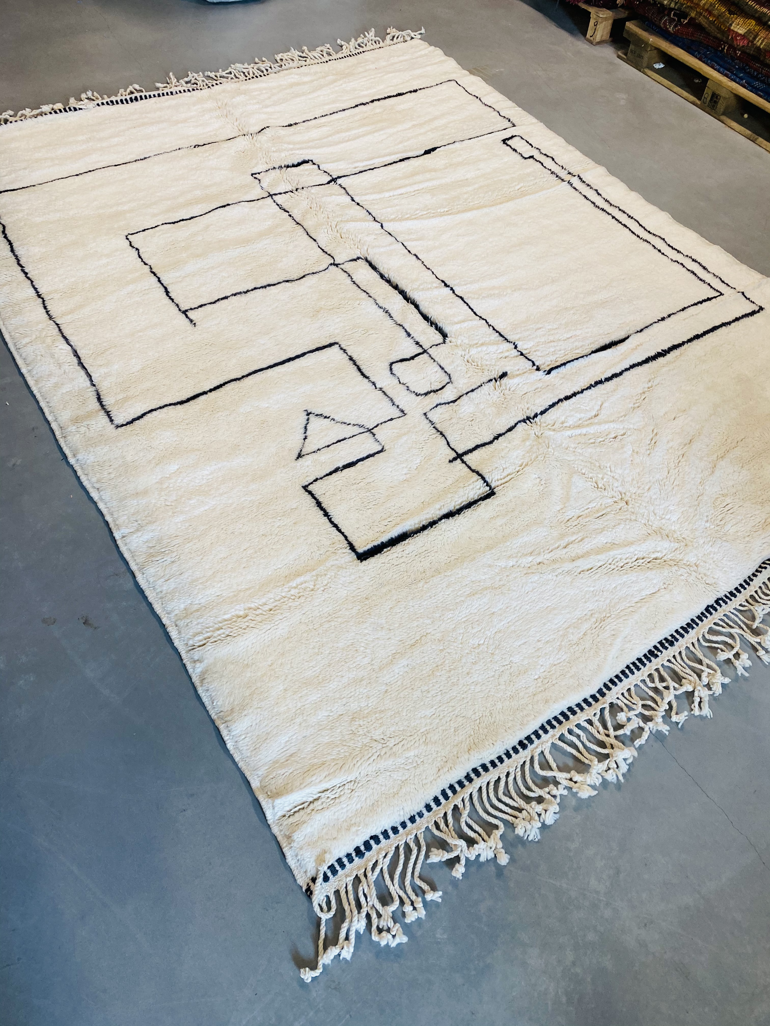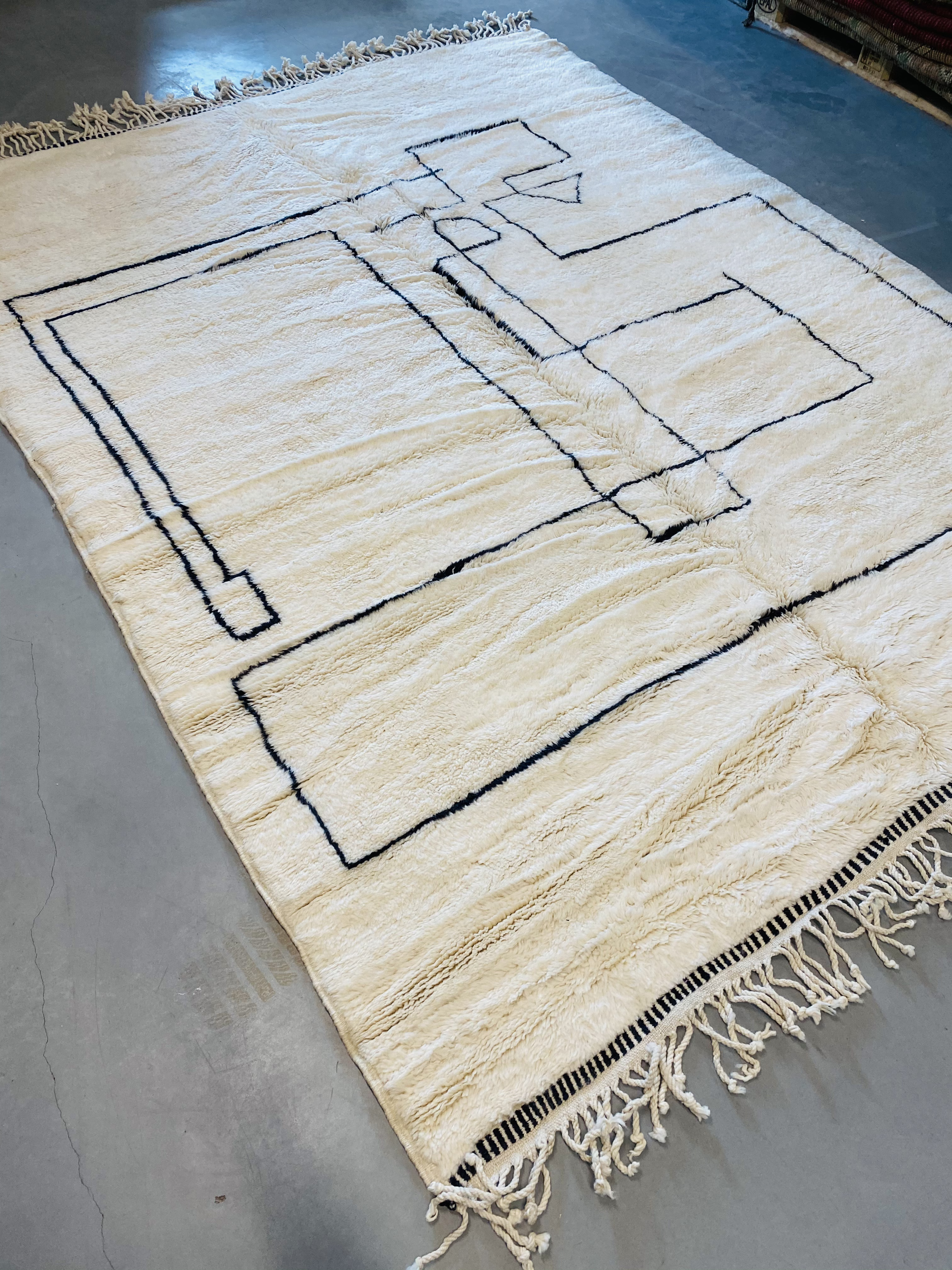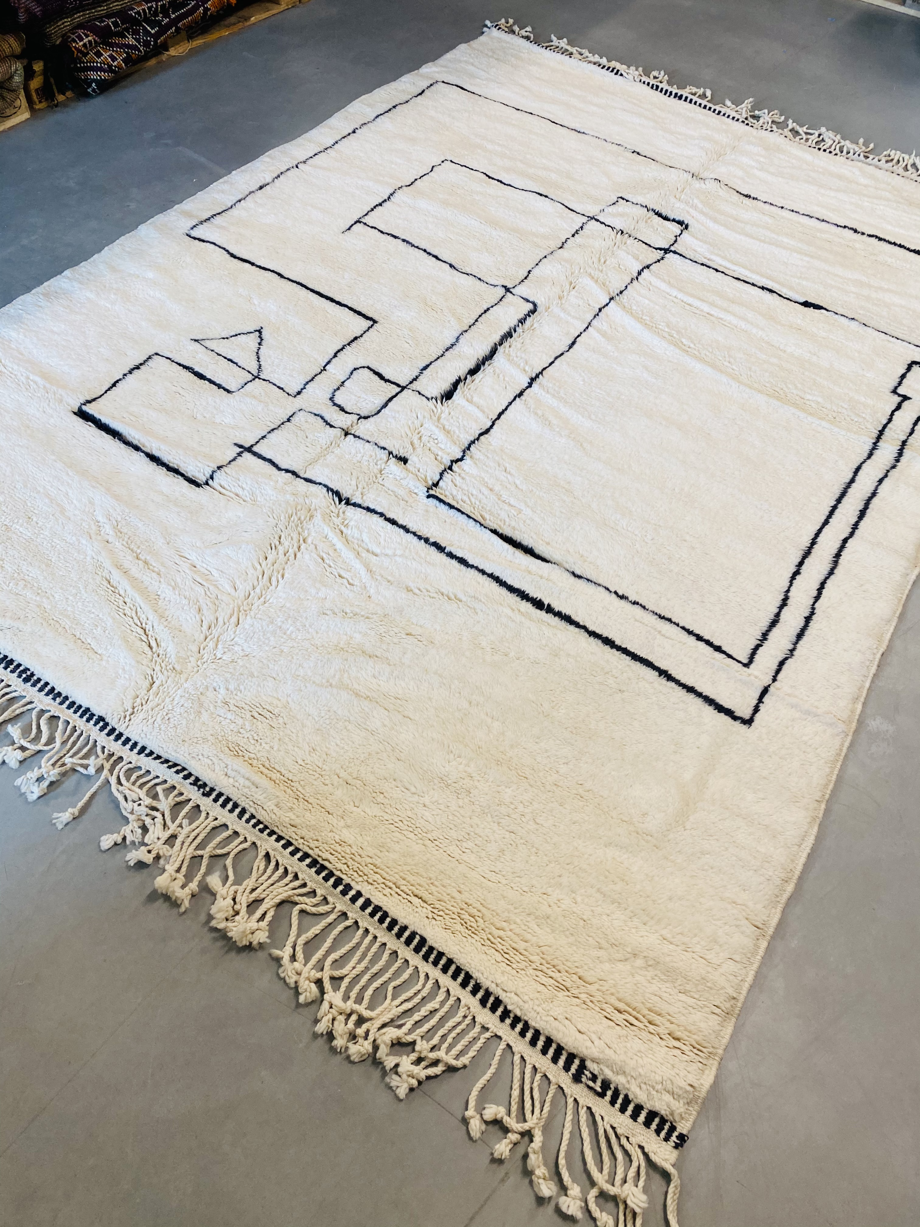 Beni Ourain is a group of 17 Berber tribes that traditionally inhabits the Atlas Mountains of Morocco. Our Beni Ourain rugs possess a spirit and a character, a real berber rug straight from the Atlas. It is a reflection of the daily life of the women that make it. Most of our vintage Beni rugs are cream(ivory) in color, although differences in the tone are found depending on the sheep’s color. They are considered to be the most prestigious rugs in Morocco, made from the very finest wool.