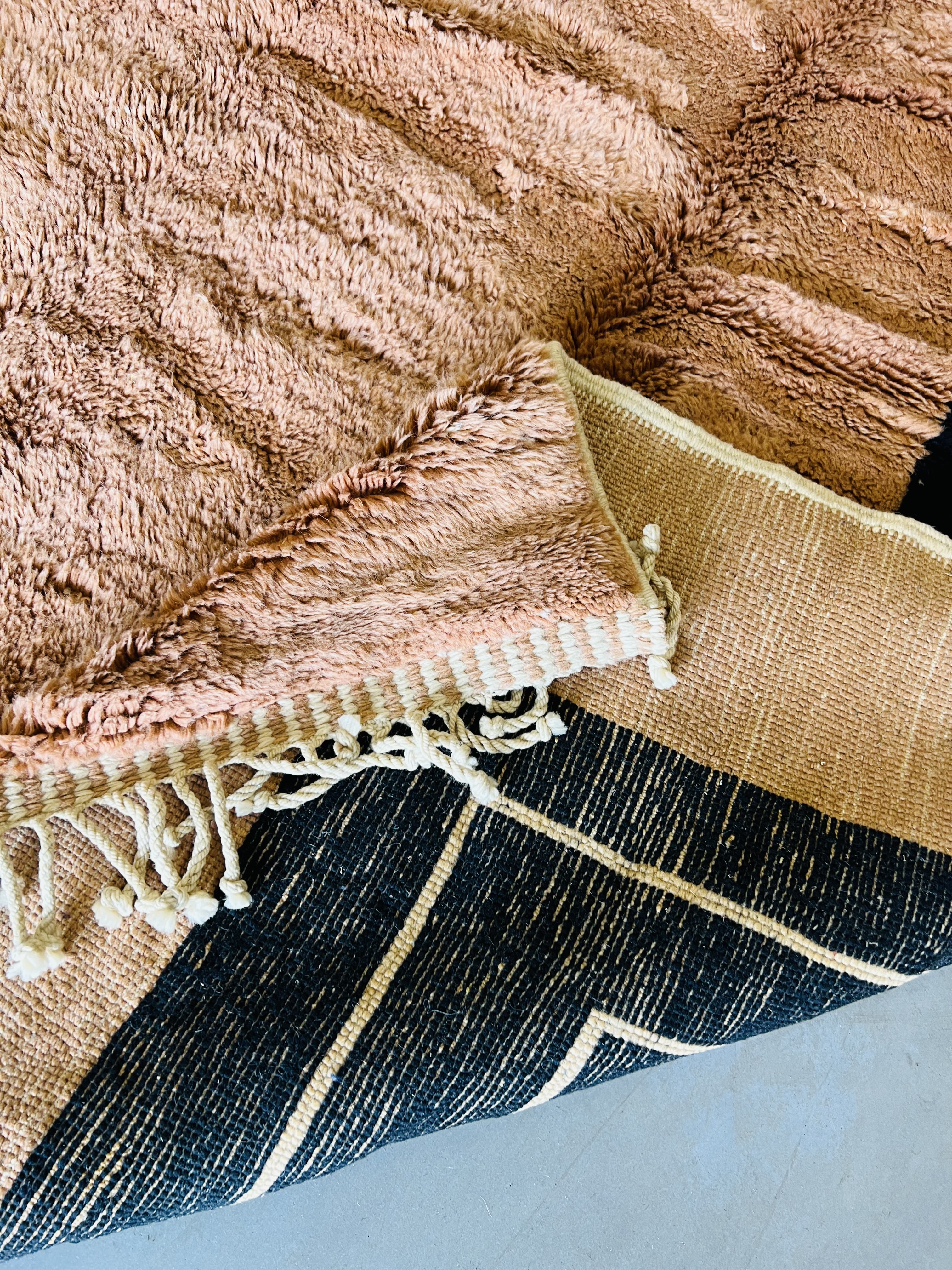Beni Ourain is a group of 17 Berber tribes that traditionally inhabits the Atlas Mountains of Morocco. Our Beni Ourain rugs possess a spirit and a character, a real berber rug straight from the Atlas. It is a reflection of the daily life of the women that make it. Most of our vintage Beni rugs are cream(ivory) in color, although differences in the tone are found depending on the sheep’s color. They are considered to be the most prestigious rugs in Morocco, made from the very finest wool.