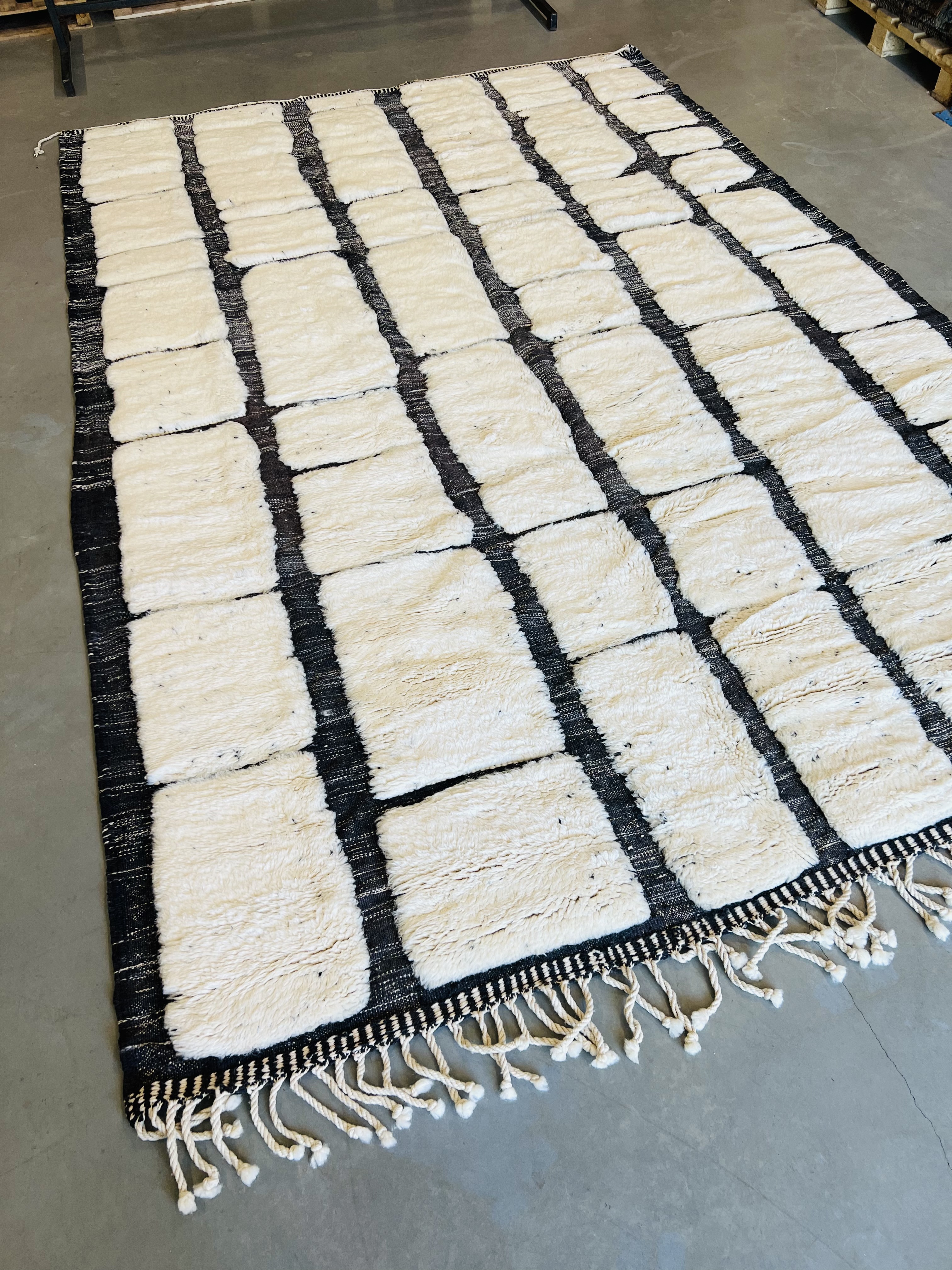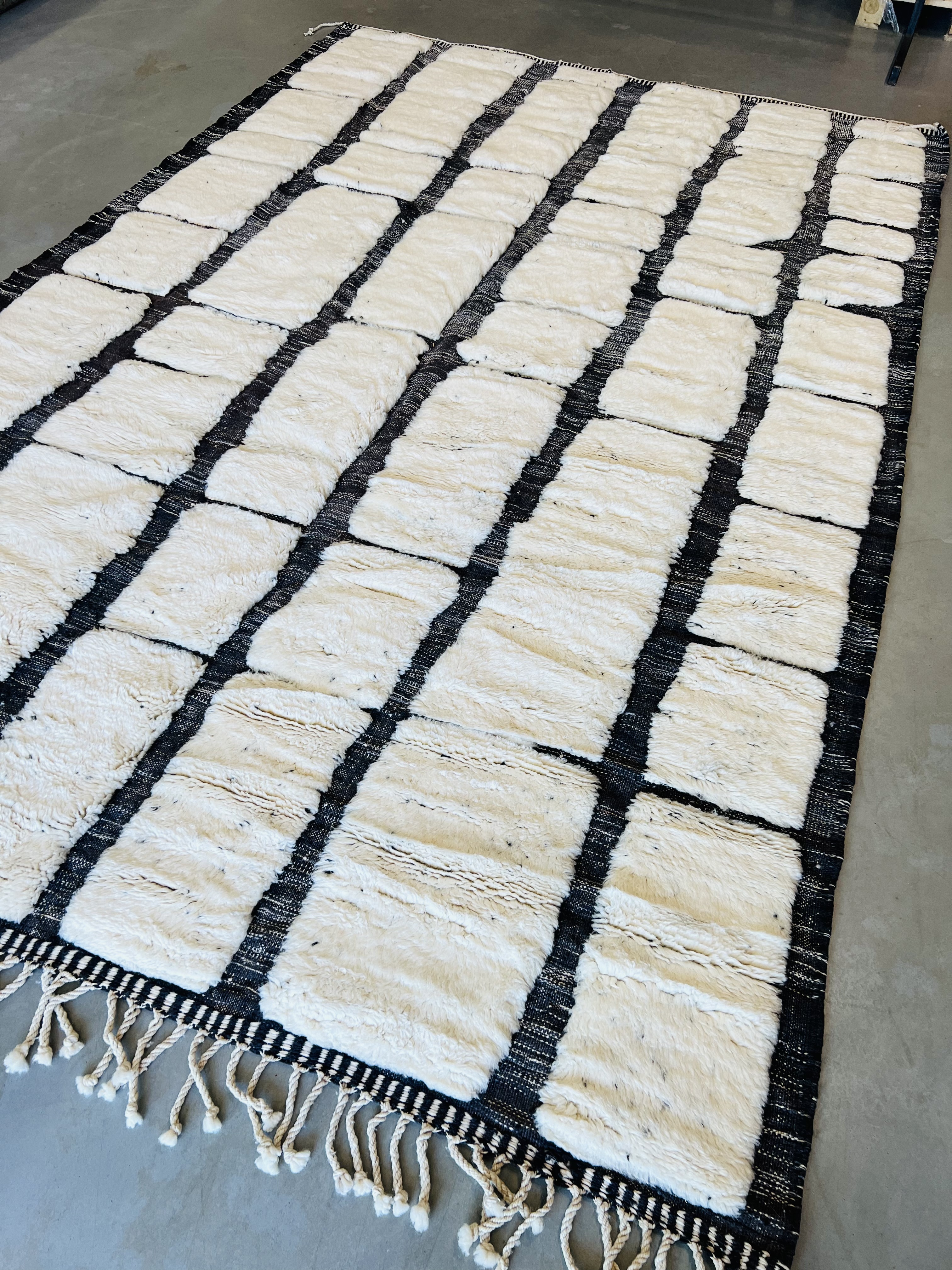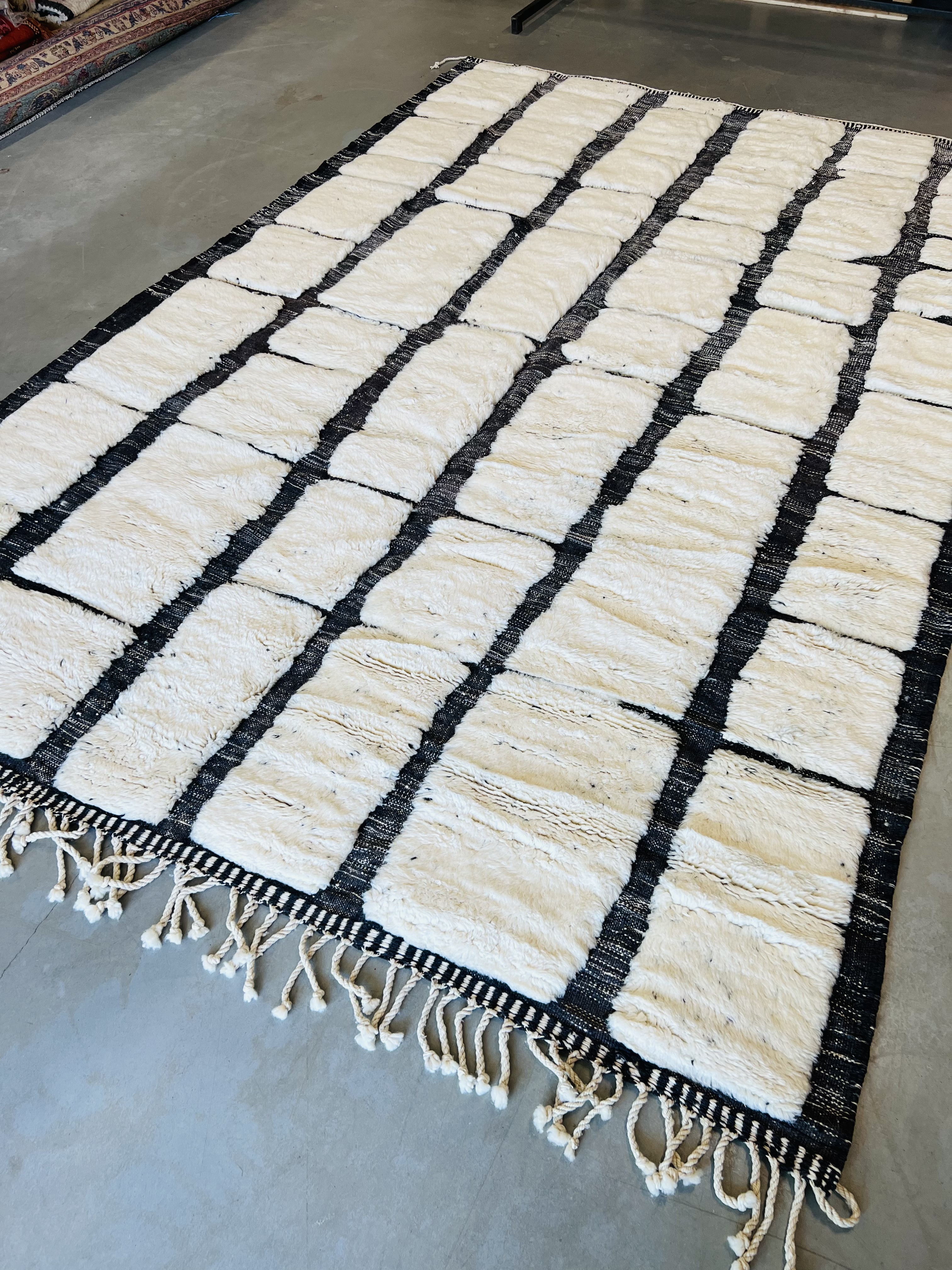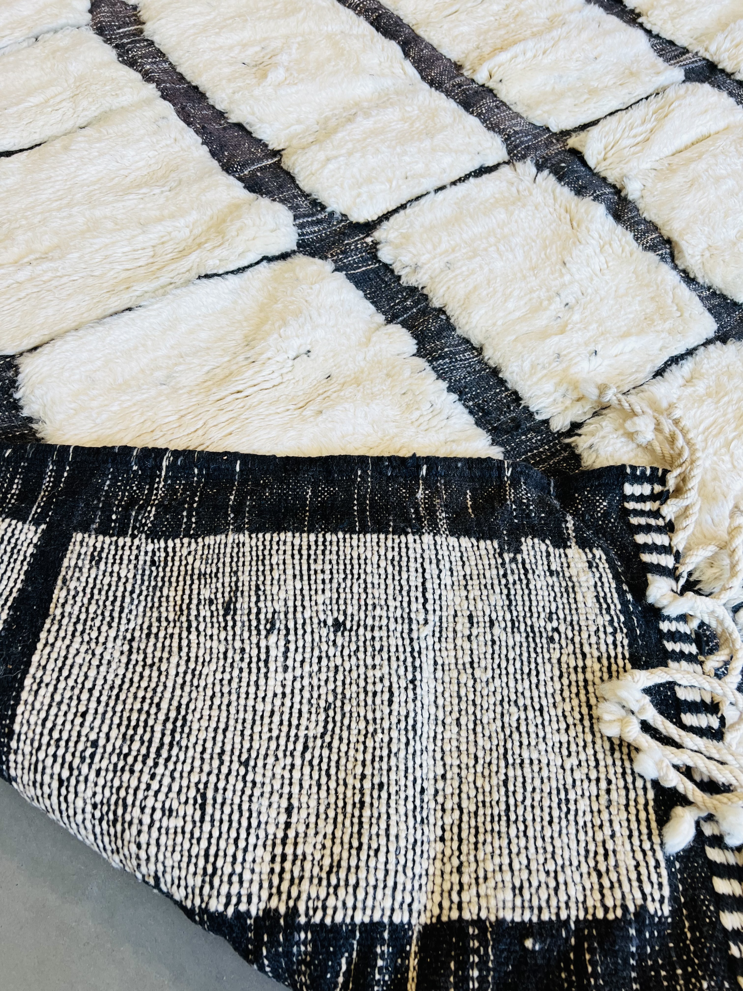 Beni Ourain is a group of 17 Berber tribes that traditionally inhabits the Atlas Mountains of Morocco. Our Beni Ourain rugs possess a spirit and a character, a real berber rug straight from the Atlas. It is a reflection of the daily life of the women that make it. Most of our vintage Beni rugs are cream(ivory) in color, although differences in the tone are found depending on the sheep’s color. They are considered to be the most prestigious rugs in Morocco, made from the very finest wool.