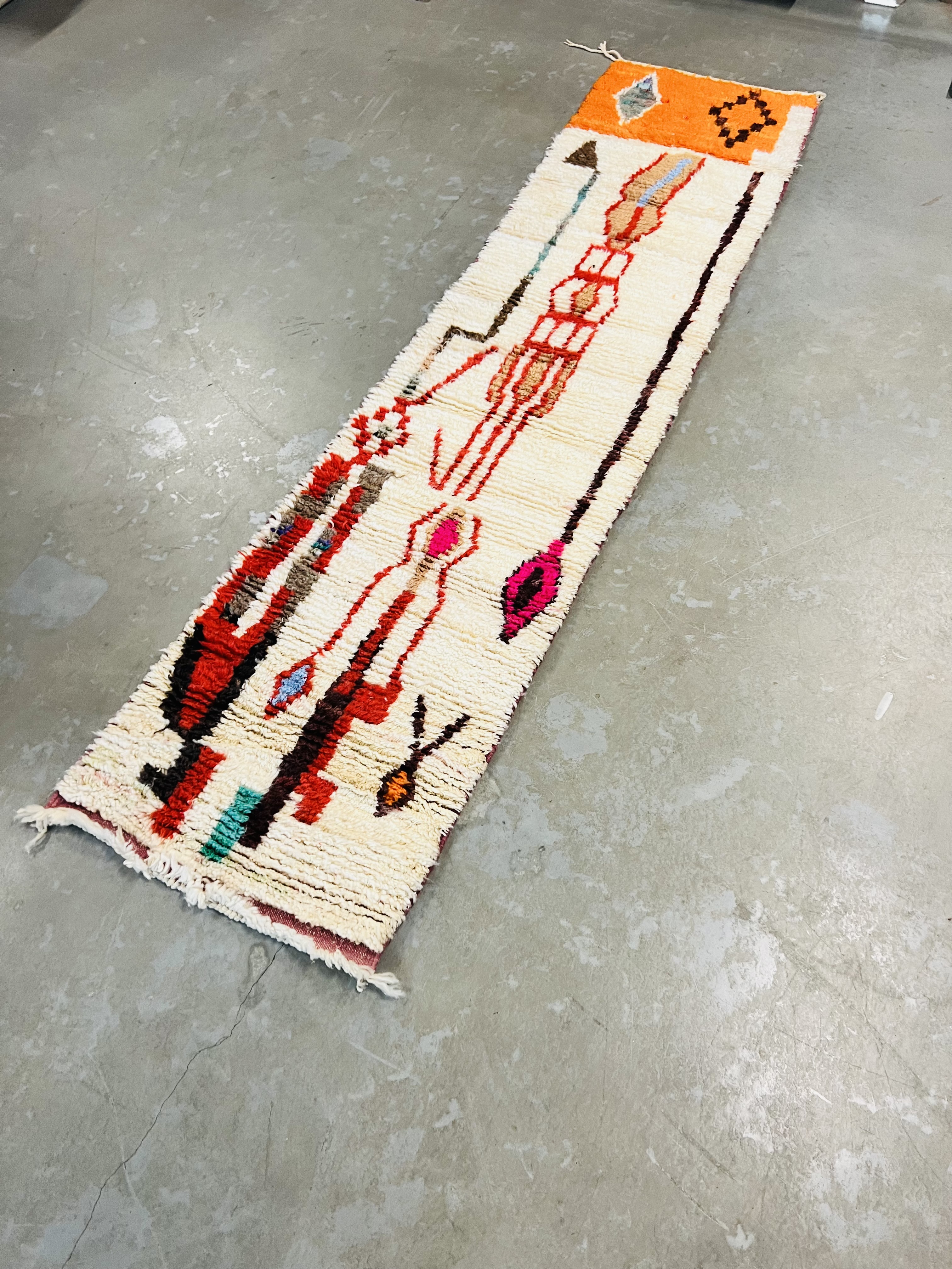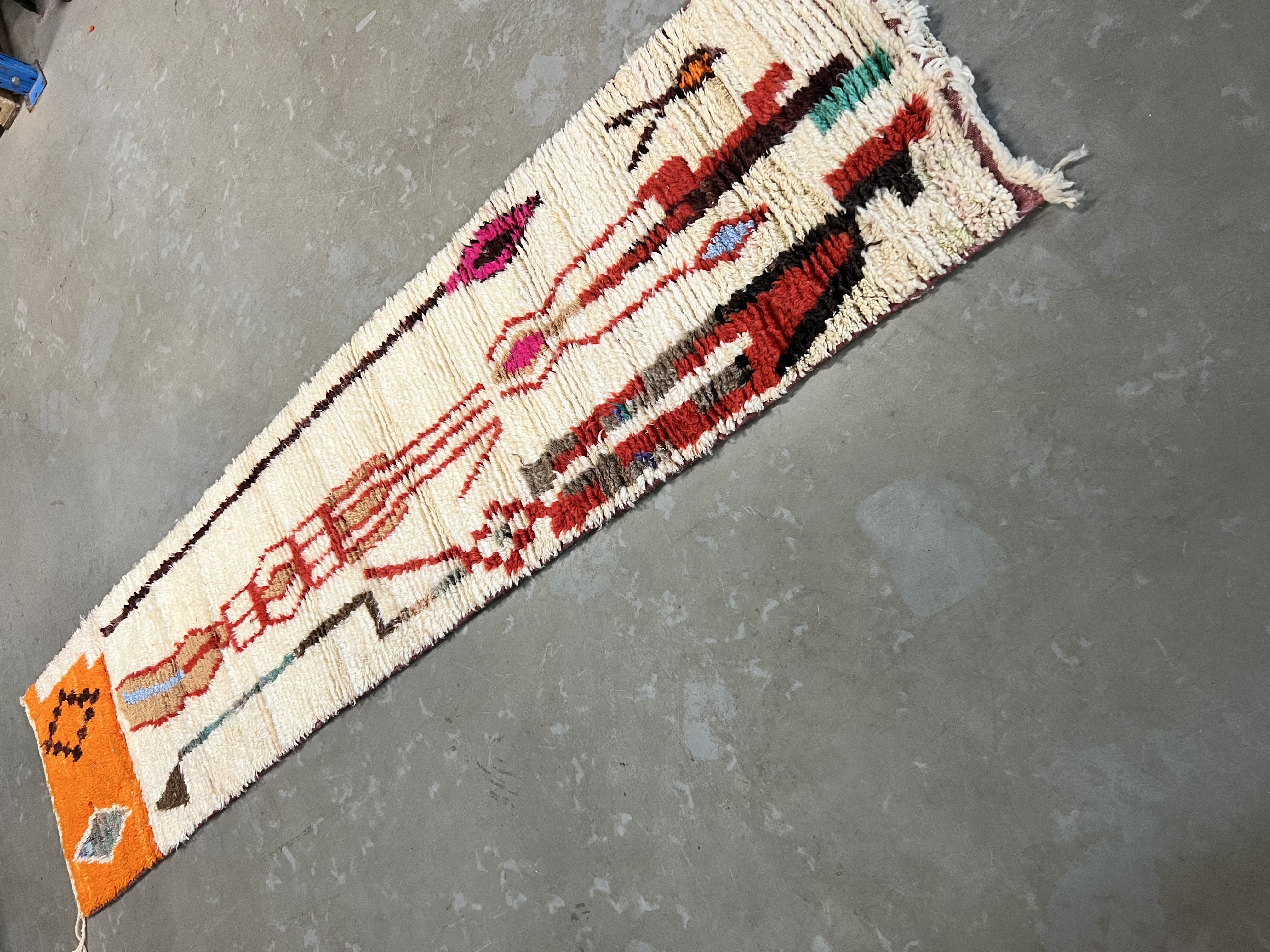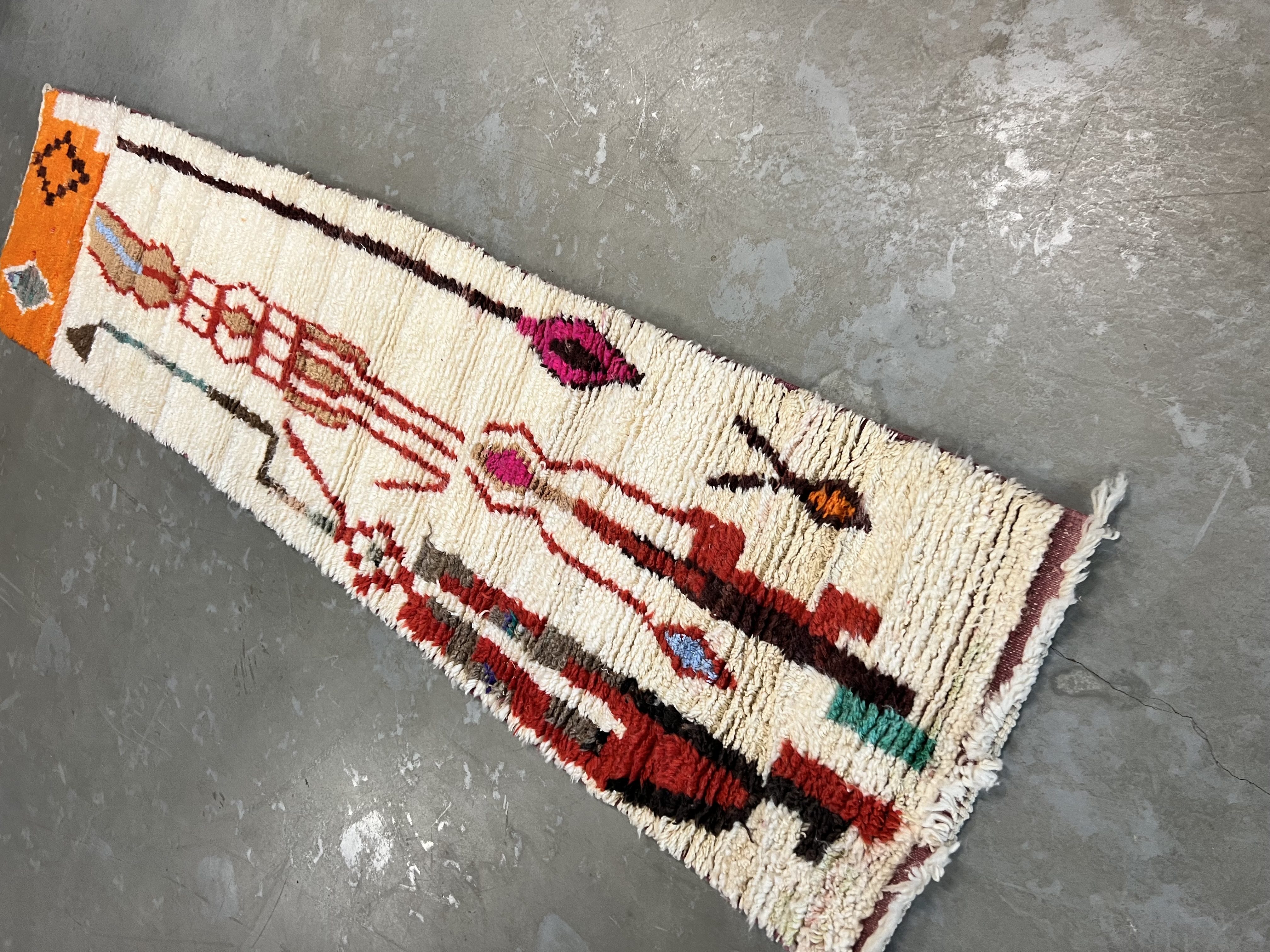 While the designs incorporate the basic shapes associated with Berber craft, squares, triangles and lozenges, these rugs have a less formal arrangement, Designs are driven by the weaver themselves, using shape and color as a pictorial language to tell a personal story or message. In this way, these pieces are characterful and poignant, and like all good art, inspire thought and conversation.