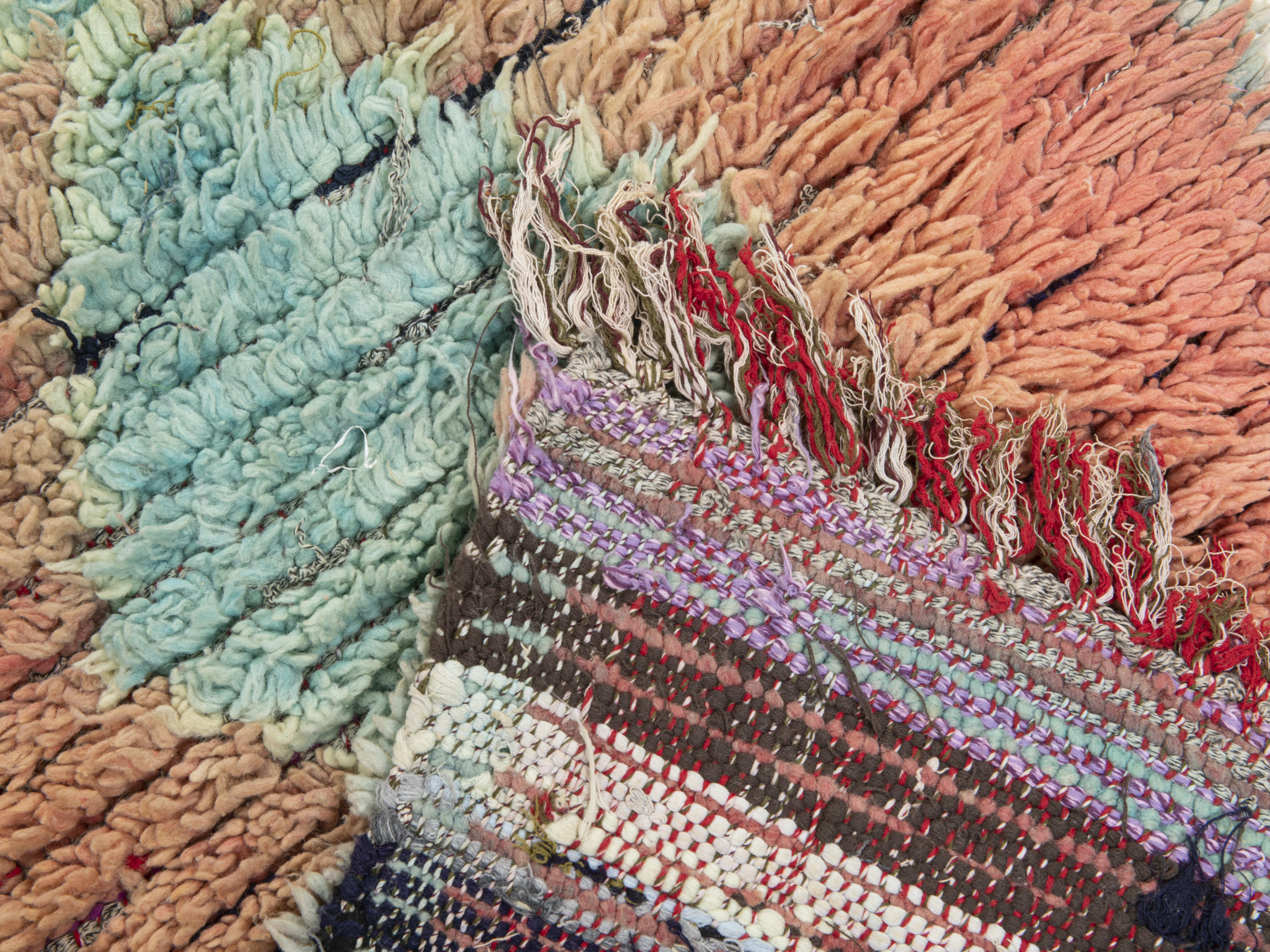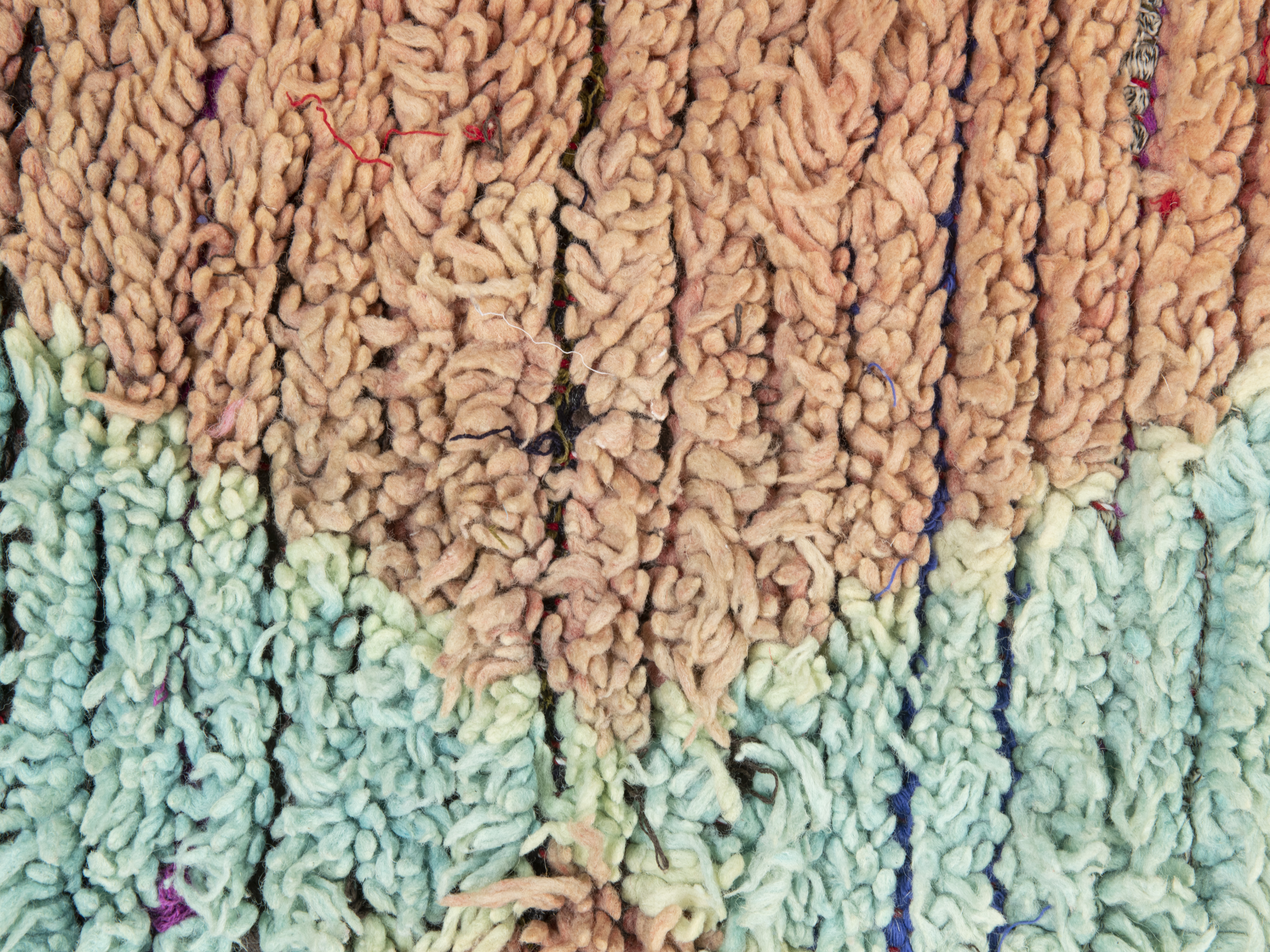 While the designs incorporate the basic shapes associated with Berber craft, squares, triangles and lozenges, these rugs have a less formal arrangement, Designs are driven by the weaver themselves, using shape and color as a pictorial language to tell a personal story or message. In this way, these pieces are characterful and poignant, and like all good art, inspire thought and conversation. The region has seen an influx of different groups, ideas and cultures over the years, and that diversity is reflected in the rugs themselves. The pile weaves vary, and while they may not have the history of some more established regions as a result, in combination with the expressive nature of the patterning and design, each piece has something different to offer. Bold use of color and the spontaneity of the weaver in the way shapes are used create striking imagery that looks amazing in any setting. The contrast with the clean lines of a modern interior is particularly pleasing, but wherever you place a Boujaad rug, it stands out as a wonderful, tactile piece of art. Our vintage Boujaad rugs are painstakingly sourced to ensure quality and character, with the ageing process adding another layer of story to each rug. They bring the essence of Morocco and the spirit of Berber craft to your interior space. Hand knotted in the traditional way and made from pure, natural wool, our Boujaad rugs represent the best of the region, high-quality pieces that bring Moroccan tradition to life, with wonderful craftsmanship and beauty.