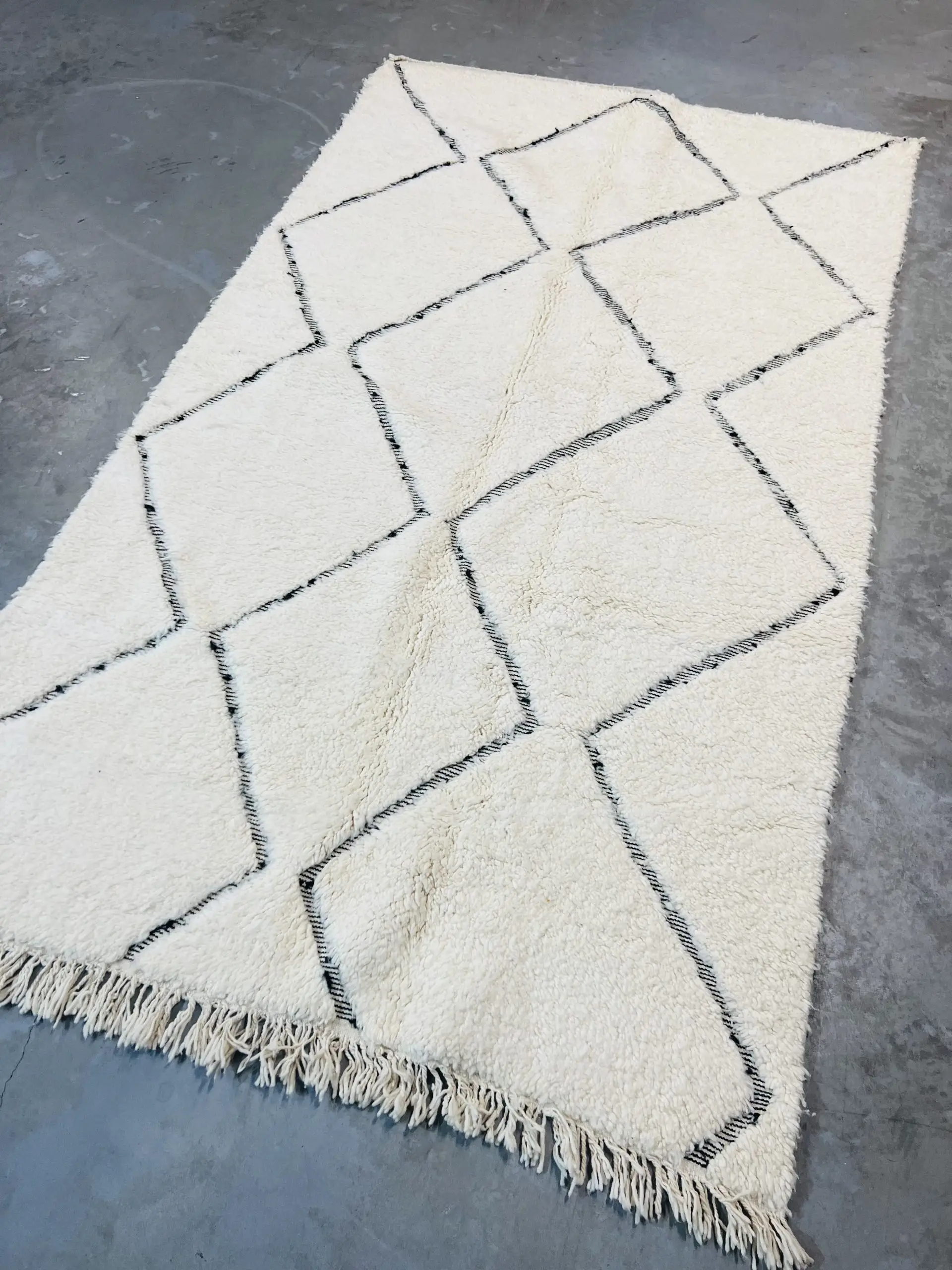 This modern Beni Ouarain rug brings the essence of Berber minimalism into a clean, contemporary form. Its soft ivory field — woven from 100% natural, hand-spun wool — is crossed by a bold diamond grid in deep charcoal, creating a striking balance between purity and structure.