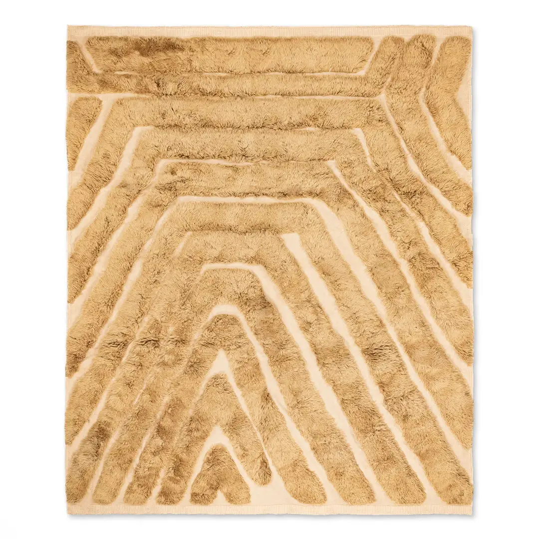 Handcrafted in Morocco from 100% natural wool, the plush pile is carefully carved to enhance its relief pattern, resulting in a tactile surface that invites touch while maintaining a refined, modern presence. The soft ivory tone reflects natural light beautifully, making it an effortless anchor within Japandi, minimalist, or contemporary interiors.
