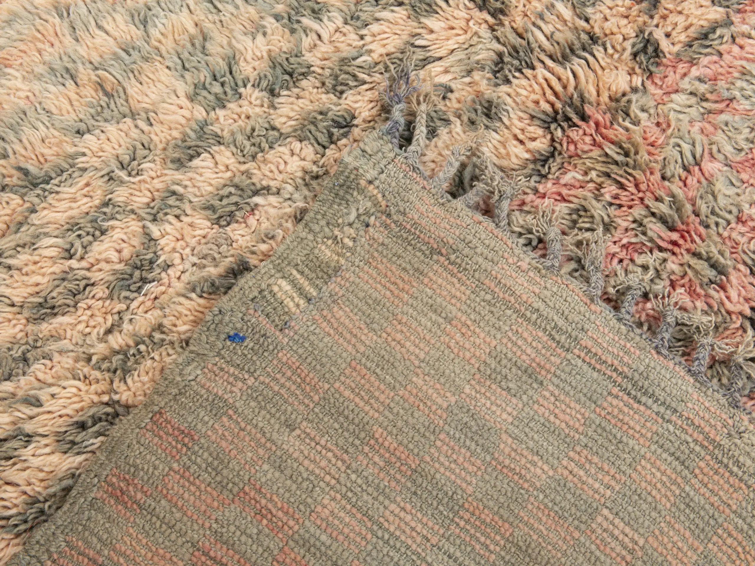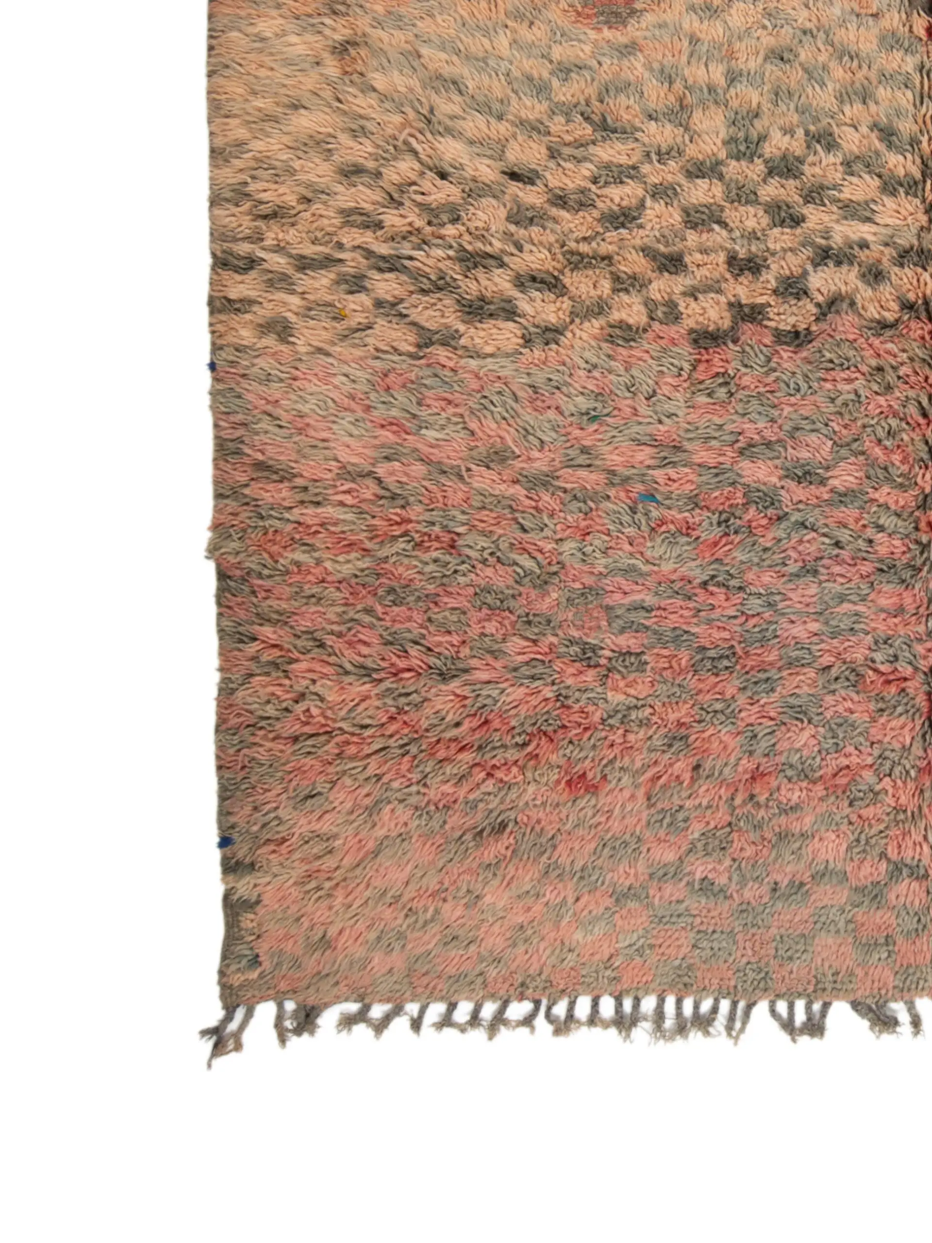 Tassira is a vintage Boujaad masterpiece — a rug that doesn’t shout for attention yet captivates anyone who truly looks. Its softly weathered tones blend sandy beige, muted coral, and whispers of faded teal into a mesmerizing, almost painterly gradient. Up close, the intricate small-scale pattern feels alive, as if thousands of quiet brushstrokes were layered by hand across decades.