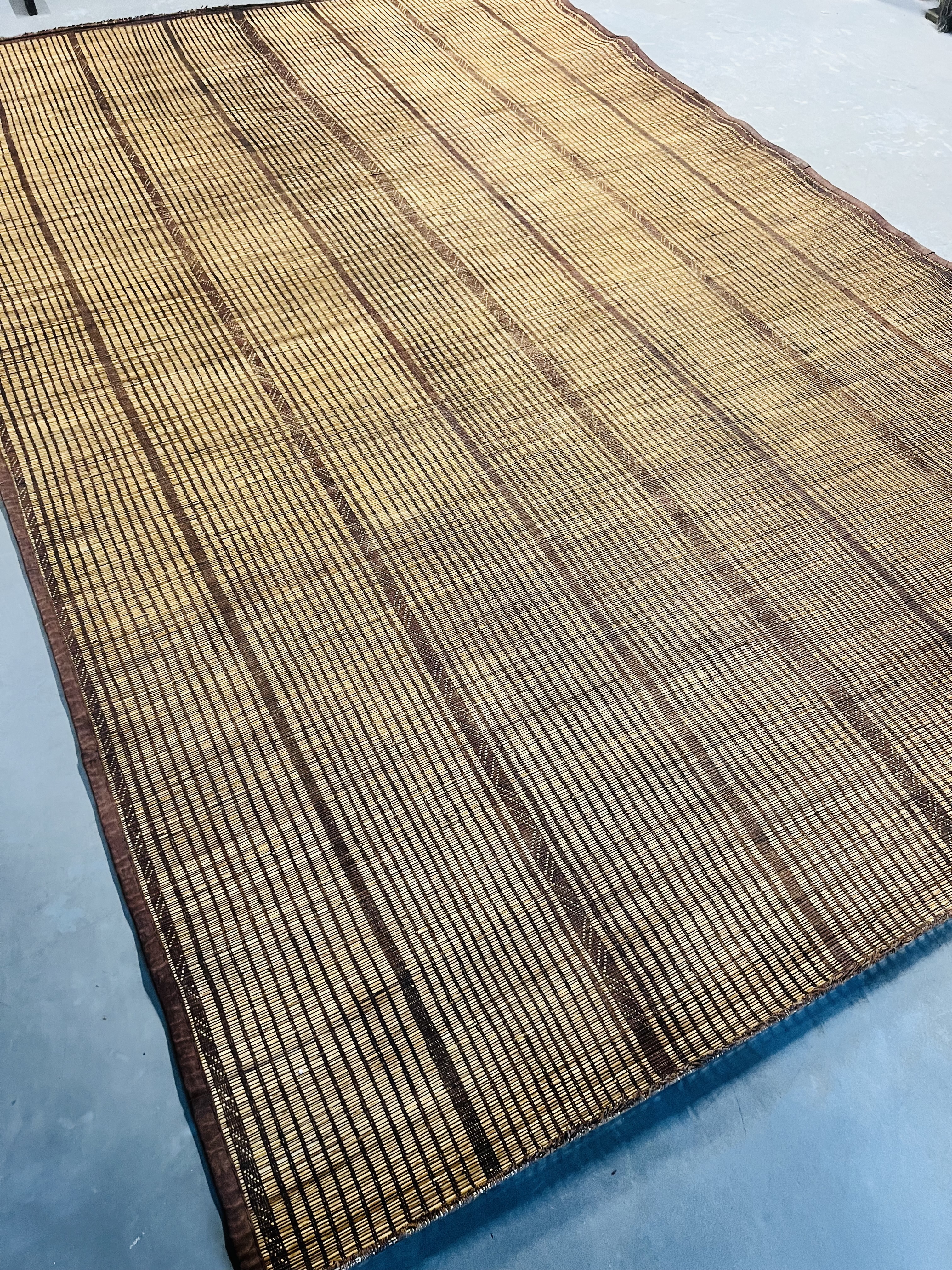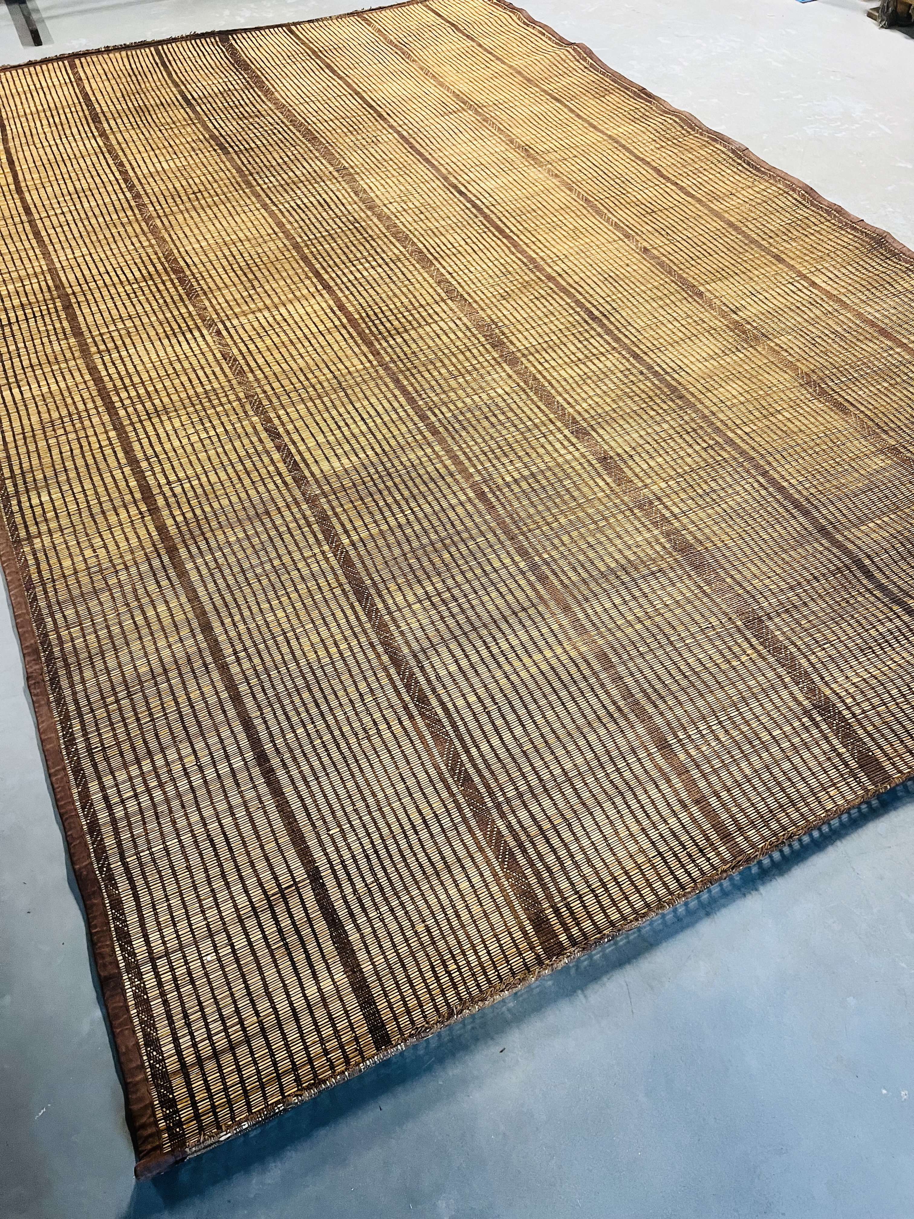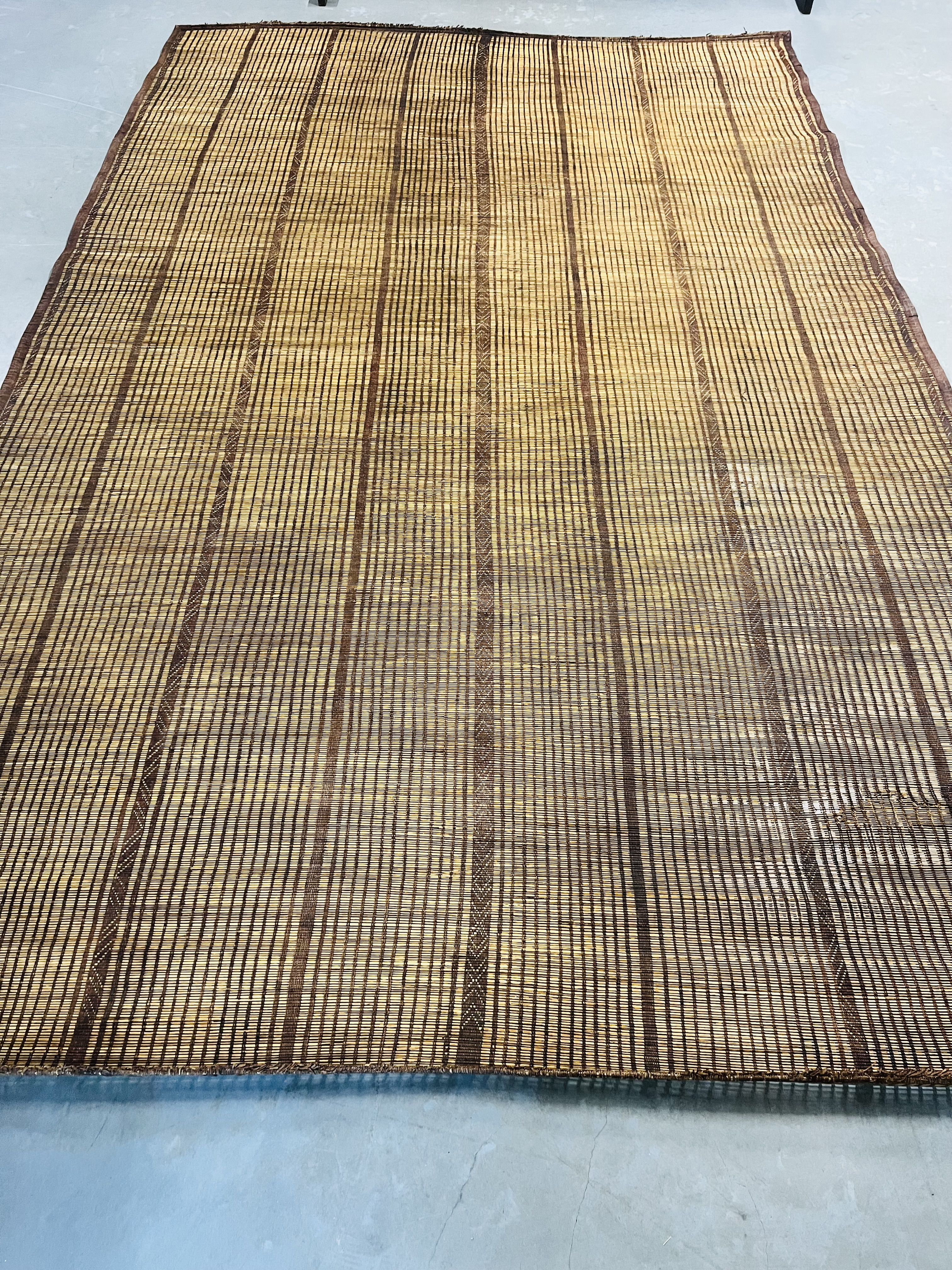 Vintage Mauritanian Sahara mat “rug” with striped design made by the nomadic Tuareg tribes of Mauritania. The Tuareg mats are handmade with reed and decorated with leather. The Tuareg culture creates an impressive world of beautiful, functional, and abstract objects.