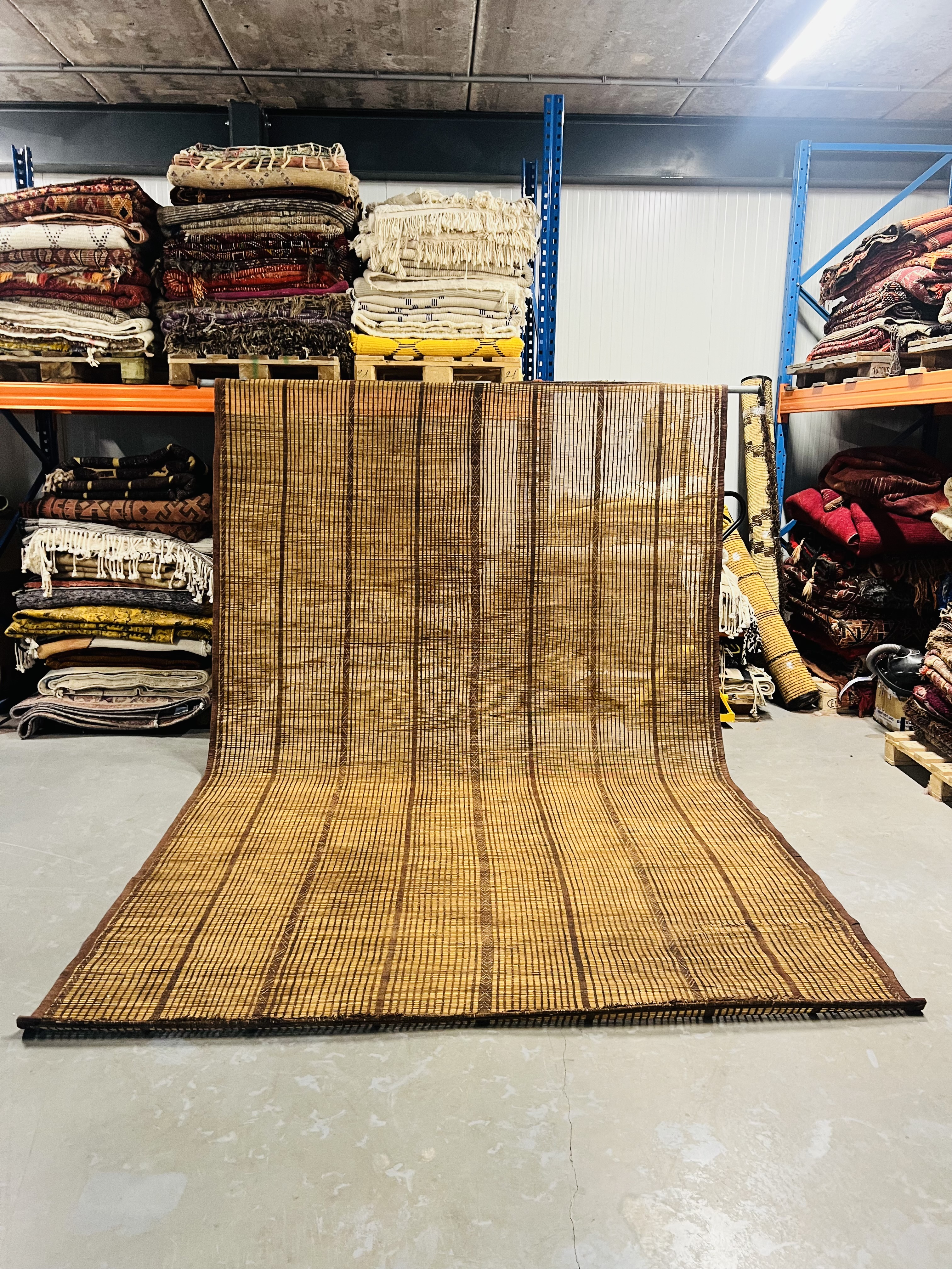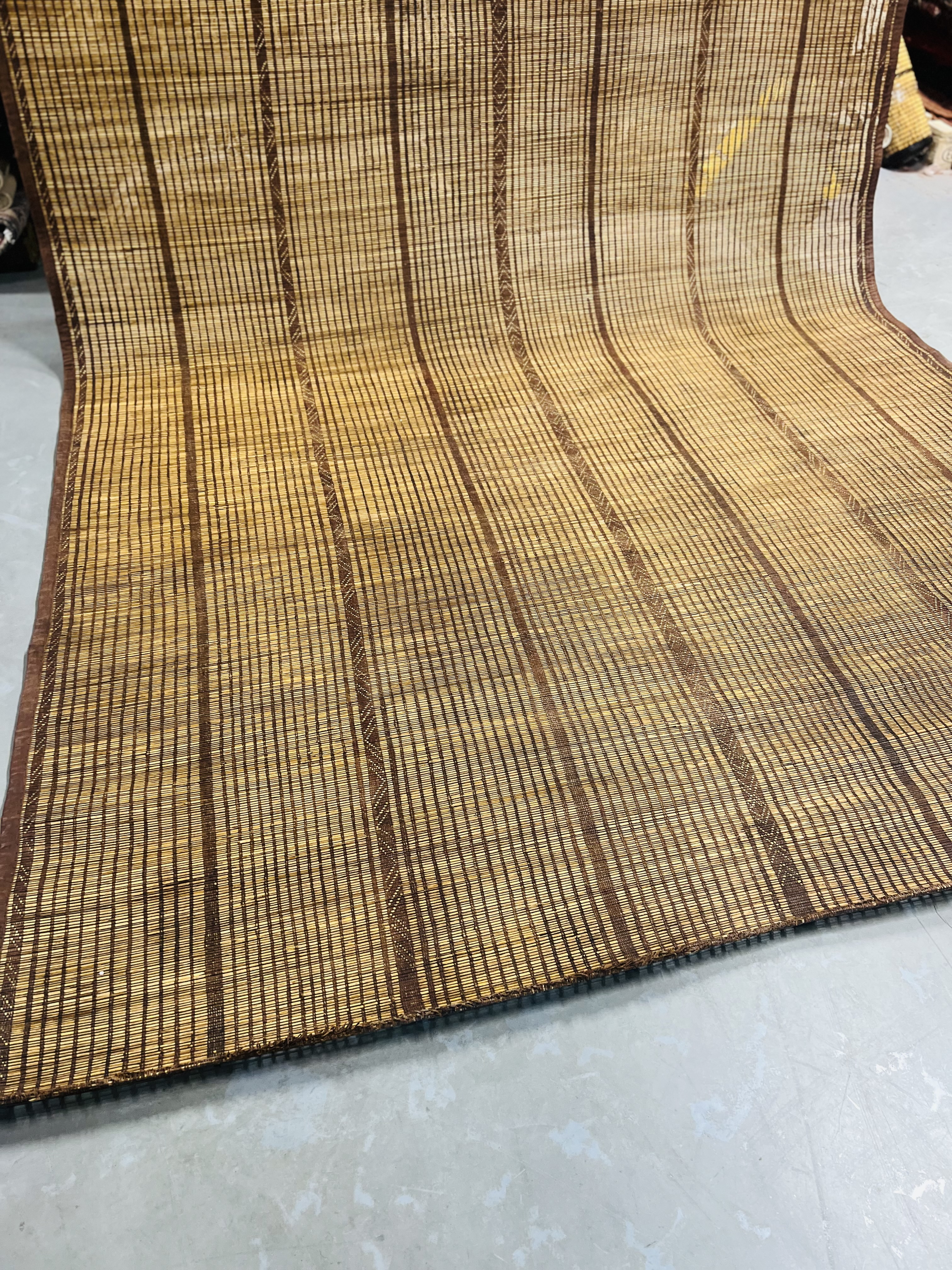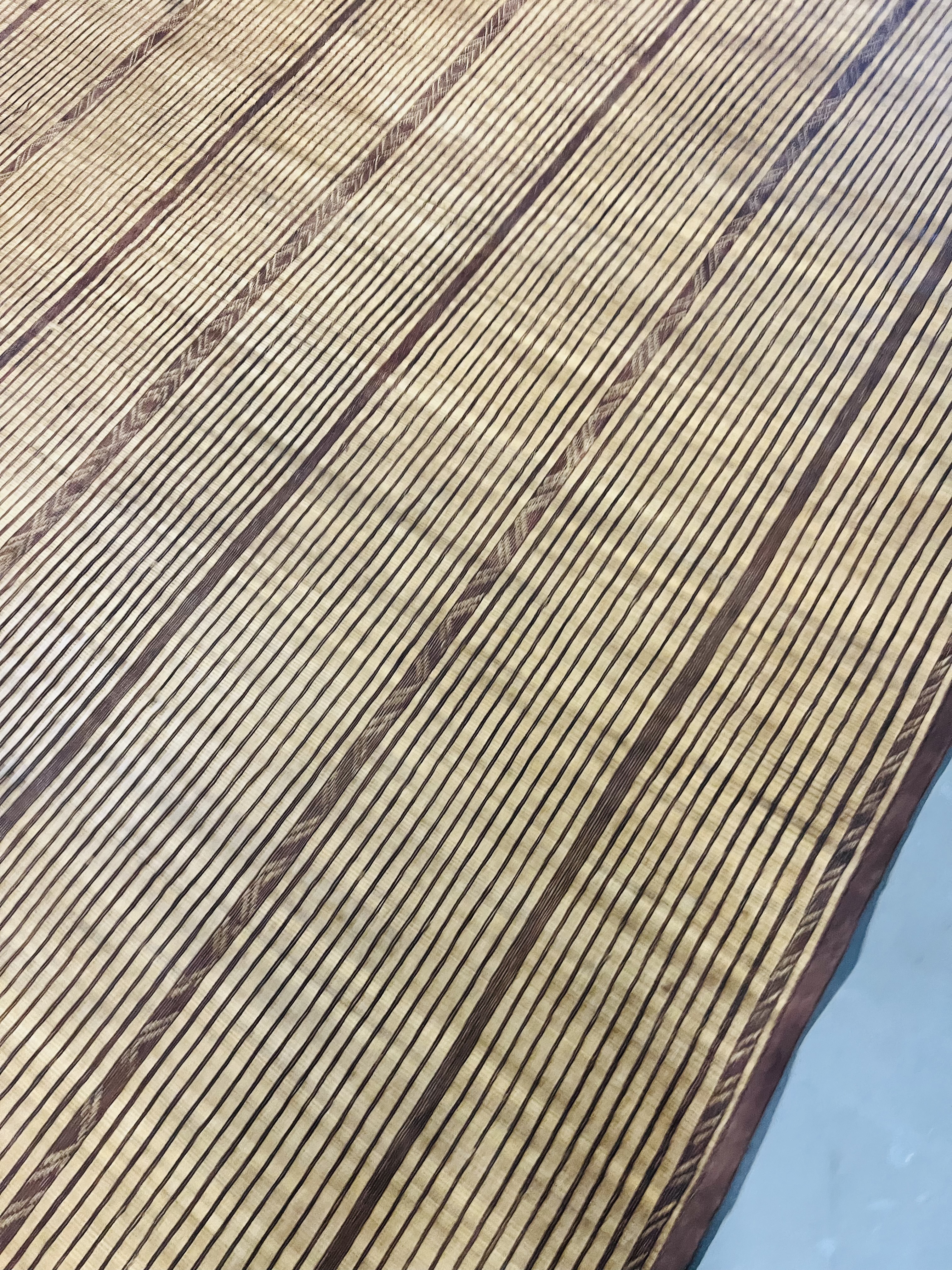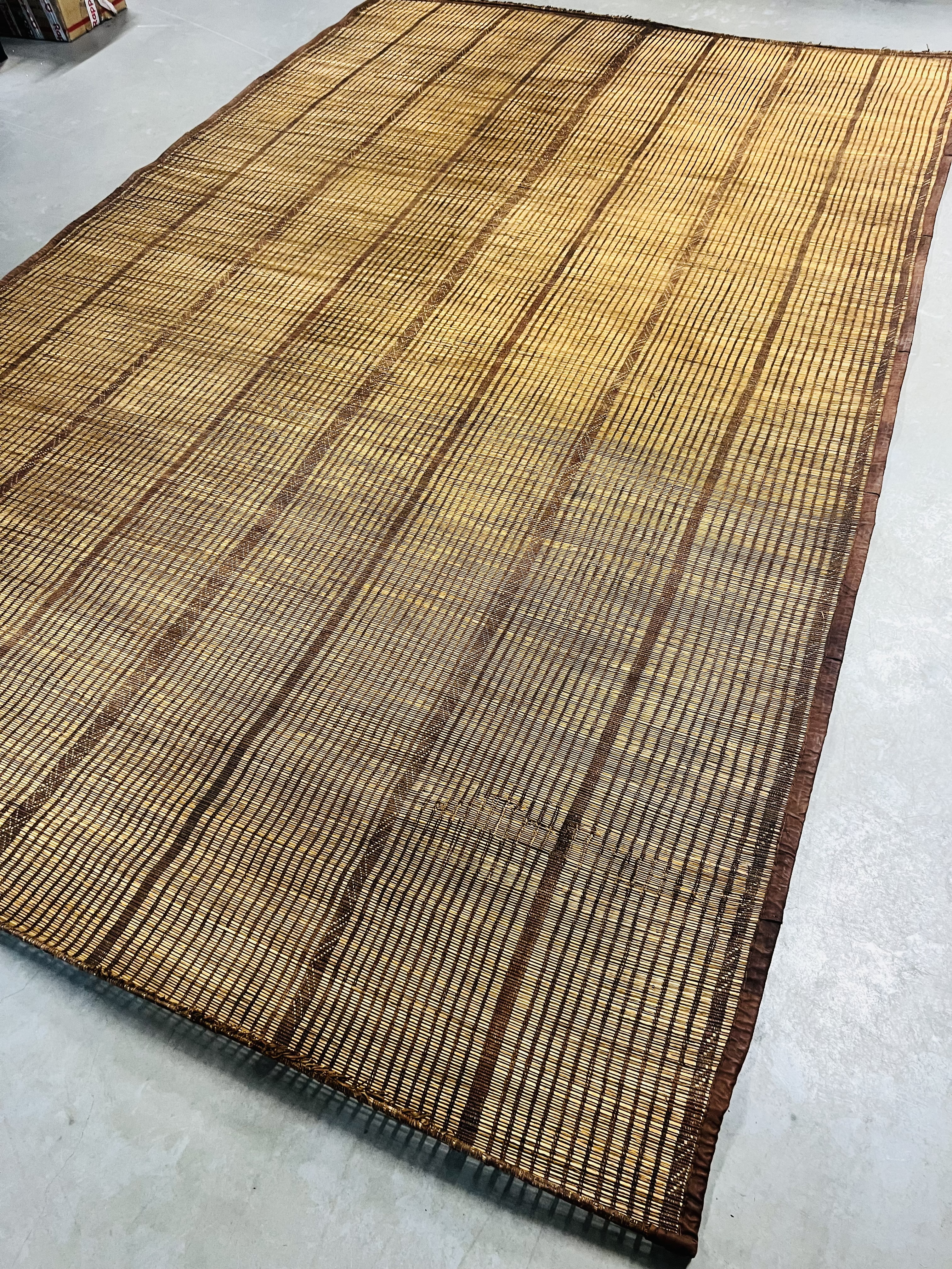 Vintage Mauritanian Sahara mat “rug” with striped design made by the nomadic Tuareg tribes of Mauritania. The Tuareg mats are handmade with reed and decorated with leather. The Tuareg culture creates an impressive world of beautiful, functional, and abstract objects.
