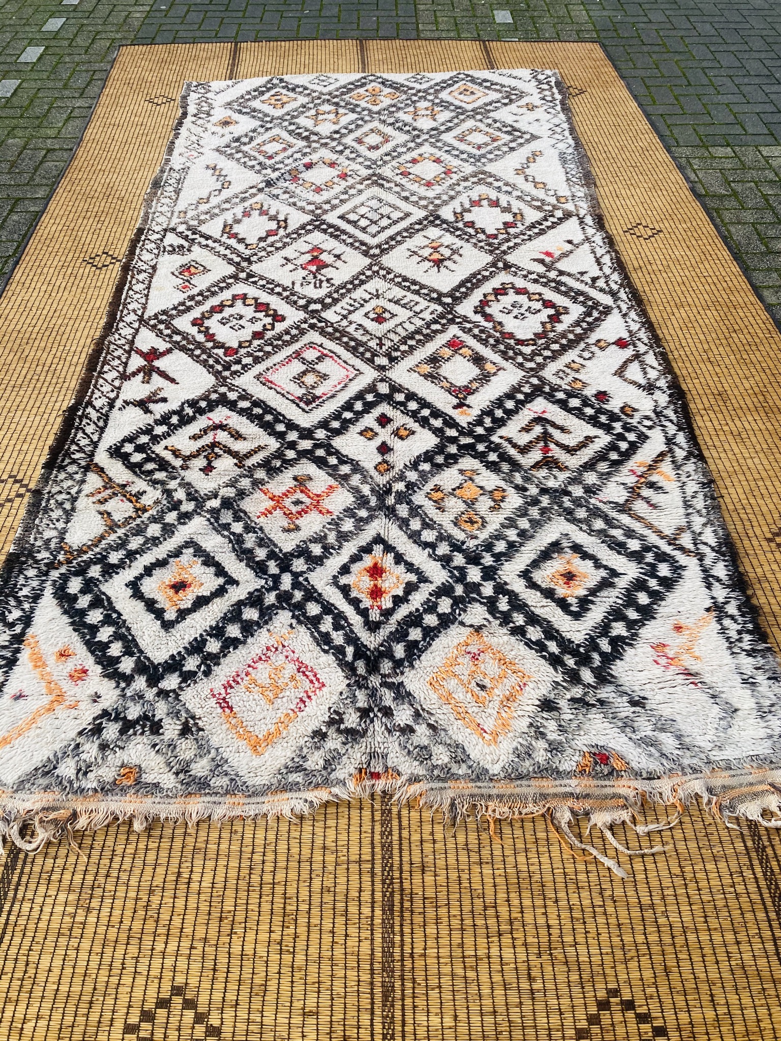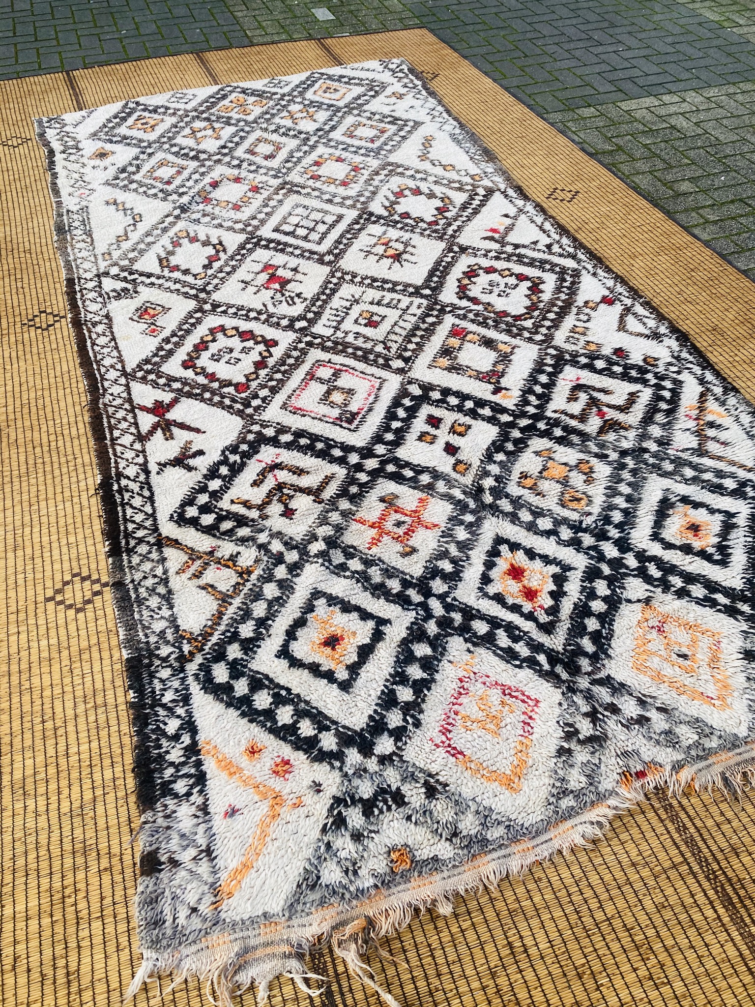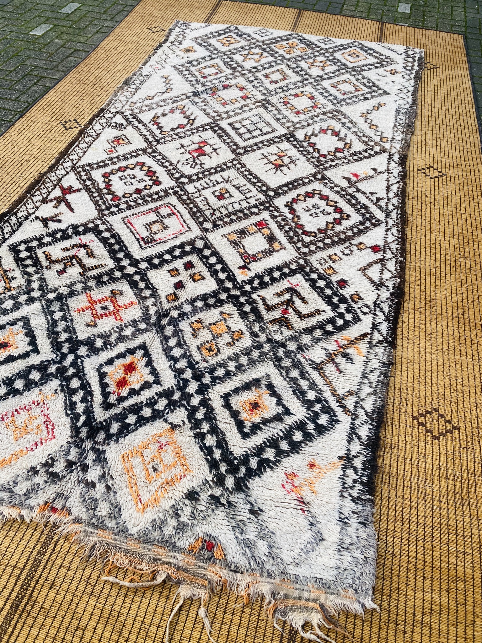 Our Beni Ourain rugs are made by people who incorporate fragments of their lives in the designs. These designs usually express femininity and nature, fertility or birth. We have also seen some stories of personal beliefs or rural life emerging from the carpets. Beni Ourain is a group of 17 Berber tribes that traditionally inhabits the Atlas Mountains of Morocco. They rear a special type of sheep from where the women get high-quality wool for making rugs and blankets for use, especially during the cold winters in the Moroccan Atlas Mountains. Our vintage Beni Ourain rugs possess a spirit and a character. It is a reflection of the daily life of the women that make it. Most of our vintage Beni rugs are cream(ivory) in color, although differences in the tone are found depending on the sheep's color. Our Moroccan Beni Ourain Rugs are a masterpiece with unique artwork that will beautify your home for a long time. We believe that you can pass the rug down for generations if you're able to properly care for it, since the high-quality wool will never wear out nor the colours will fade.