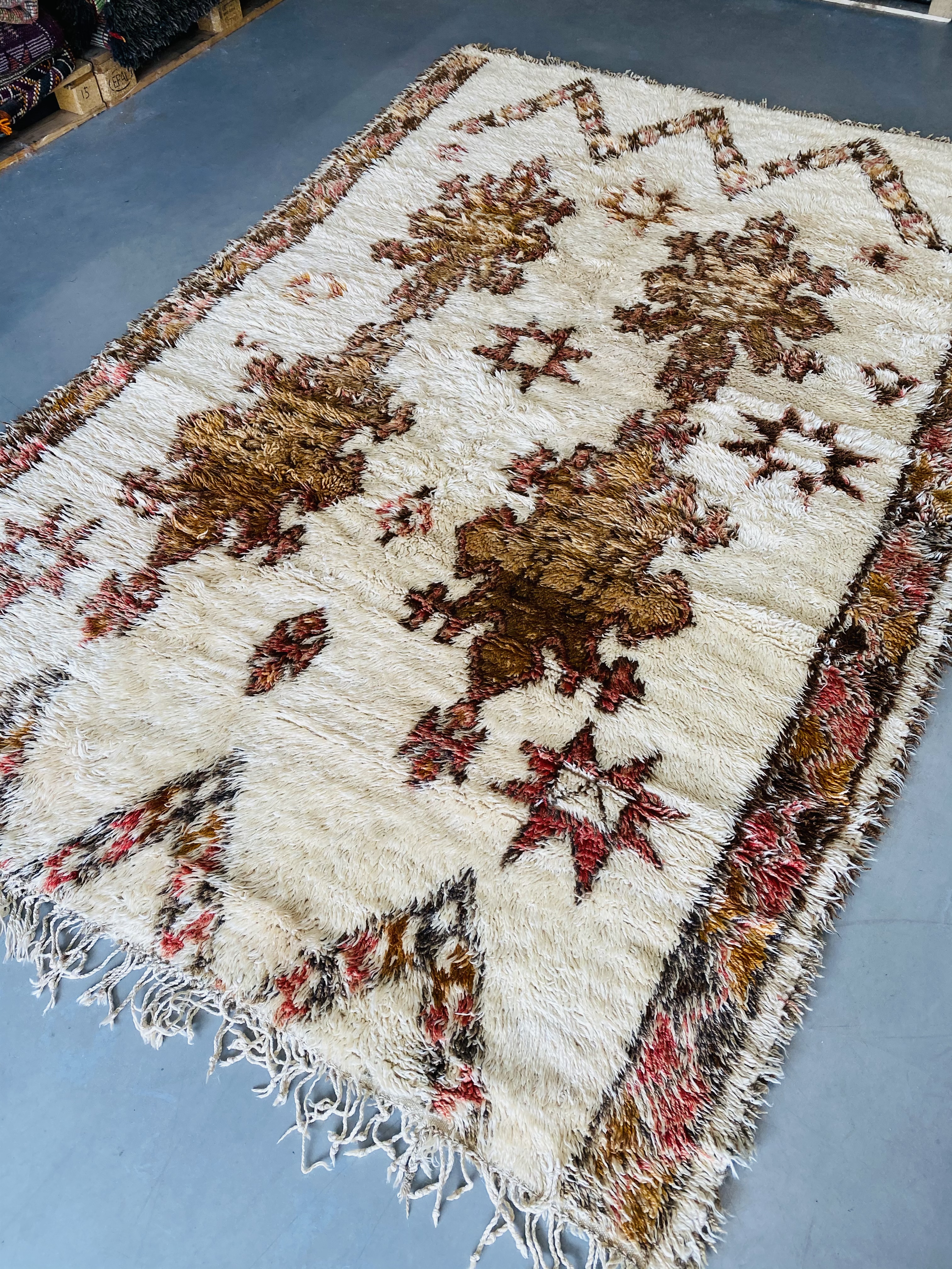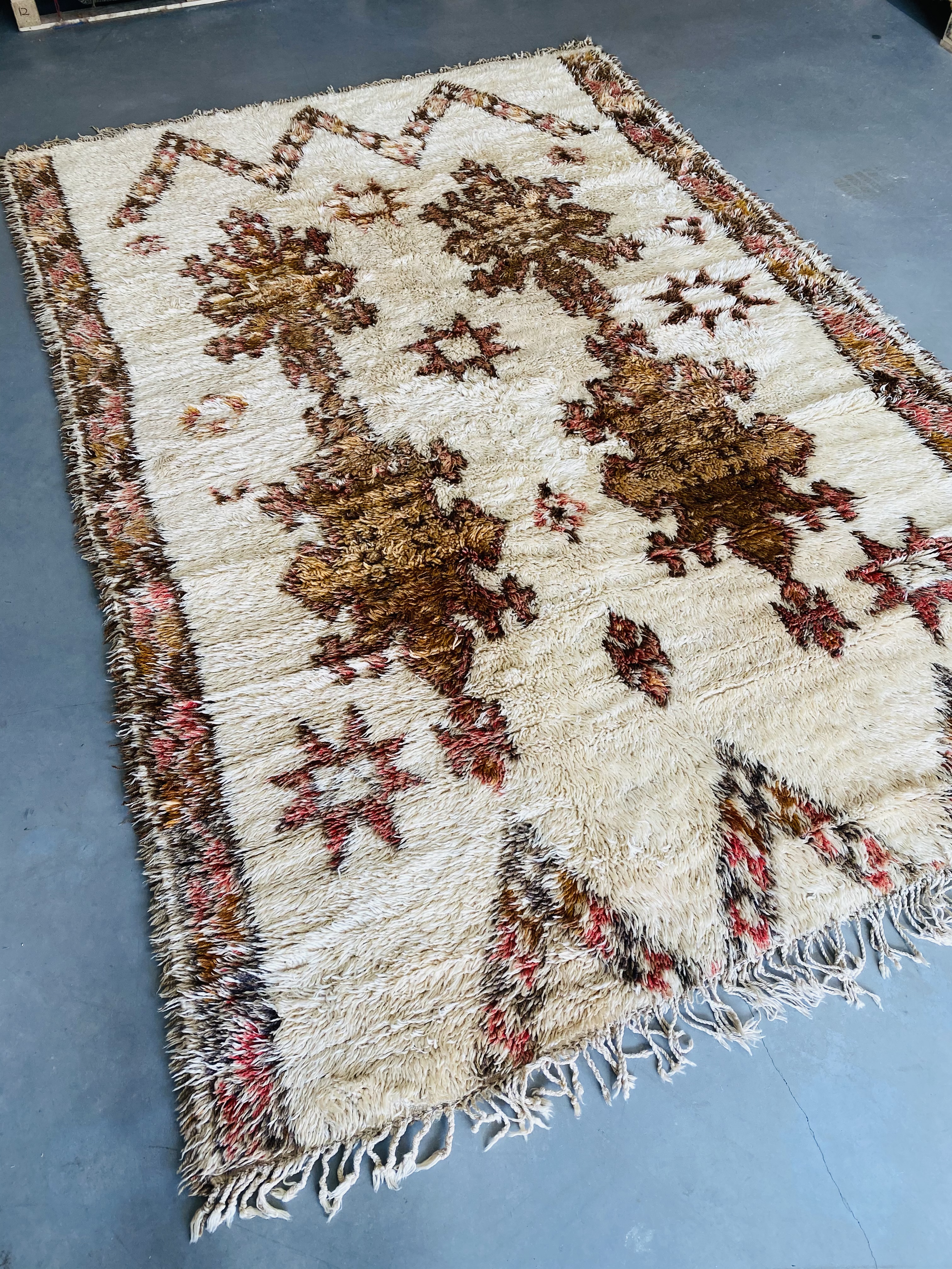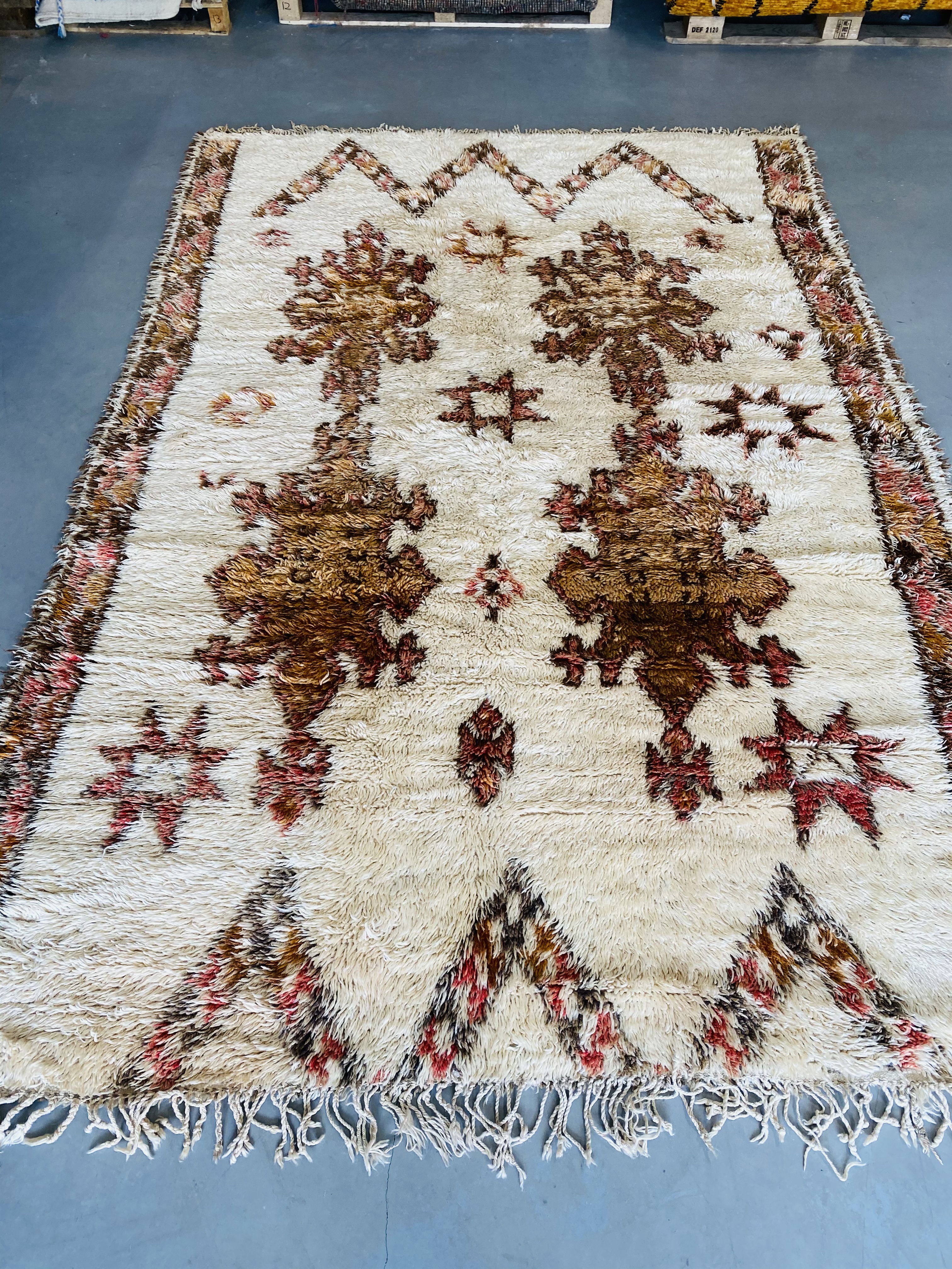 Our Beni Ourain rugs are made by people who incorporate fragments of their lives in the designs. These designs usually express femininity and nature, fertility or birth. We have also seen some stories of personal beliefs or rural life emerging from the carpets. Beni Ourain is a group of 17 Berber tribes that traditionally inhabits the Atlas Mountains of Morocco. They rear a special type of sheep from where the women get high-quality wool for making rugs and blankets for use, especially during the cold winters in the Moroccan Atlas Mountains. Our vintage Beni Ourain rugs possess a spirit and a character. It is a reflection of the daily life of the women that make it. Most of our vintage Beni rugs are cream(ivory) in color, although differences in the tone are found depending on the sheep's color. Our Moroccan Beni Ourain Rugs are a masterpiece with unique artwork that will beautify your home for a long time. We believe that you can pass the rug down for generations if you're able to properly care for it, since the high-quality wool will never wear out nor the colours will fade.