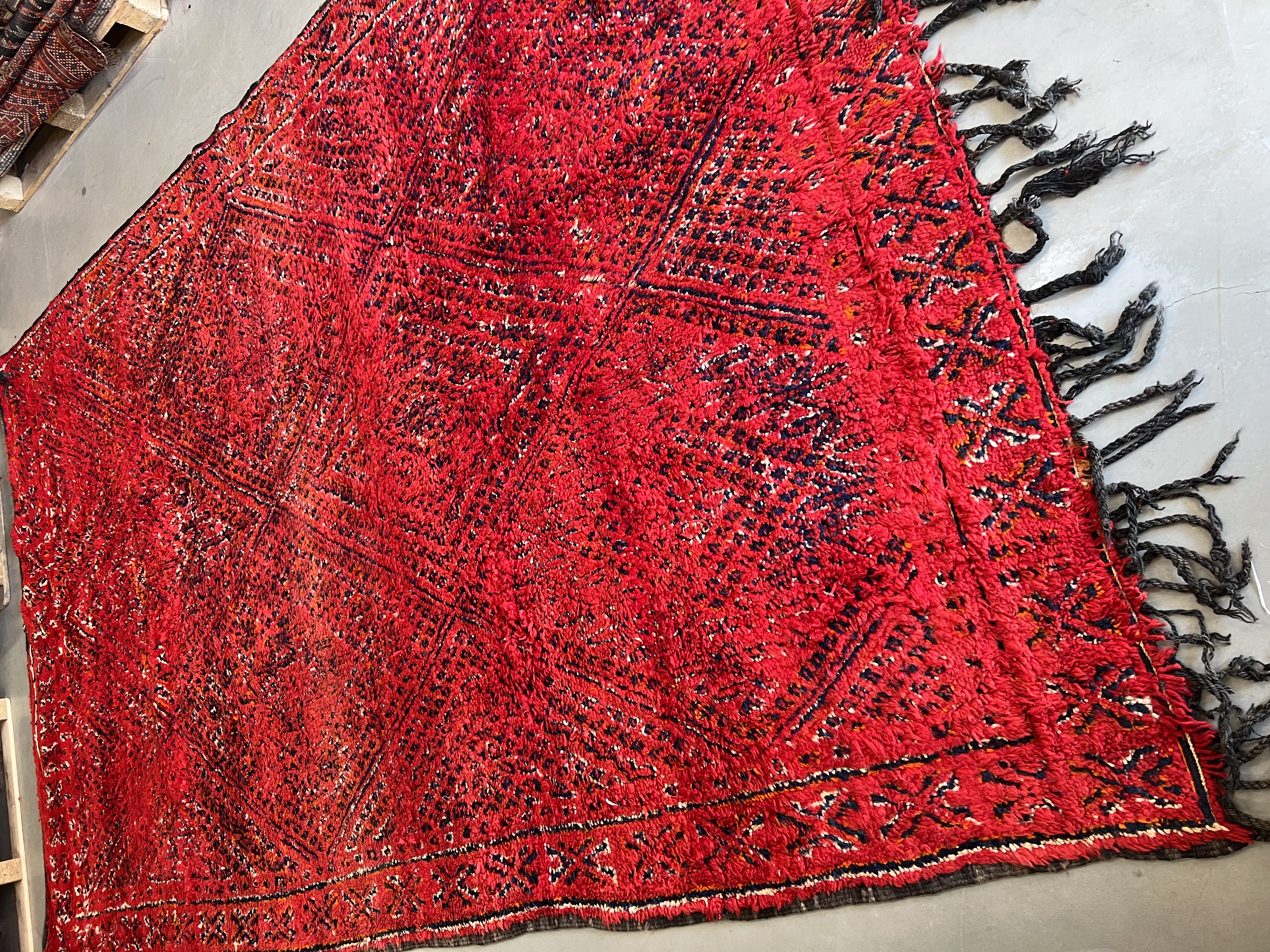 The Zayane rug are from western central Middle Atlas in Morocco. A unique variant of a "tree of life" design; quite typically the weavers of this region in the Middle Atlas love to enlarge flatweave motifs and transform them into boldly drawn pile rug designs. Loved for their playful and complex color variation.
