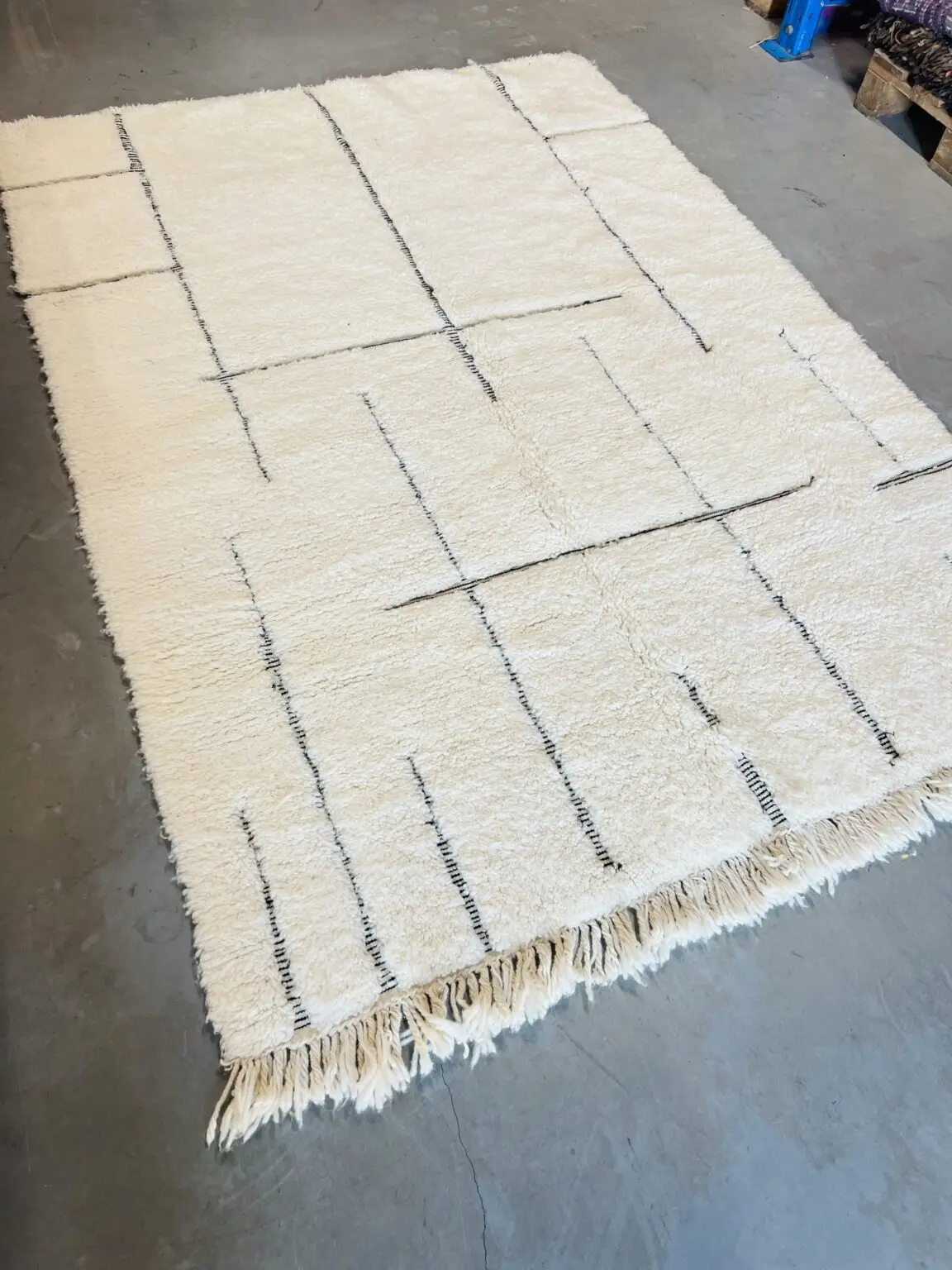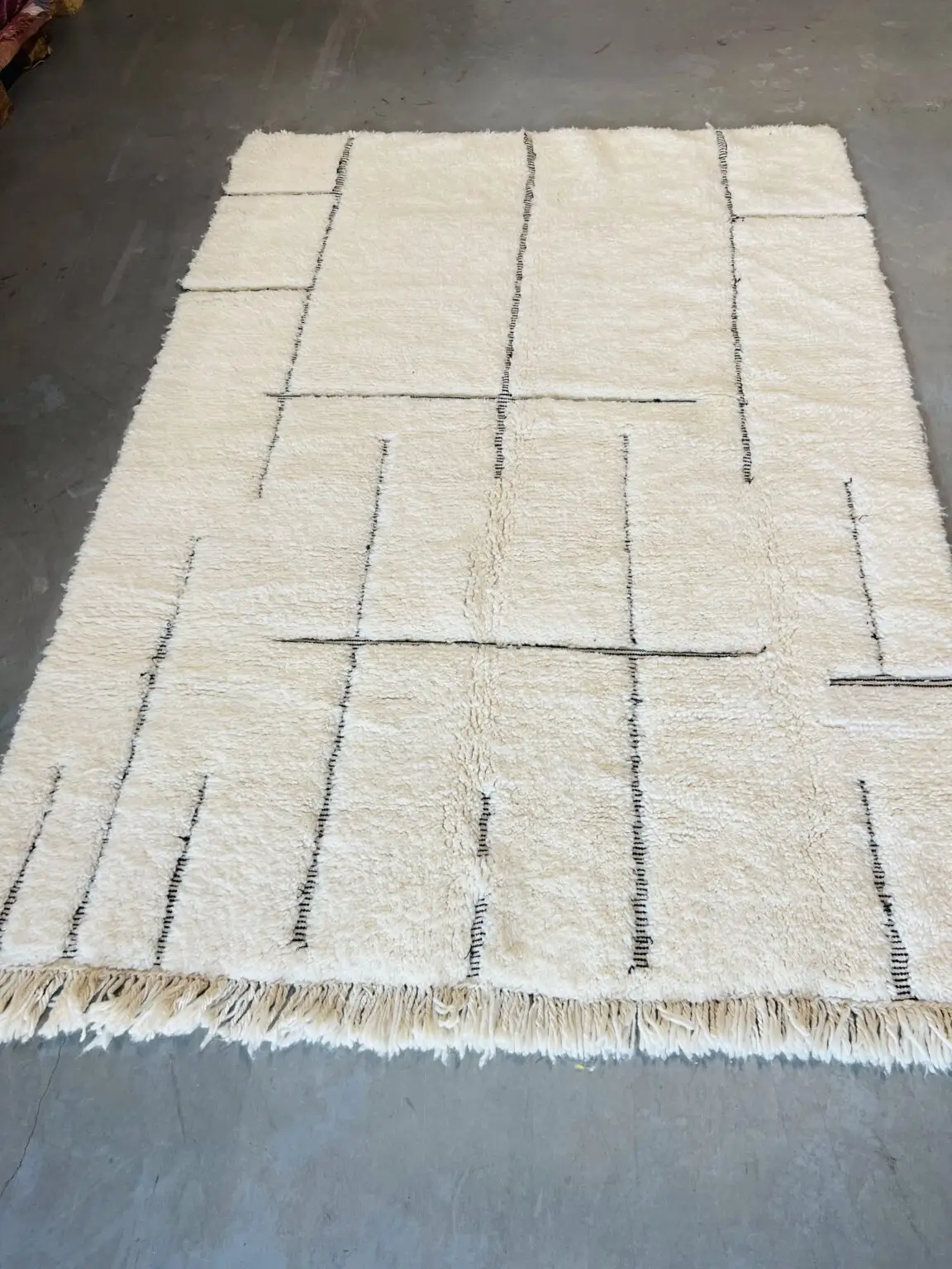 This modern Beni Mrirt rug distills tradition into pure graphic elegance. Its luminous ivory field — woven from exceptionally soft, hand-spun wool — is interrupted by a series of fine charcoal lines that form an understated, architectural grid.