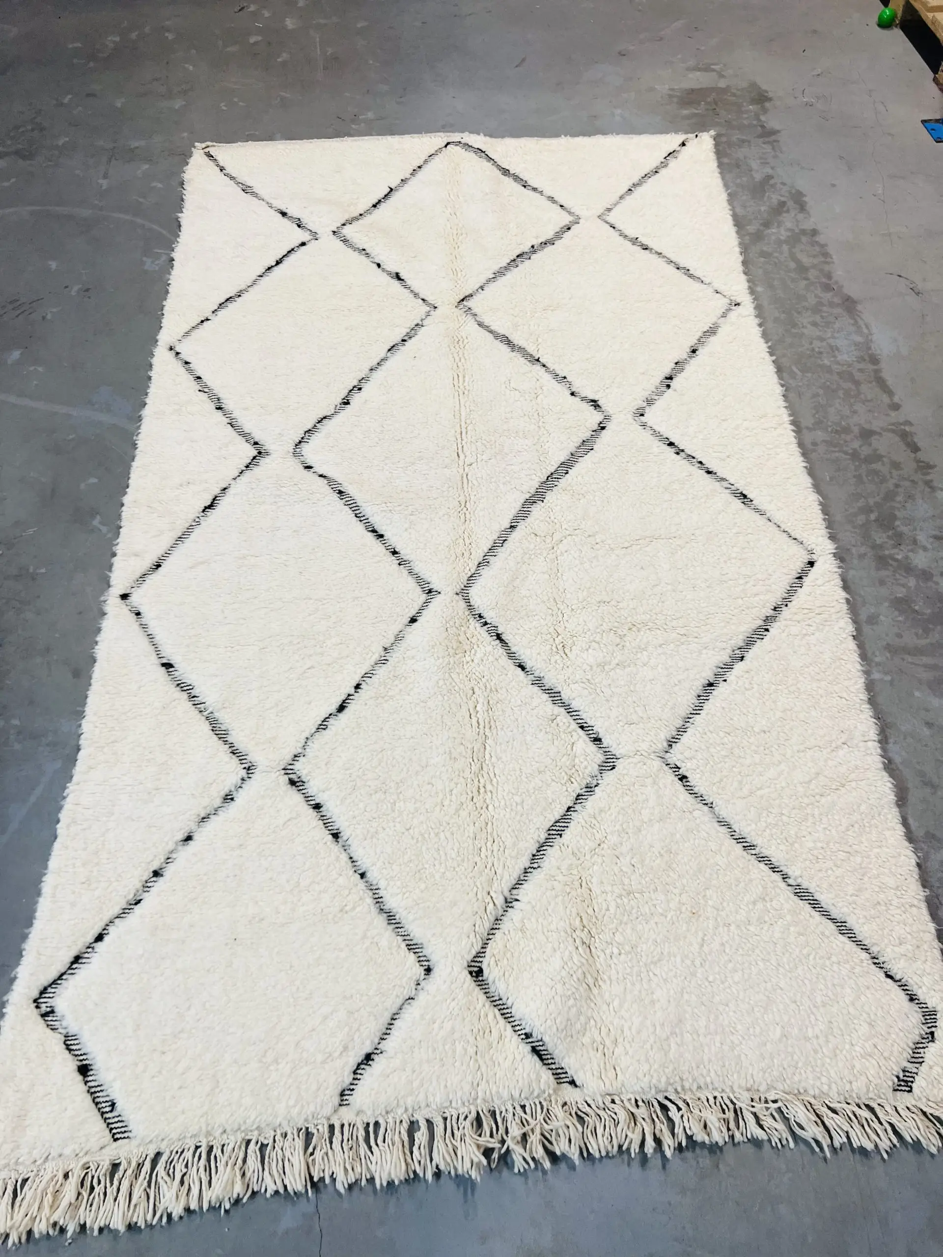 This modern Beni Ouarain rug brings the essence of Berber minimalism into a clean, contemporary form. Its soft ivory field — woven from 100% natural, hand-spun wool — is crossed by a bold diamond grid in deep charcoal, creating a striking balance between purity and structure.